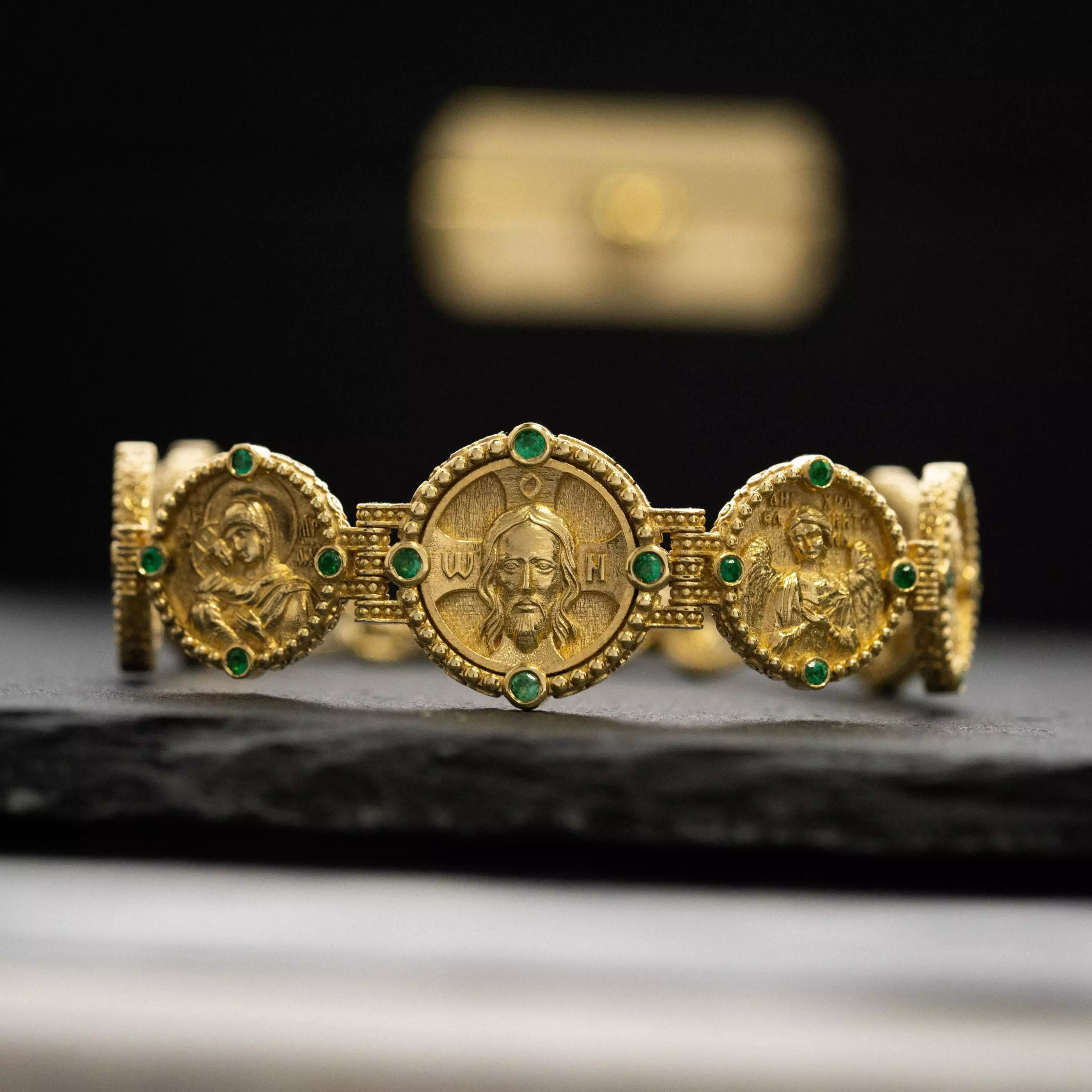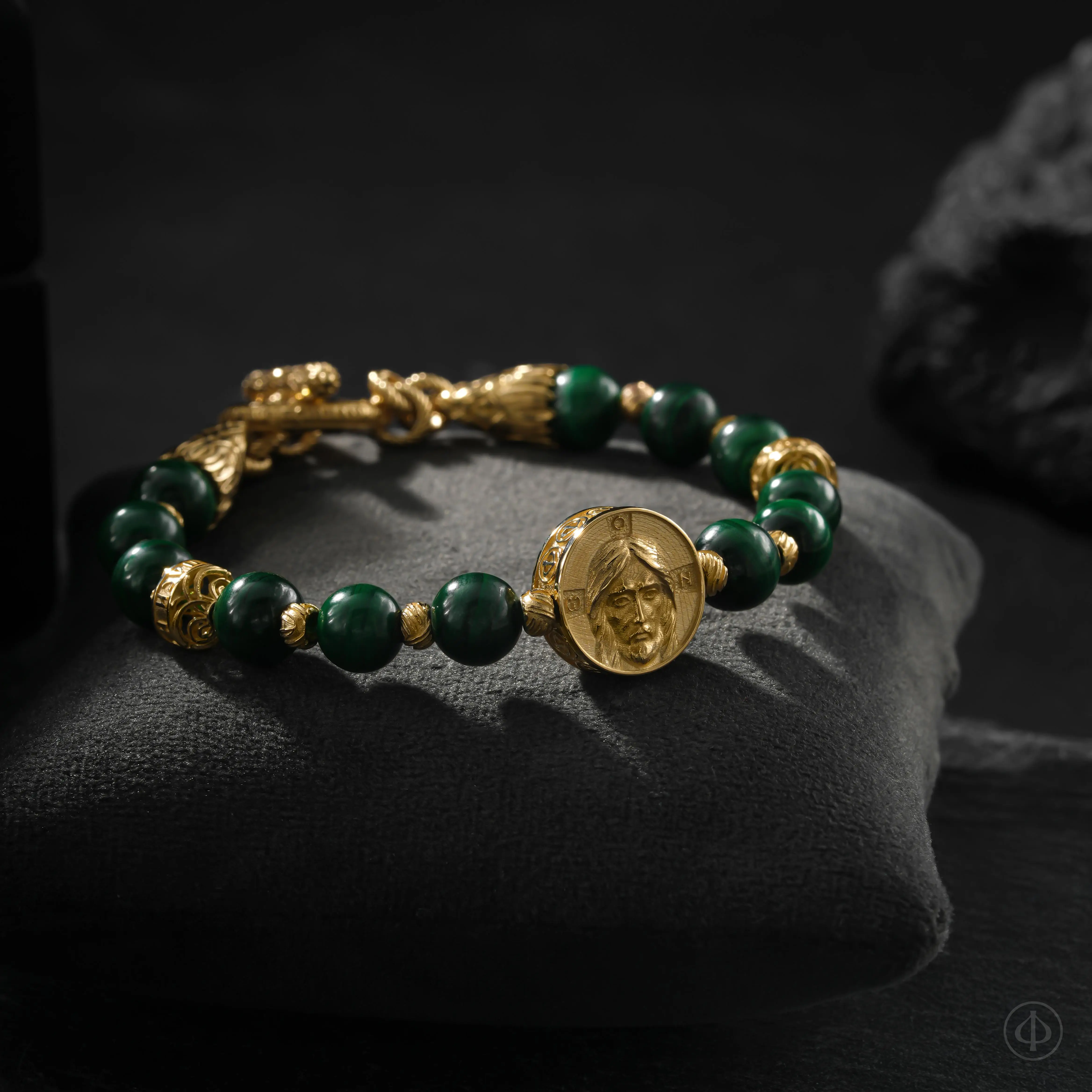 Браслеты-бусины. В таких браслетиках гармонично сочетаются драгоценный металл и камни – малахит или агат. Станут для христианина важной реликвией. На украшении с малахитом имеется икона Спаса Нерукотворного, слова Иисусовой молитвы и «Спаси и сохрани». Ювелирное изделие с агатом включает слова «Иисусовой молитвы», изображение виноградной лозы и Хризму.