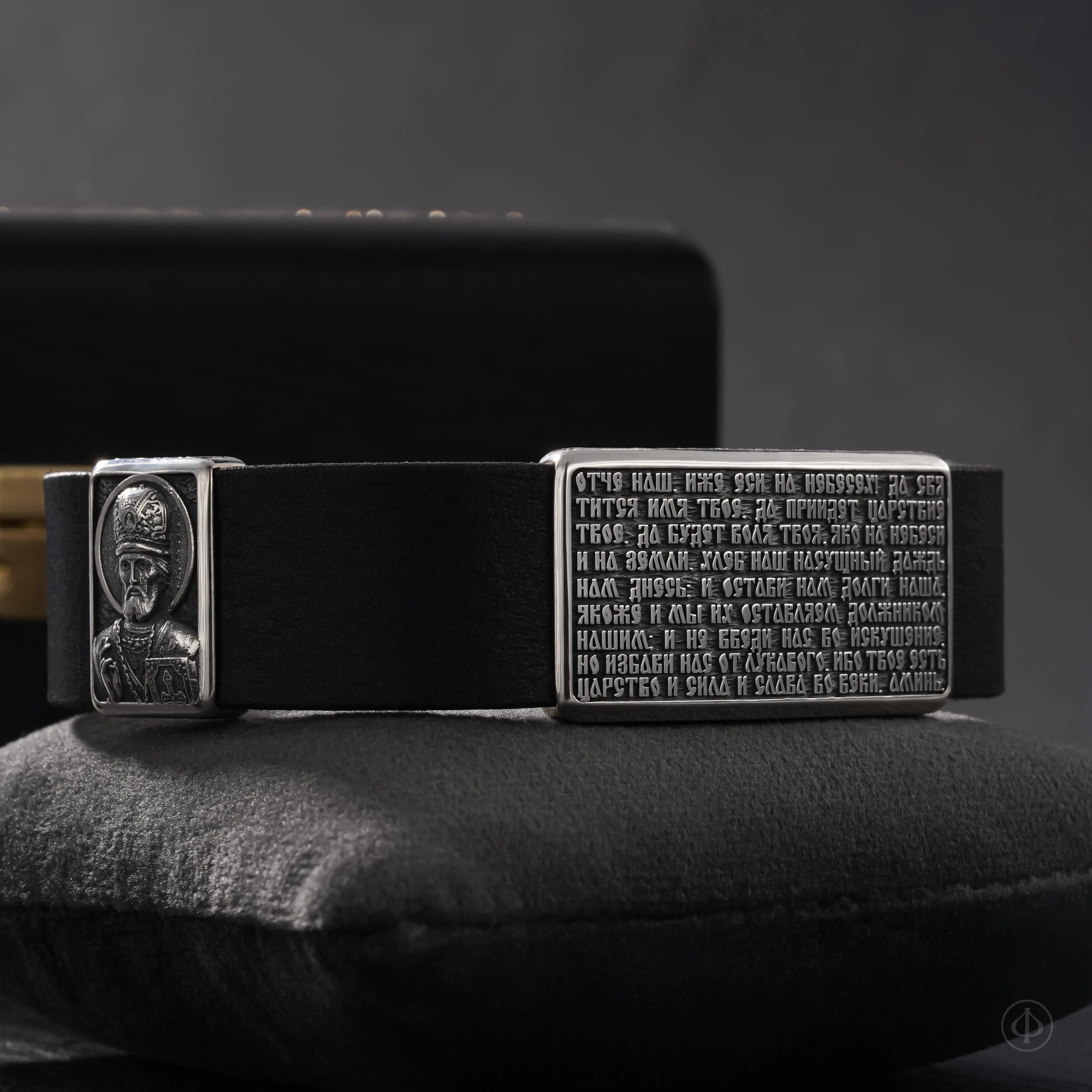 Кожаные модели. Обычно предусмотрено сочетание кожи с драгоценным металлом (серебро). Яркий пример такого украшения из нашего каталога – браслет из серебра и кожи. На ювелирном изделии изображено множество христианских святынь: икона Николая Чудотворца и Казанской Девы Марии, слова молитв «Отче наш» и «О спокойствии духа». Также имеются изображение Голгофского креста и Хризма.