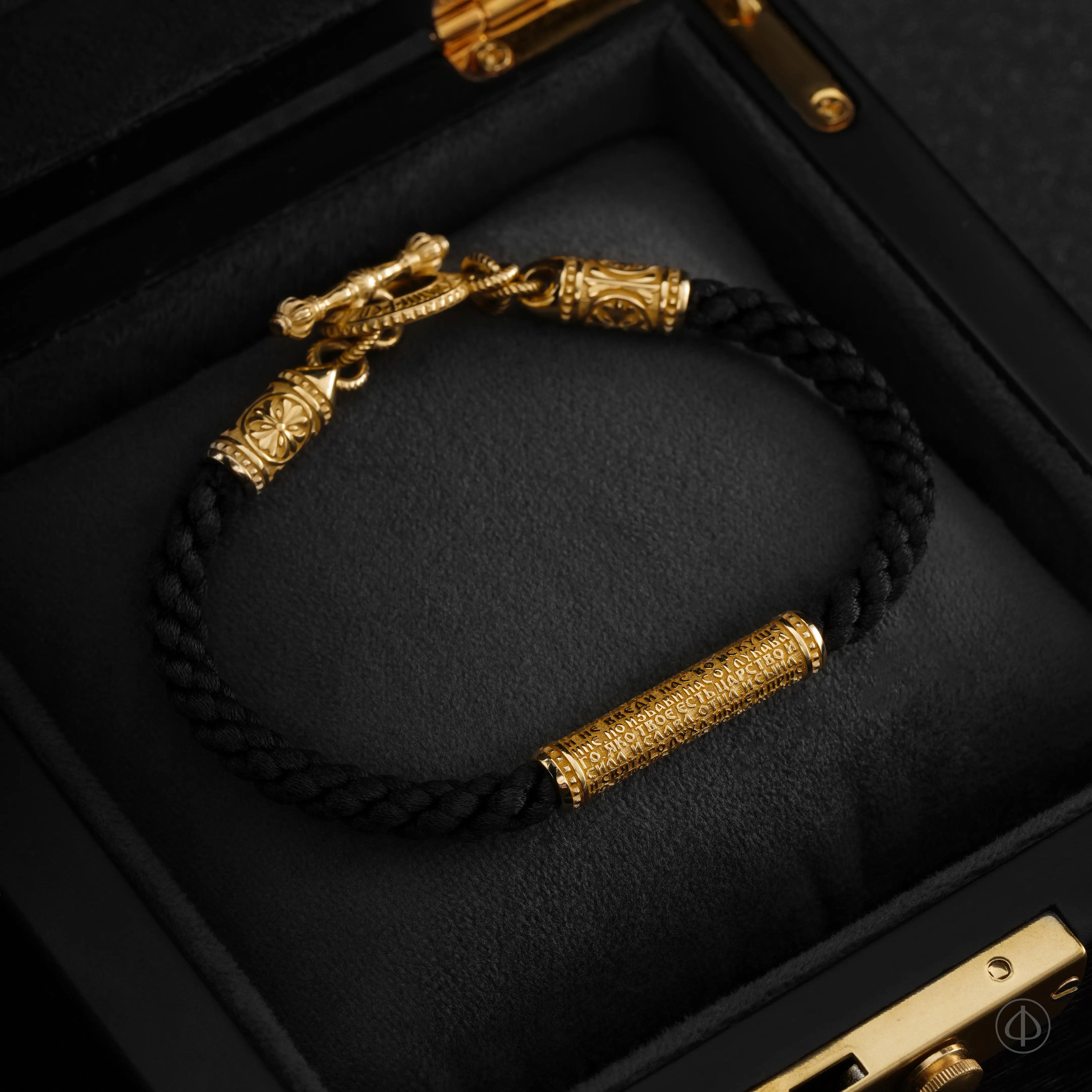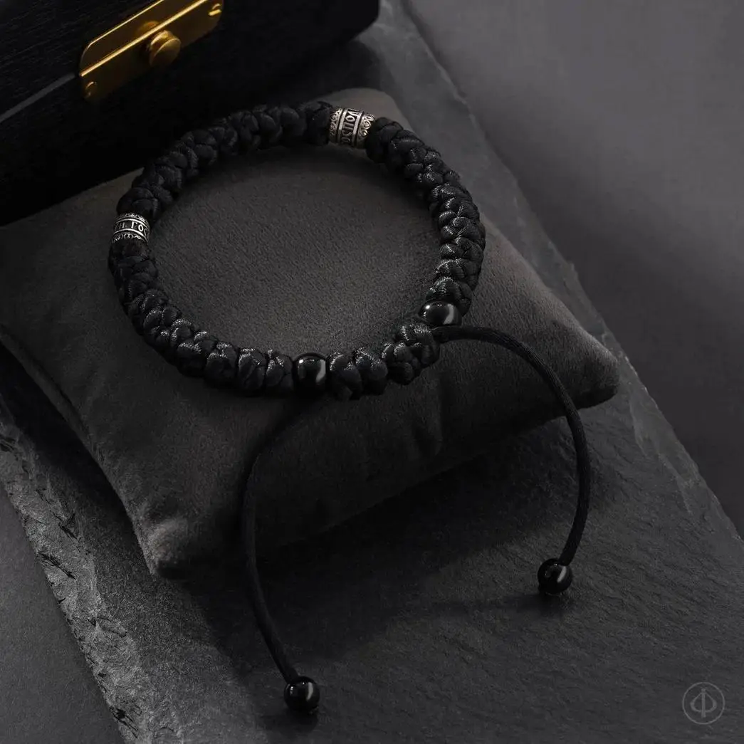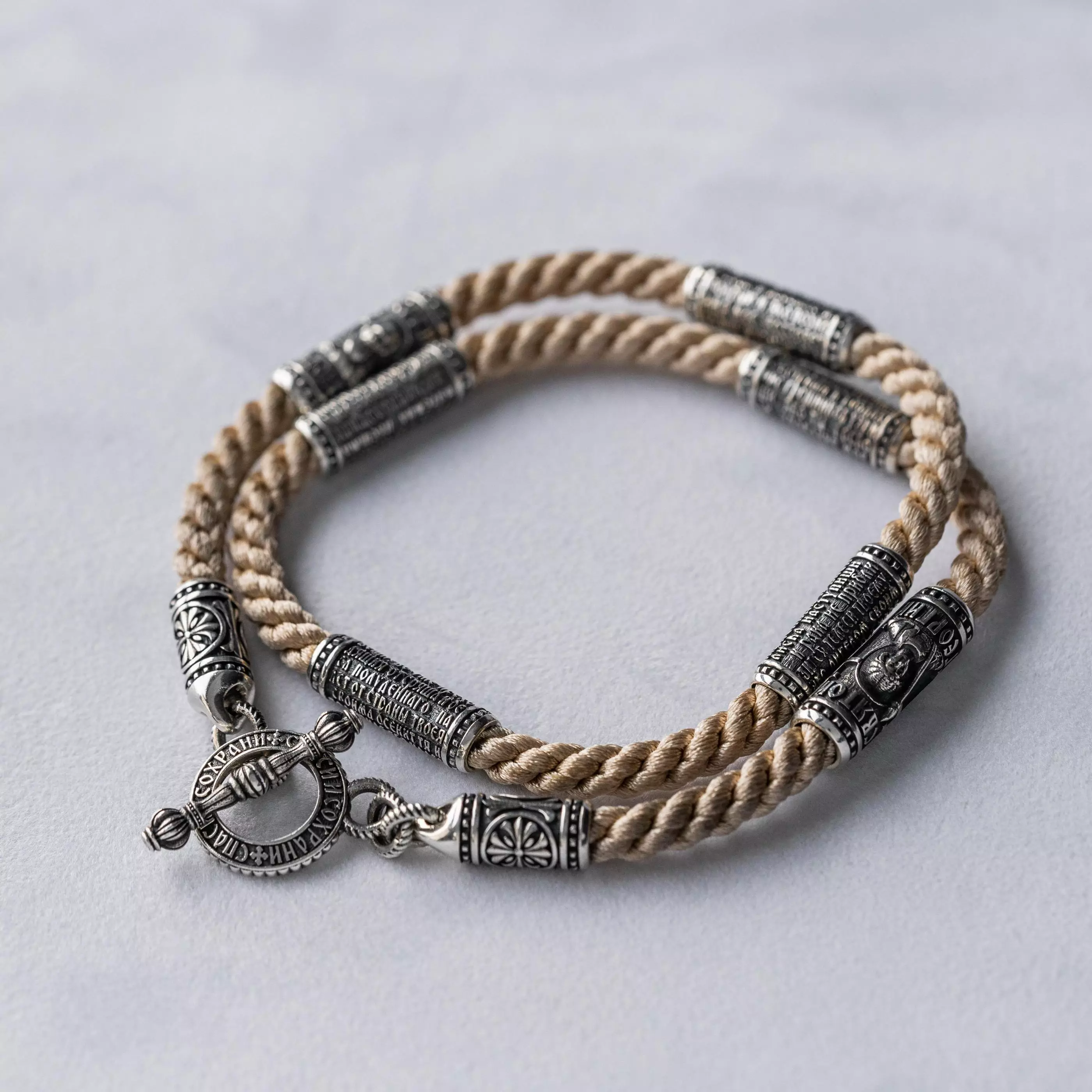 Шнуры. Мы не изменяем традициям и предлагаем в одном украшении уникальное сочетание шнура и вставок из драгоценных металлов. Например, браслет из серебра и золота на шнуре. Основа аксессуара выполнена из шнура, а на вставках есть слова молитвы «Псалом 90», лик Спаса Нерукотворного, Хризма, текст «Спаси и сохрани» и изображение восьмиконечного крестика.