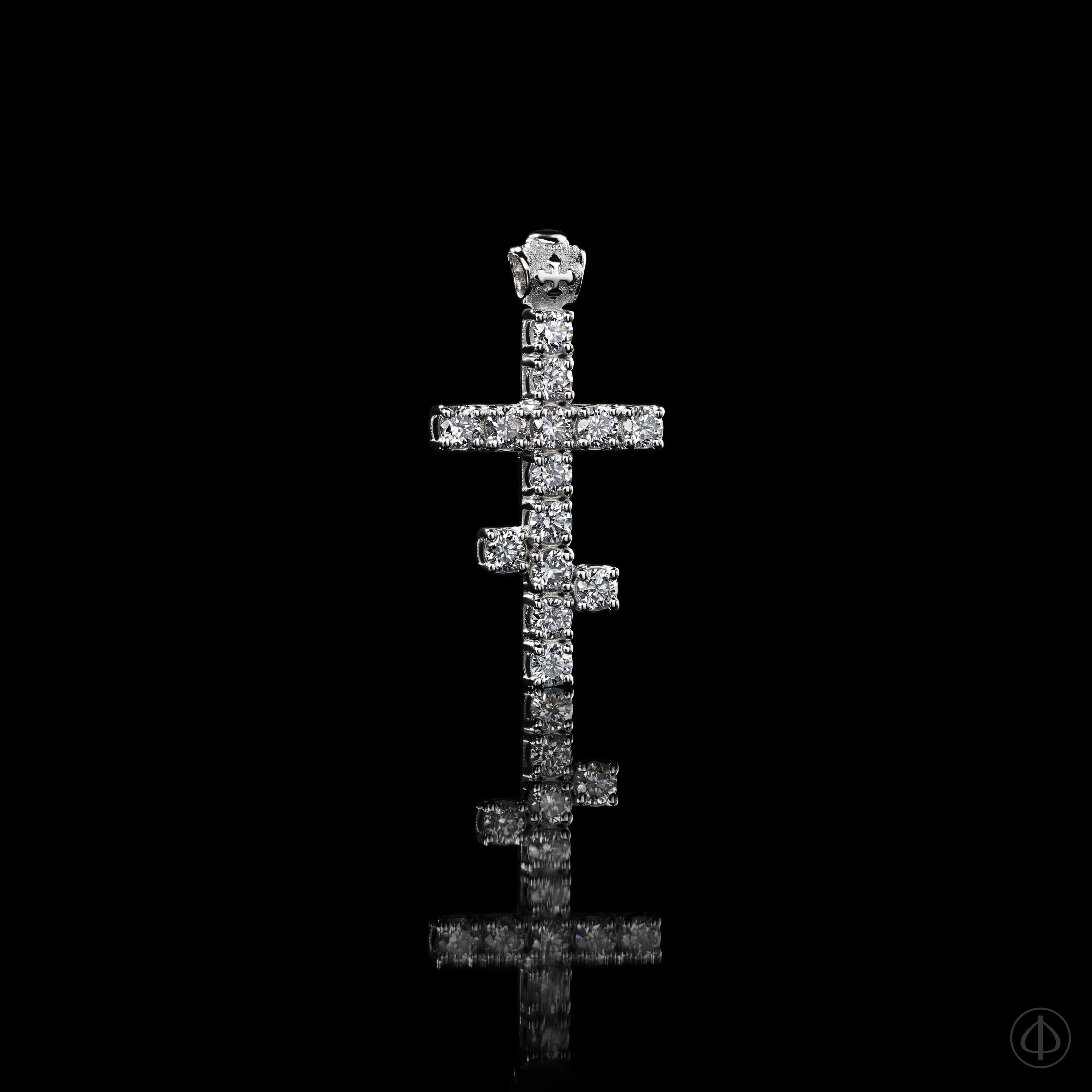Восьмиконечный крестик. У креста с восьмью концами дополнительно есть титло – верхняя перекладина. На ювелирном изделии также есть надпись “Иисус Назарей Царь Иудейский”.