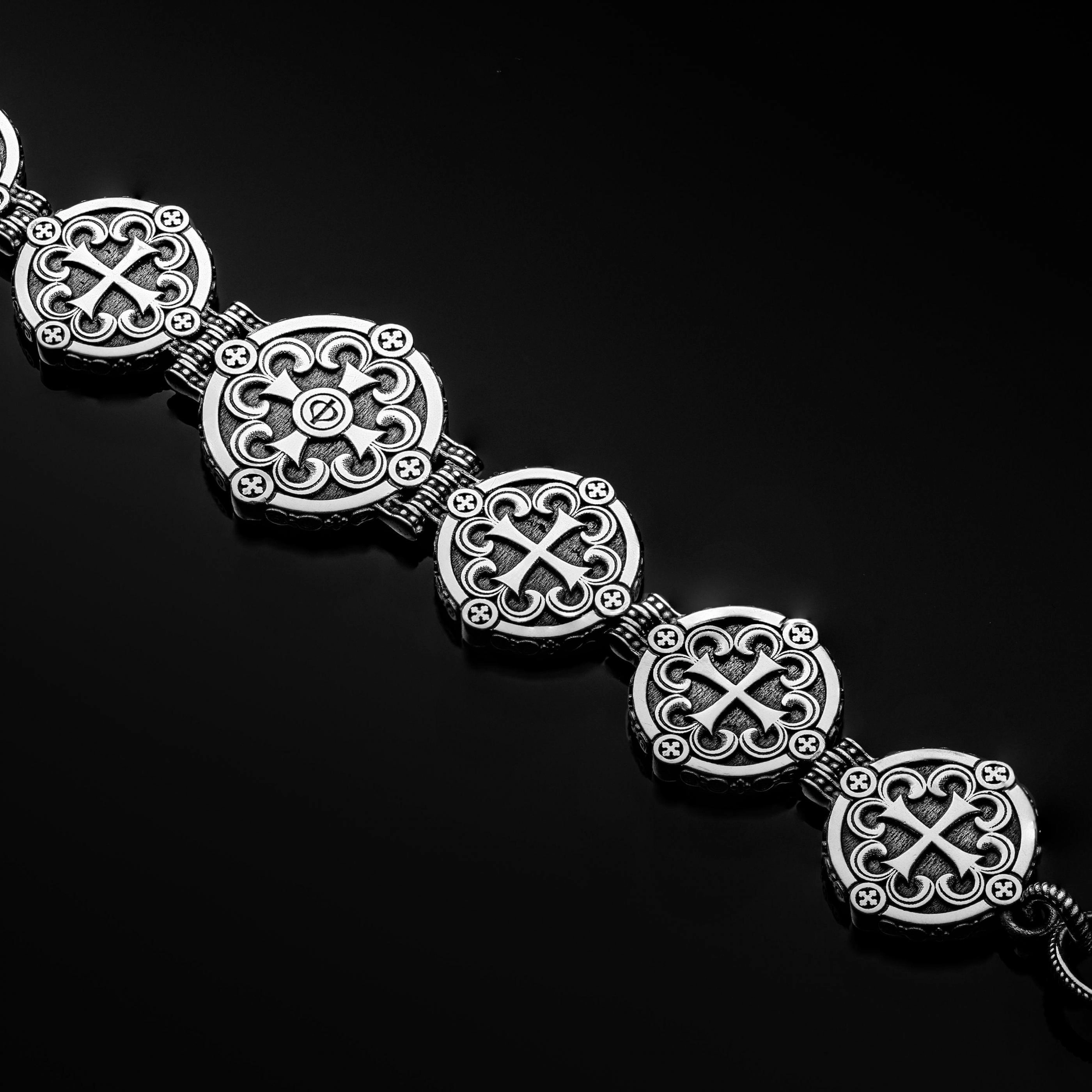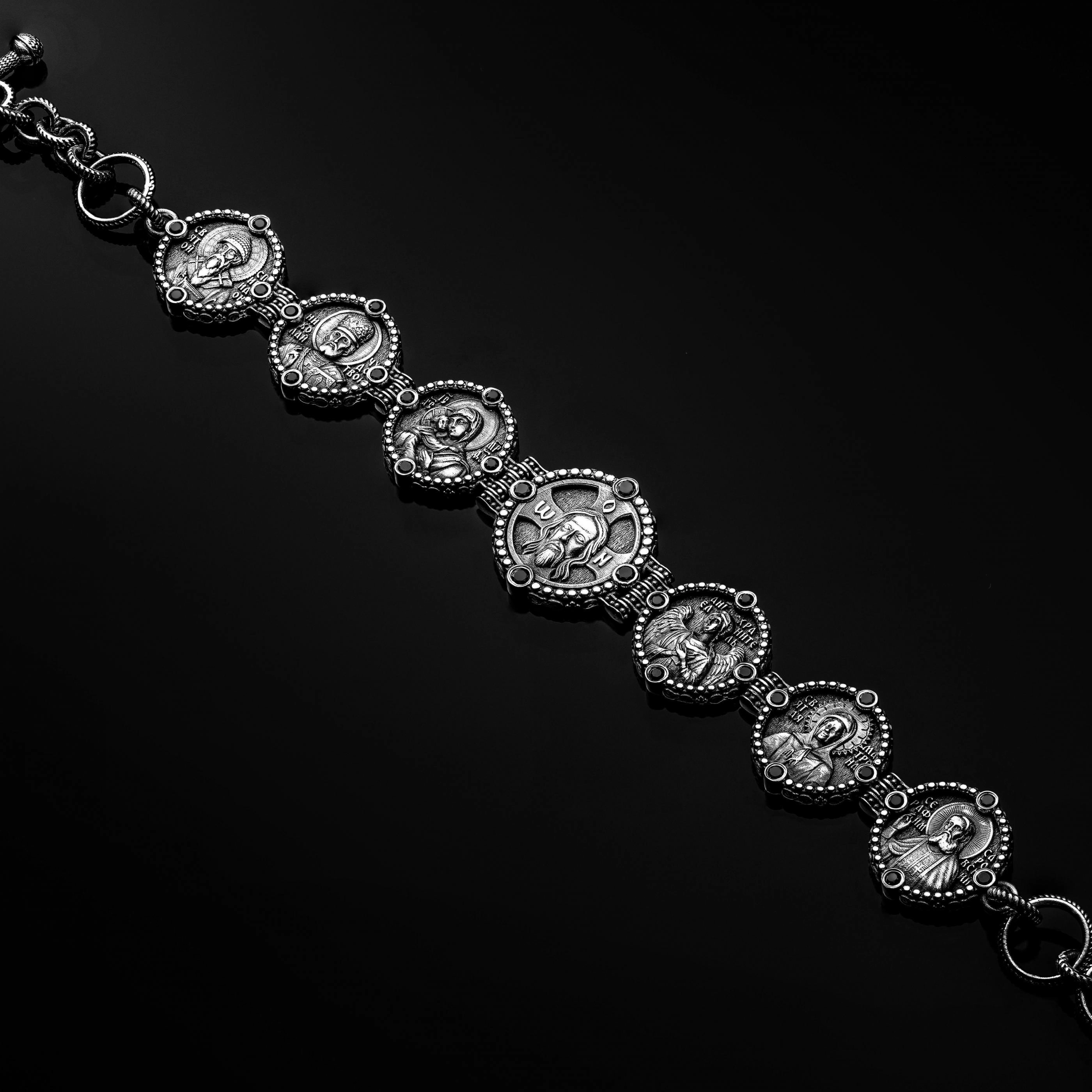 Браслет из серебра 925 пробы с фианитами (28 шт). На браслете изображены 9 сильнейших образов святых.