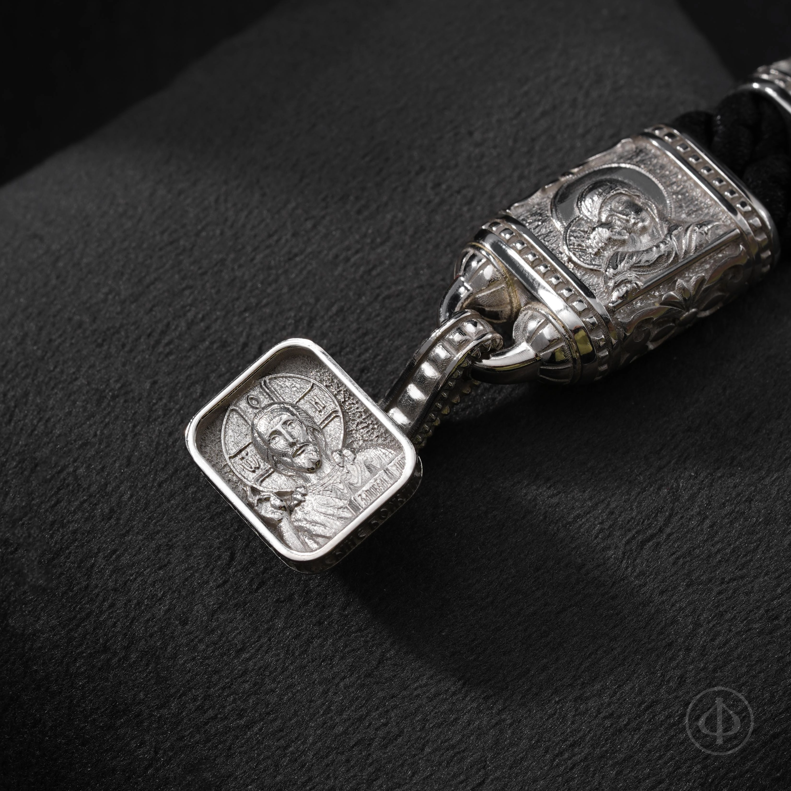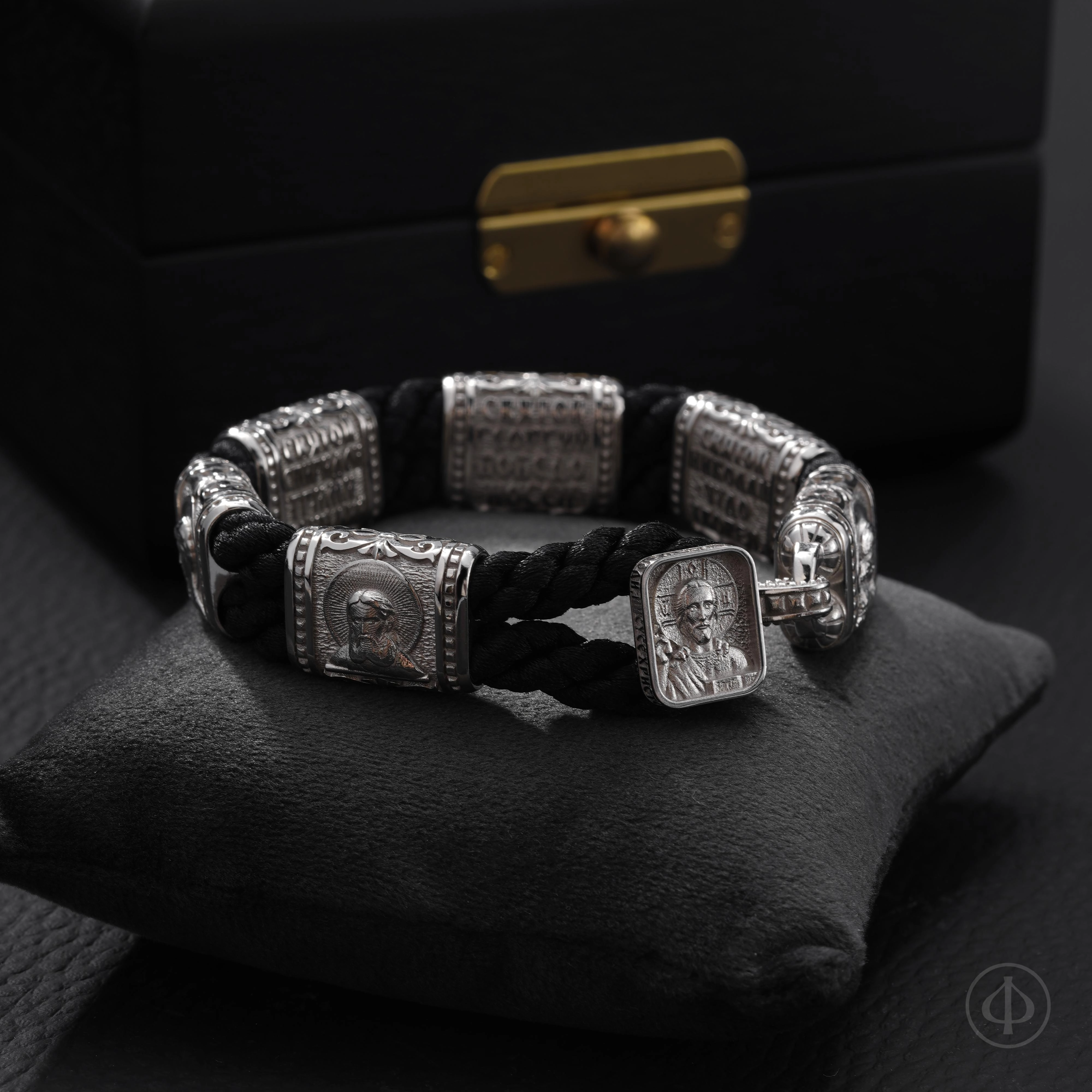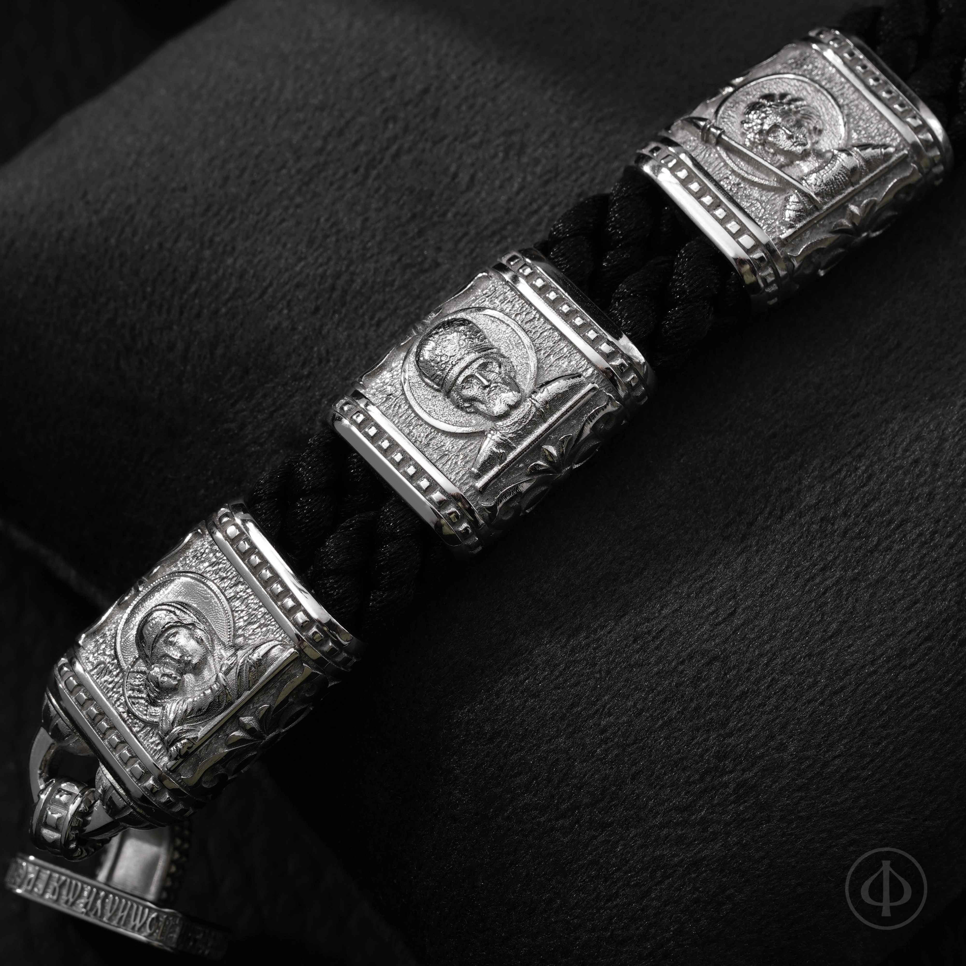 На оборотной стороне вставок расположены подписи к иконам. Замок украшен образом Господа Вседержителя, а по его торцу проходит Иисусова молитва — краткая, но глубокая, как дыхание. Она превращает функциональную деталь браслета в его духовное сердце.