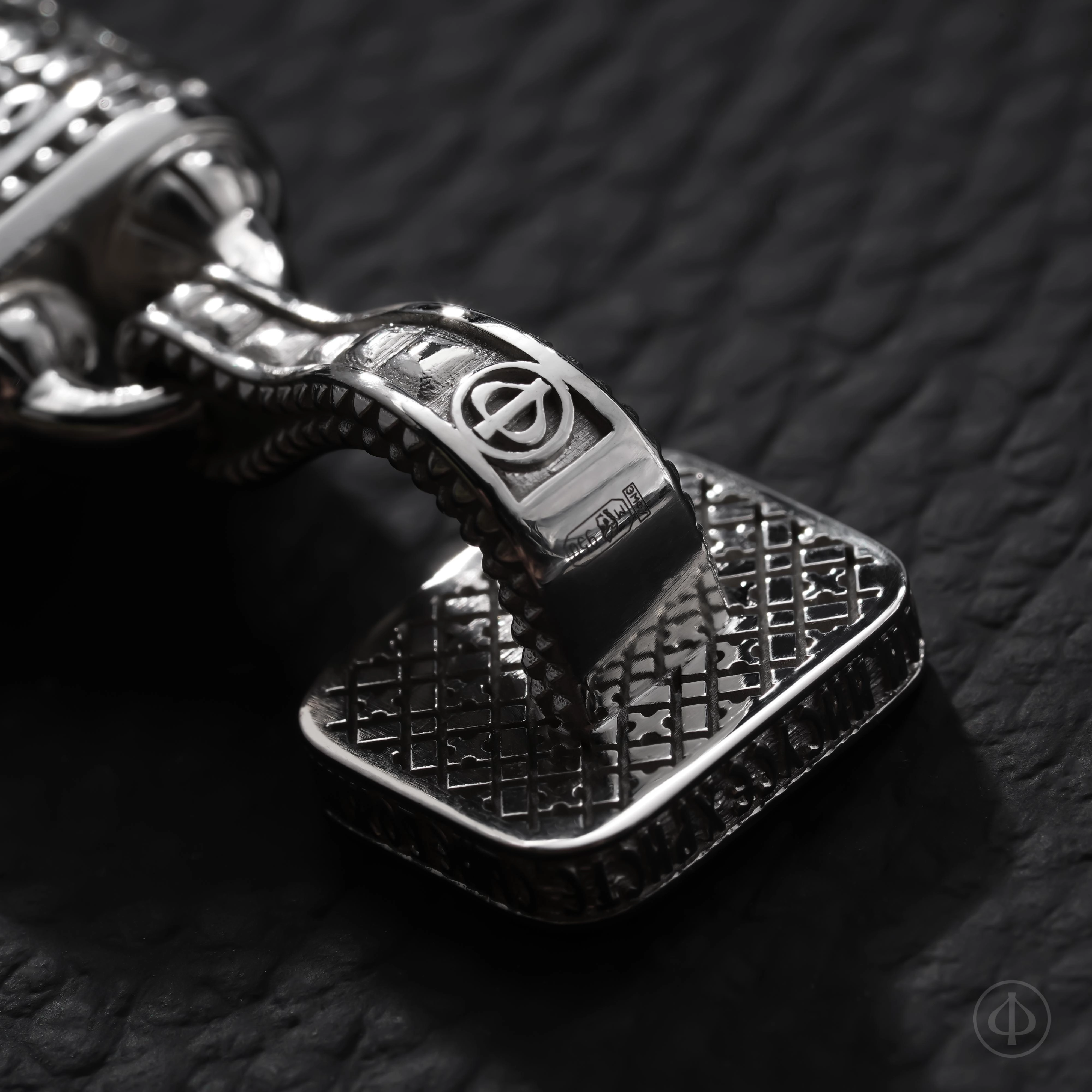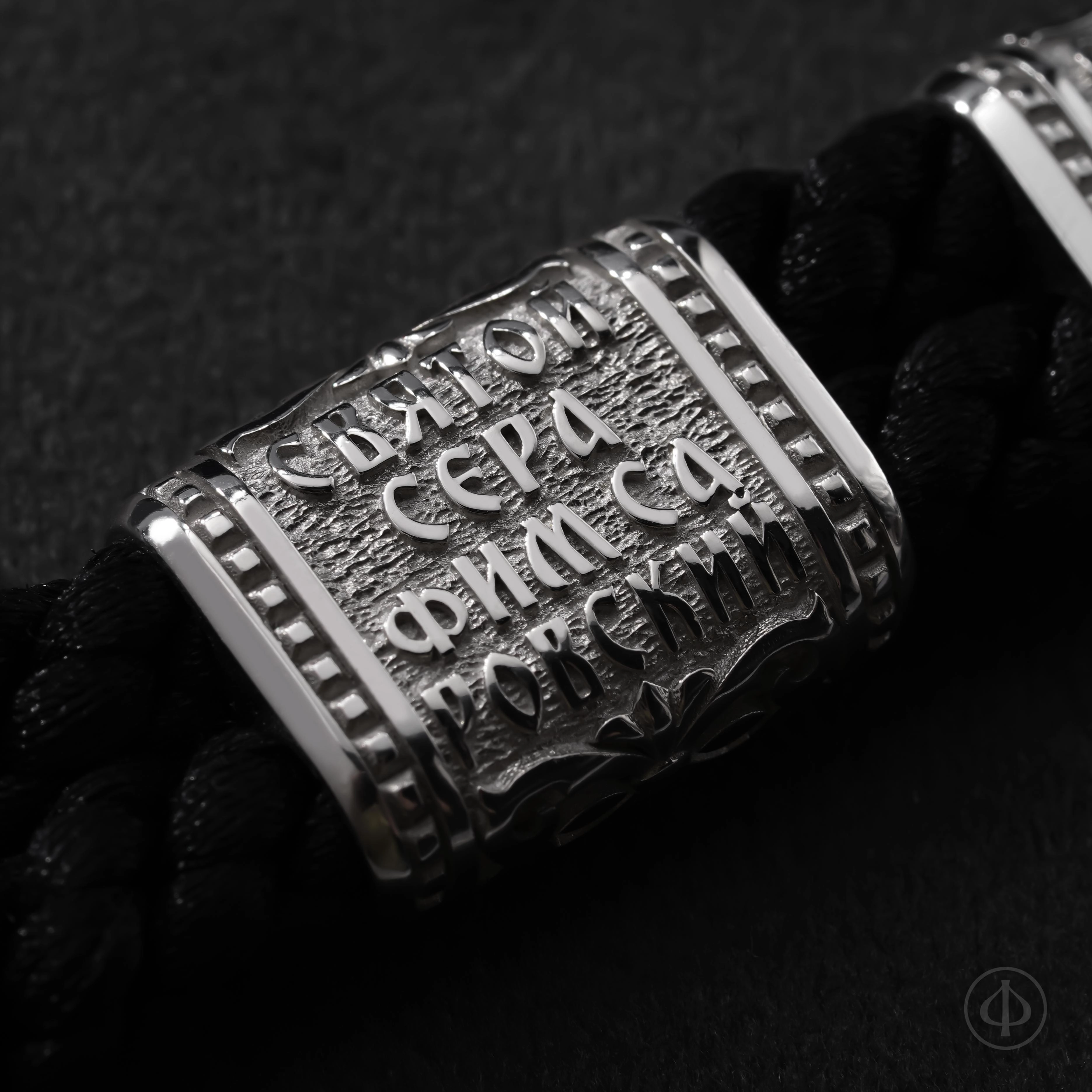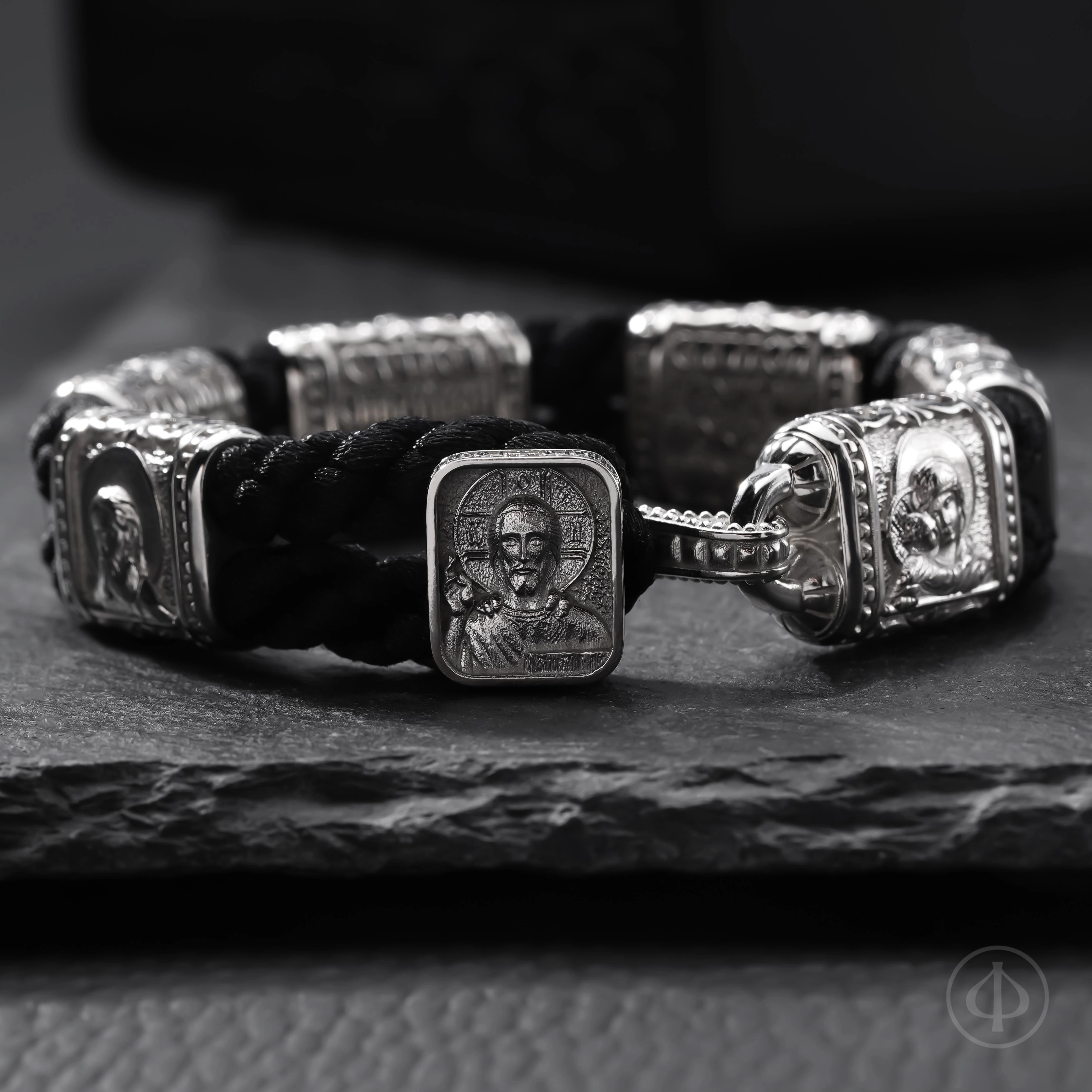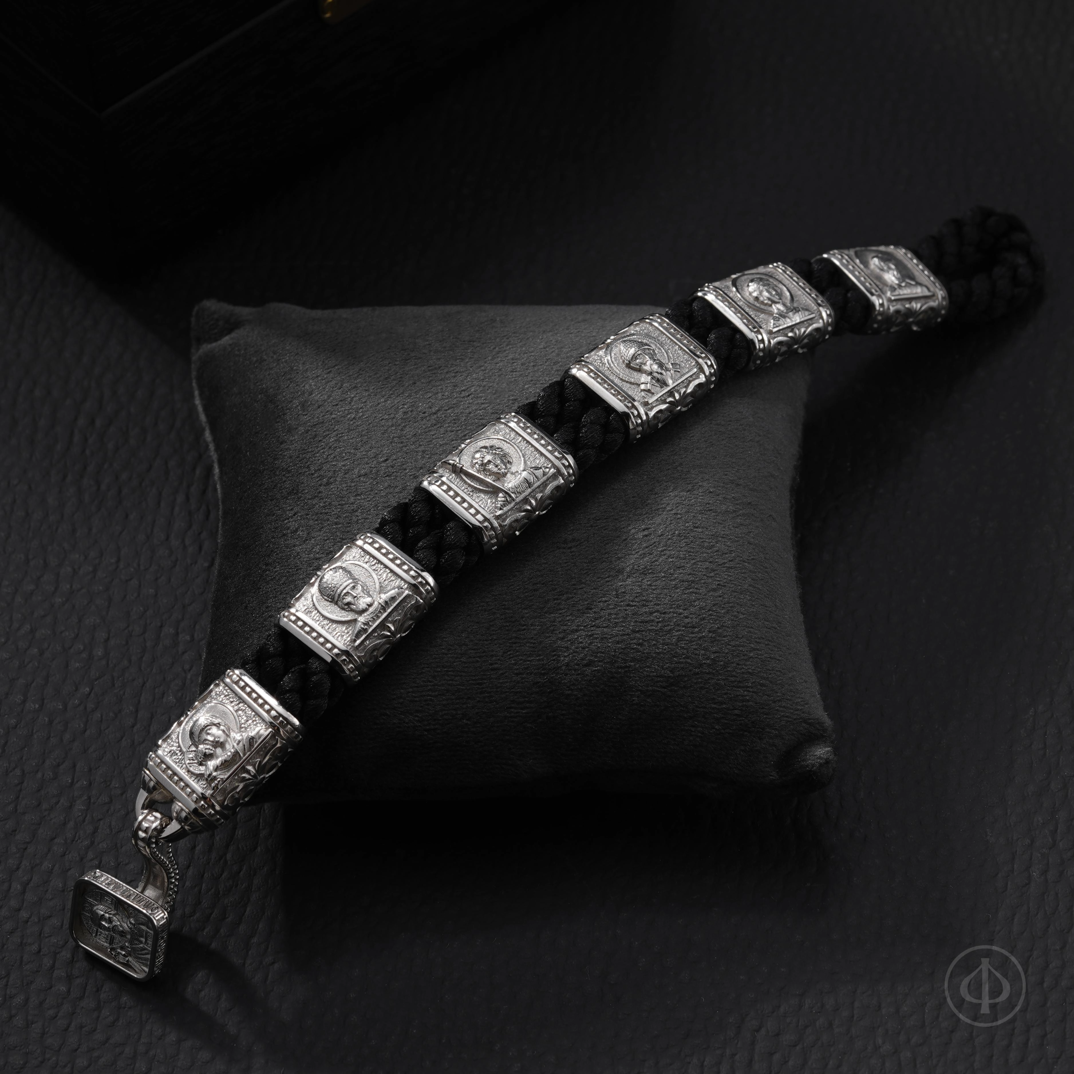 На оборотной стороне вставок расположены подписи к иконам. Замок украшен образом Господа Вседержителя, а по его торцу проходит Иисусова молитва — краткая, но глубокая, как дыхание. Она превращает функциональную деталь браслета в его духовное сердце.