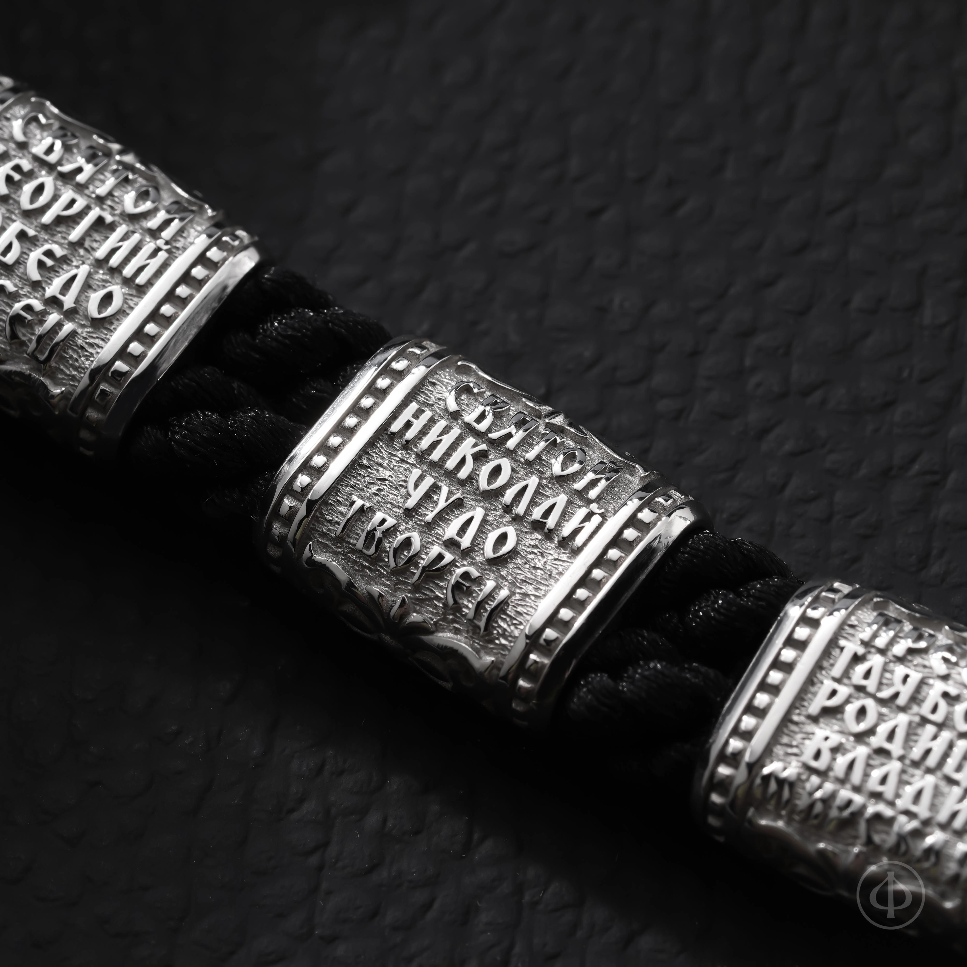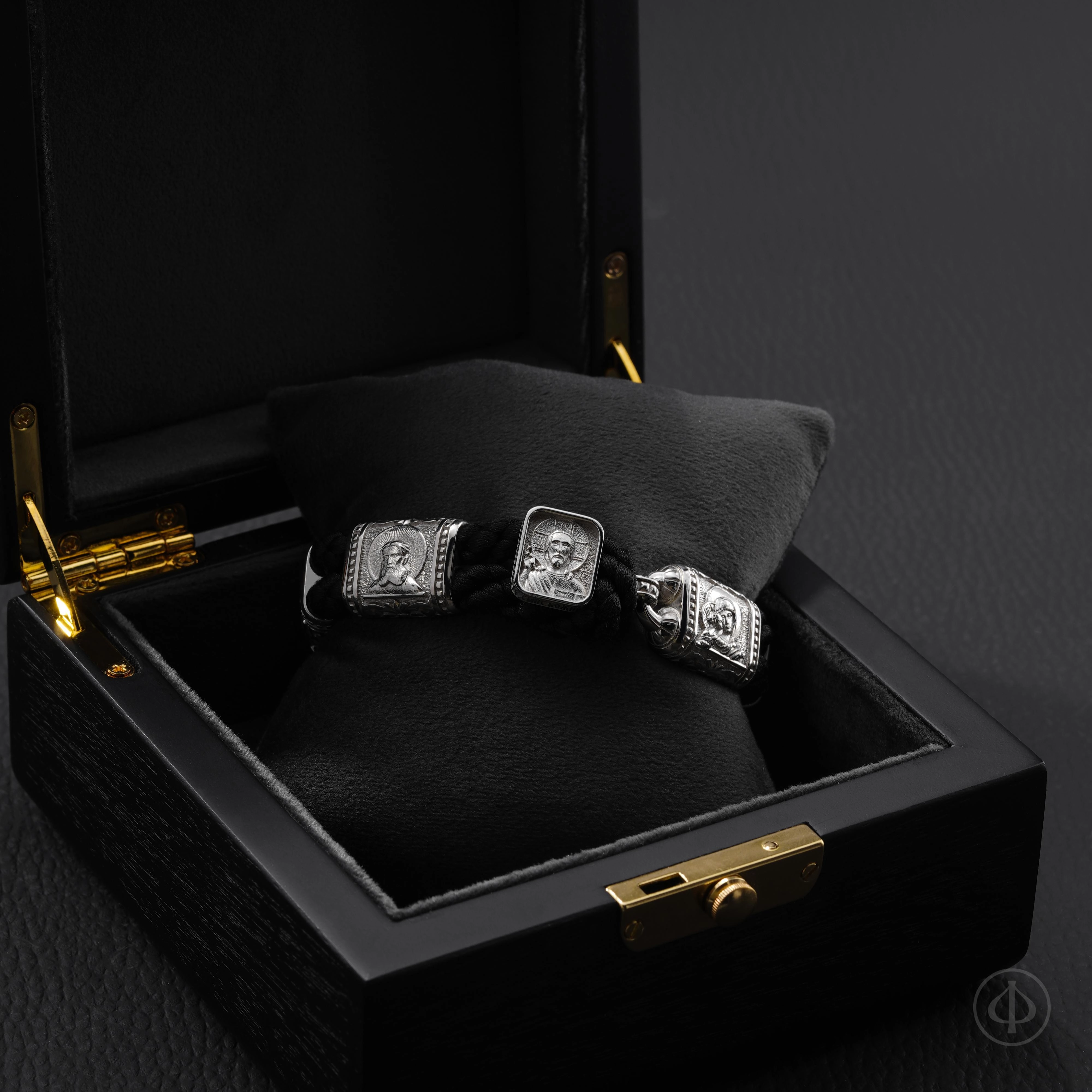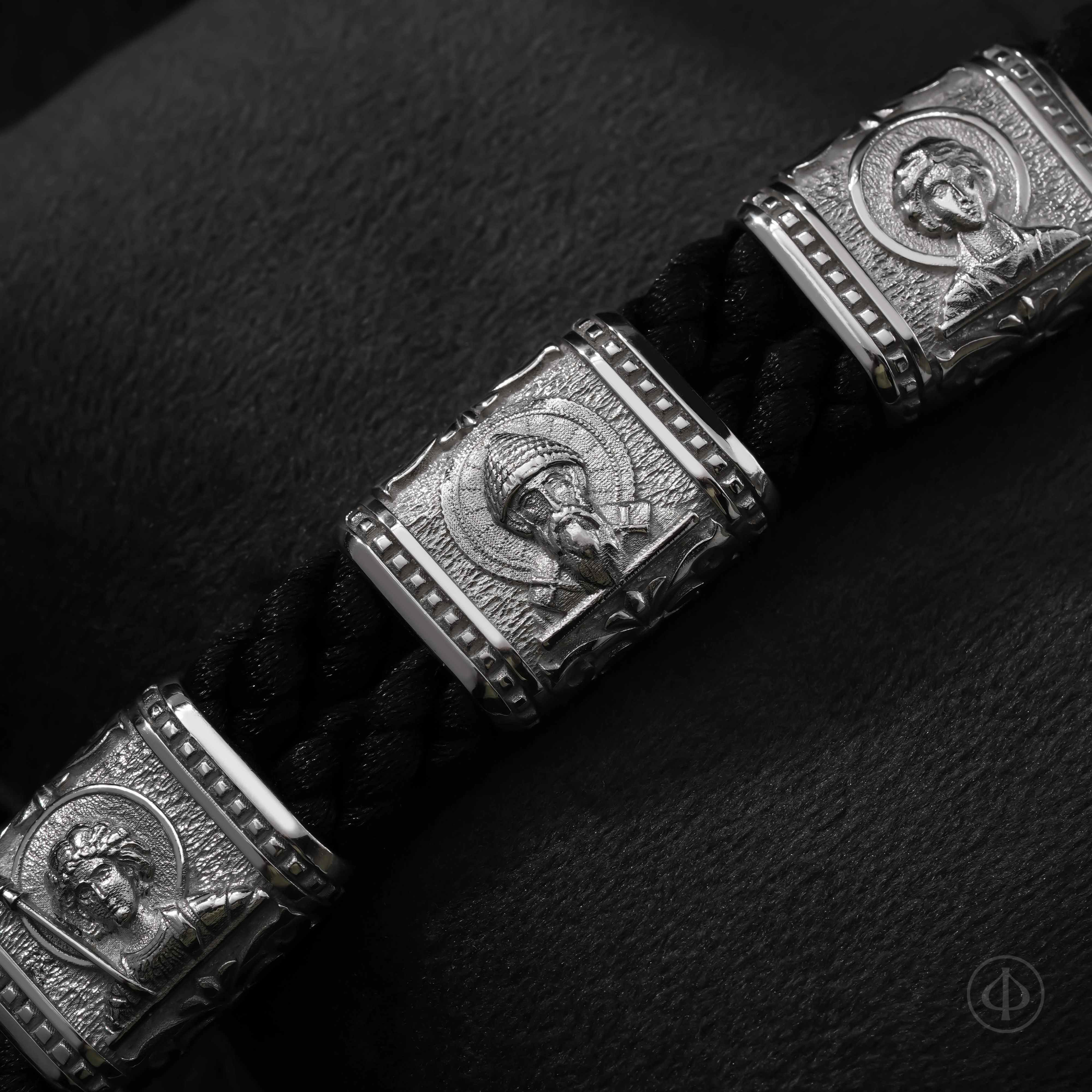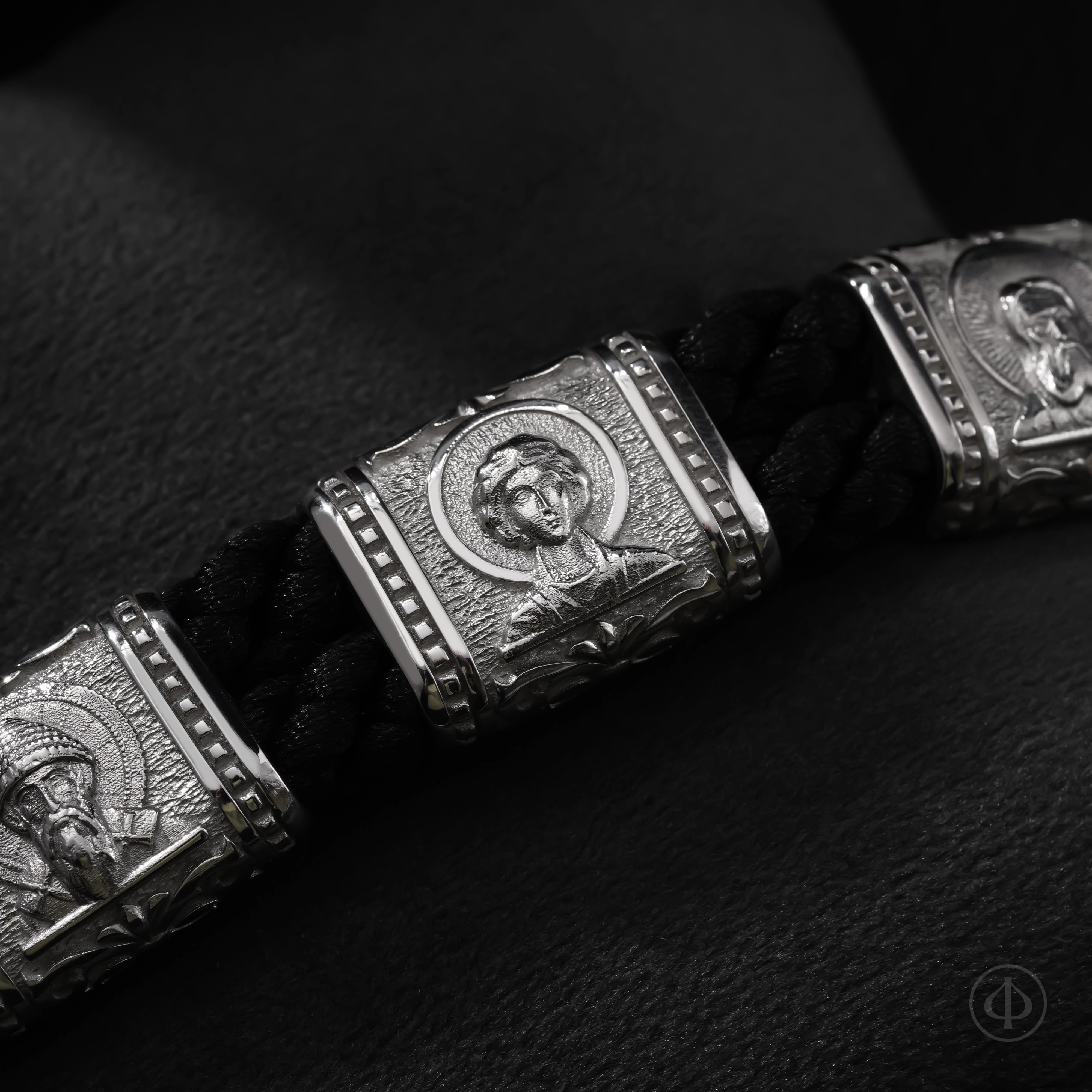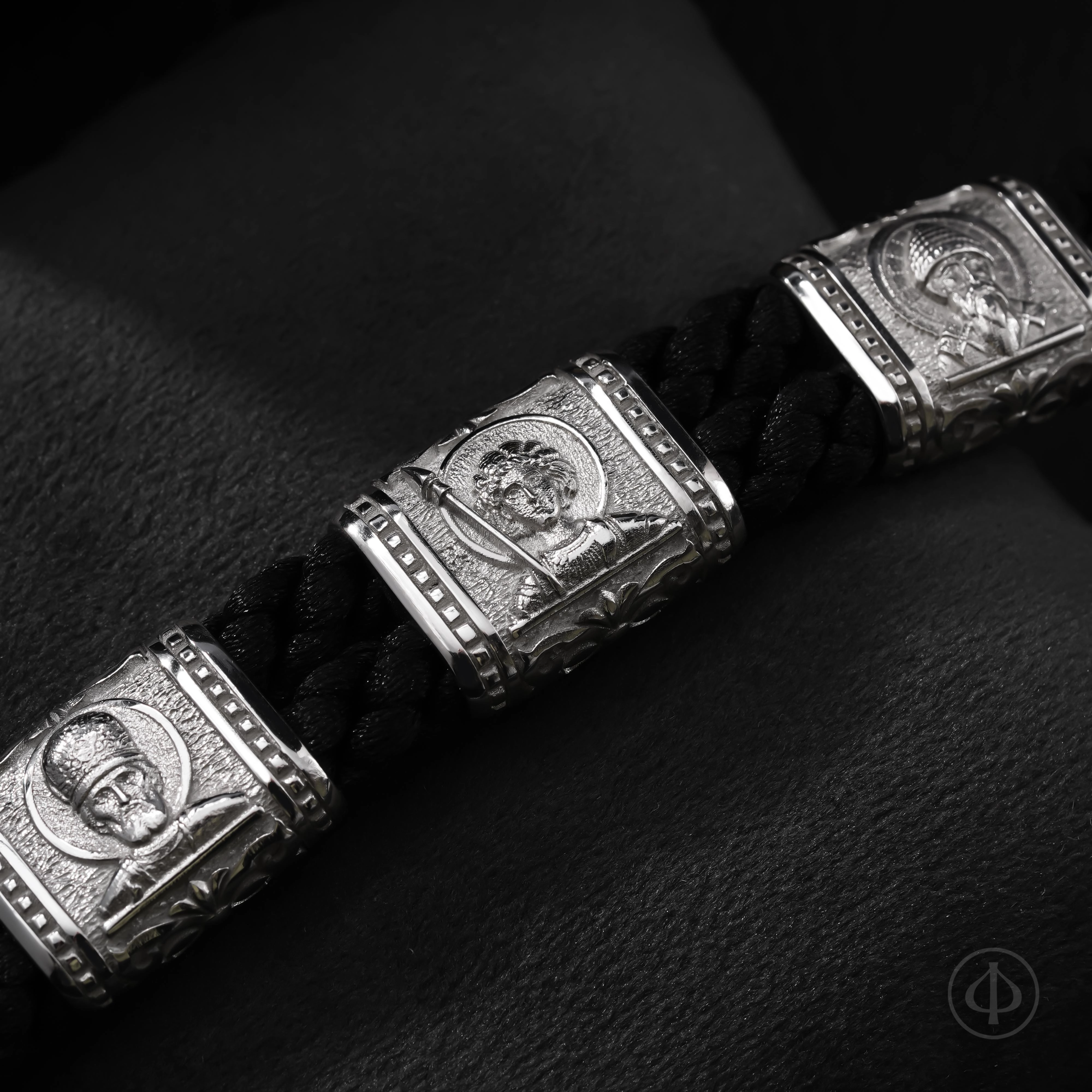 В основе браслета прочный плетёный шнур из лавсана, мягкий на ощупь и надёжный в ношении. Вставки выполнены из драгоценного металла и несут на себе иконные образы, знакомые каждому, кто хоть раз останавливался в храмовой тишине. Глубокий рельеф и выверенные пропорции придают образам спокойствие и собранность, близкие к канонической традиции.