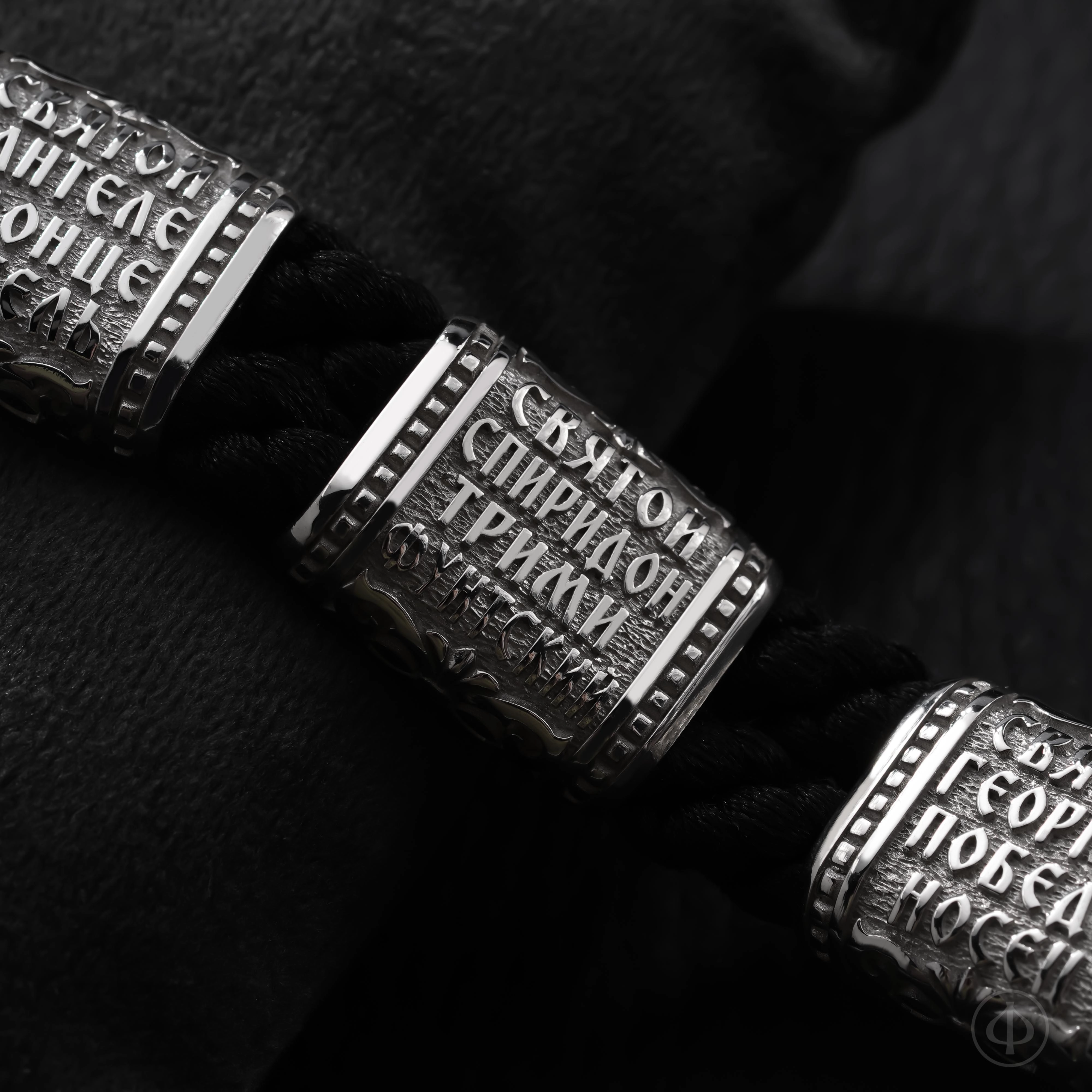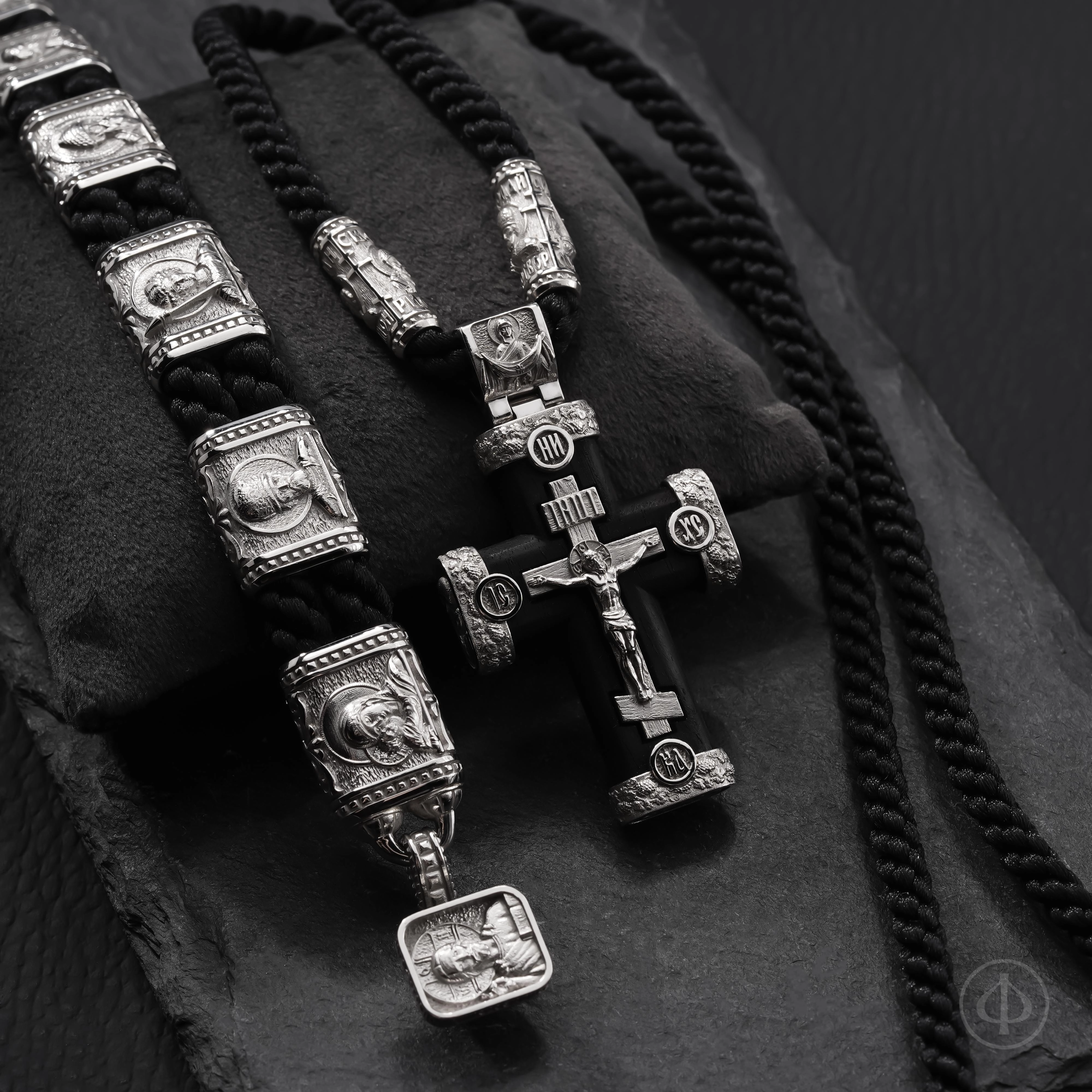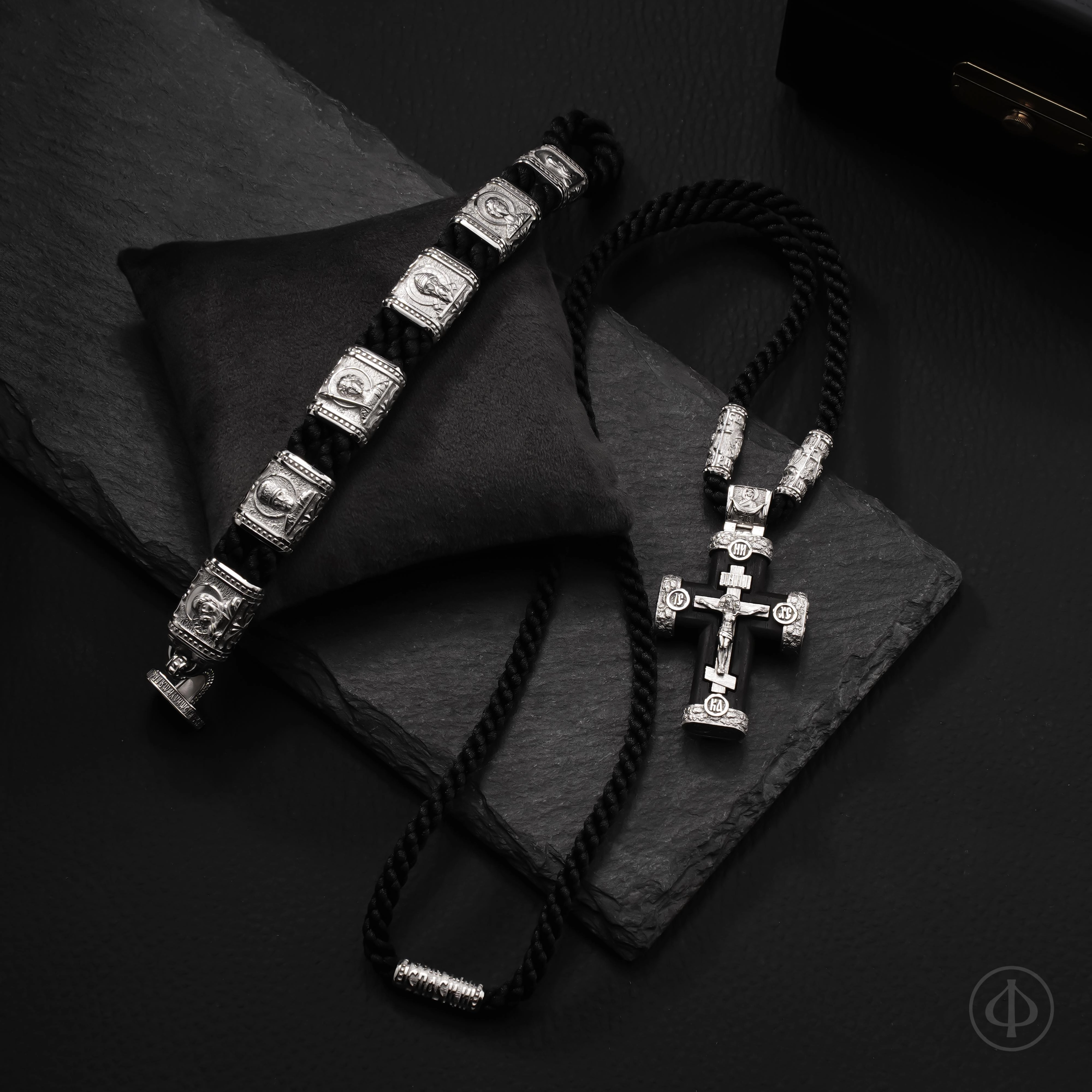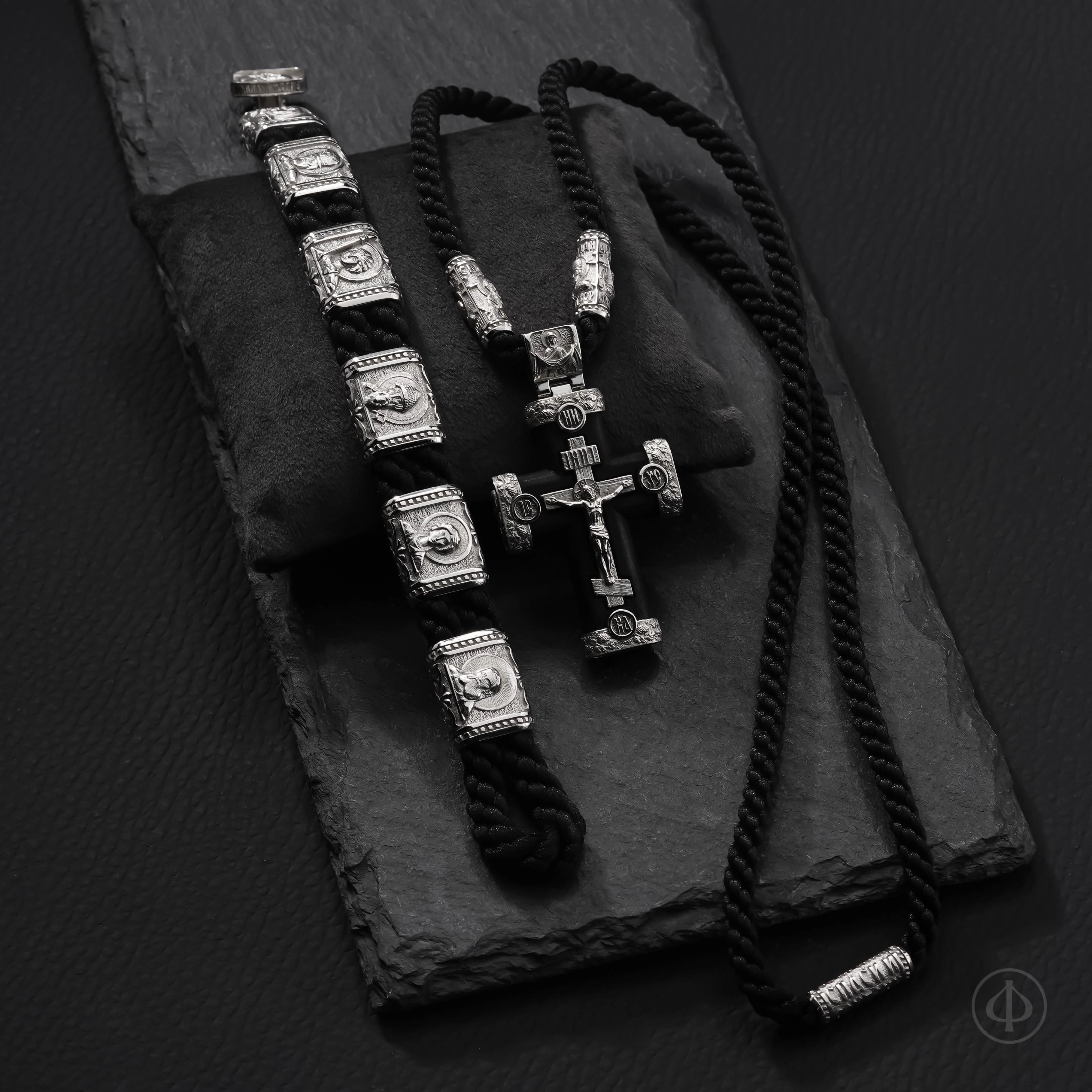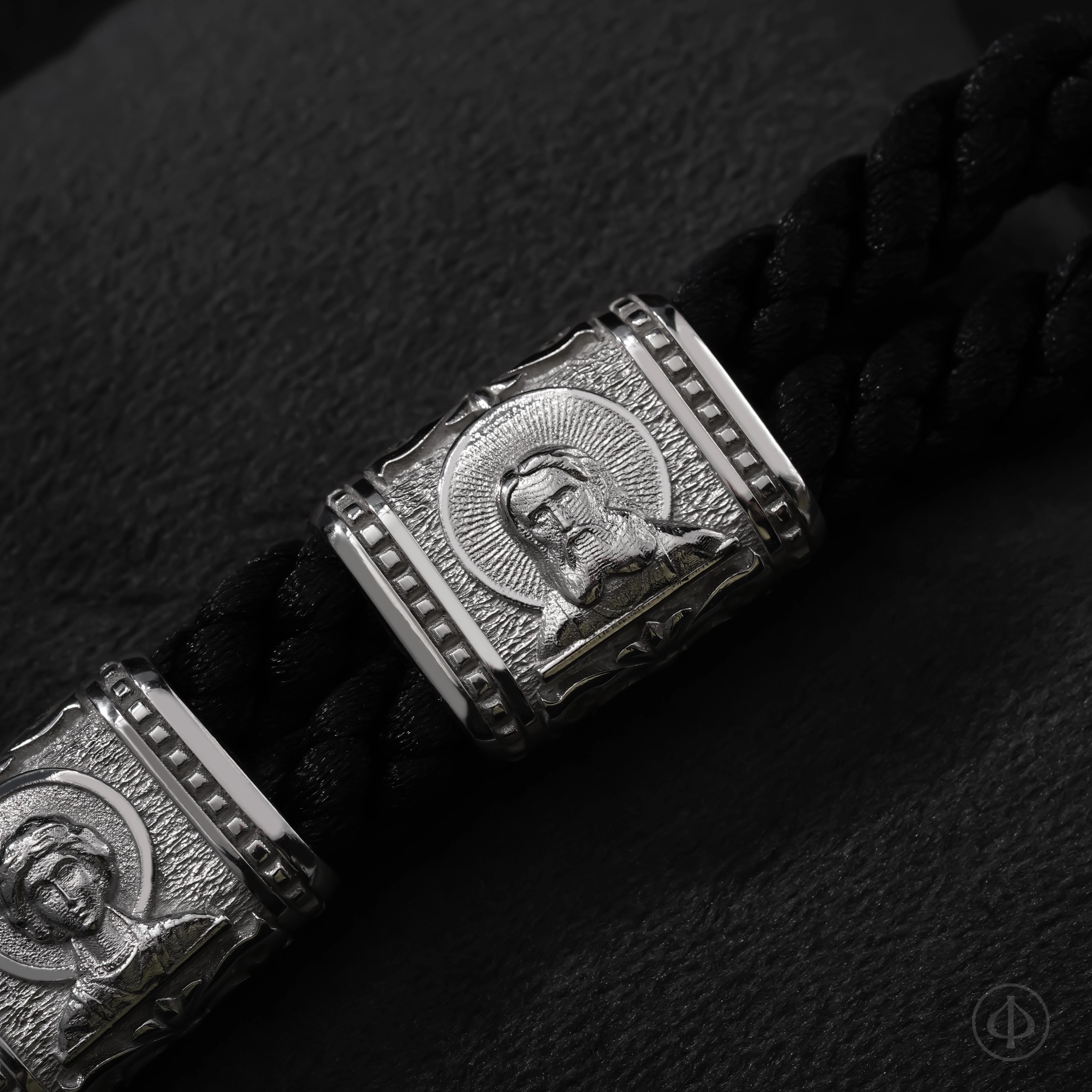 В основе браслета прочный плетёный шнур из лавсана, мягкий на ощупь и надёжный в ношении. Вставки выполнены из драгоценного металла и несут на себе иконные образы, знакомые каждому, кто хоть раз останавливался в храмовой тишине. Глубокий рельеф и выверенные пропорции придают образам спокойствие и собранность, близкие к канонической традиции.