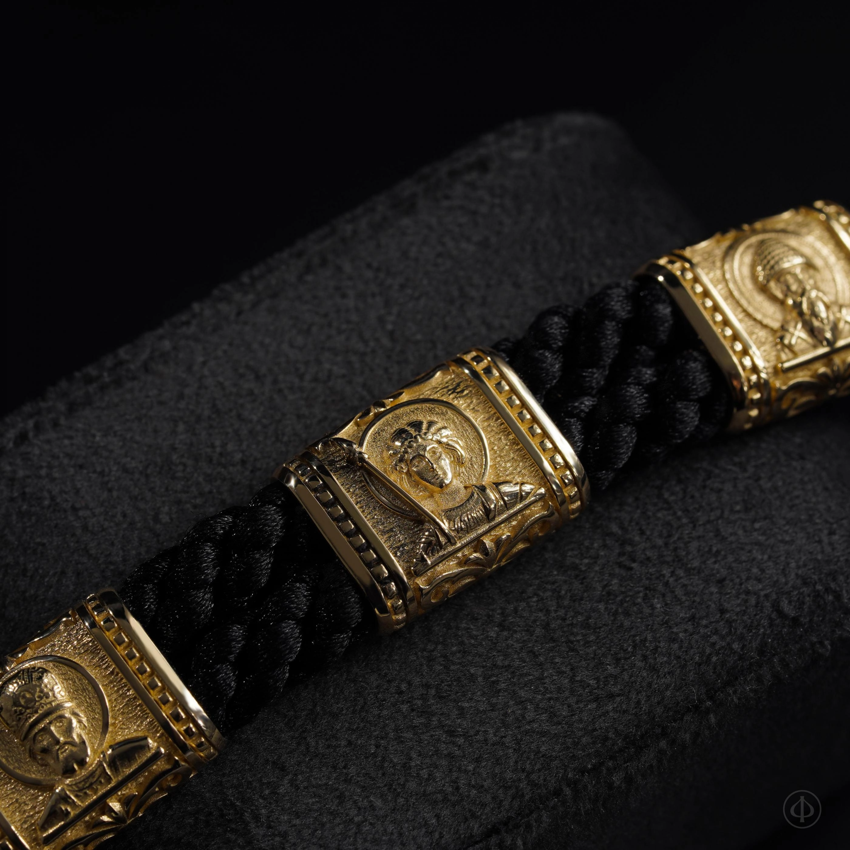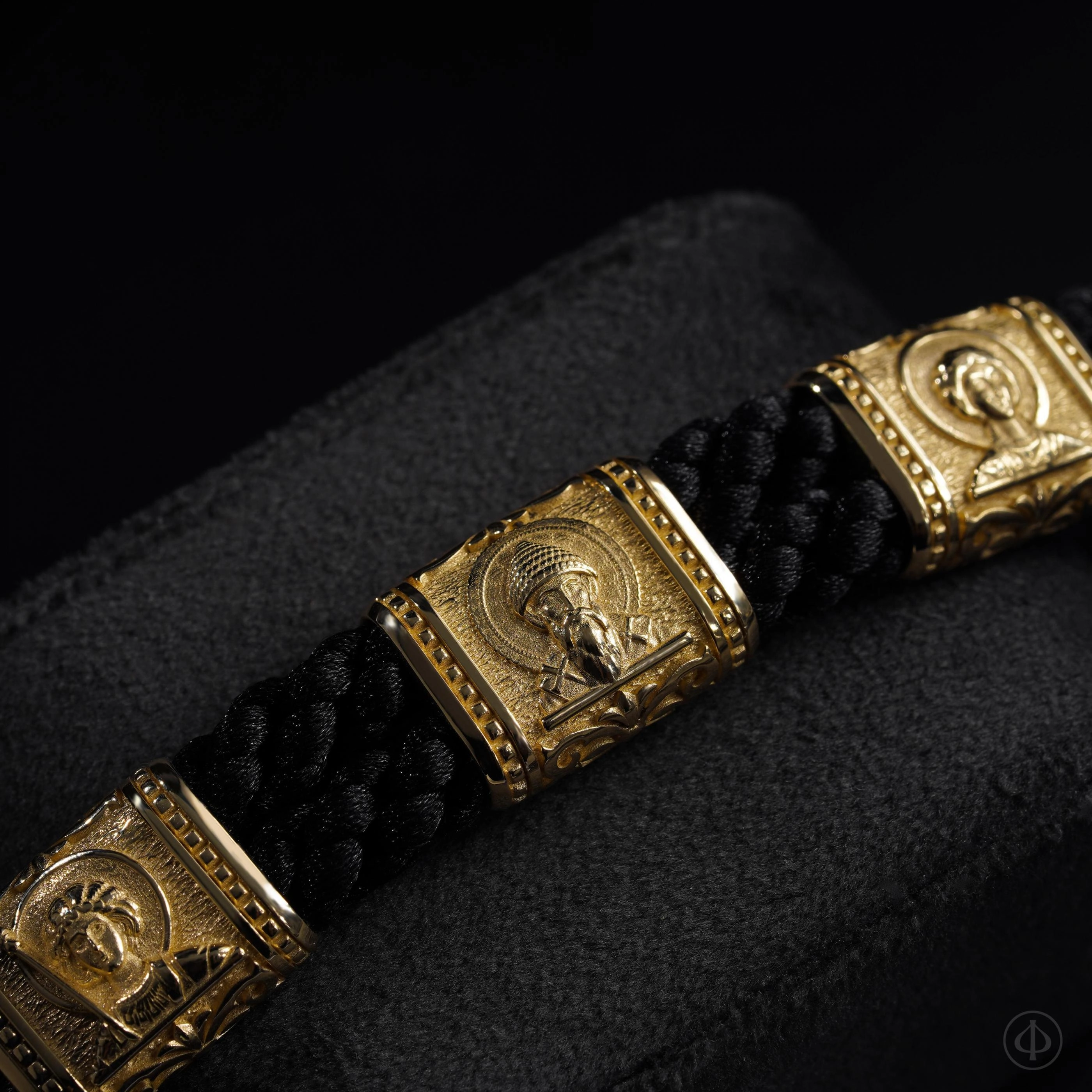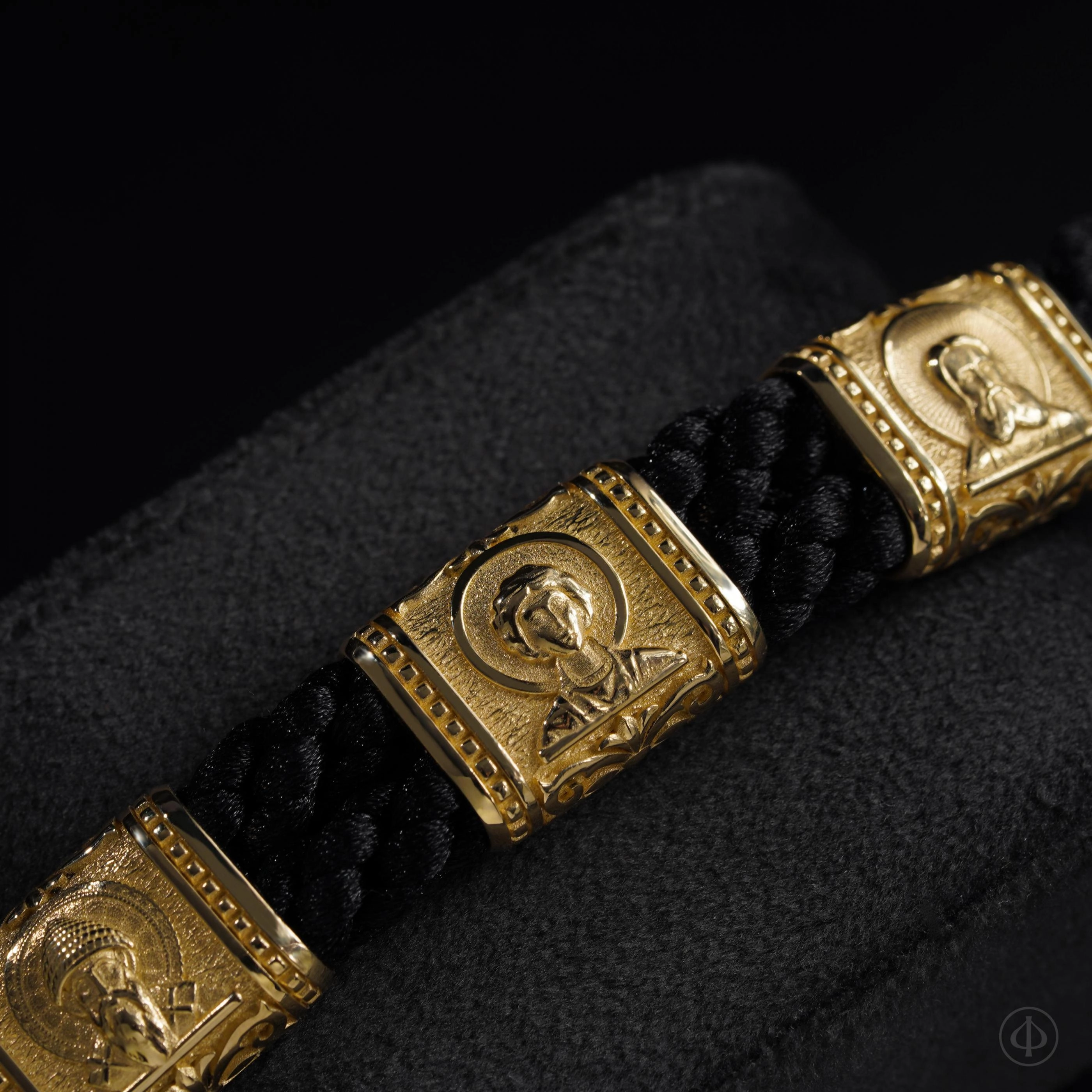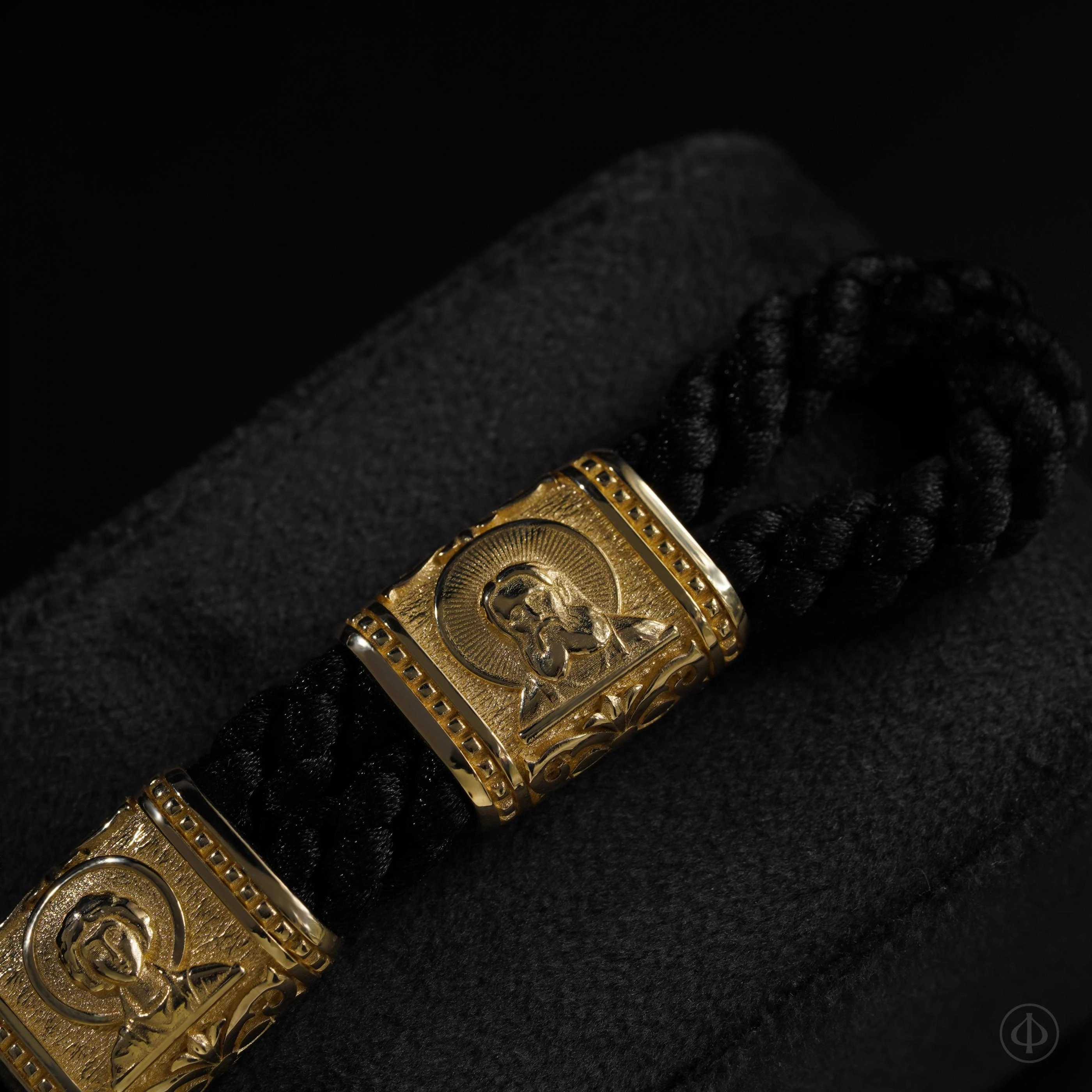 В основе браслета прочный плетёный шнур из лавсана, мягкий на ощупь и надёжный в ношении. Вставки выполнены из драгоценного металла и несут на себе иконные образы, знакомые каждому, кто хоть раз останавливался в храмовой тишине. Глубокий рельеф и выверенные пропорции придают образам спокойствие и собранность, близкие к канонической традиции.
