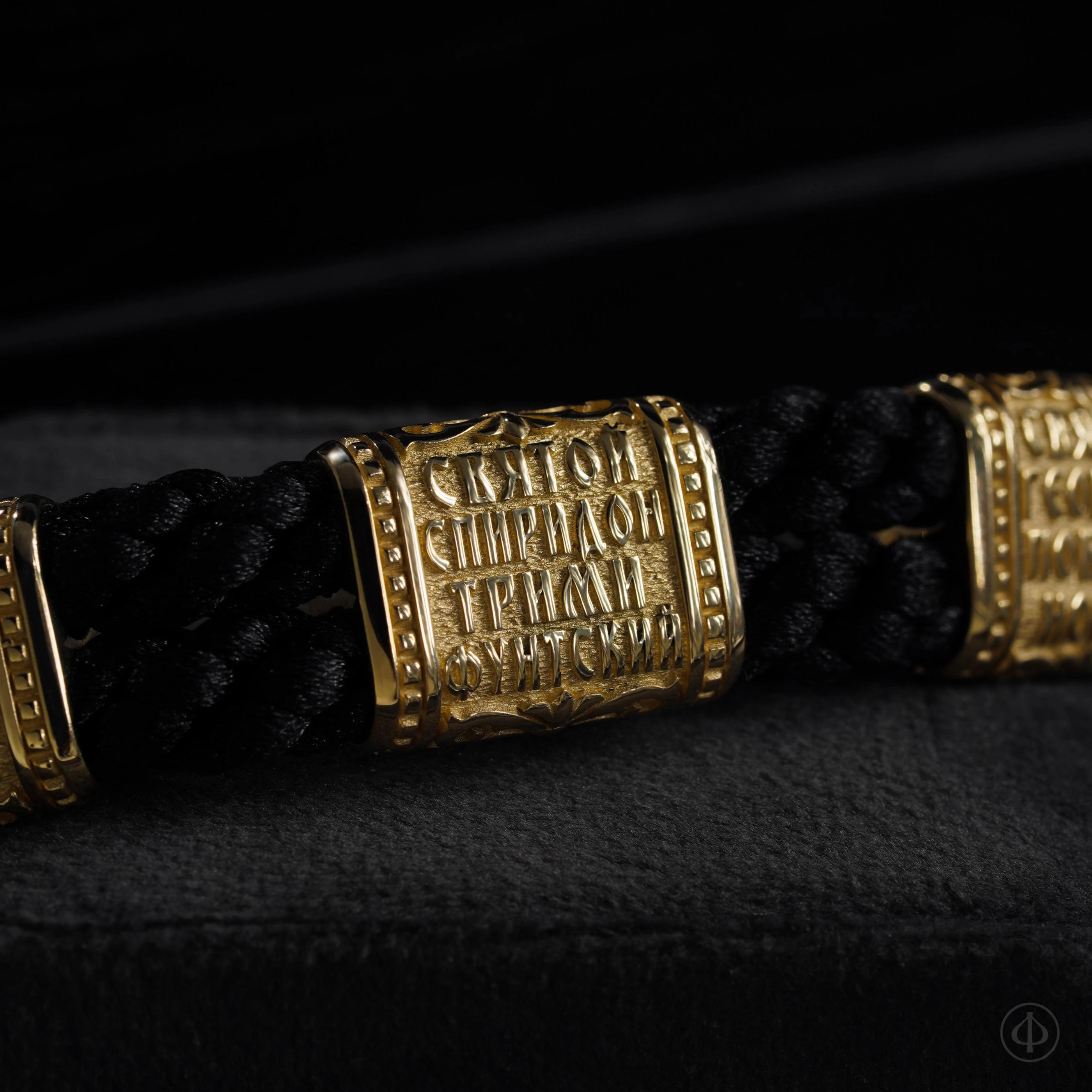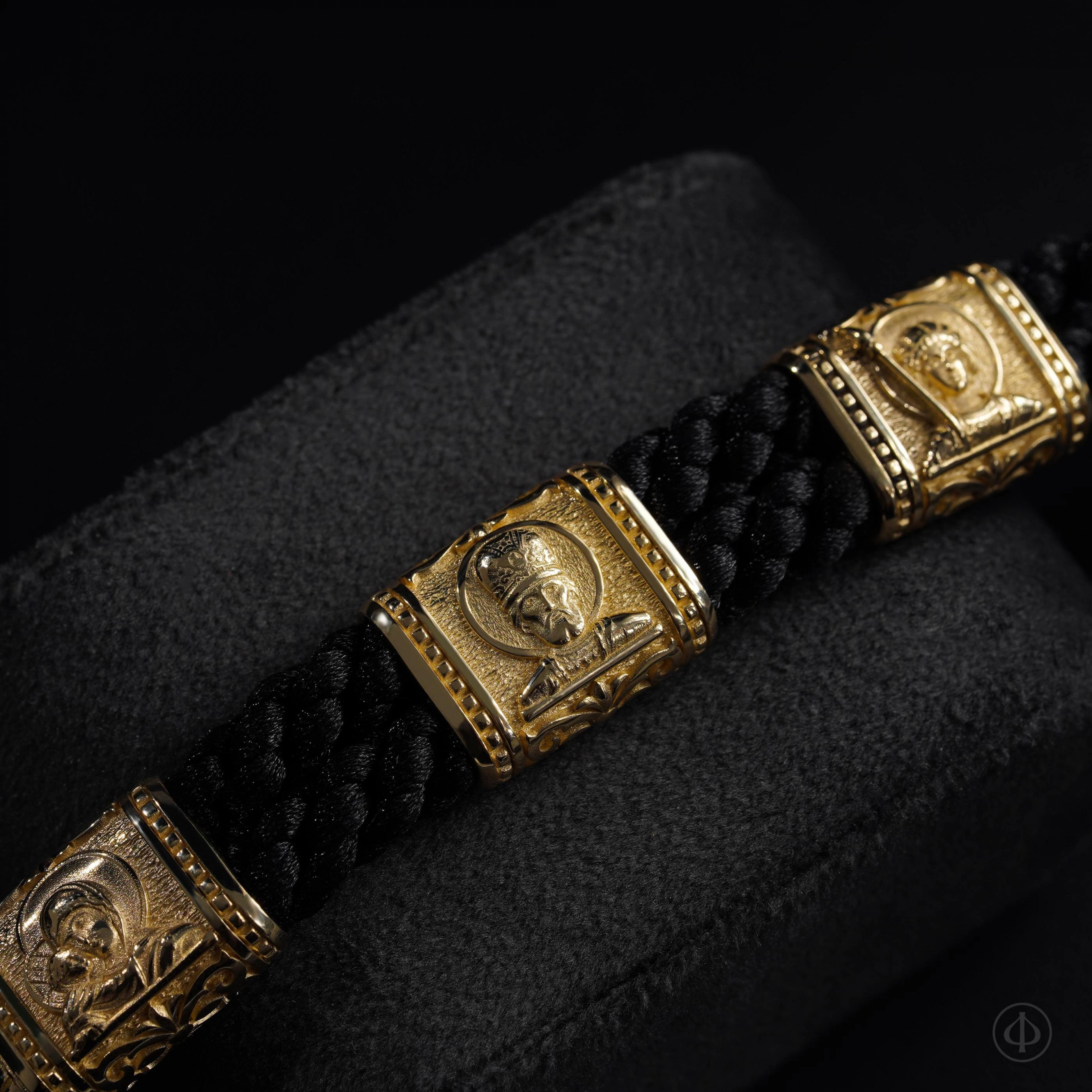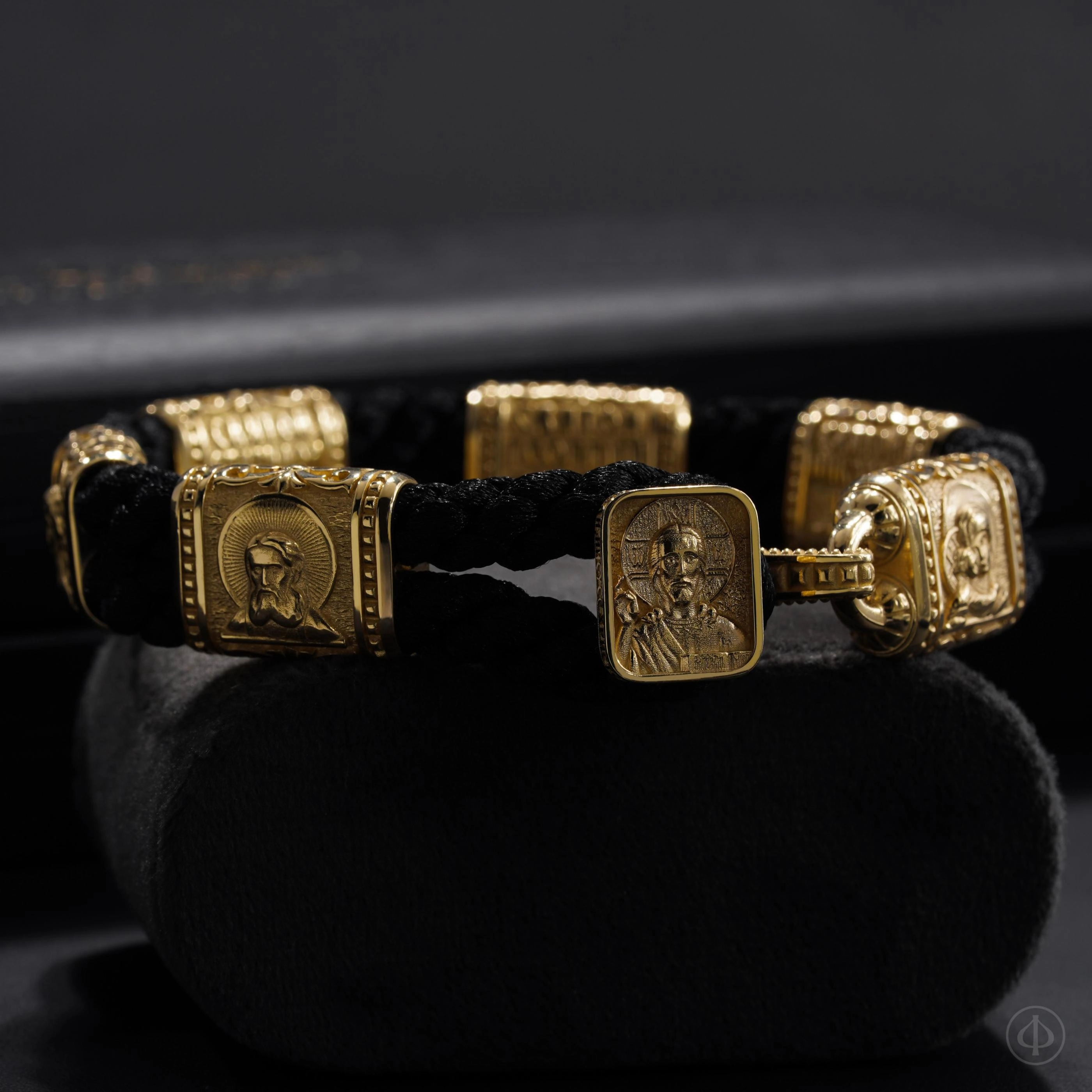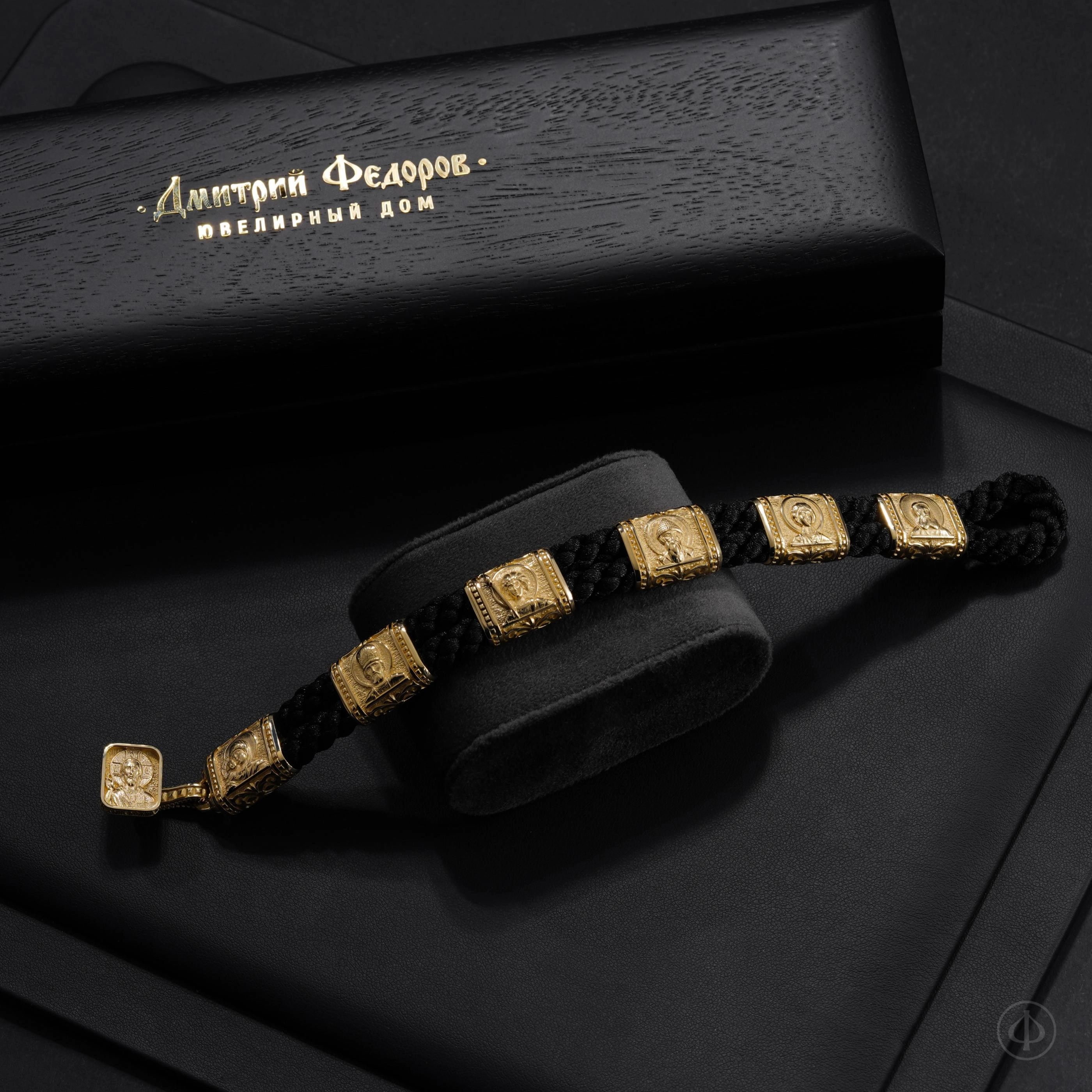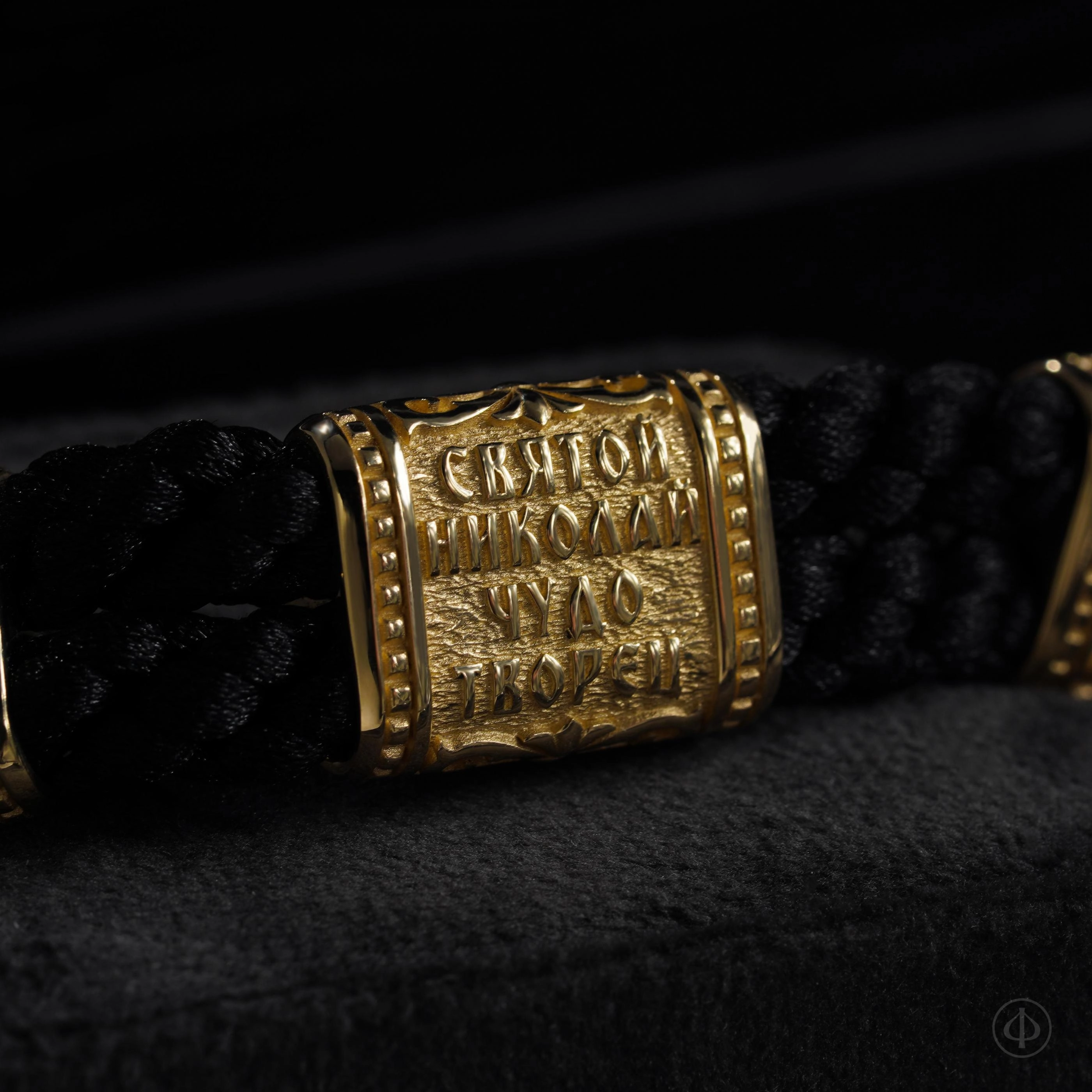 В основе браслета прочный плетёный шнур из лавсана, мягкий на ощупь и надёжный в ношении. Вставки выполнены из драгоценного металла и несут на себе иконные образы, знакомые каждому, кто хоть раз останавливался в храмовой тишине. Глубокий рельеф и выверенные пропорции придают образам спокойствие и собранность, близкие к канонической традиции.