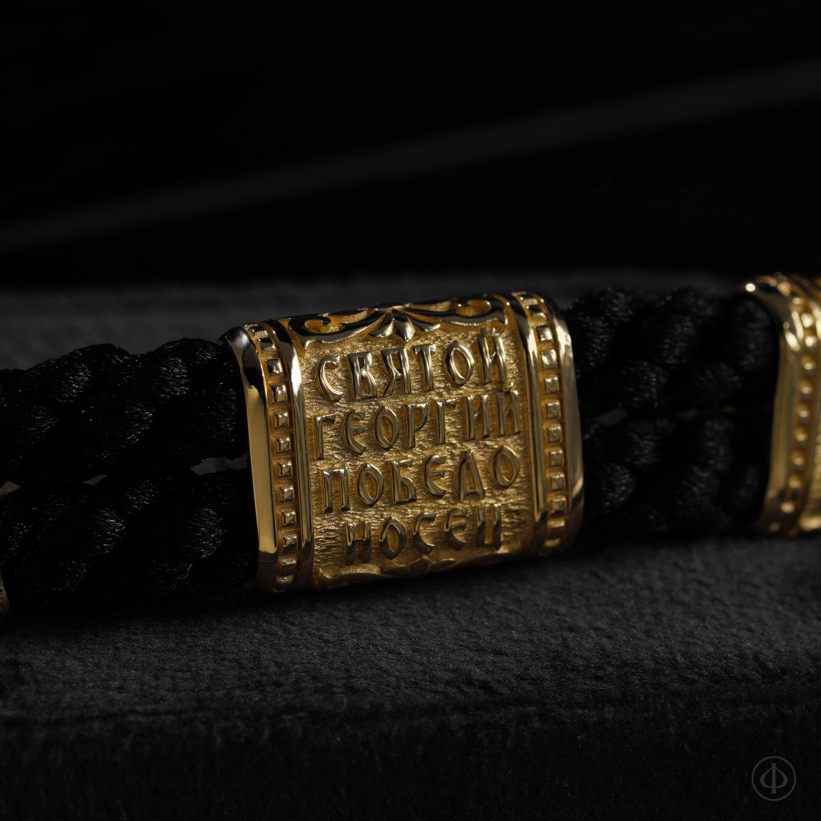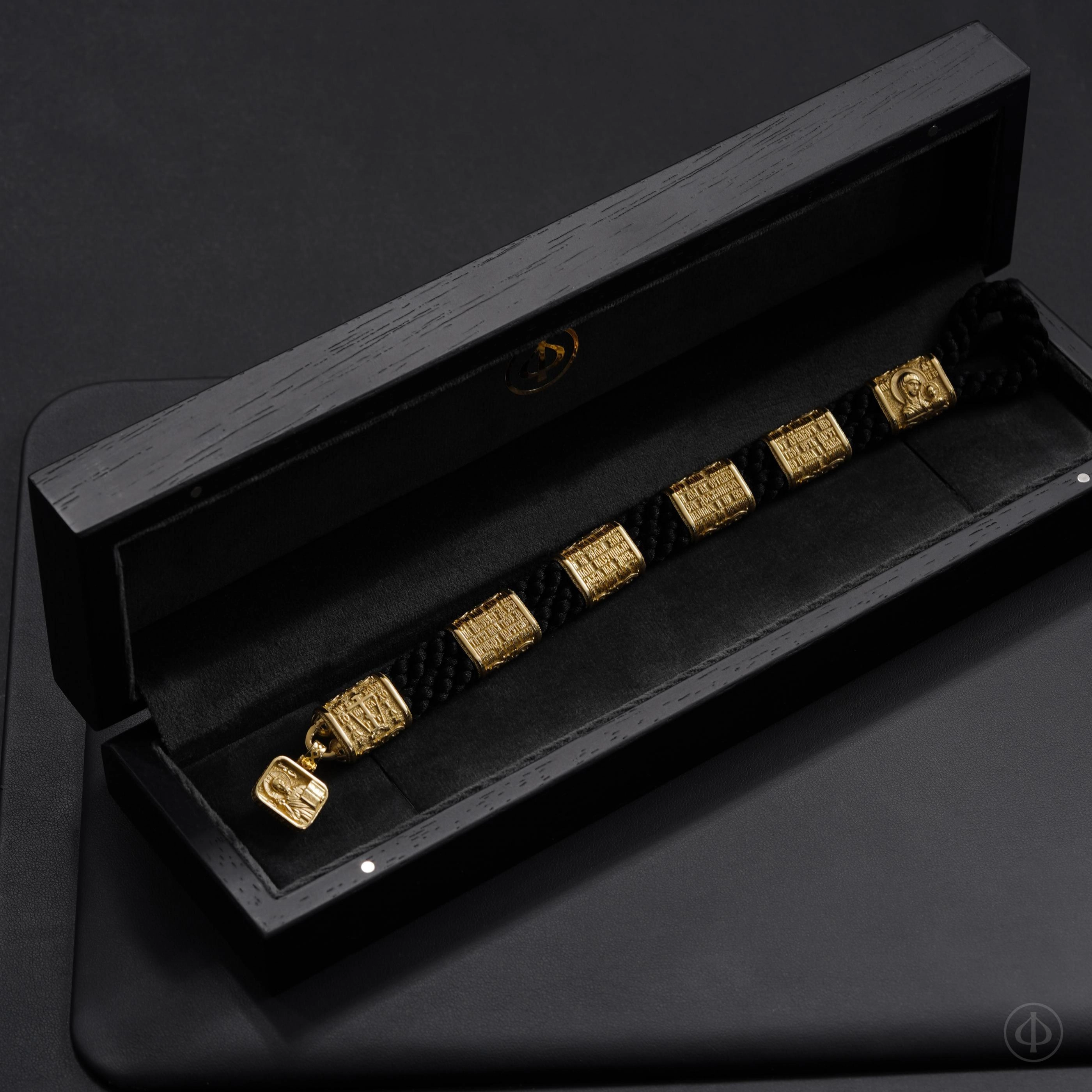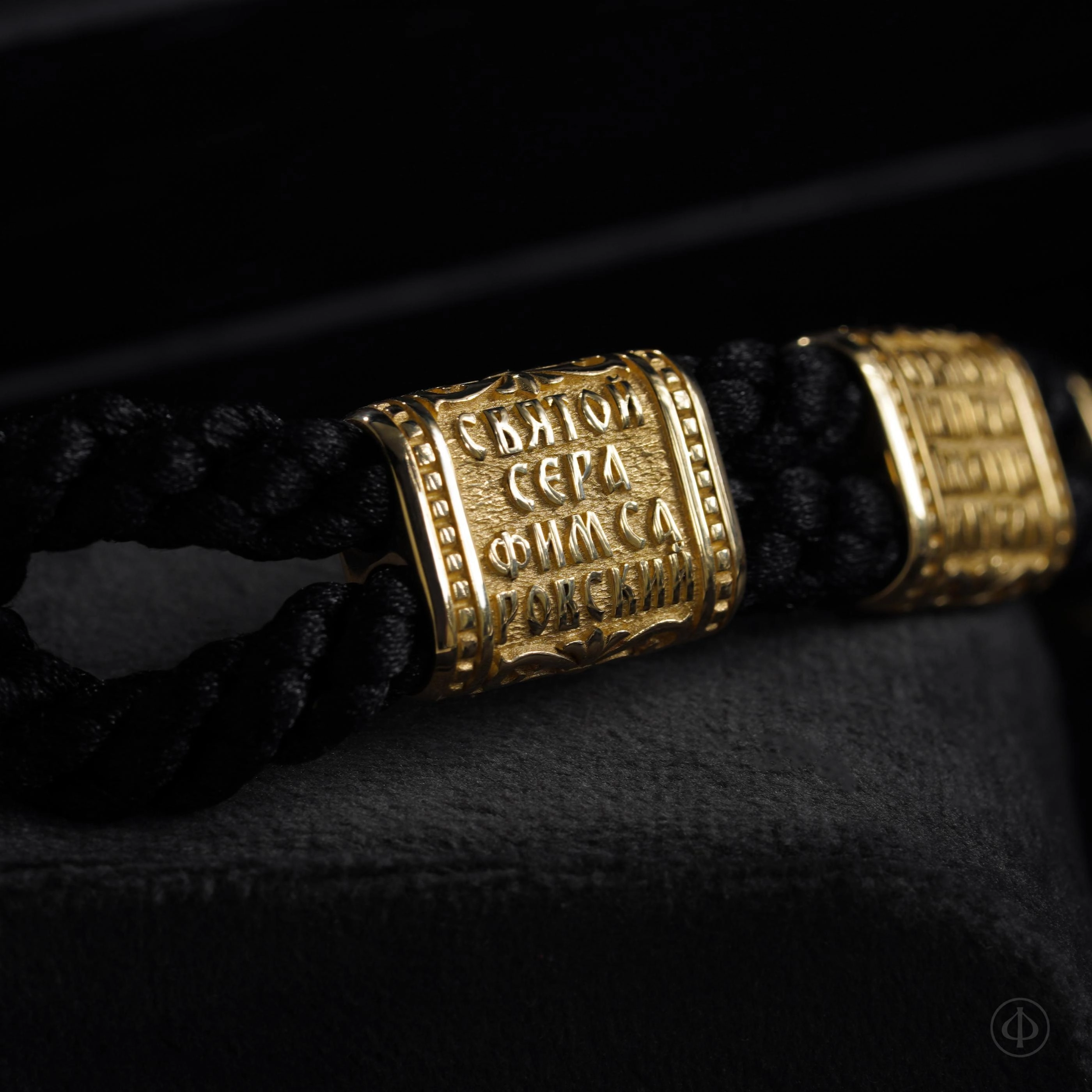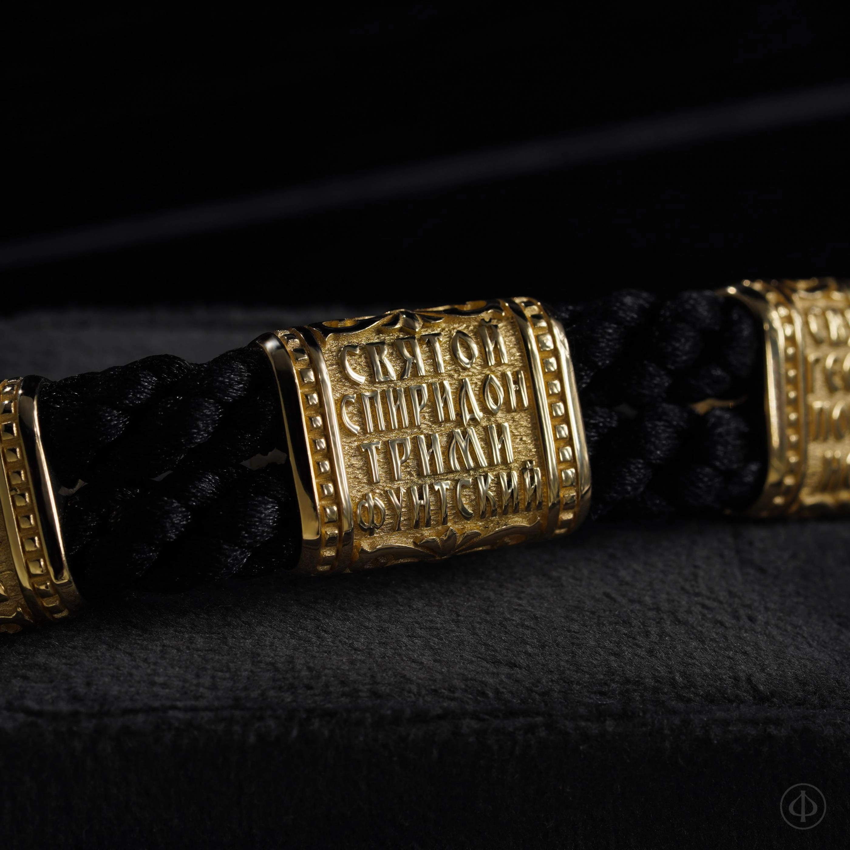 В основе браслета прочный плетёный шнур из лавсана, мягкий на ощупь и надёжный в ношении. Вставки выполнены из драгоценного металла и несут на себе иконные образы, знакомые каждому, кто хоть раз останавливался в храмовой тишине. Глубокий рельеф и выверенные пропорции придают образам спокойствие и собранность, близкие к канонической традиции.