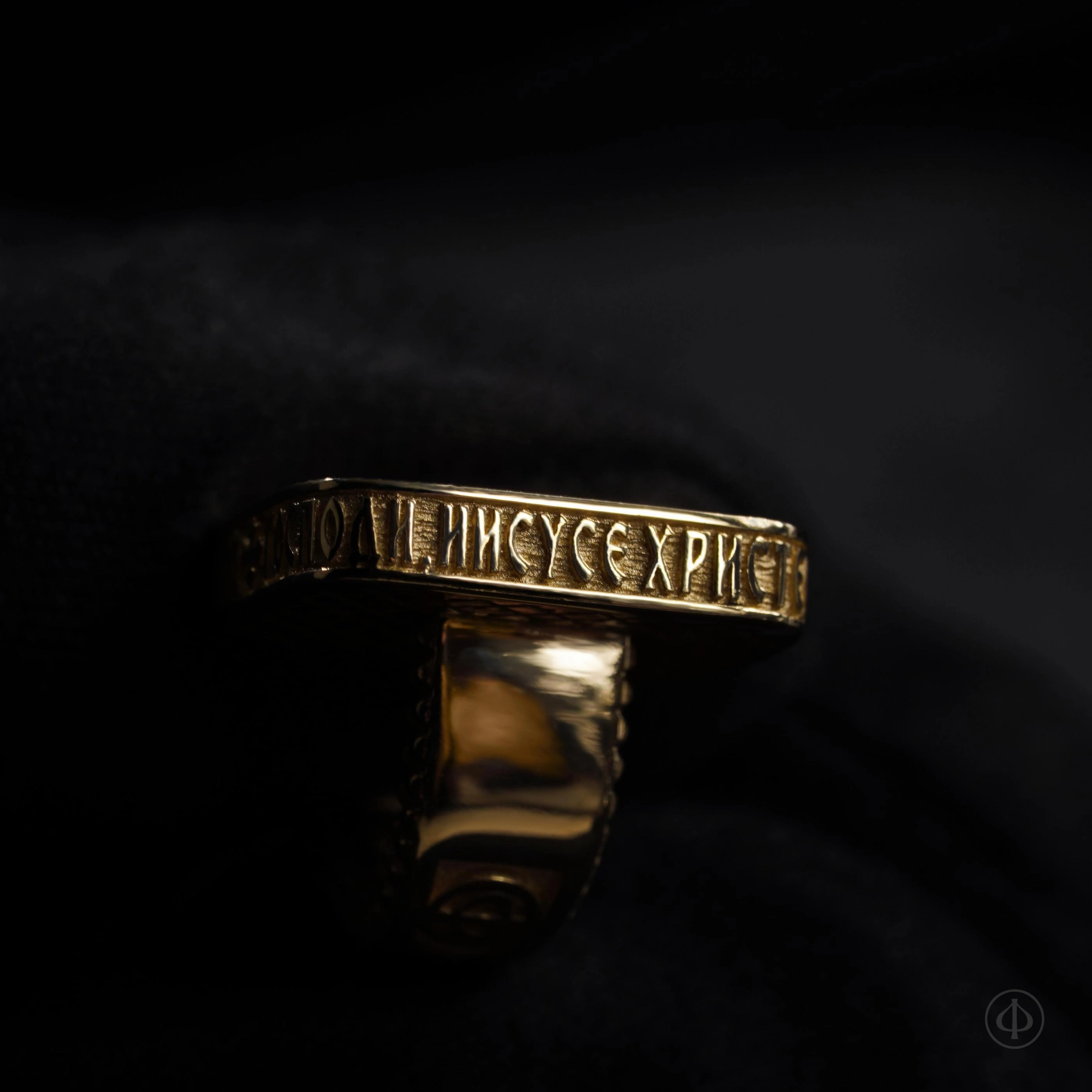 На оборотной стороне вставок расположены подписи к иконам. Замок украшен образом Господа Вседержителя, а по его торцу проходит Иисусова молитва — краткая, но глубокая, как дыхание. Она превращает функциональную деталь браслета в его духовное сердце.