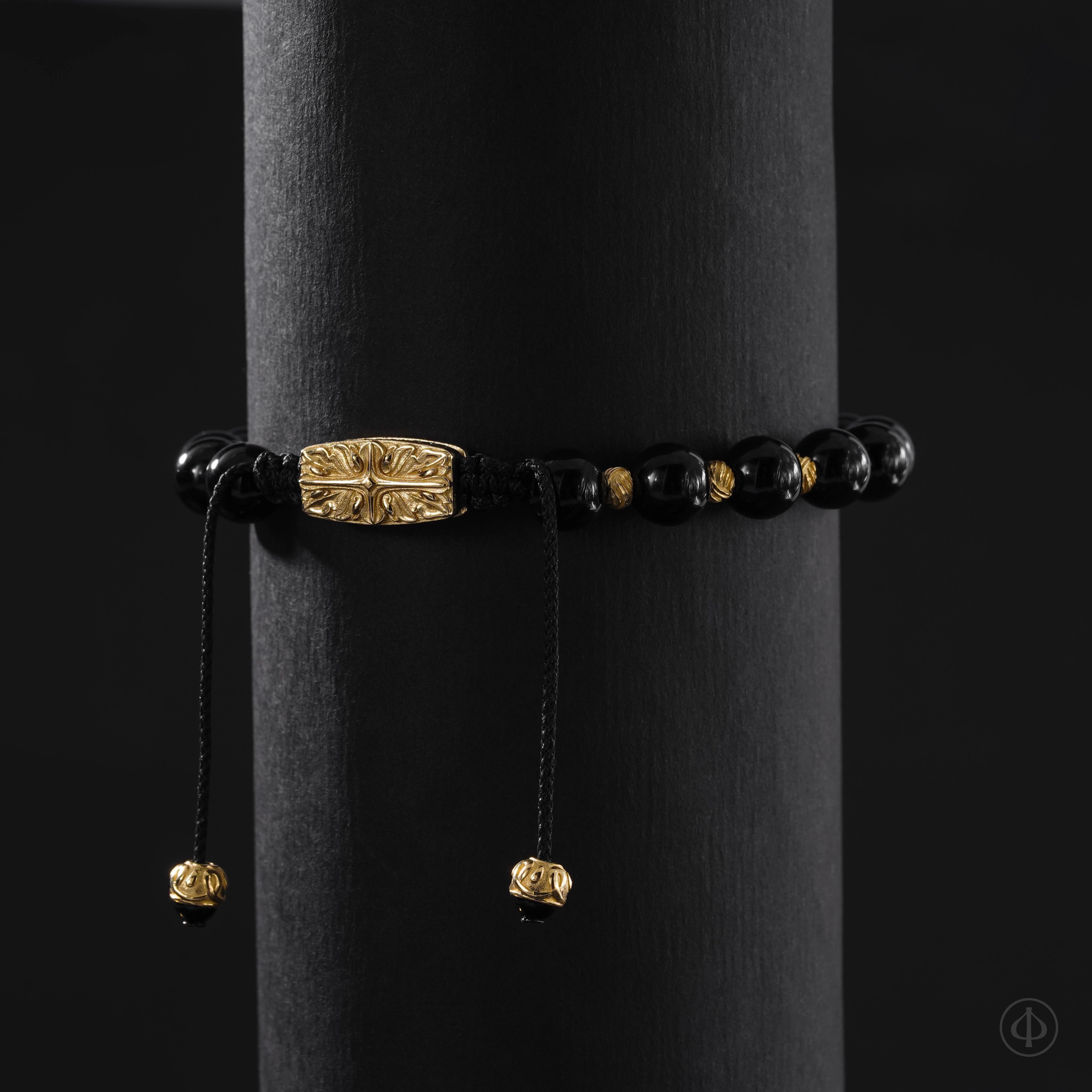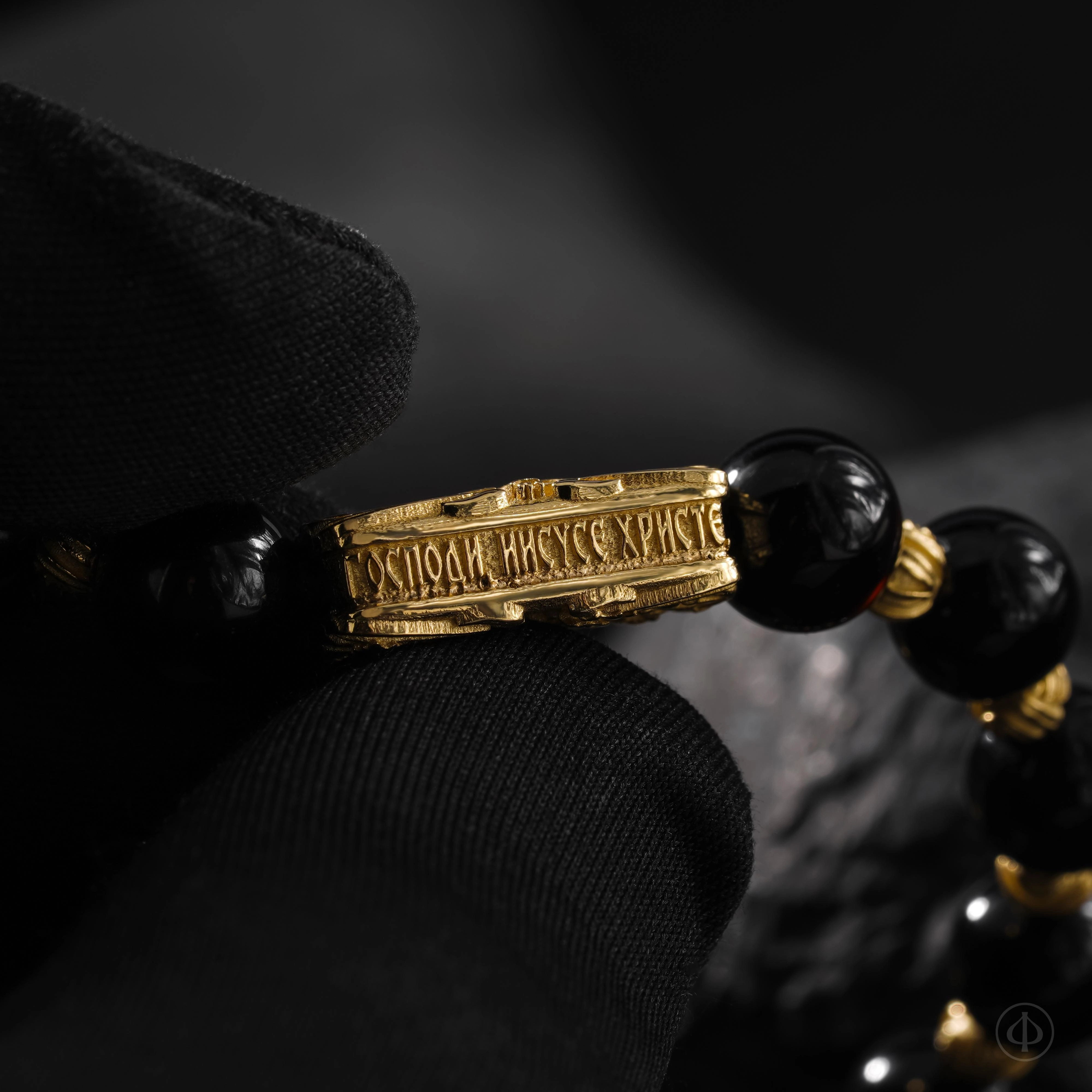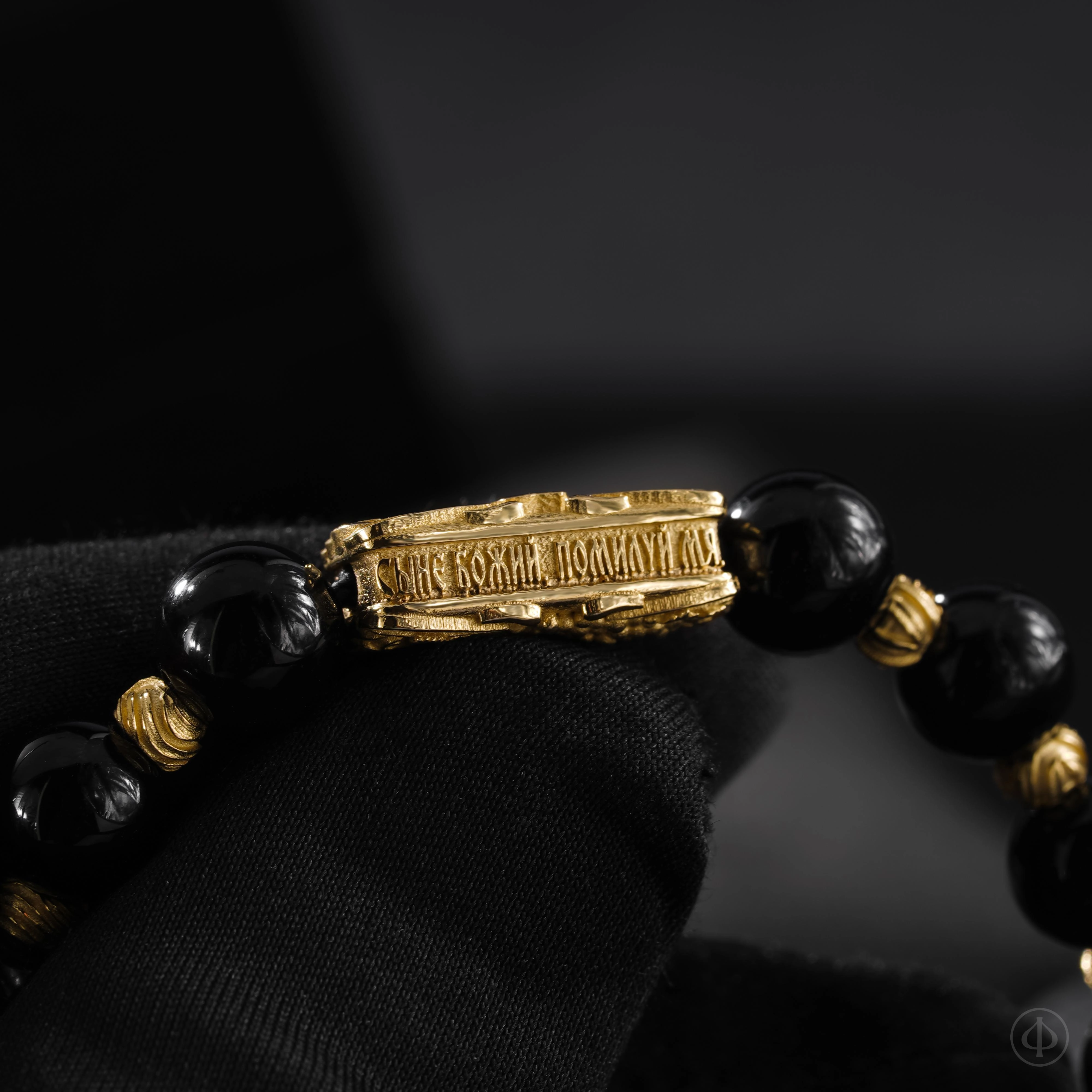 Браслет из бусин черного агата с вставками из желтого золота 585 пробы. На вставках изображены знаковые в православии символы: