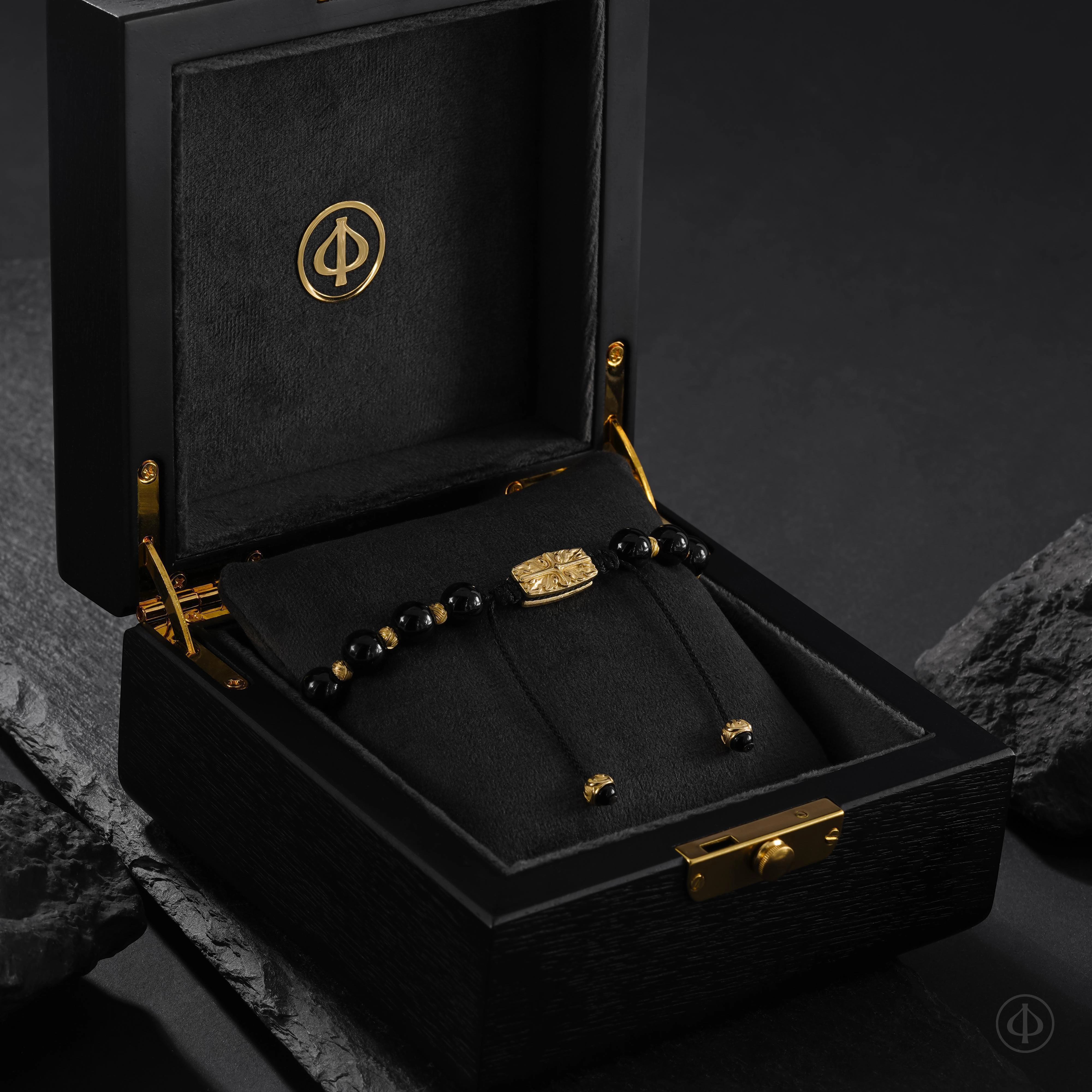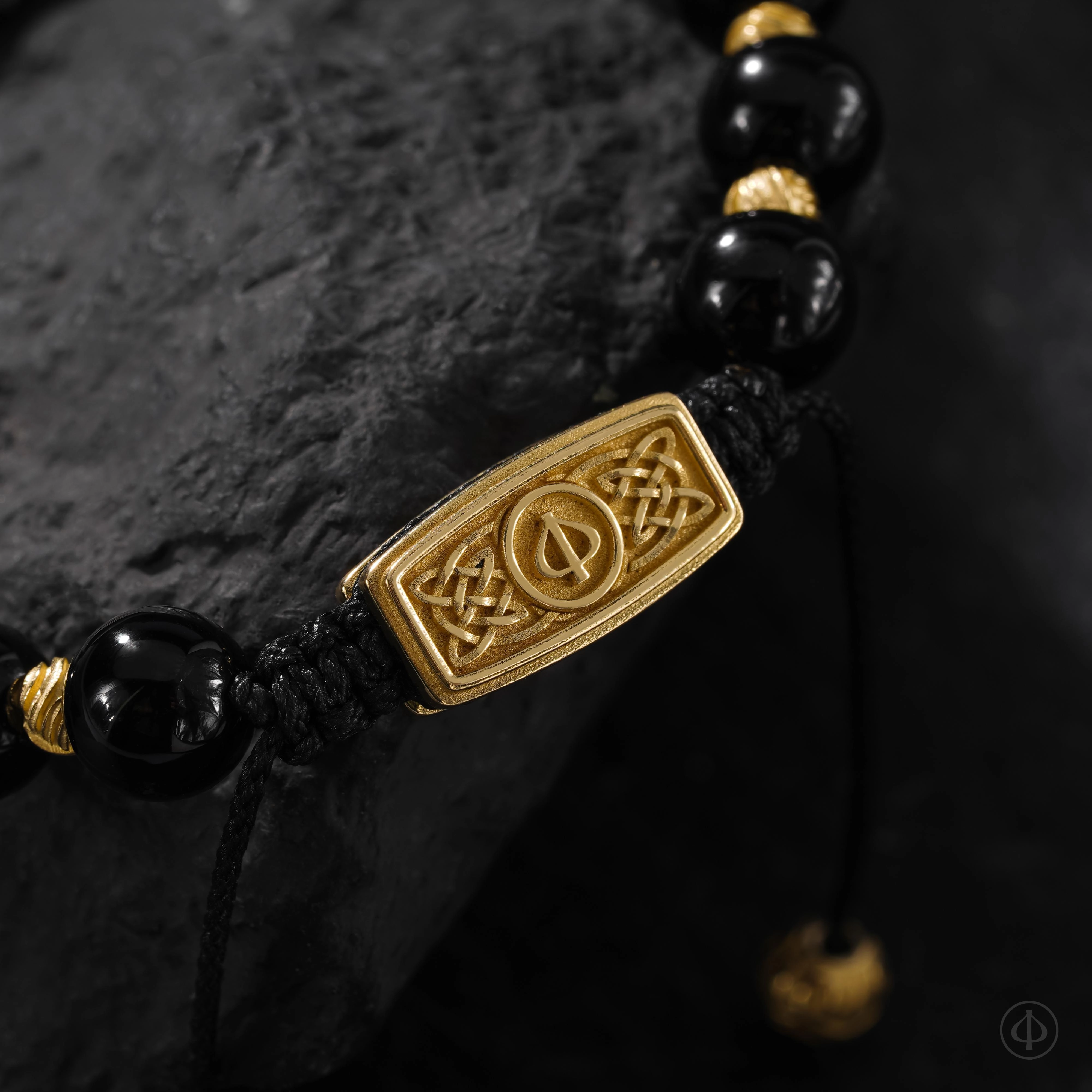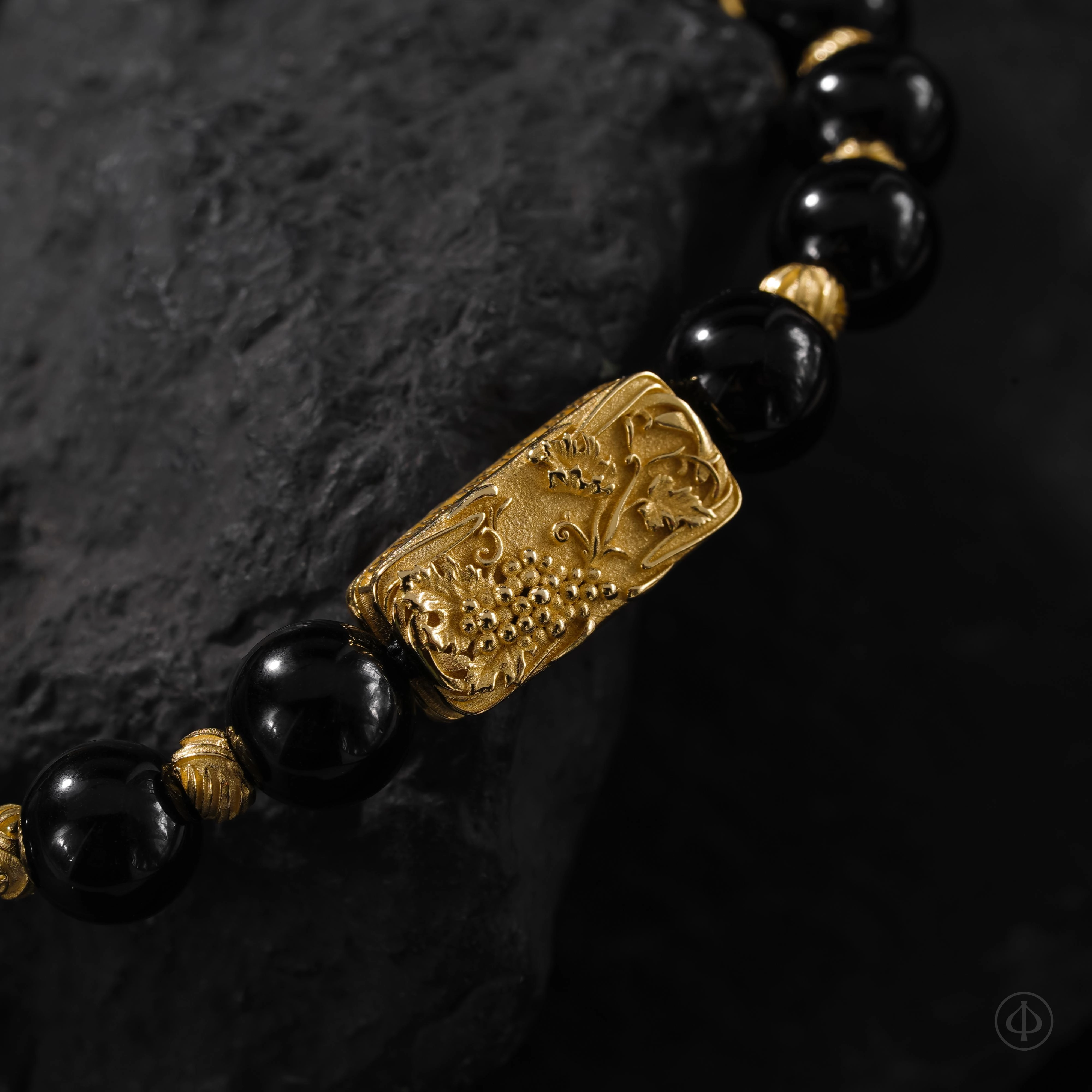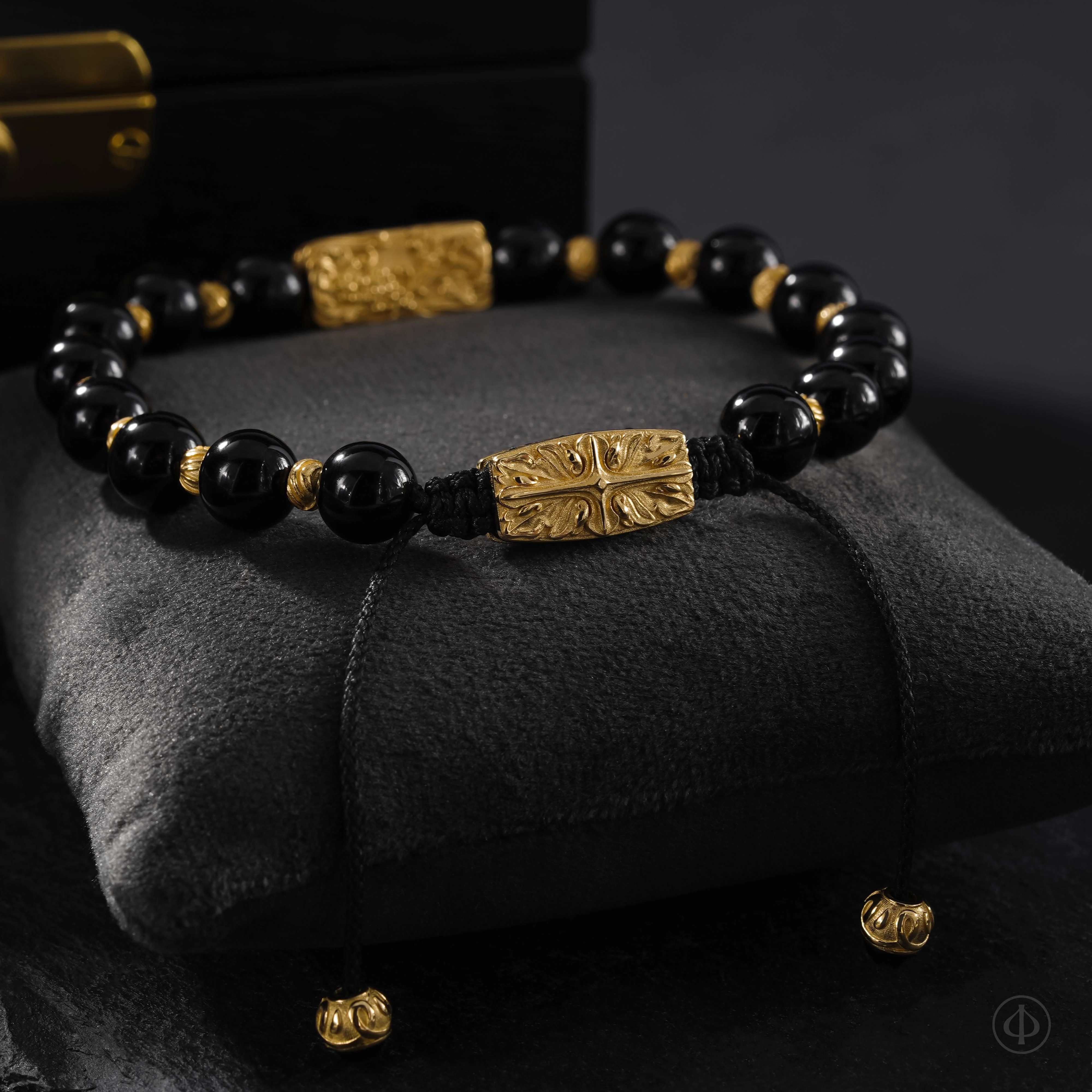 Браслет из бусин черного агата с вставками из желтого золота 585 пробы. На вставках изображены знаковые в православии символы: