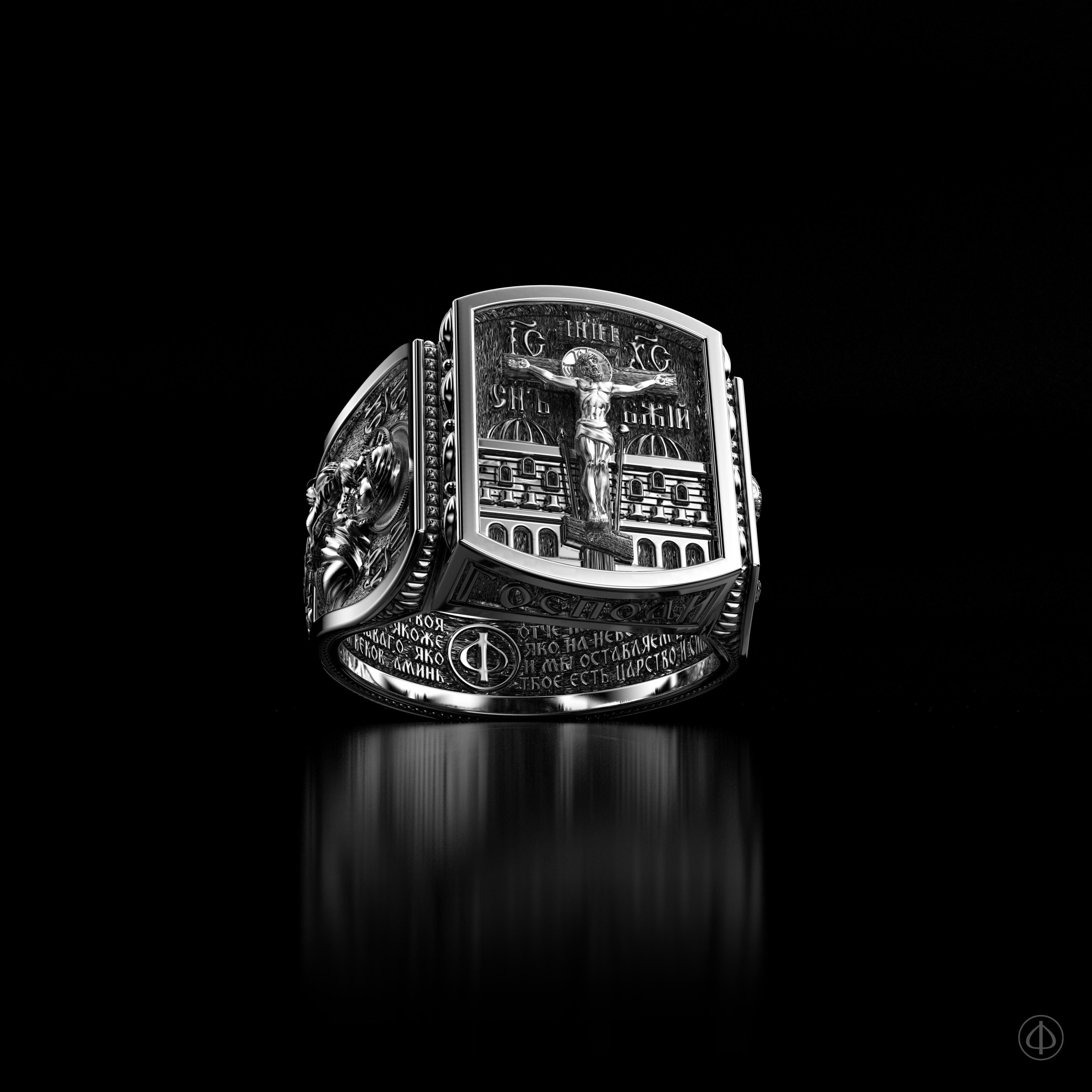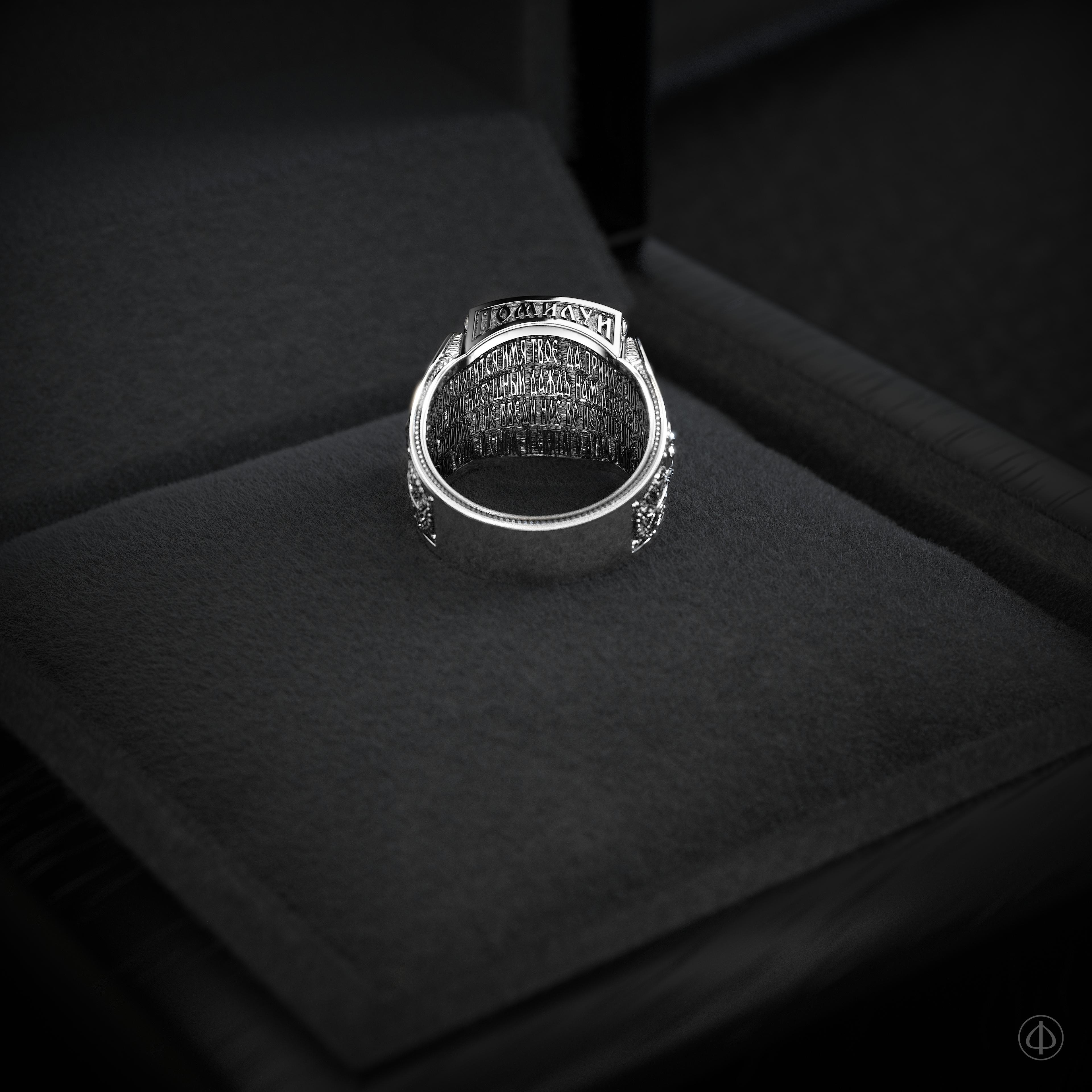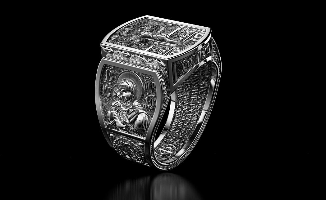 • слева расположена Владимирская икона Божией Матери и Хризма – монограмма имени Христа с греческими буквы α и ω "Аз есмь Альфа и Омега".