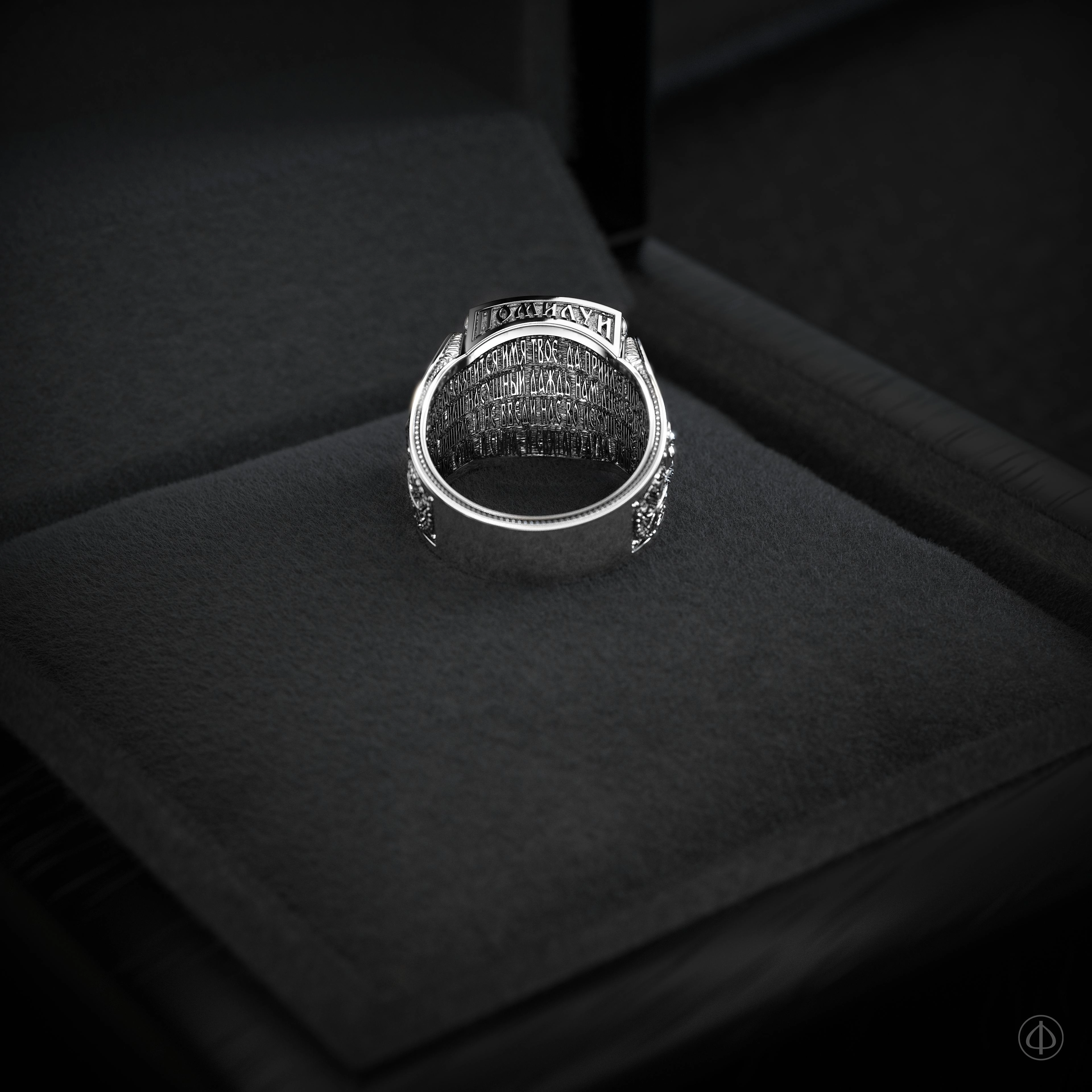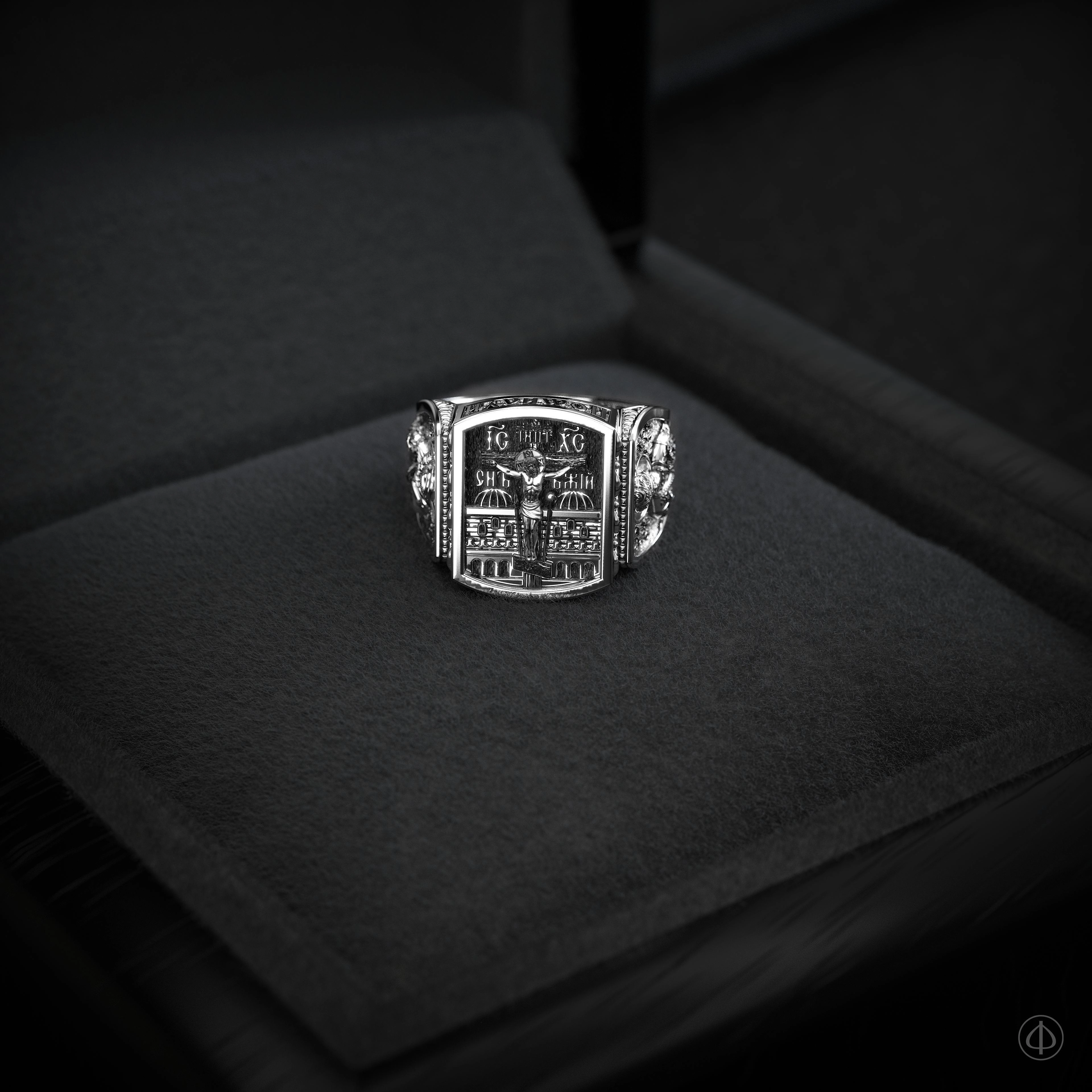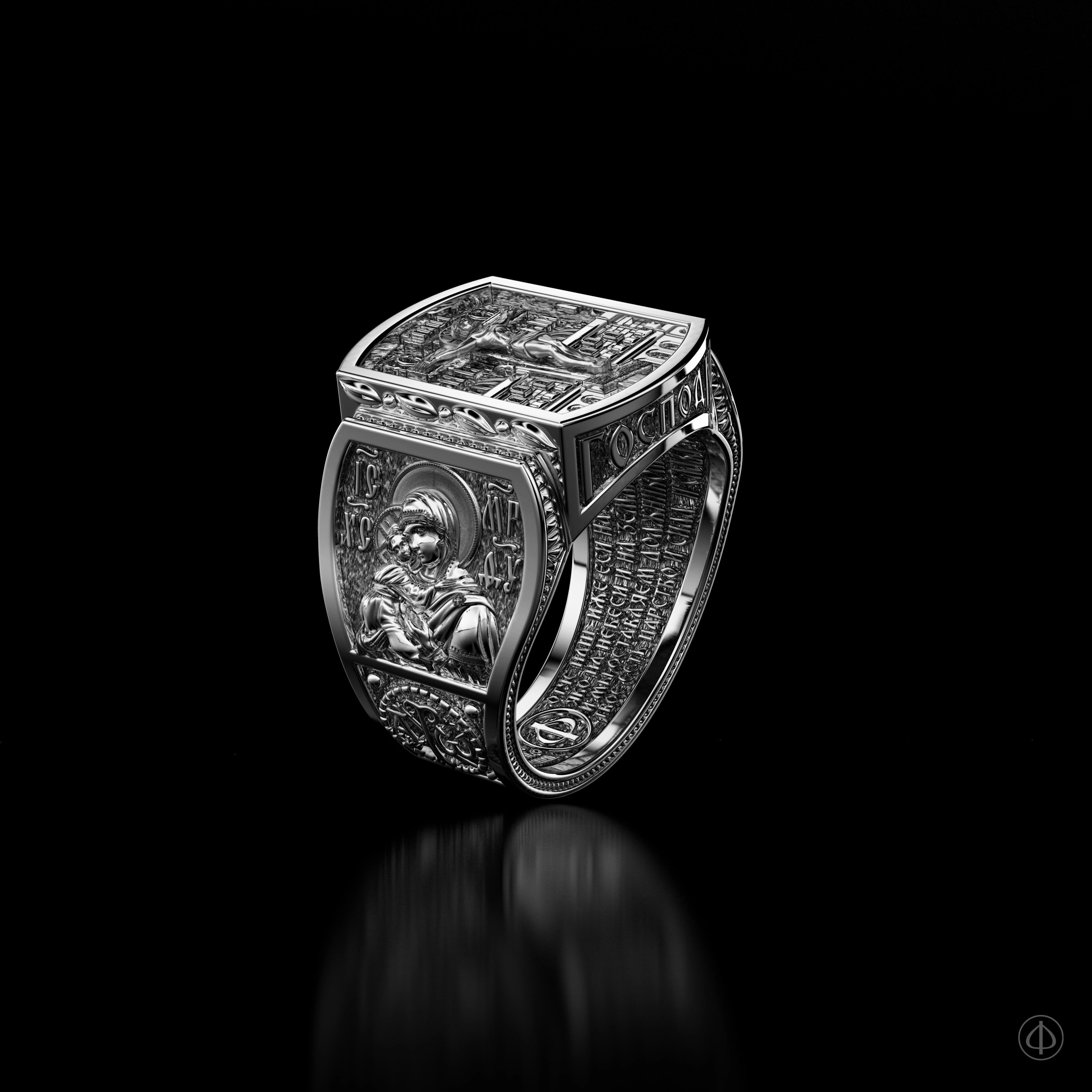 - слева расположена Владимирская икона Божией Матери и Хризма – монограмма имени Христа с греческими буквы α и ω "Аз есмь Альфа и Омега".