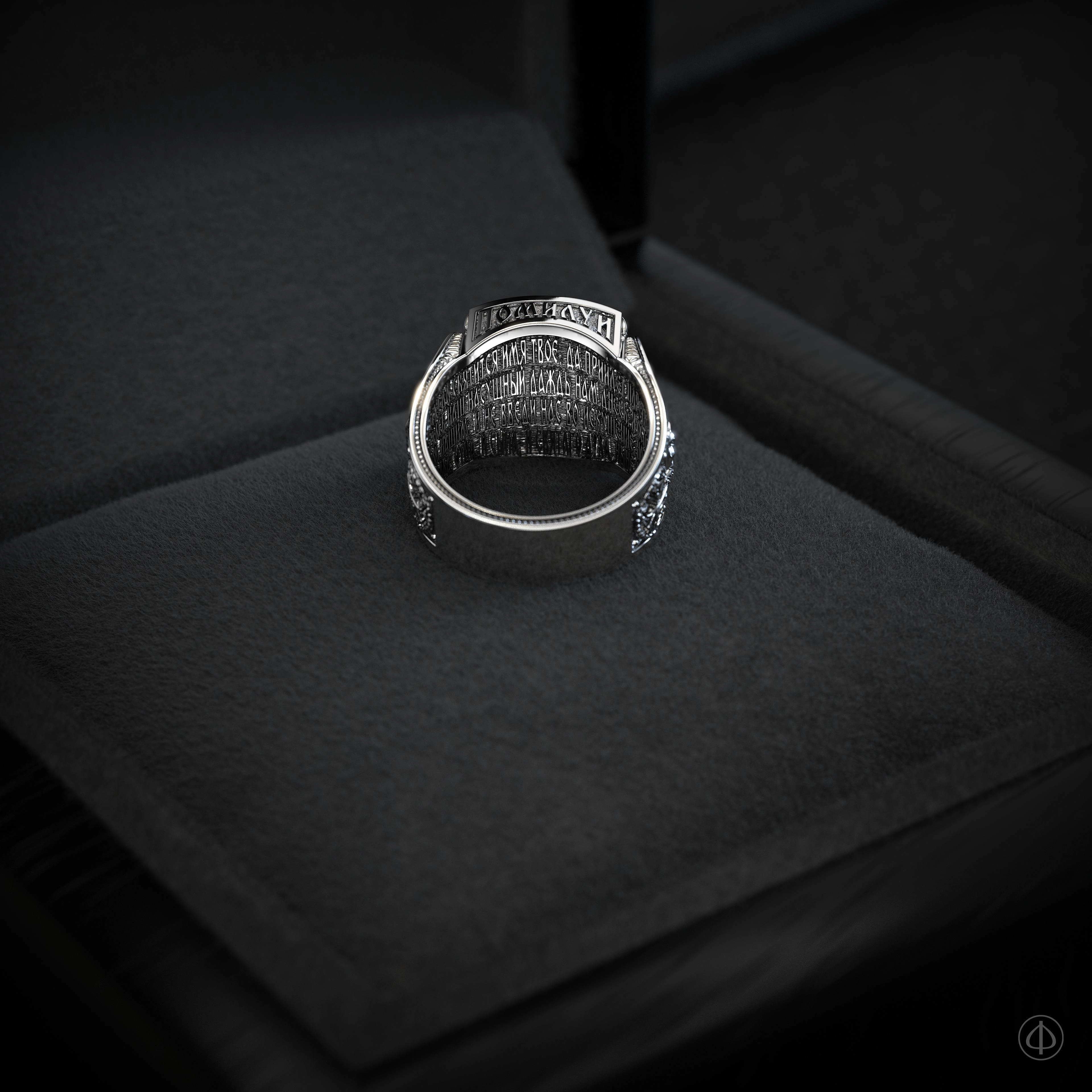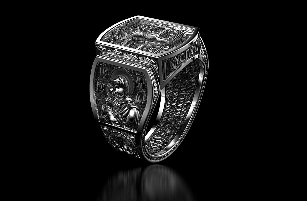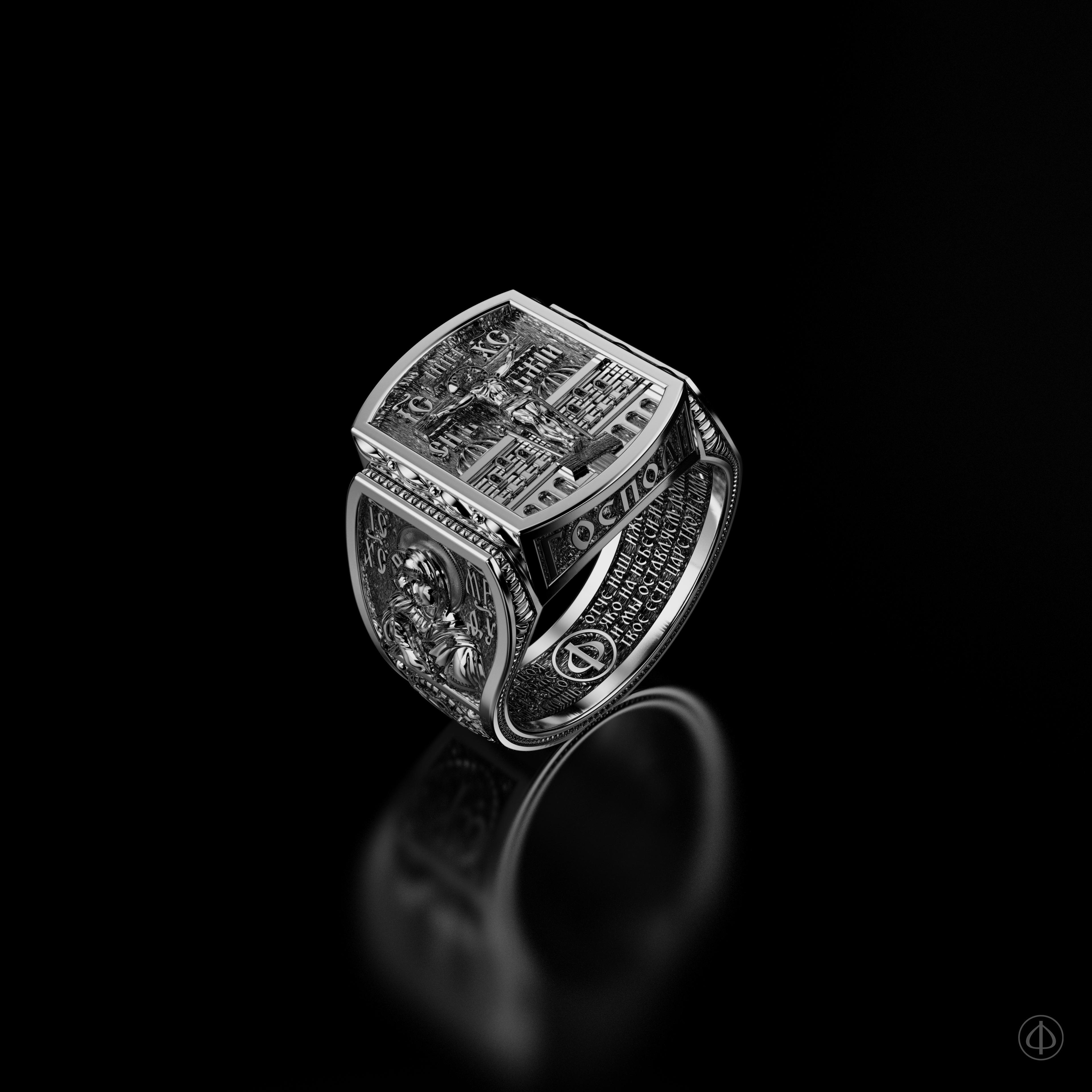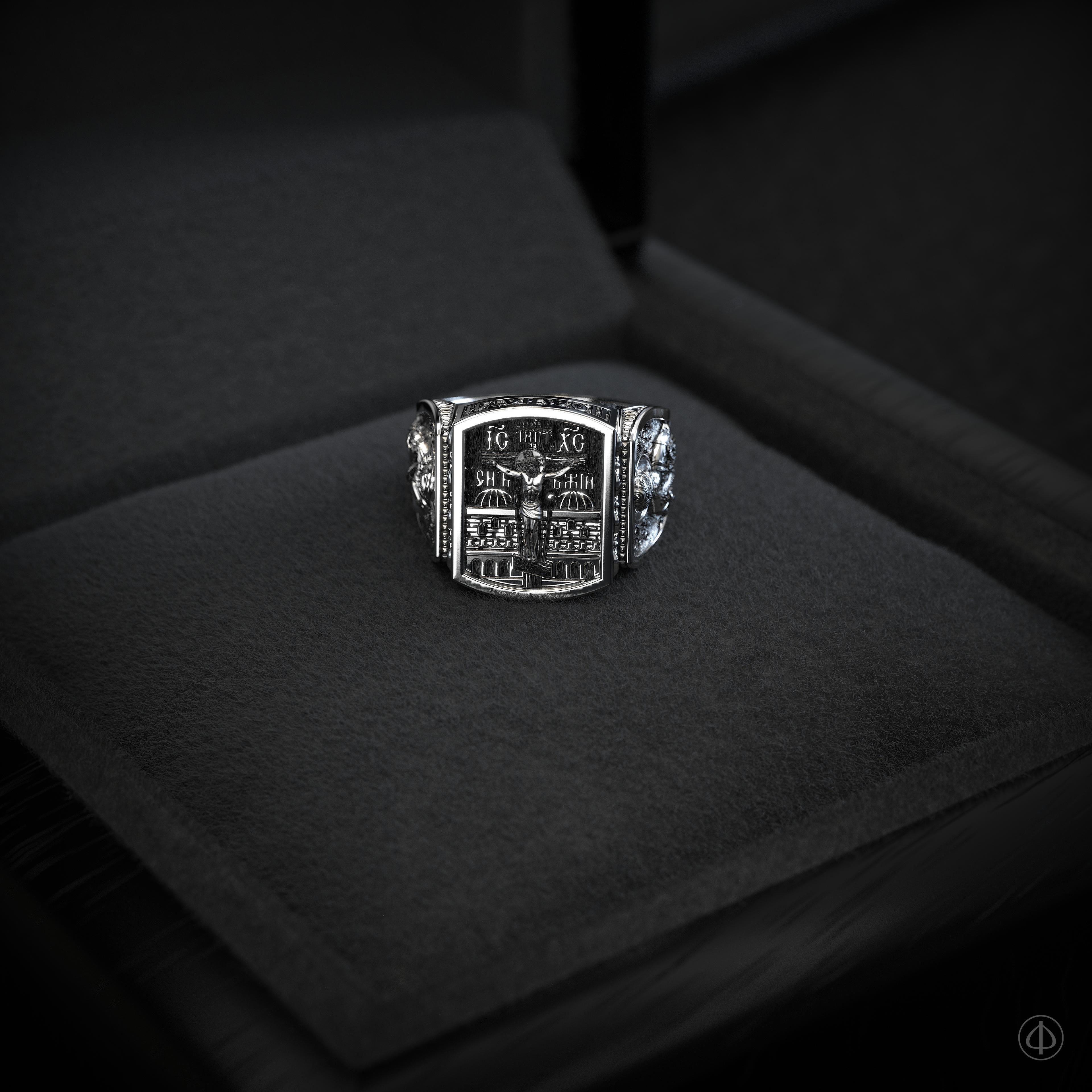 - слева расположена Владимирская икона Божией Матери и Хризма – монограмма имени Христа с греческими буквы α и ω "Аз есмь Альфа и Омега".