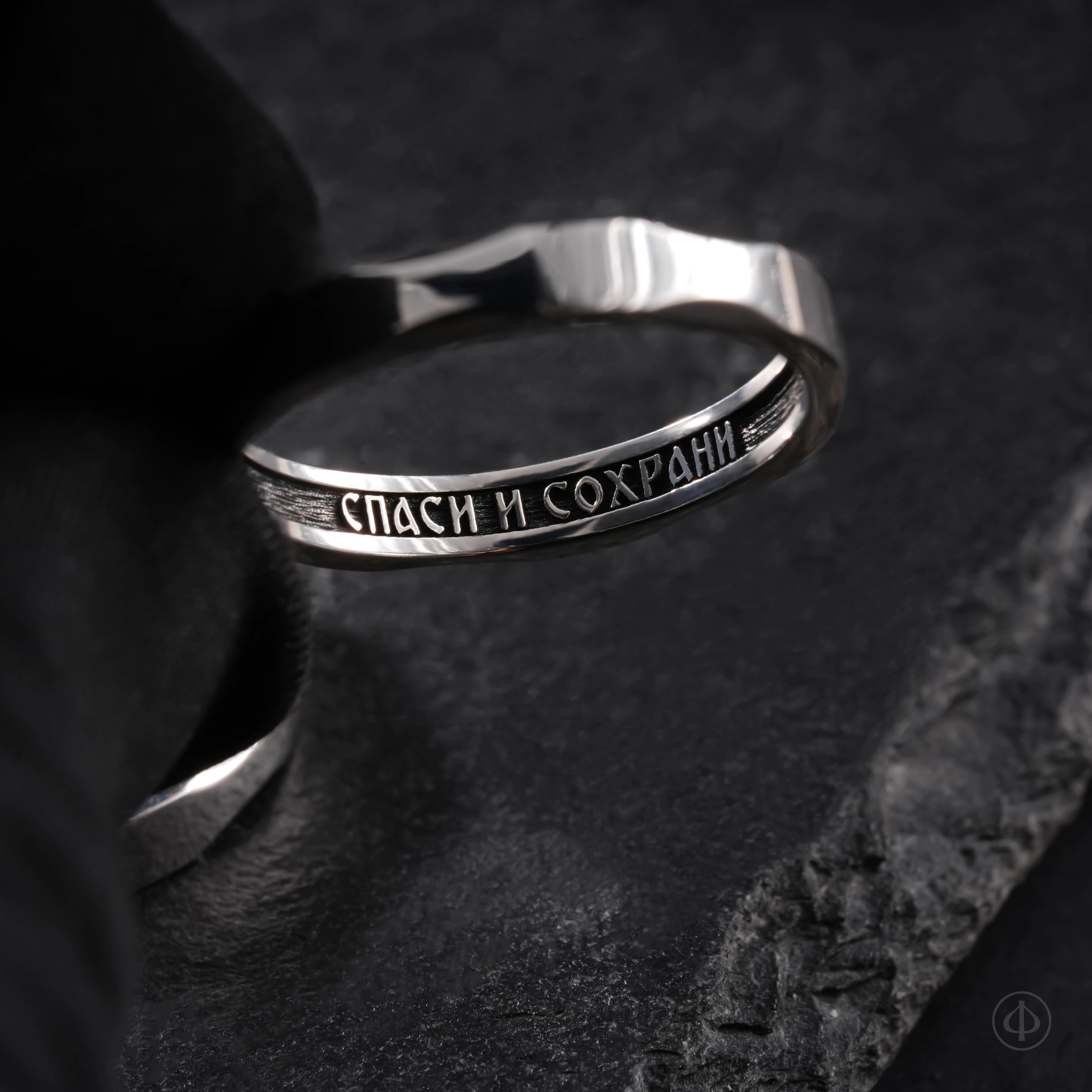 Кольцо изготовлено в минималистичном дизайне. Главный акцент православного изделия – лаконичная волнообразная форма и молитва «Спаси и сохрани» на внутренней стороне украшения.