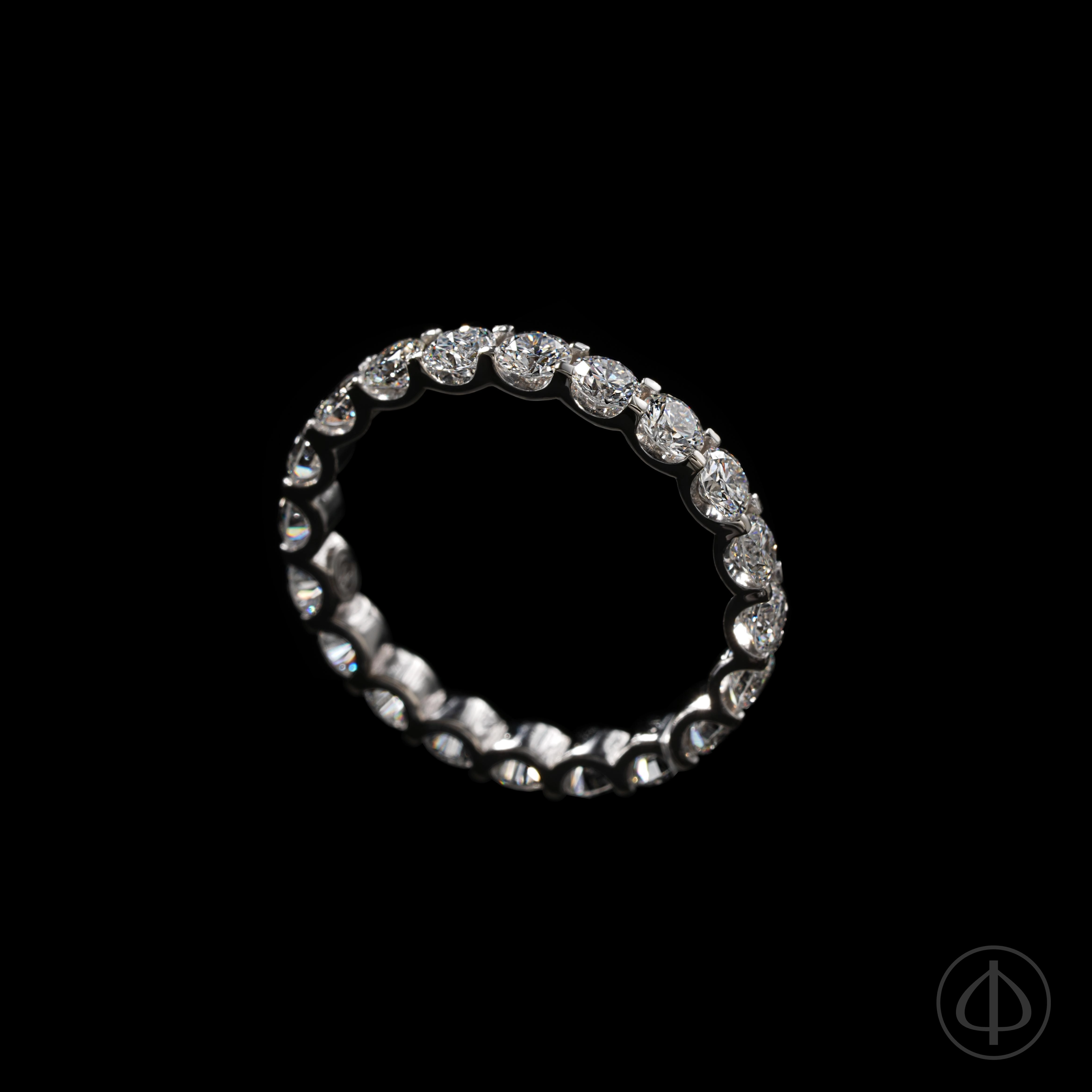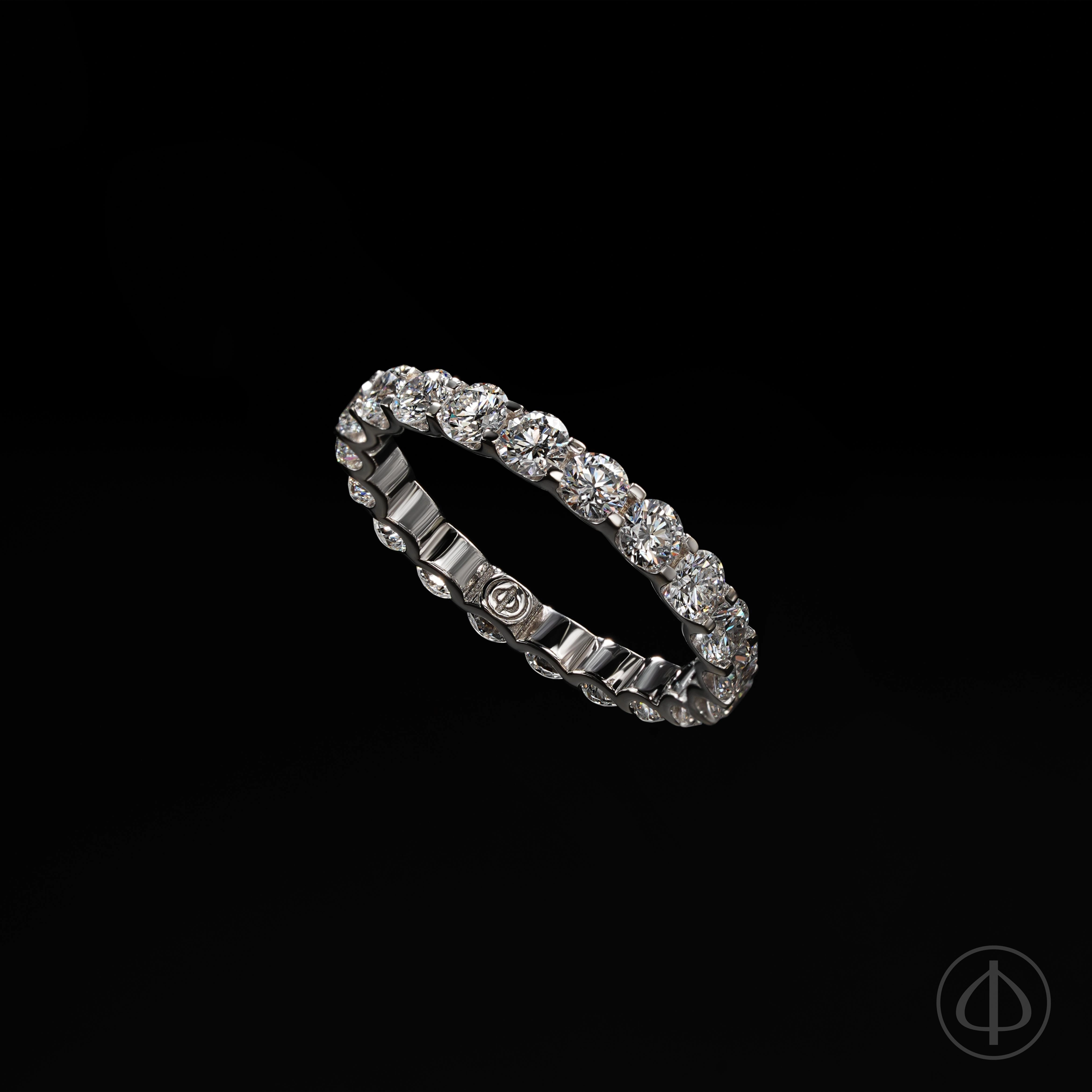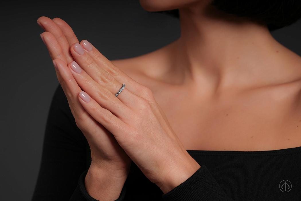 Кольцо из золота 585 пробы с вставкой из 20 бриллиантов. По диаметру кольца инкрустированы 20 прозрачных бриллиантов диаметром 3 мм. Основой кольца служит белое золото 585 пробы без покрытия.