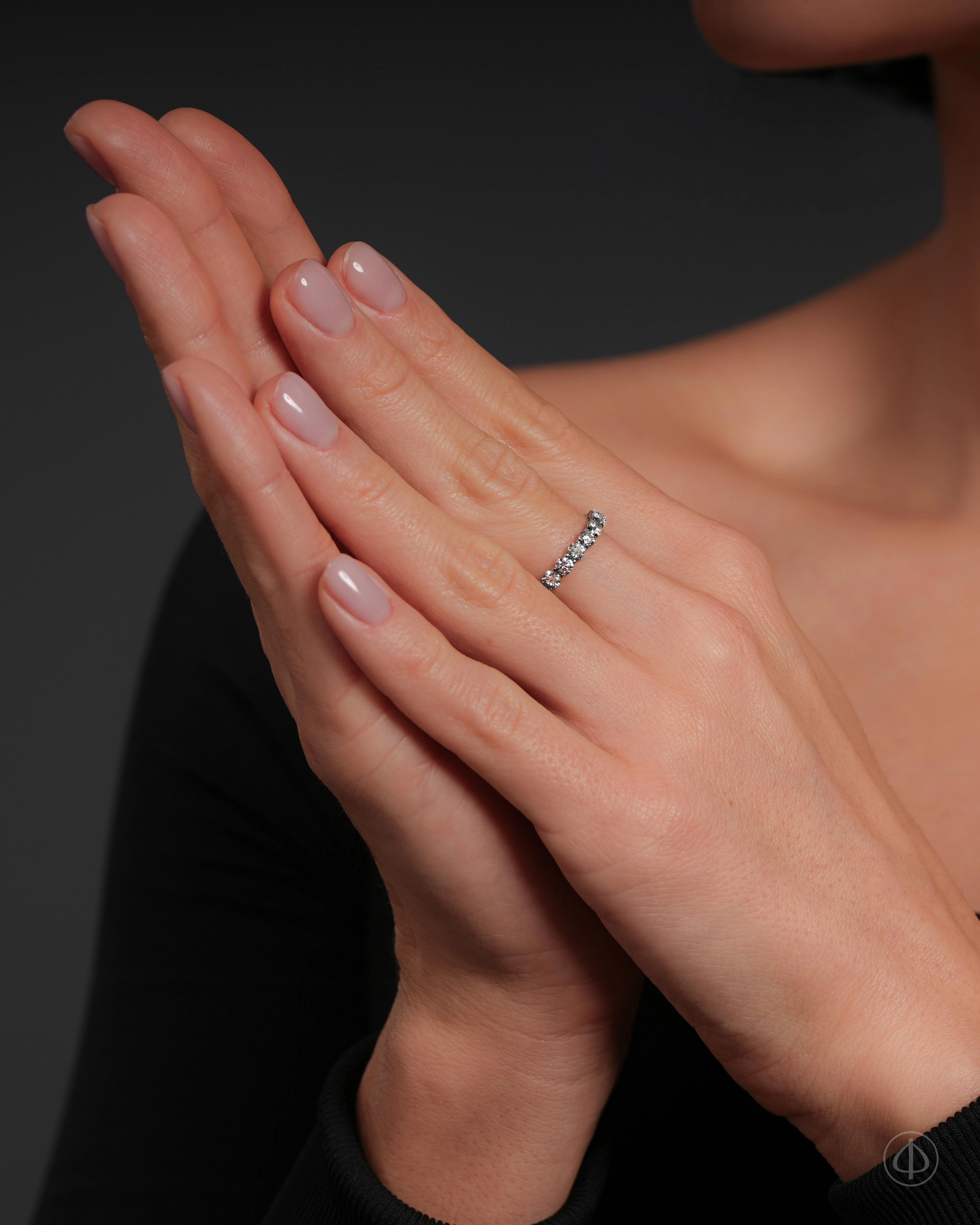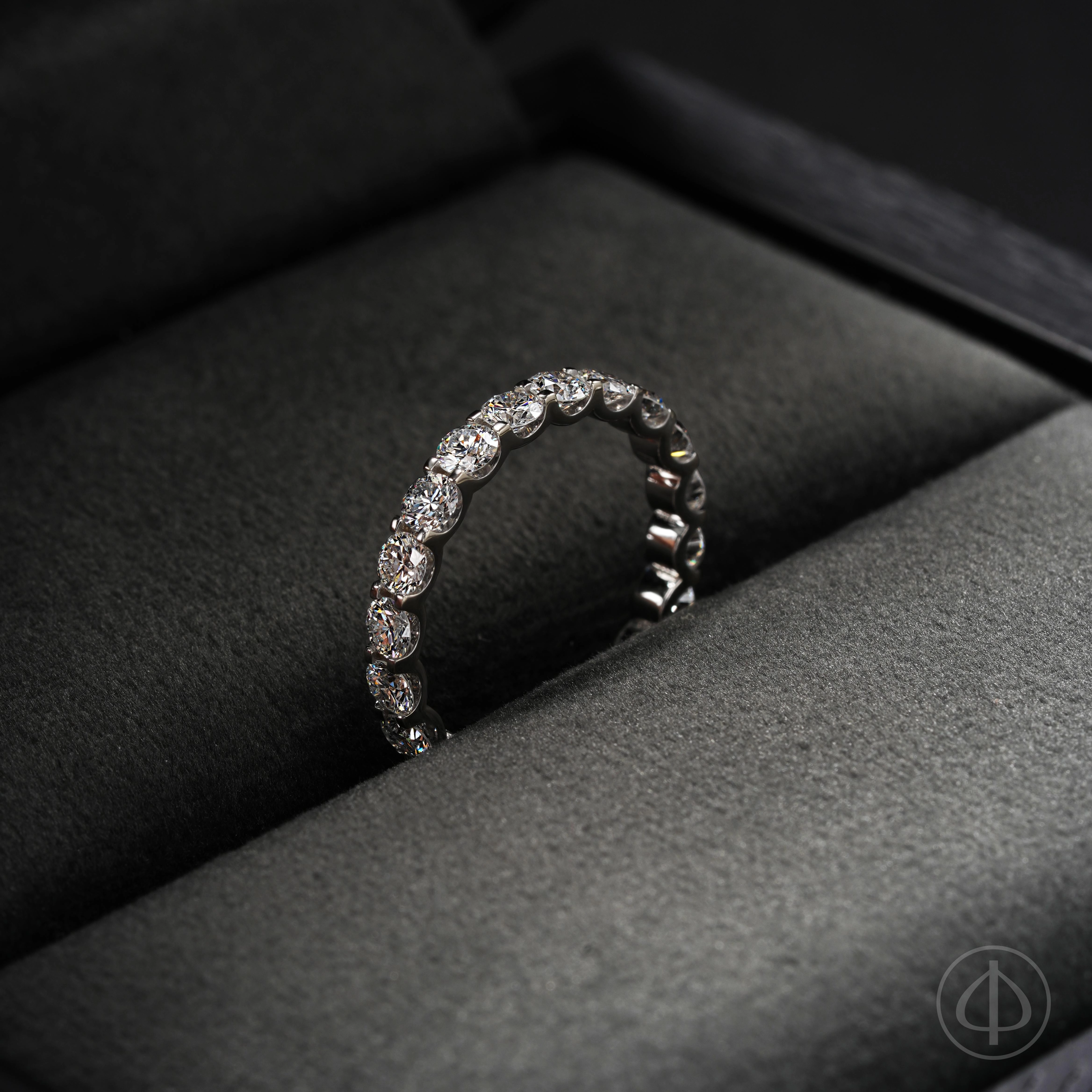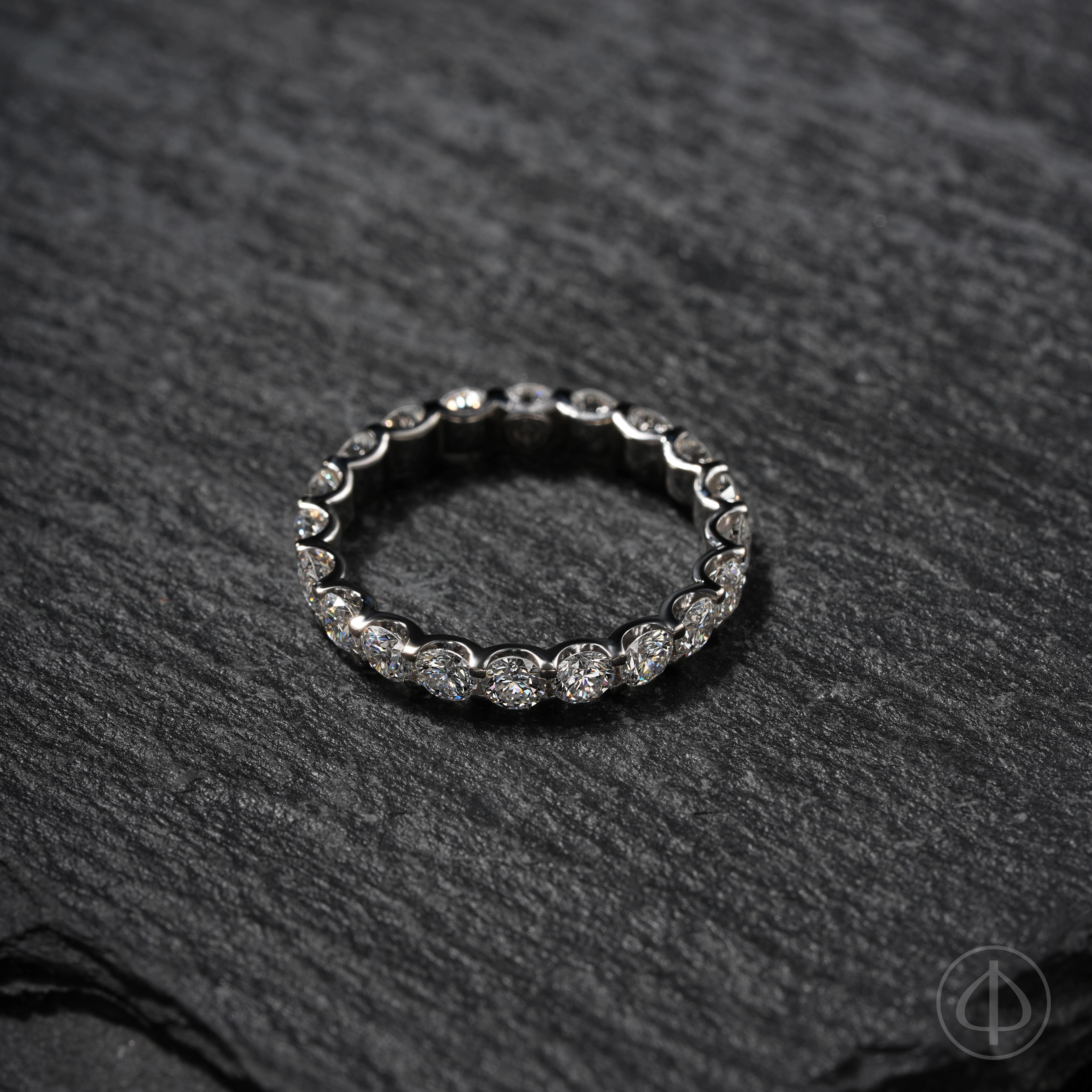 Кольцо из золота 585 пробы с вставкой из 20 бриллиантов. По диаметру кольца инкрустированы 20 прозрачных бриллиантов диаметром 3 мм. Основой кольца служит белое золото 585 пробы без покрытия.