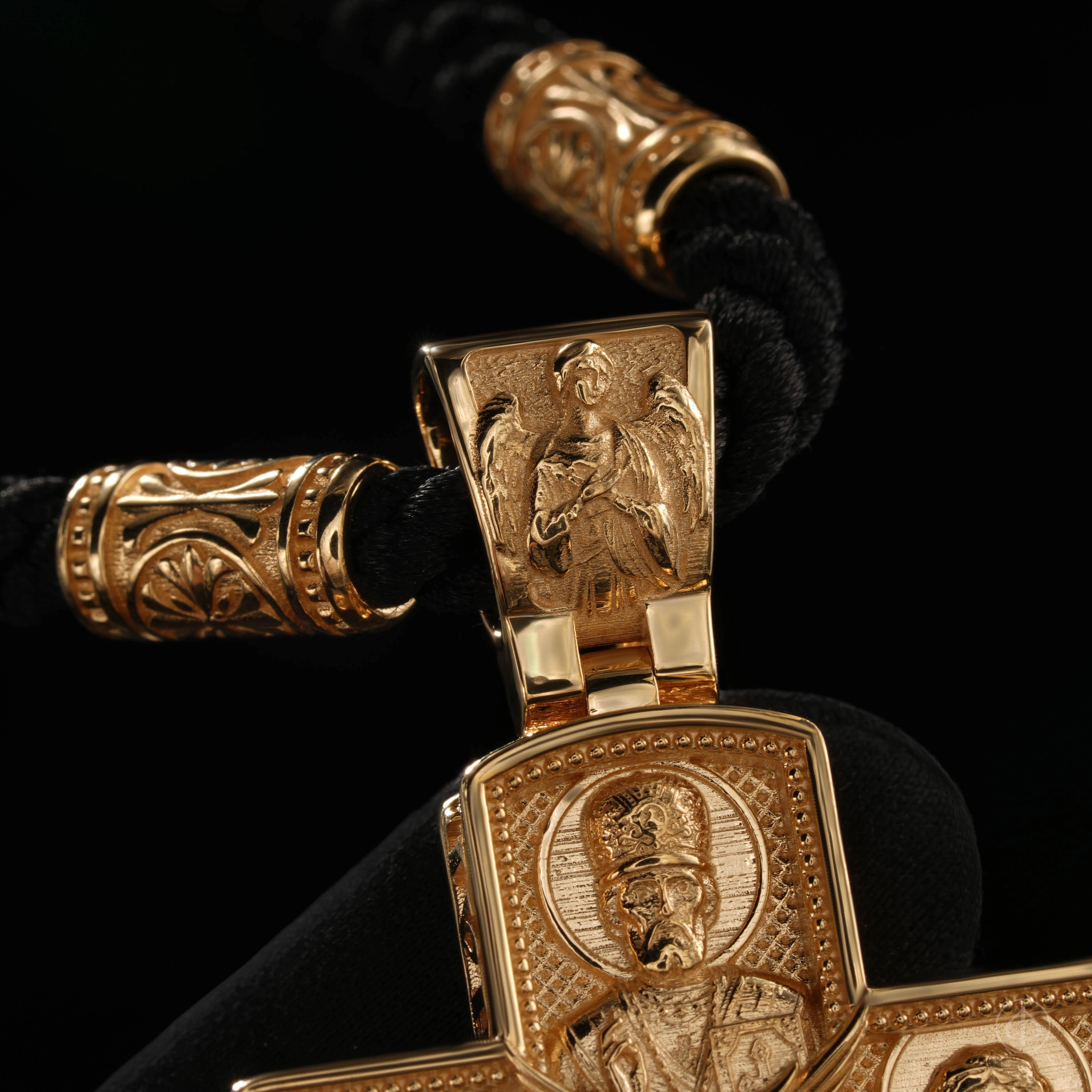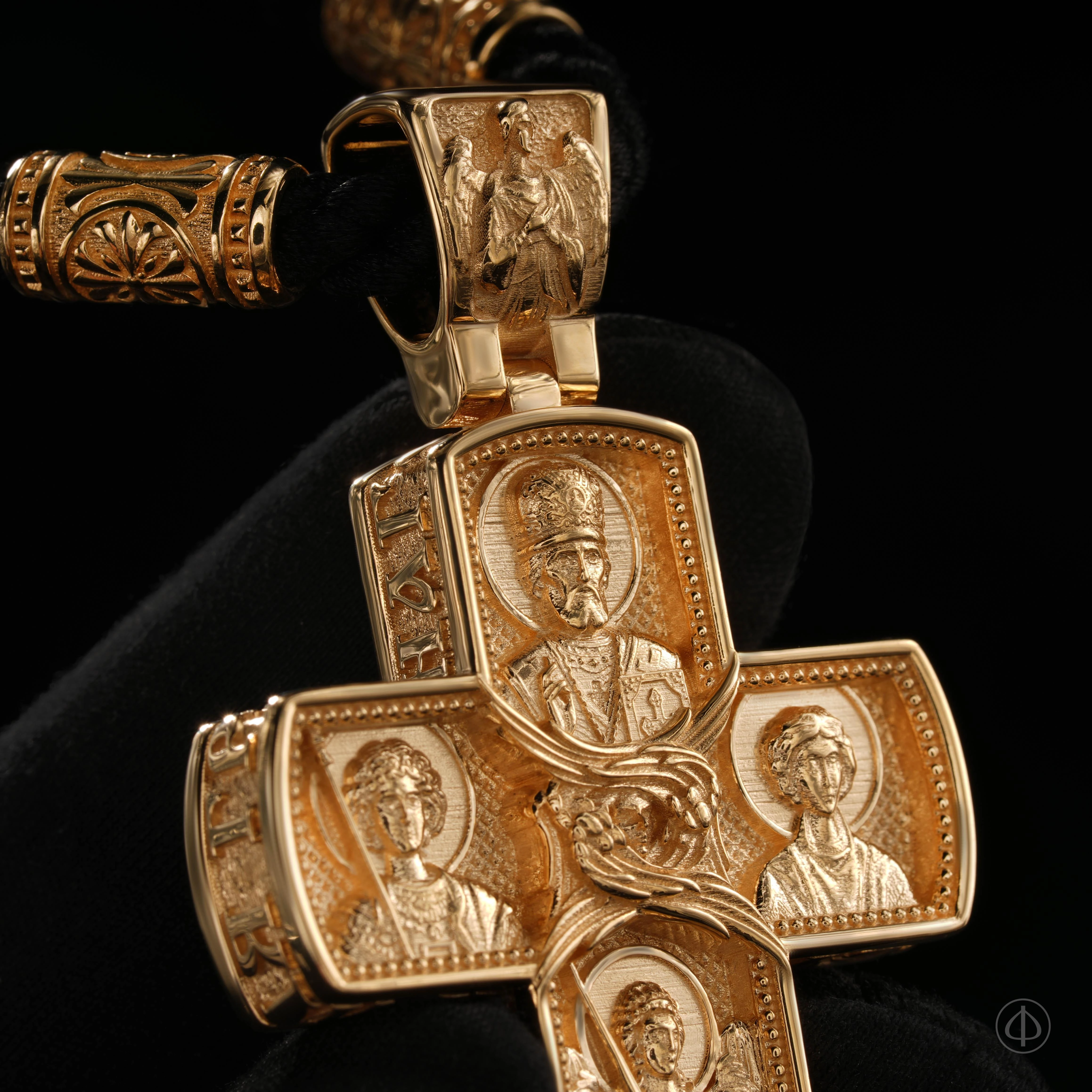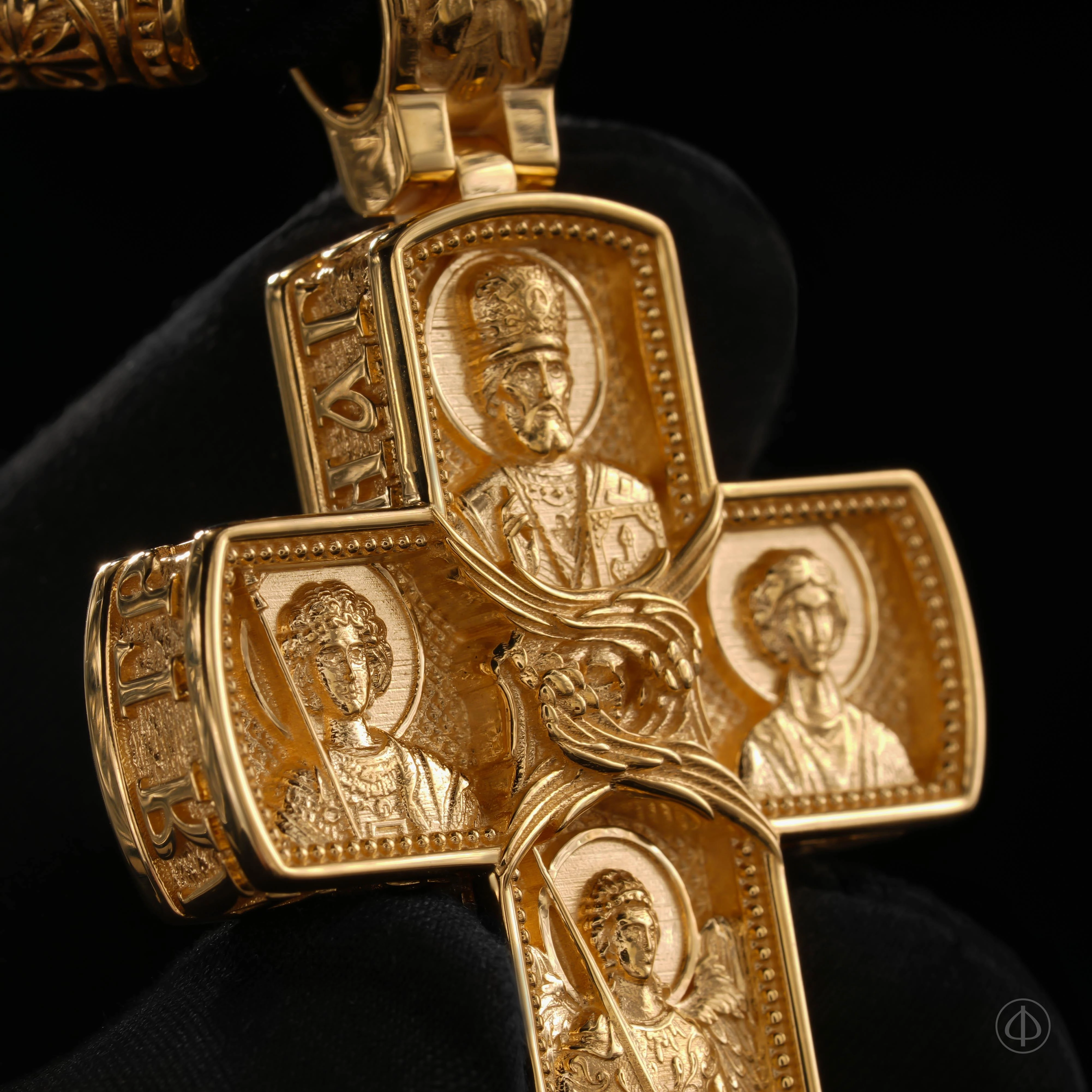 Обратная сторона креста представляет собой образ небесного покровительства и духовной защиты. В верхней части изображён святитель Николай Чудотворец — скорый помощник и заступник в житейских нуждах, в нижней — Архангел Михаил, символ победы добра над злом и духовной силы. По сторонам расположены великомученик Георгий Победоносец, олицетворяющий стойкость в вере, и великомученик Пантелеймон Целитель, почитаемый как целитель души и тела. В центре композиции — шестикрылый Херувим, знак небесной славы и присутствия Божественной тайны, а на ушке размещён Ангел-Хранитель, как напоминание о постоянной невидимой защите человека на его жизненном пути.
