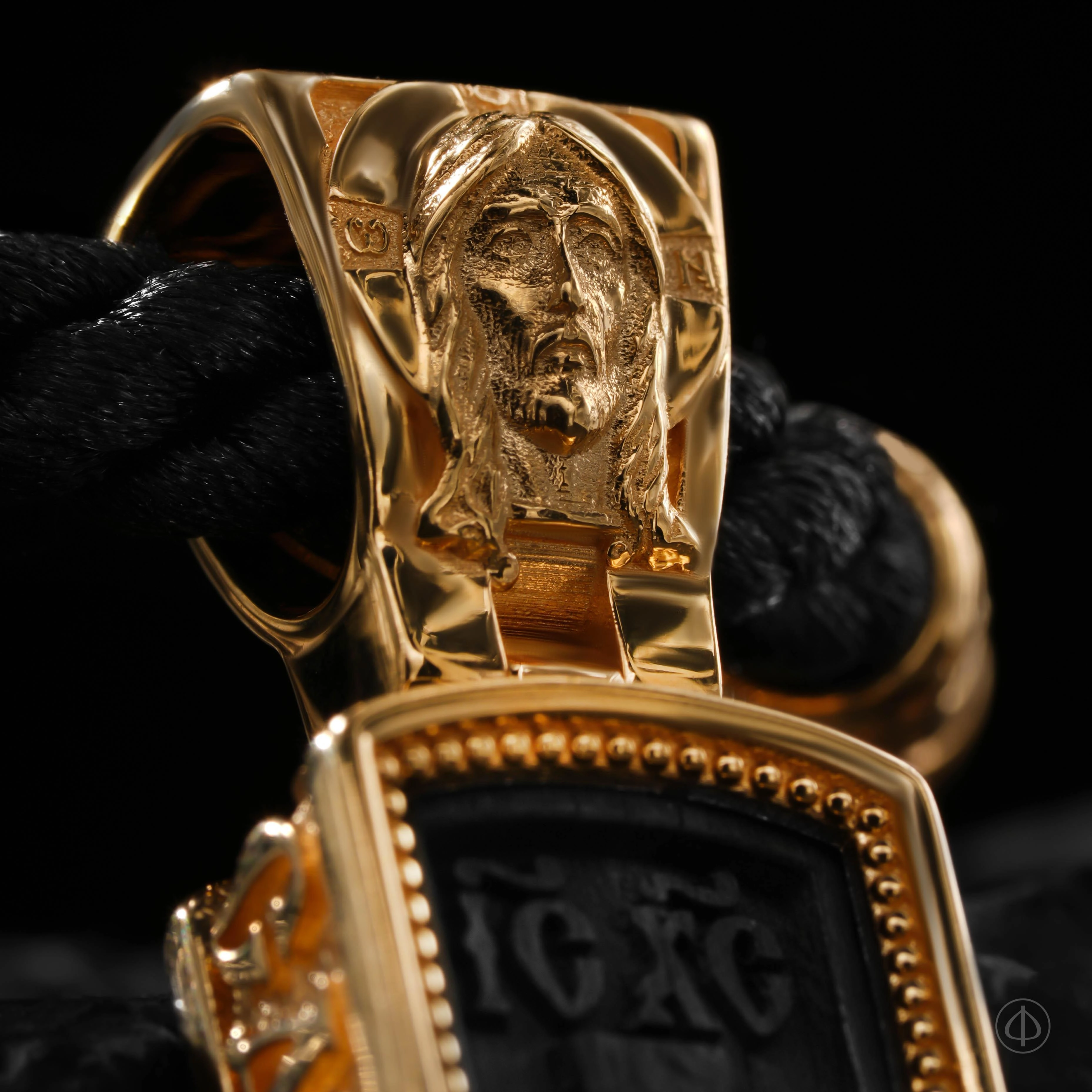 В центре лицевой стороны размещено Распятие Иисуса Христа — главный символ христианской веры, свидетельство жертвы, принесённой ради спасения человечества. По сторонам от Распятия изображены Пресвятая Богородица и апостол Иоанн Богослов — участники евангельского события, олицетворяющие материнскую скорбь, верность и духовное свидетельство. На ушке креста помещён образ Спаса Нерукотворного — знак Божественного присутствия и истинного лика Христа, а по торцу проходит Иисусова молитва, сопровождающая верующего.