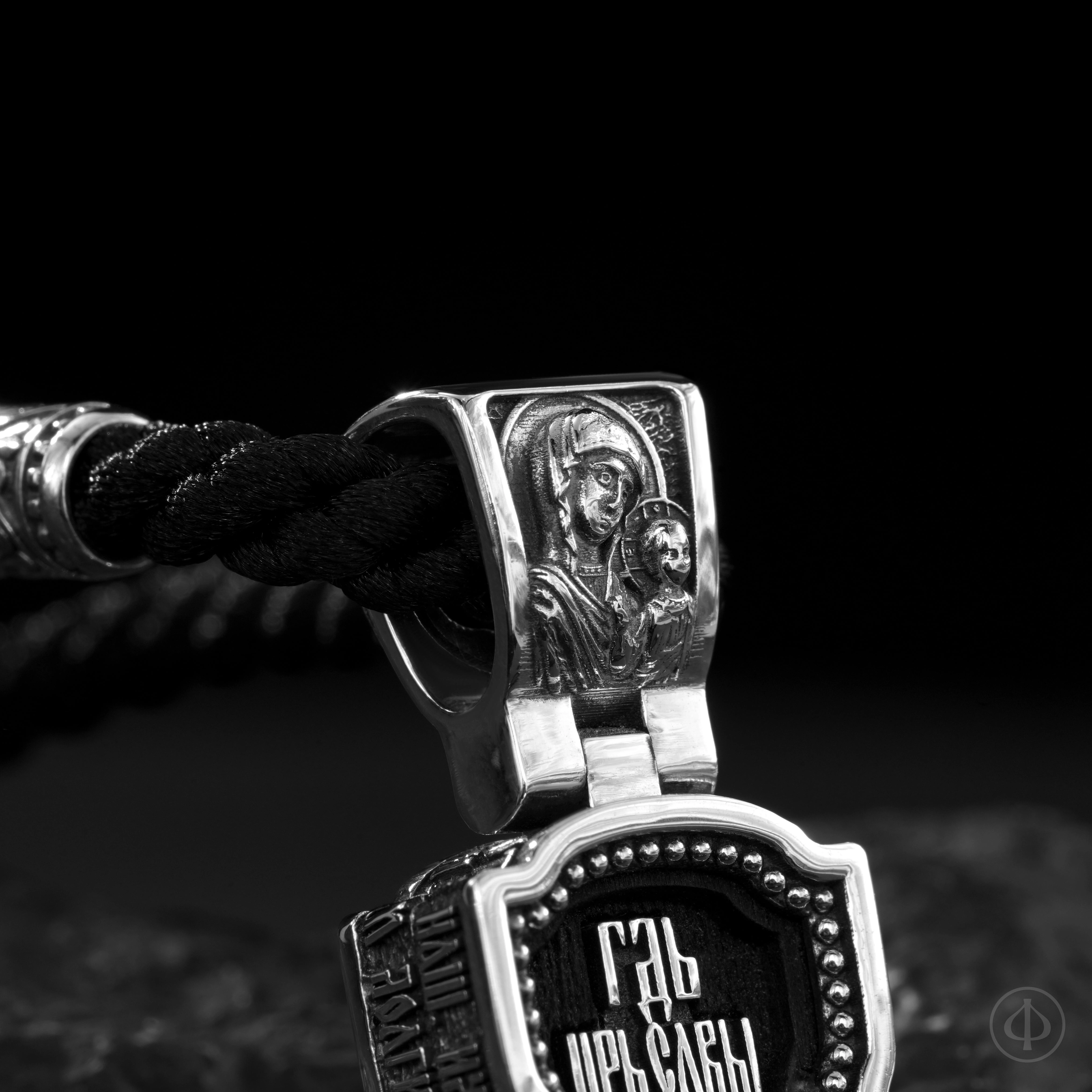 На лицевой стороне в центре размещён восьмиконечный крест с Распятием — главный символ христианской веры и жертвы Спасителя. Ушко украшает Казанская икона Божией Матери — образ покрова и материнского заступничества. По торцу проходит молитва «Отче наш», как ежедневное обращение к Богу, сопровождающее владельца.