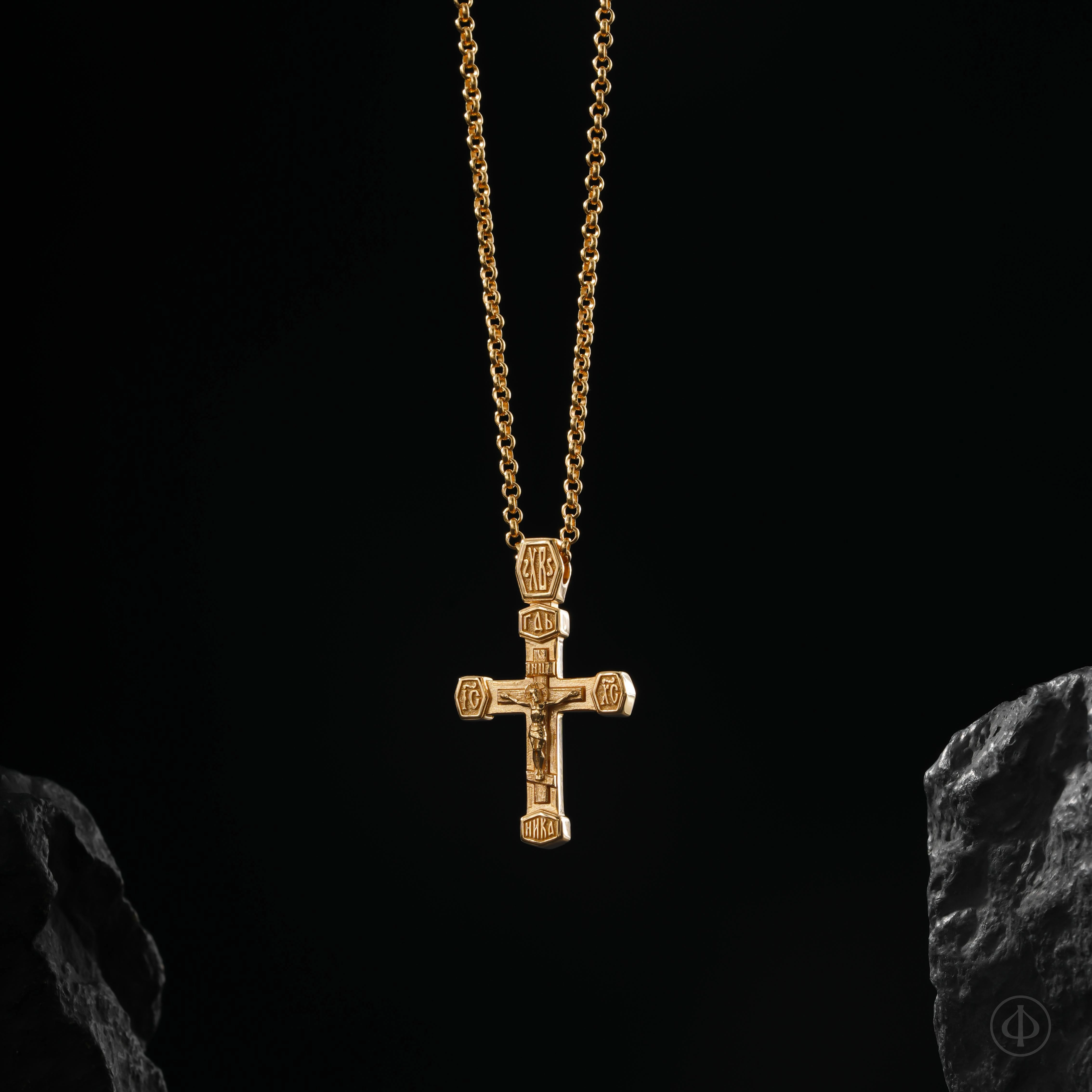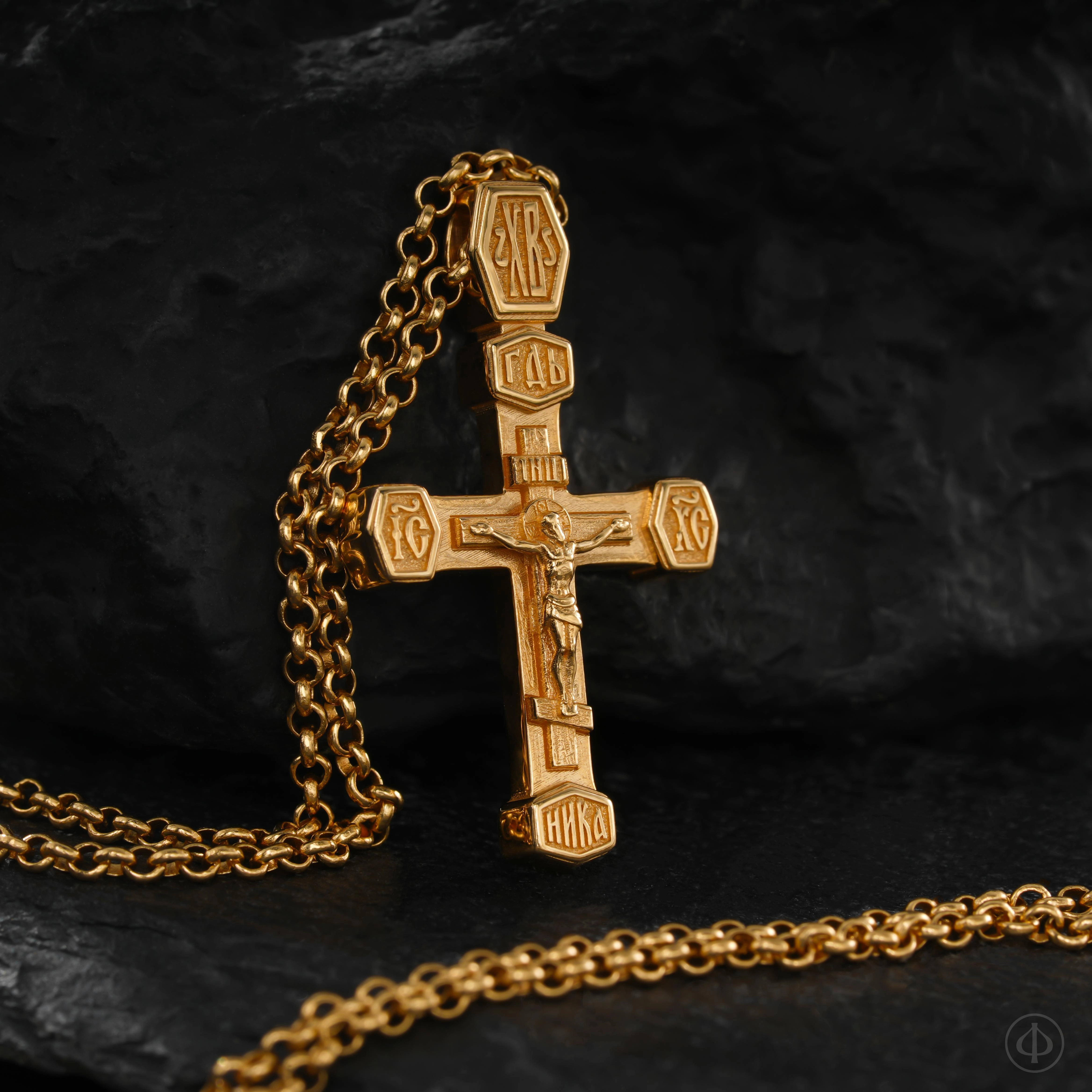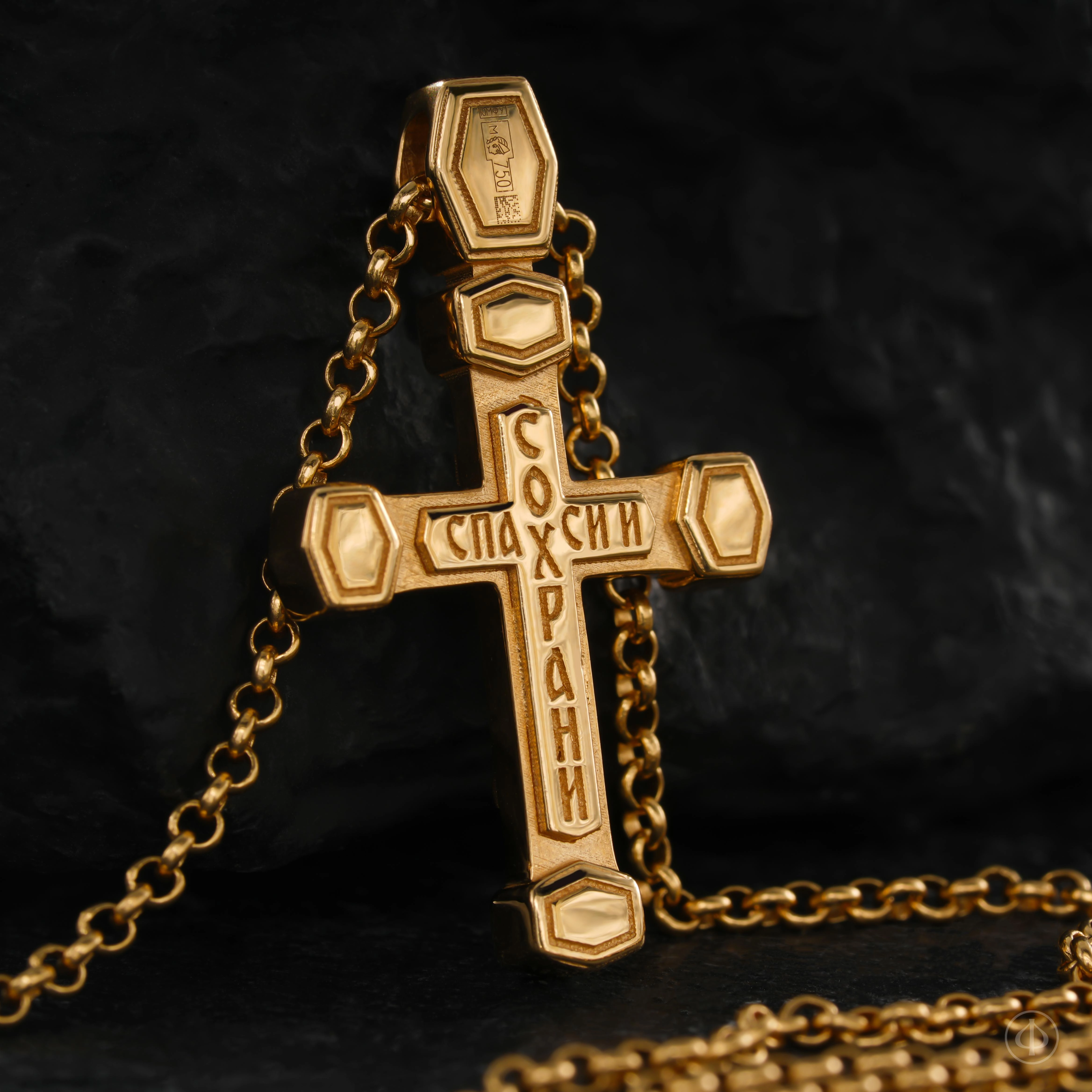 - в центре классический восьмиконечный крест с Распятием.