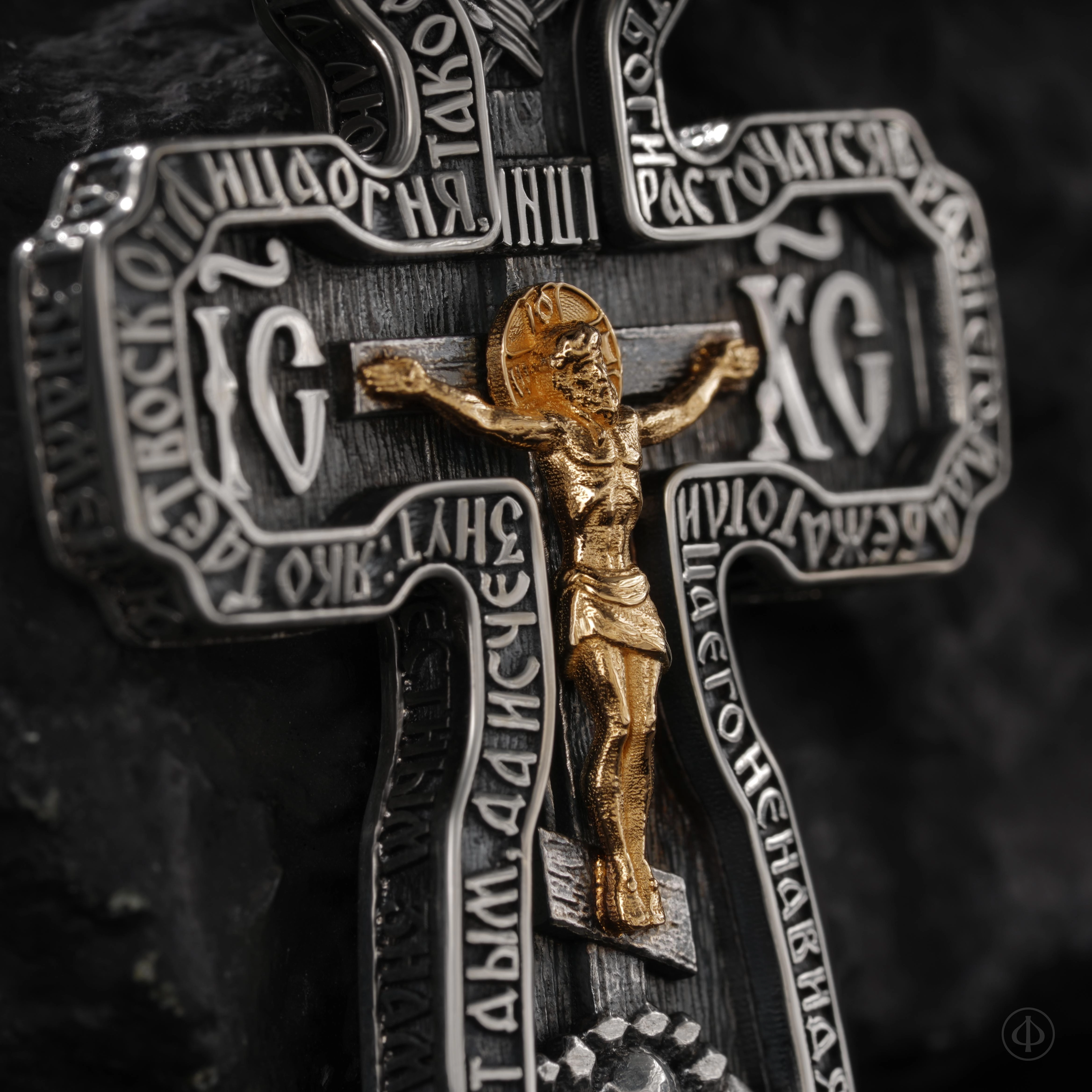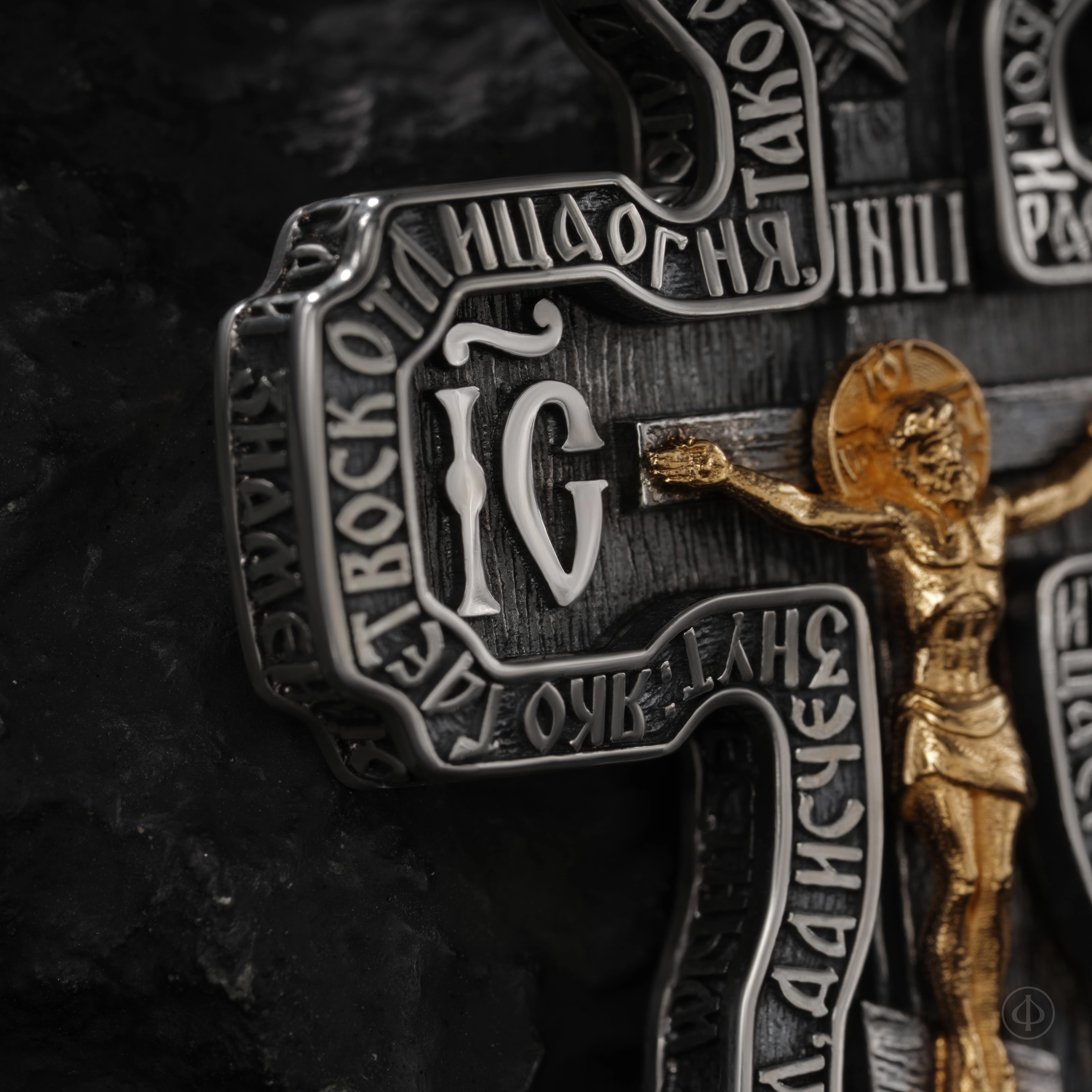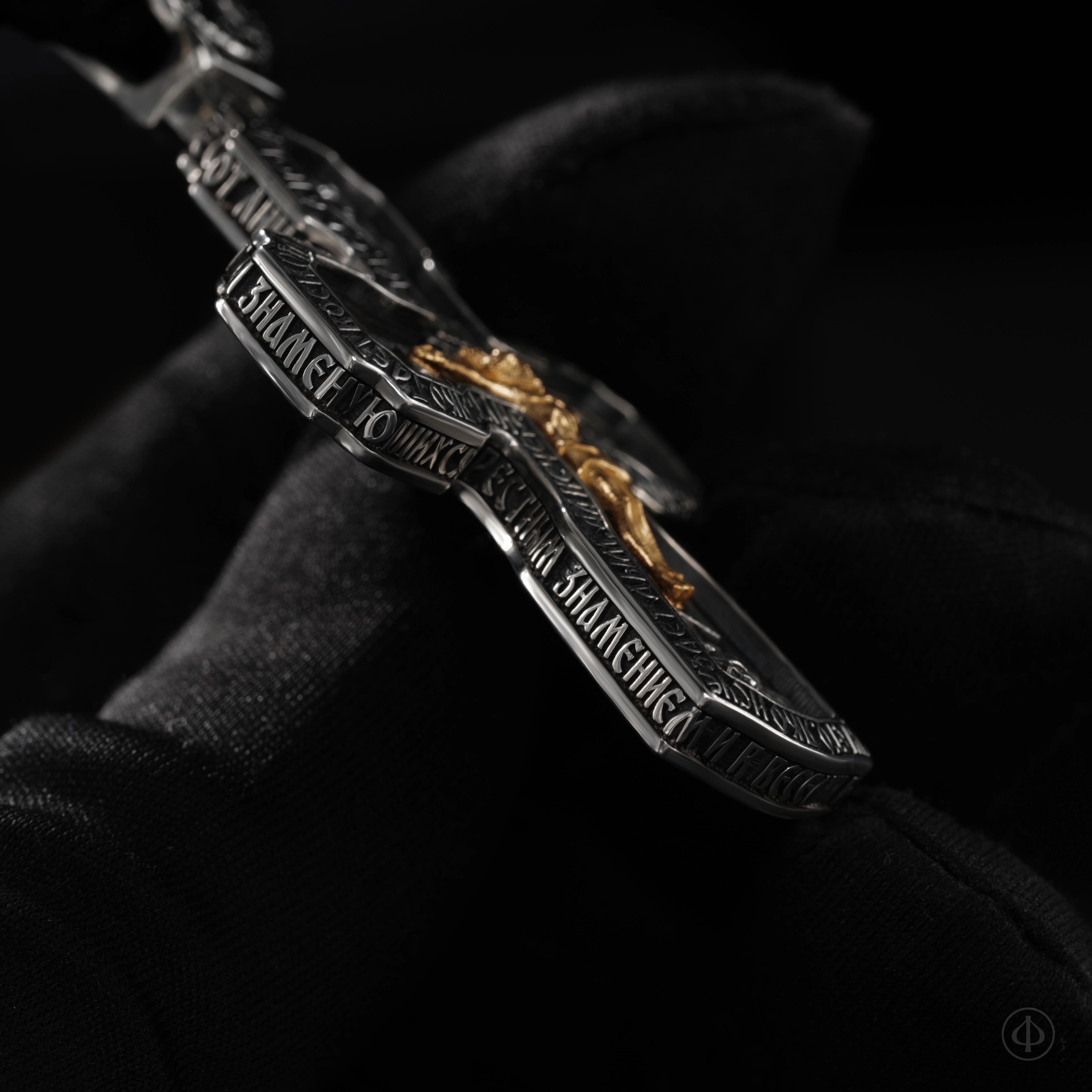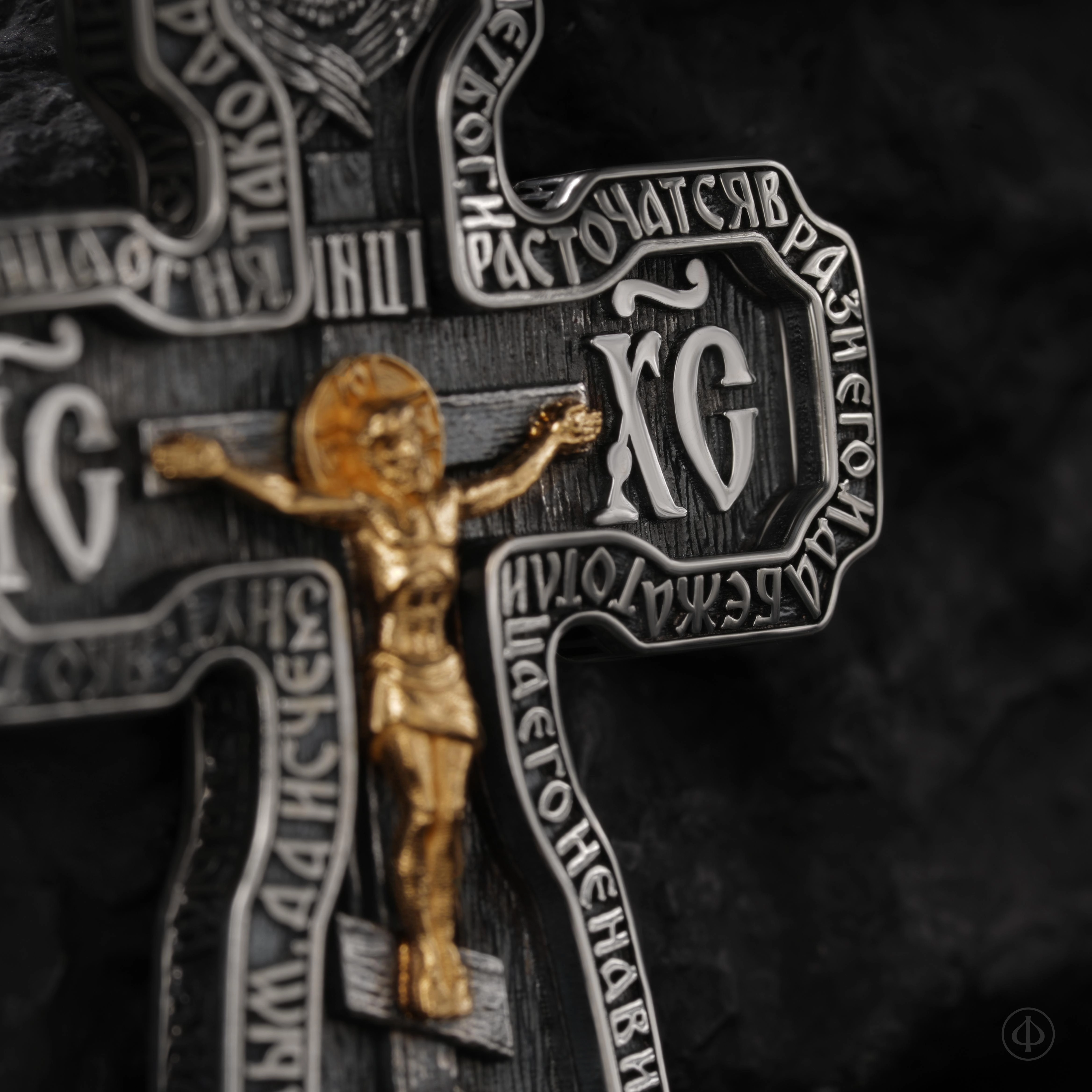 Крест выполнен из серебра с чернением, которое придает четкость изображению и оригинальный контраст рельефу. Распятие Иисуса на лицевой стороне крестика сделано из золота.