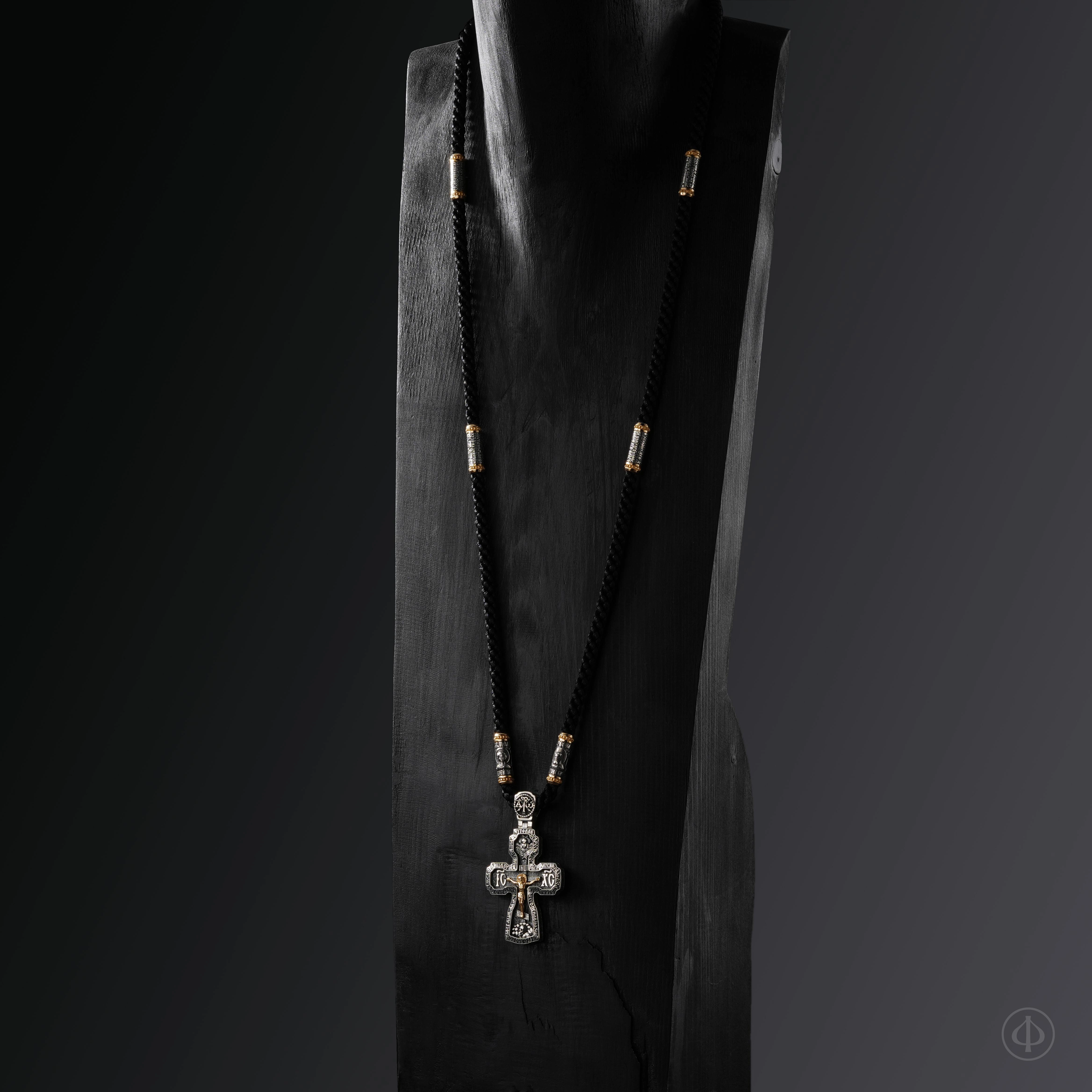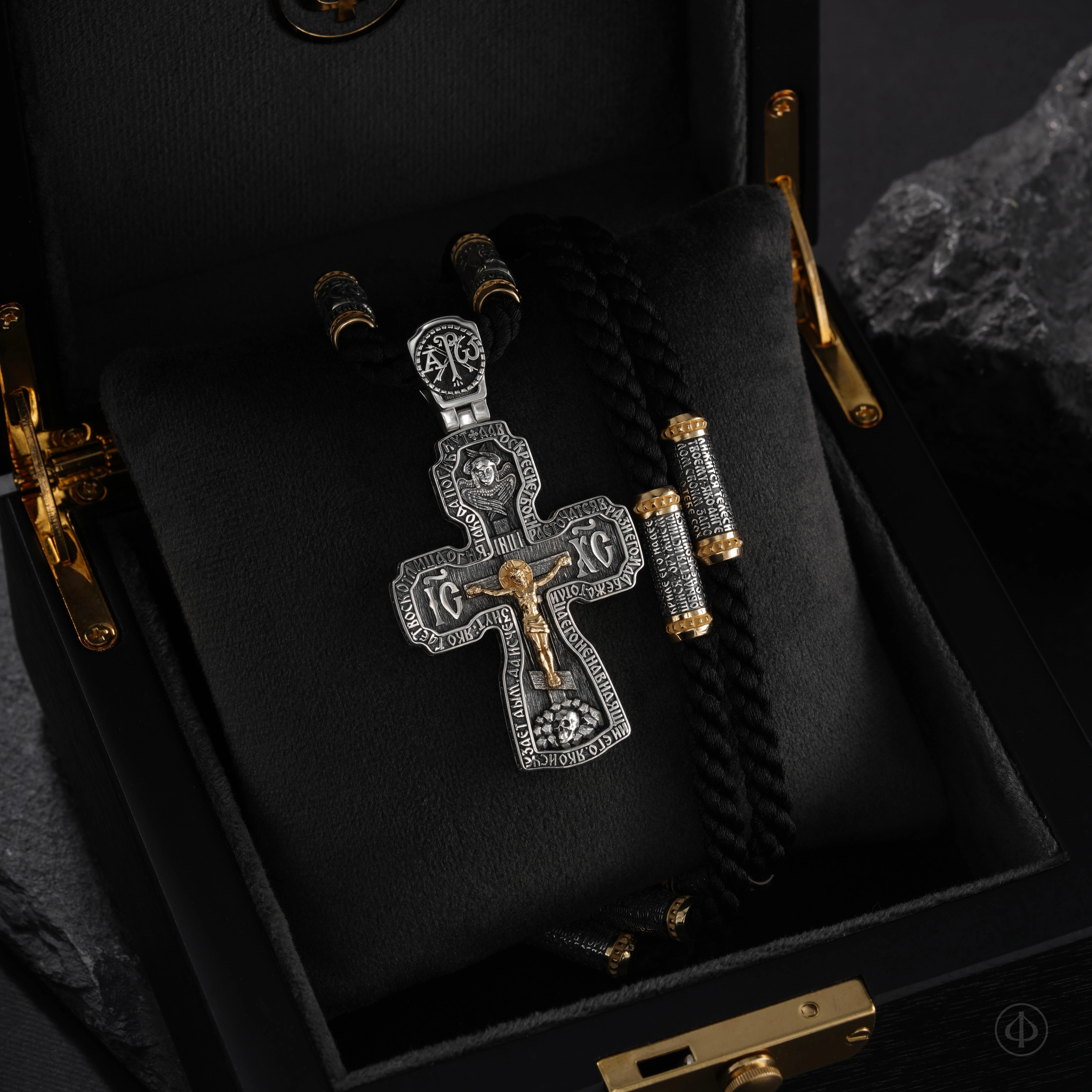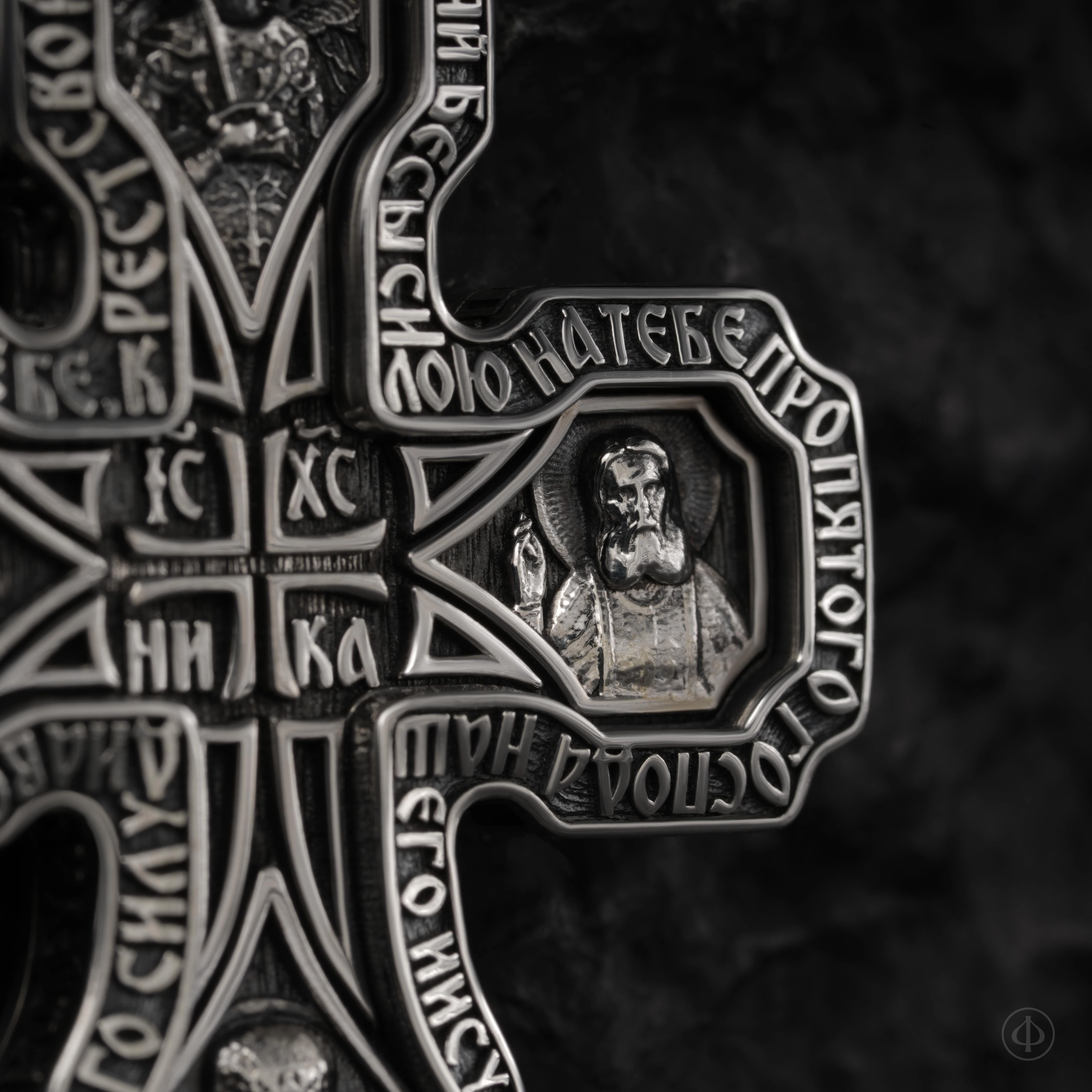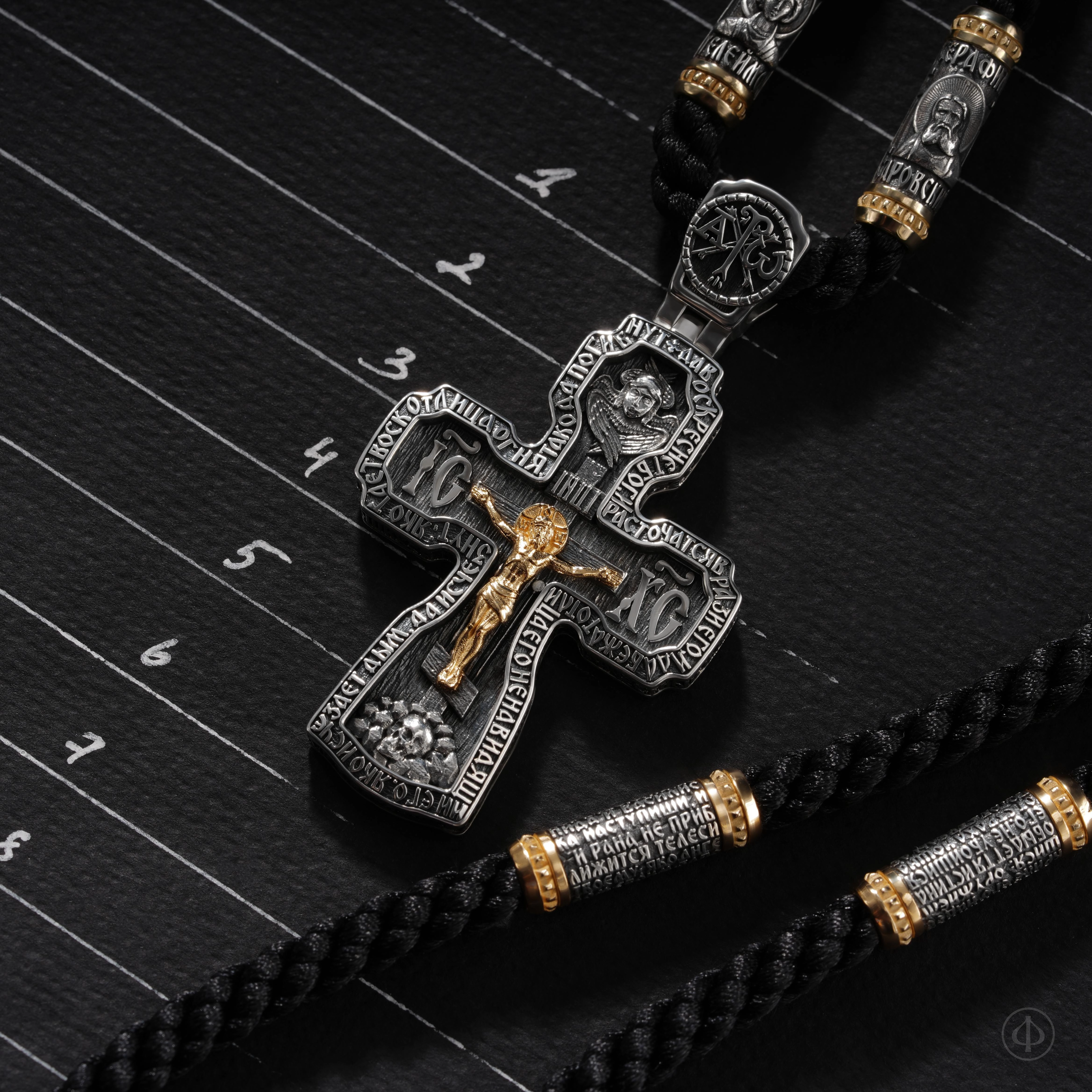 Крест выполнен из серебра с чернением, которое придает четкость изображению и оригинальный контраст рельефу. Распятие Иисуса на лицевой стороне крестика сделано из золота.