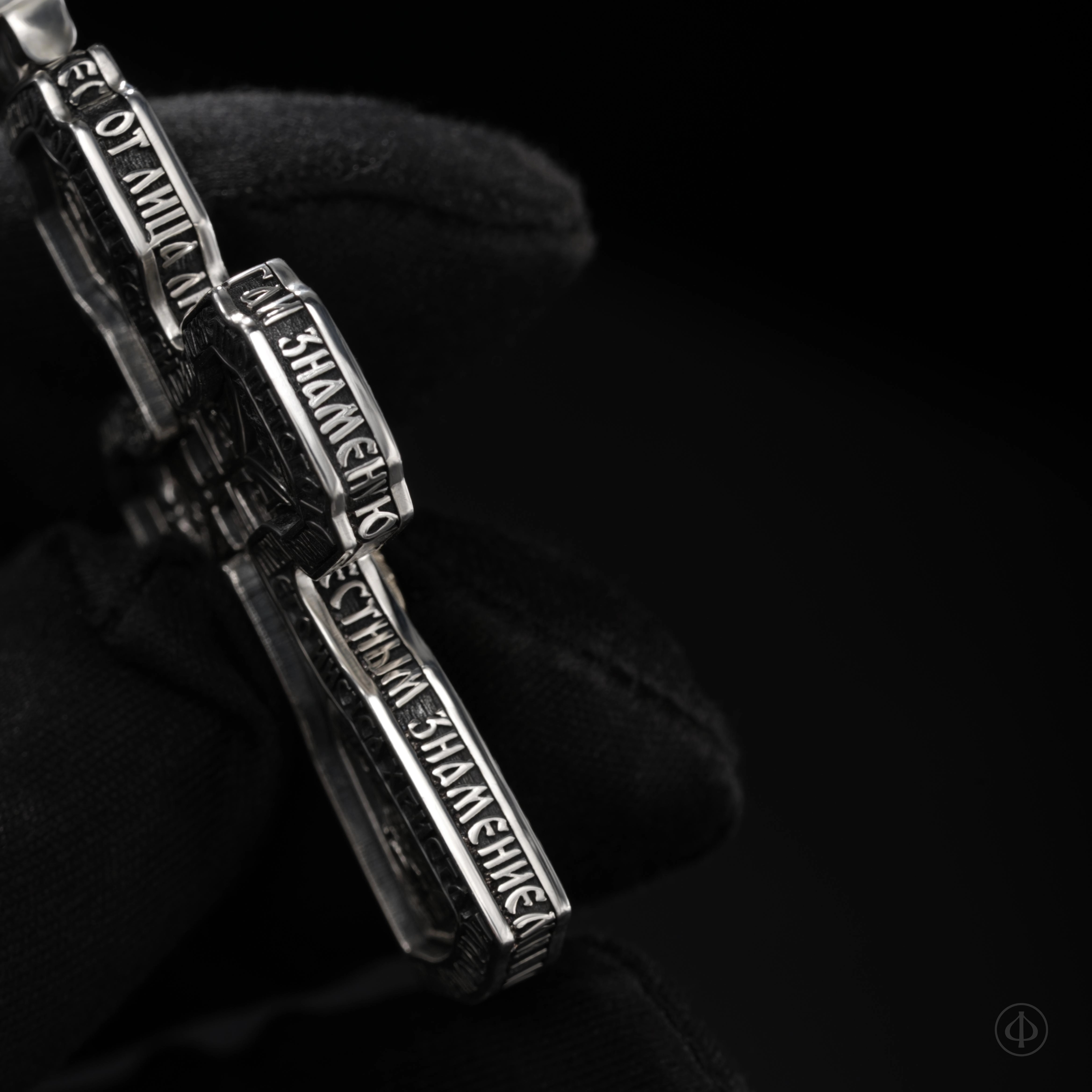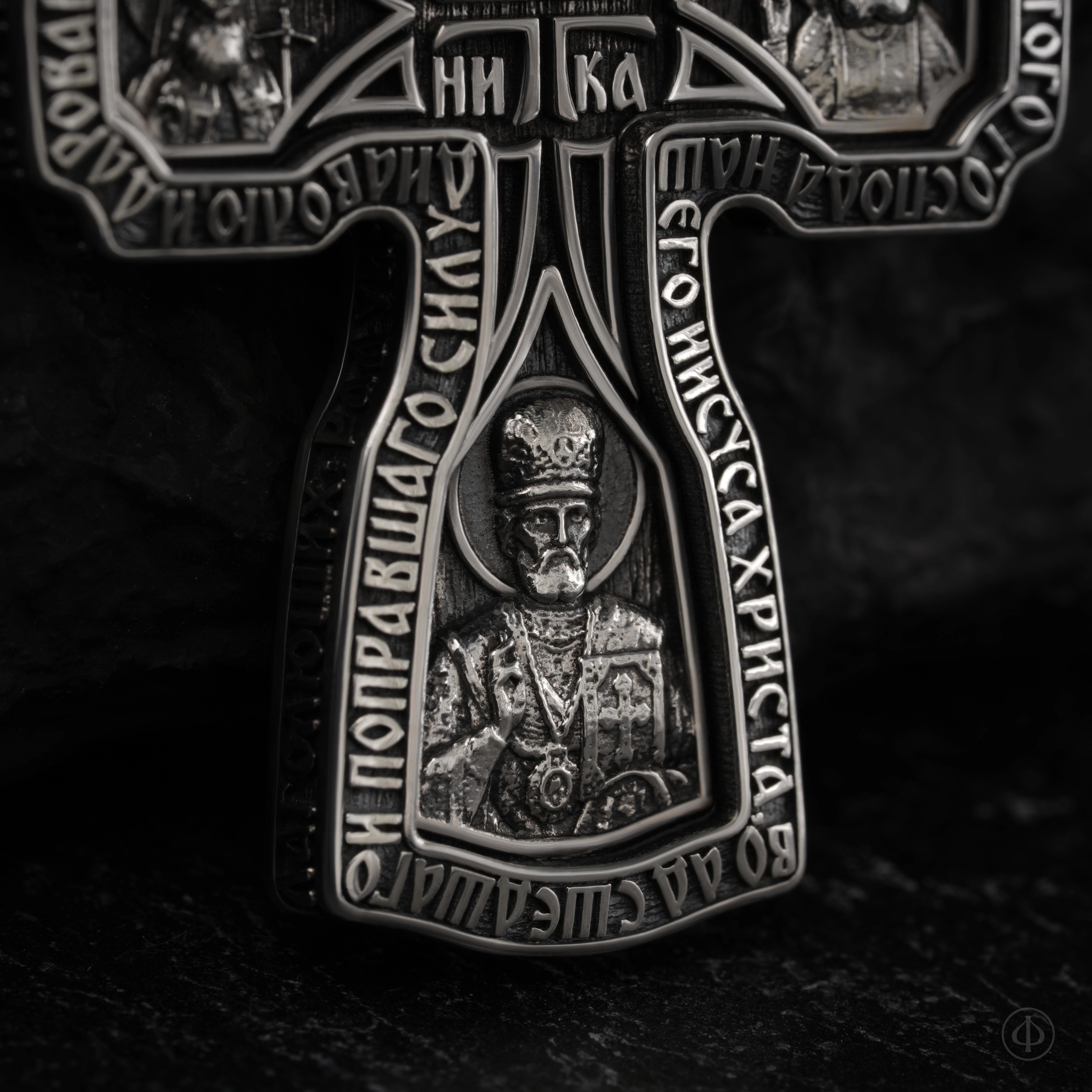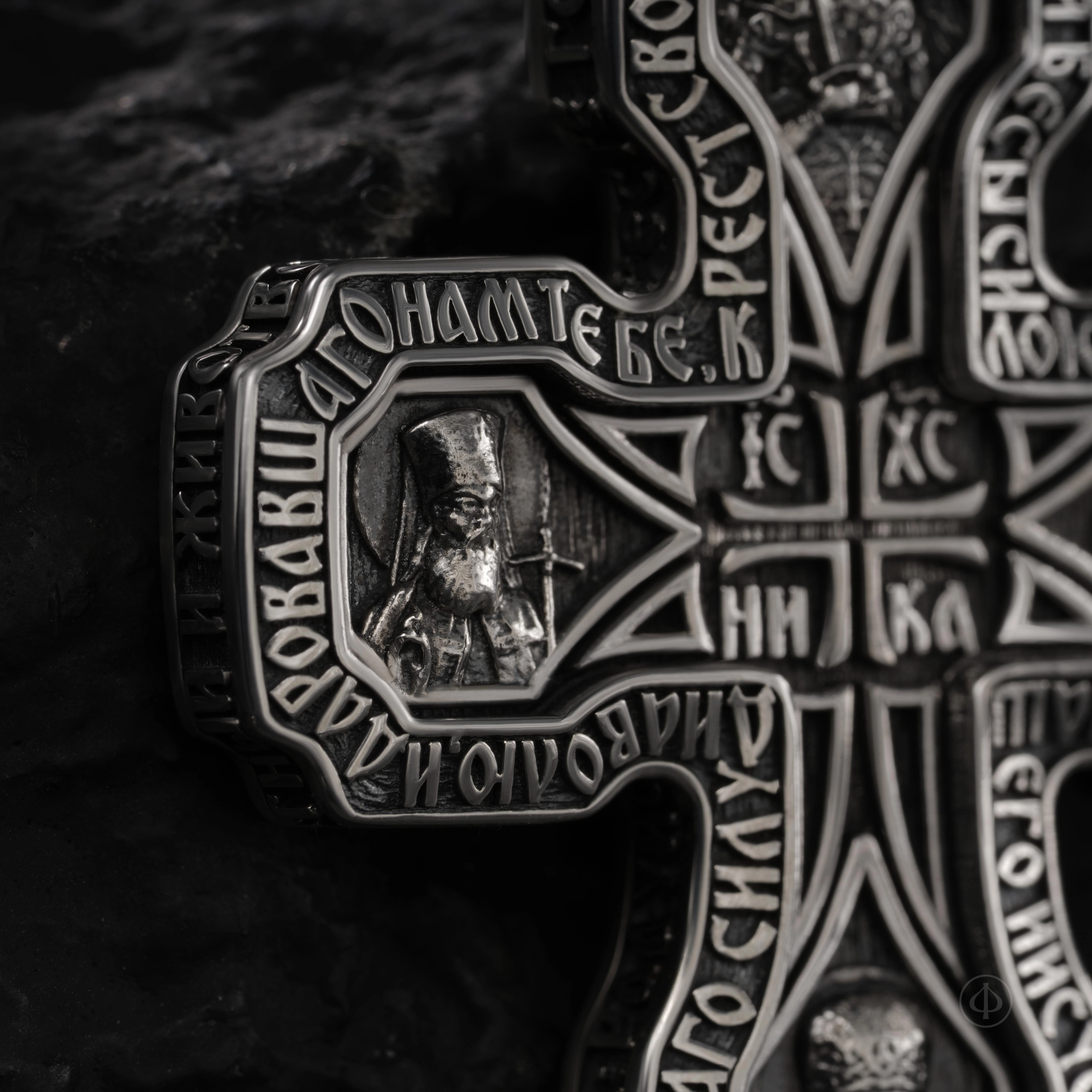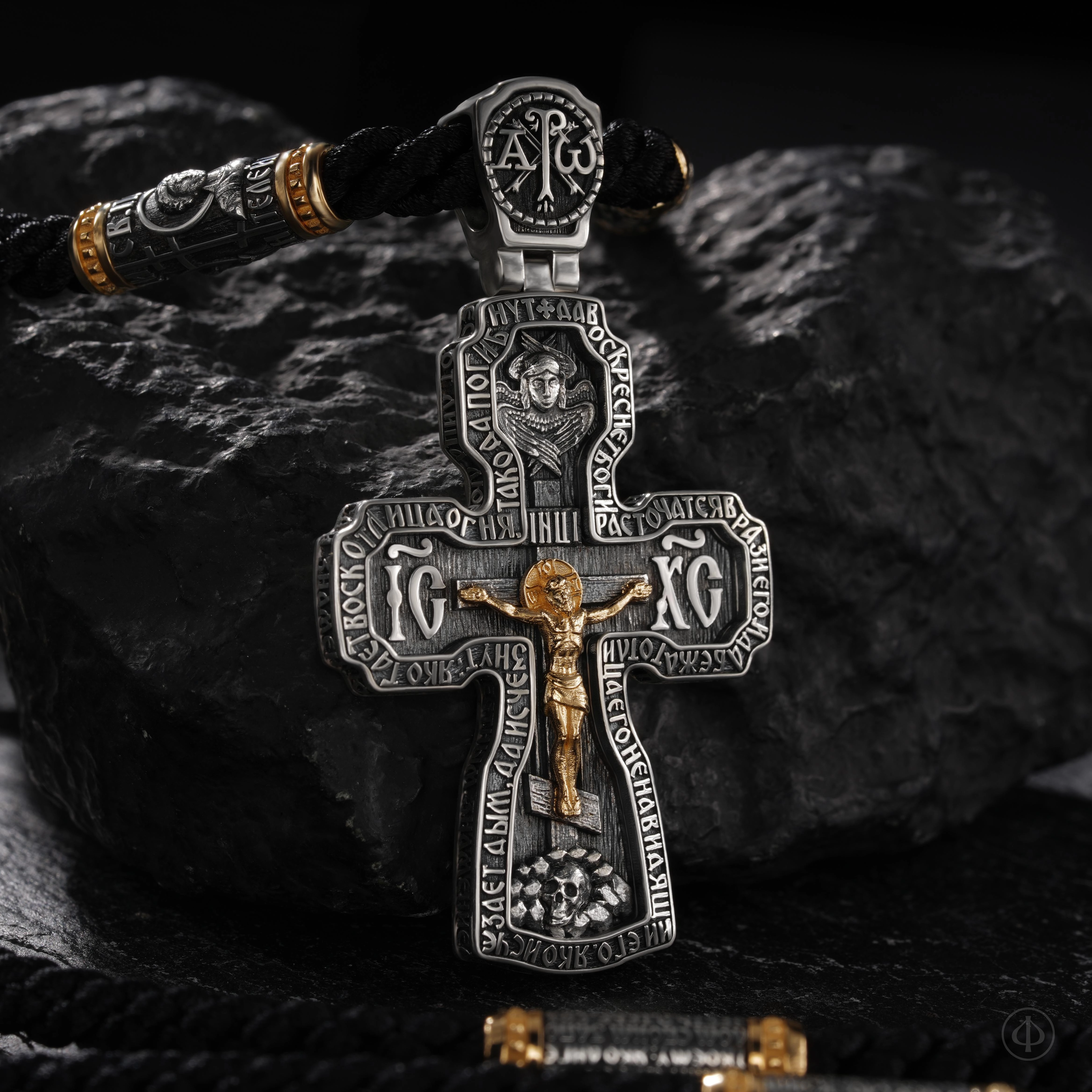 Крест выполнен из серебра с чернением, которое придает четкость изображению и оригинальный контраст рельефу. Распятие Иисуса на лицевой стороне крестика сделано из золота.