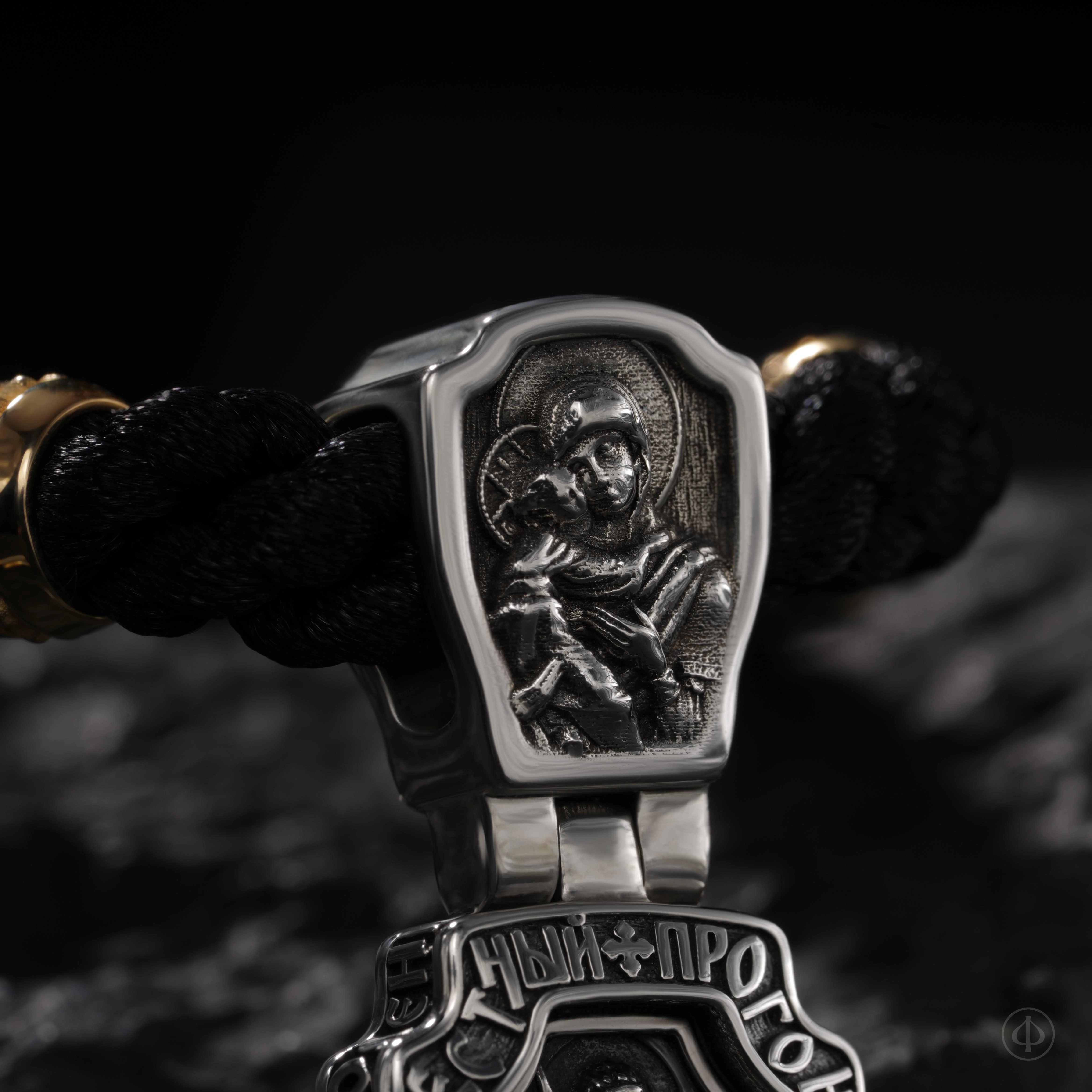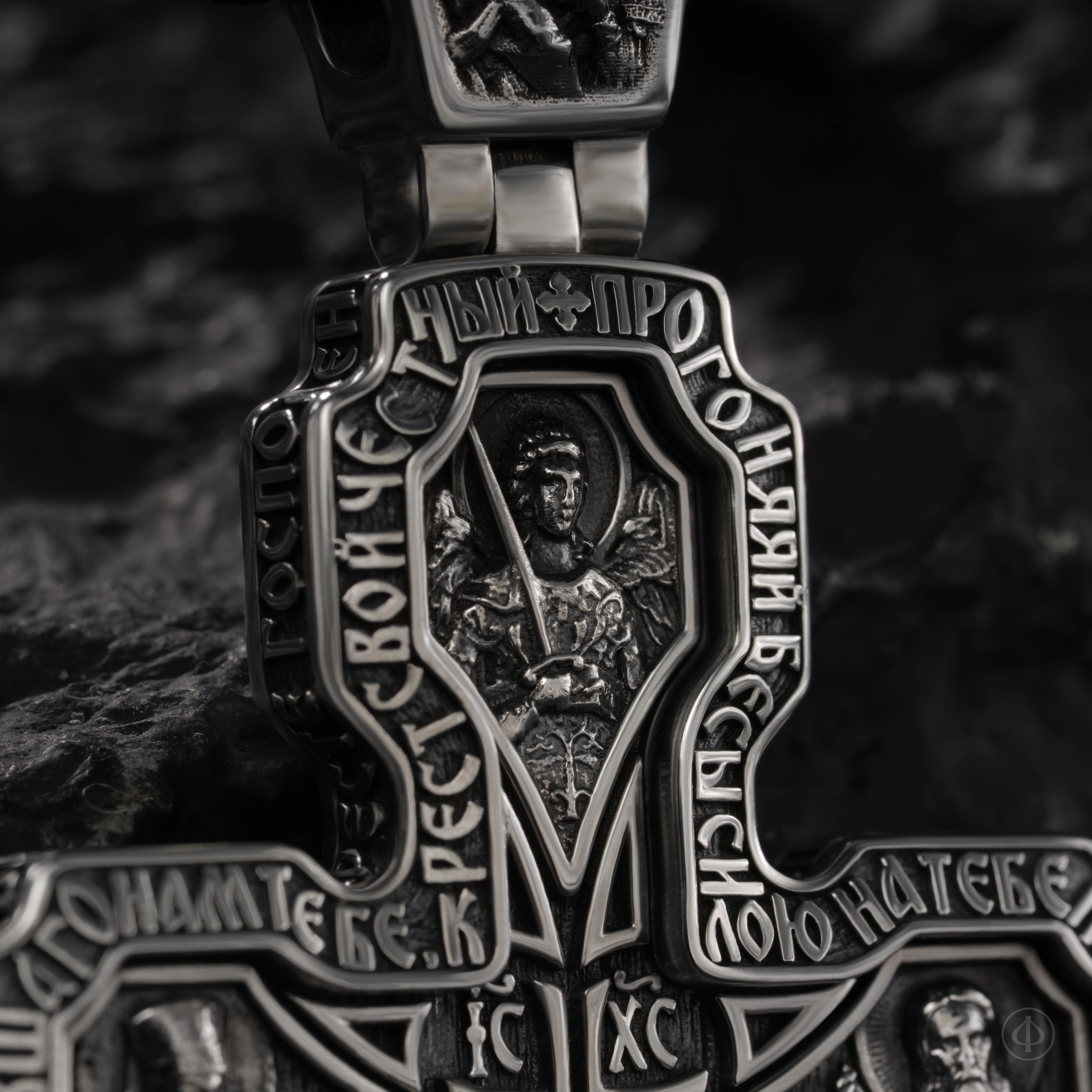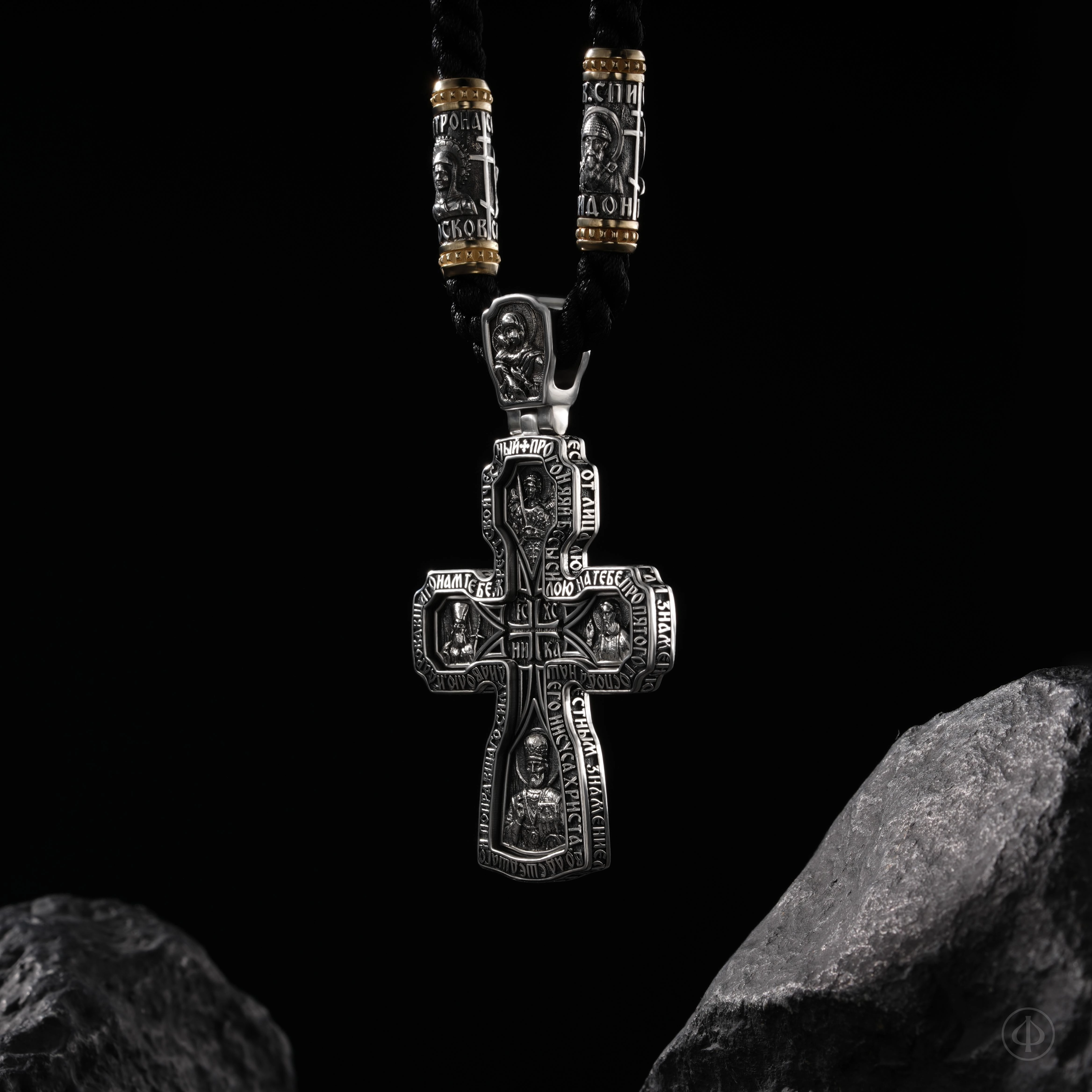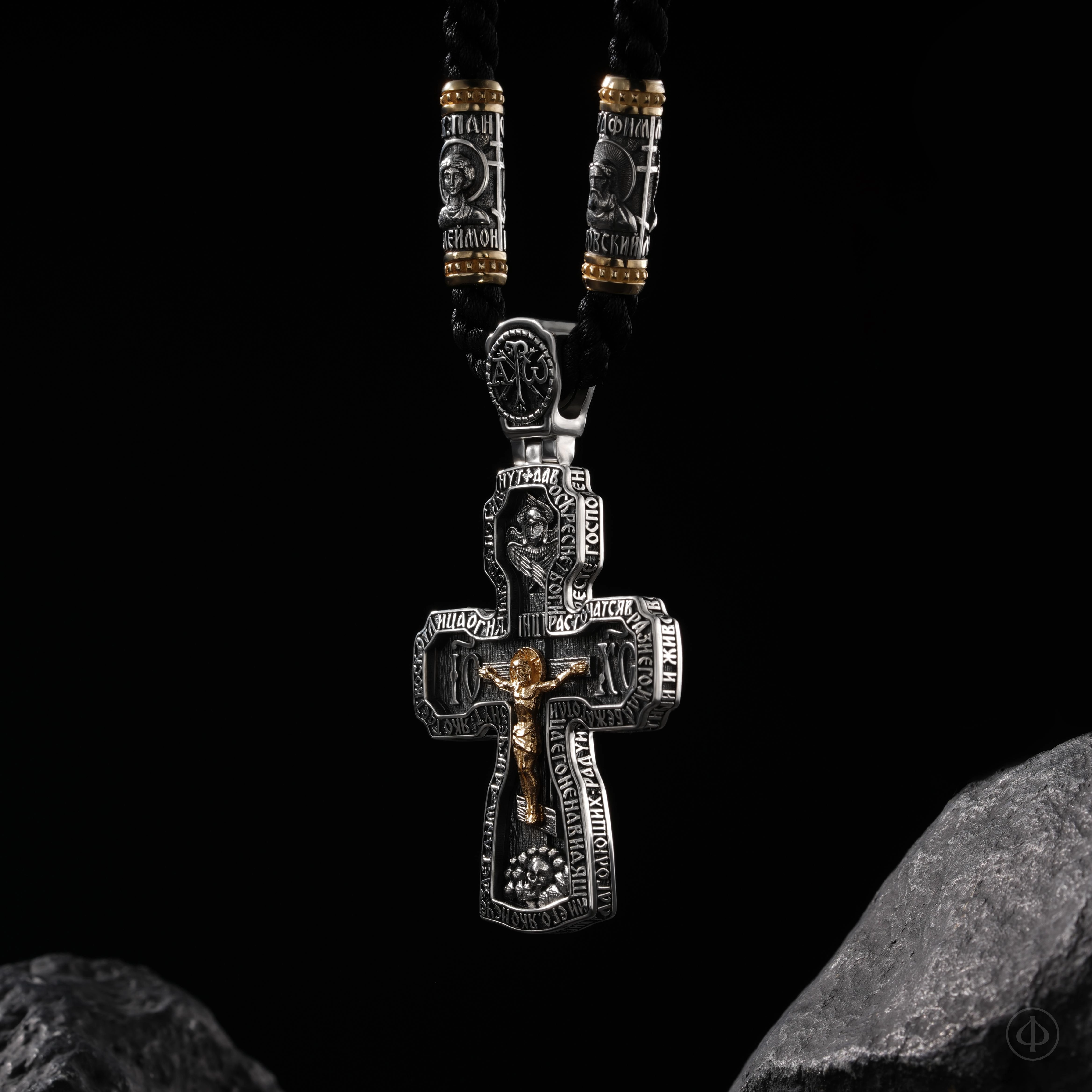 Крест выполнен из серебра с чернением, которое придает четкость изображению и оригинальный контраст рельефу. Распятие Иисуса на лицевой стороне крестика сделано из золота.