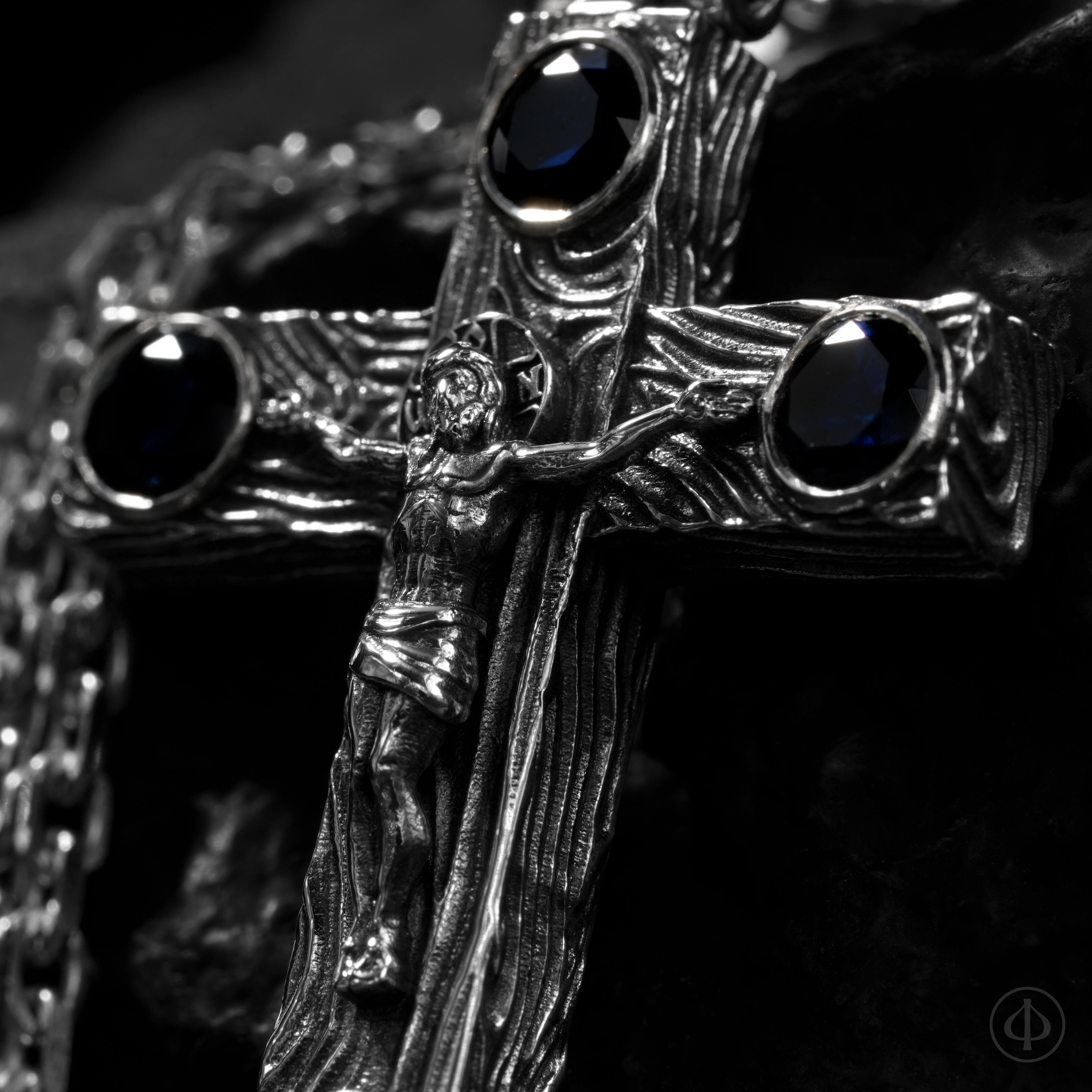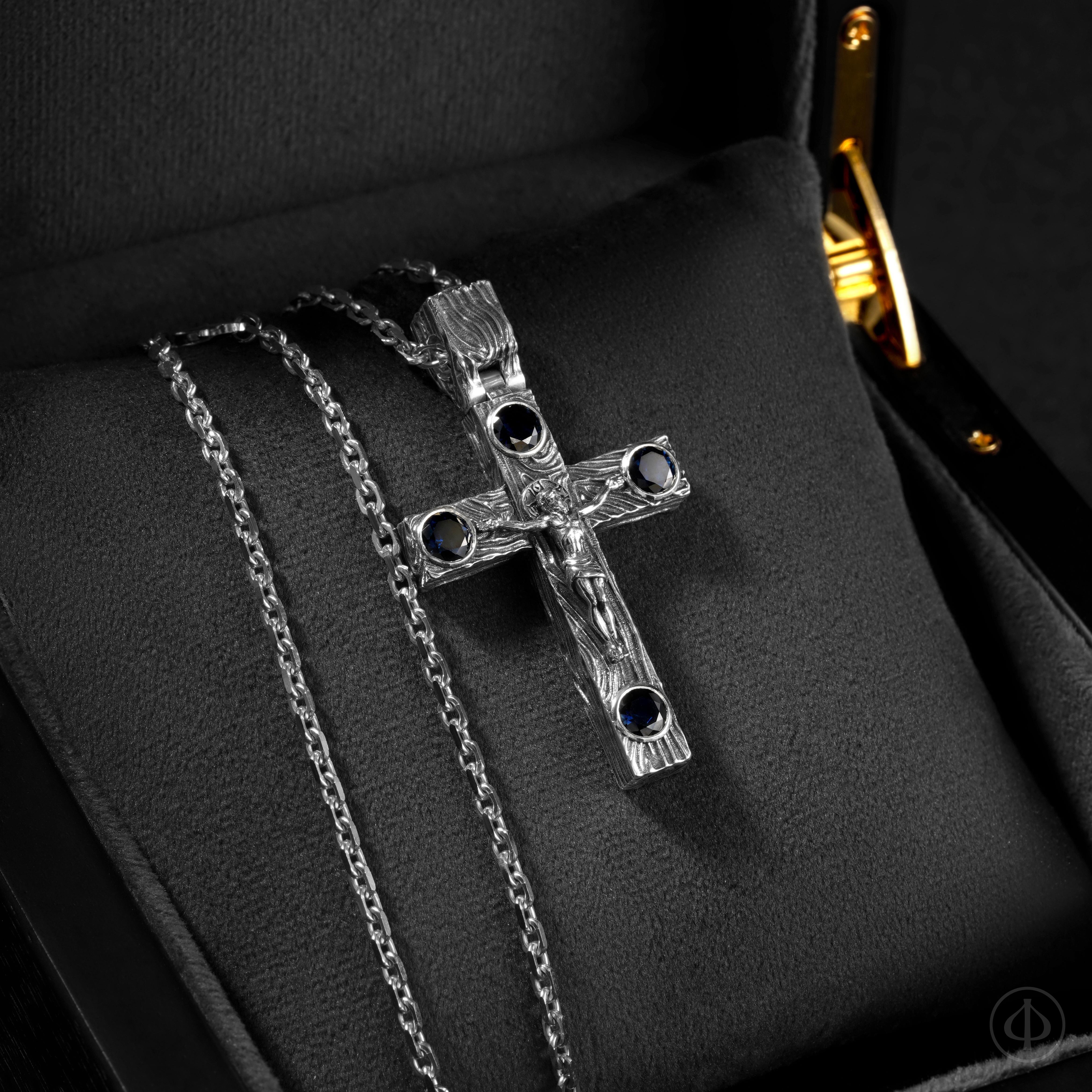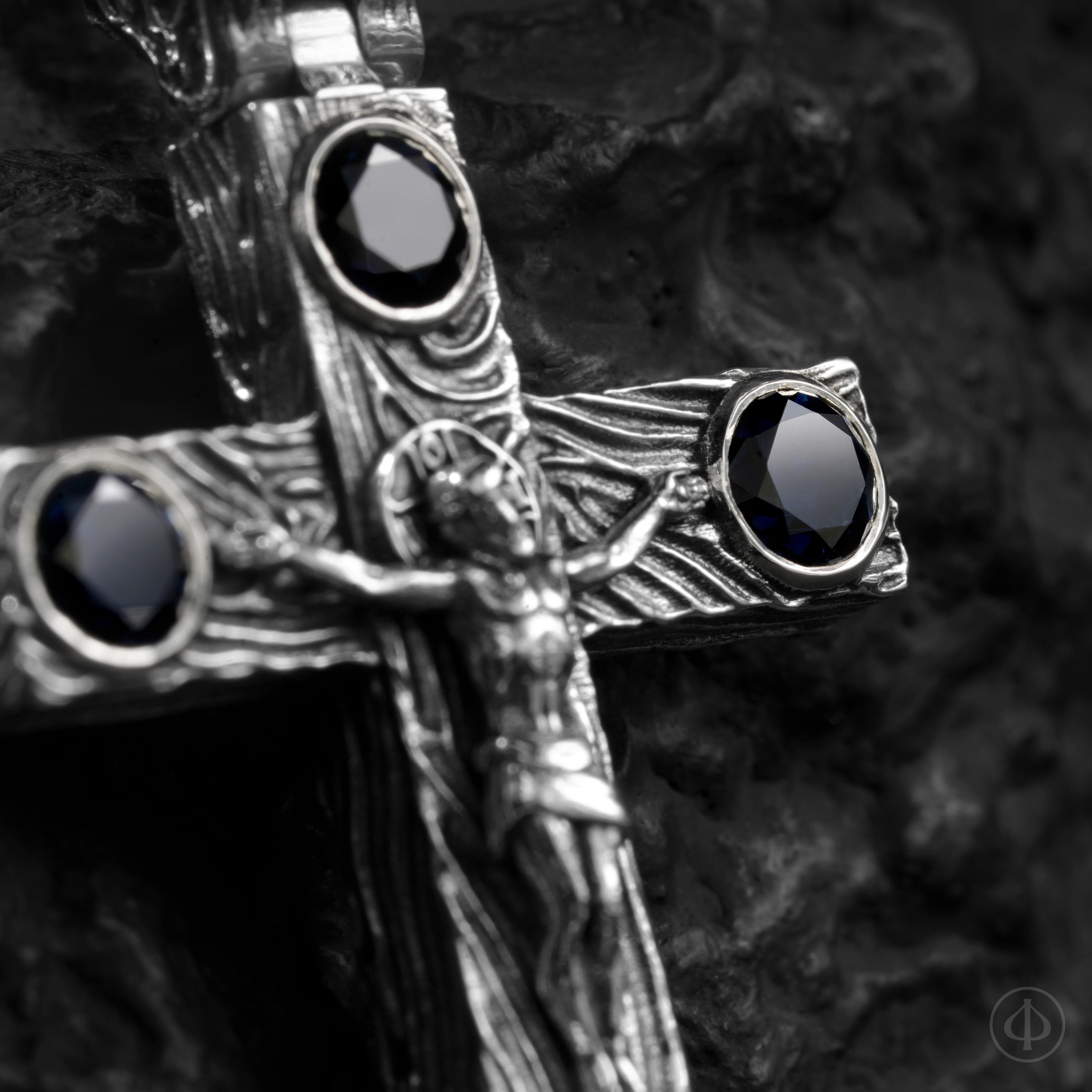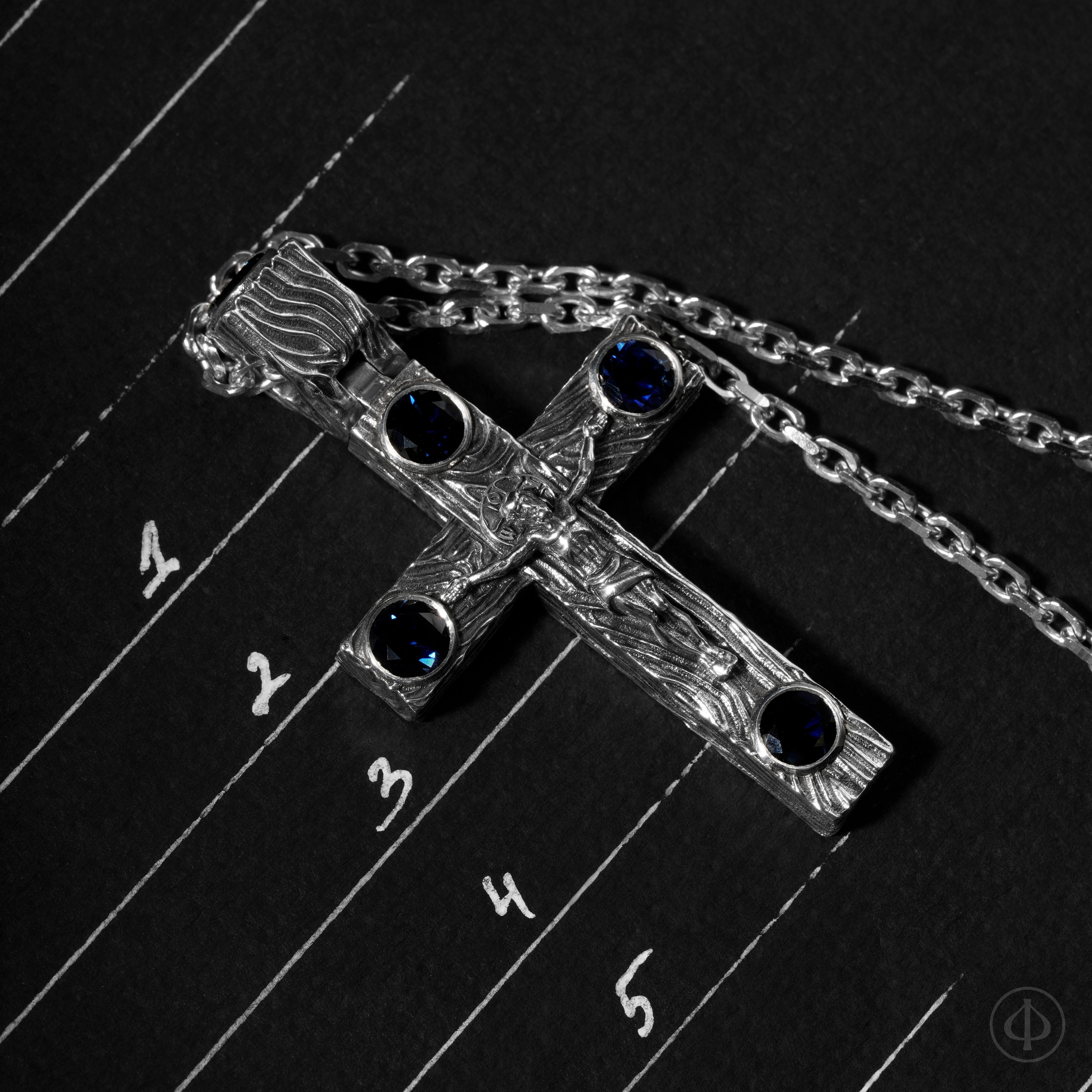 - по сторонам креста и в верхней части ушка сапфиры,