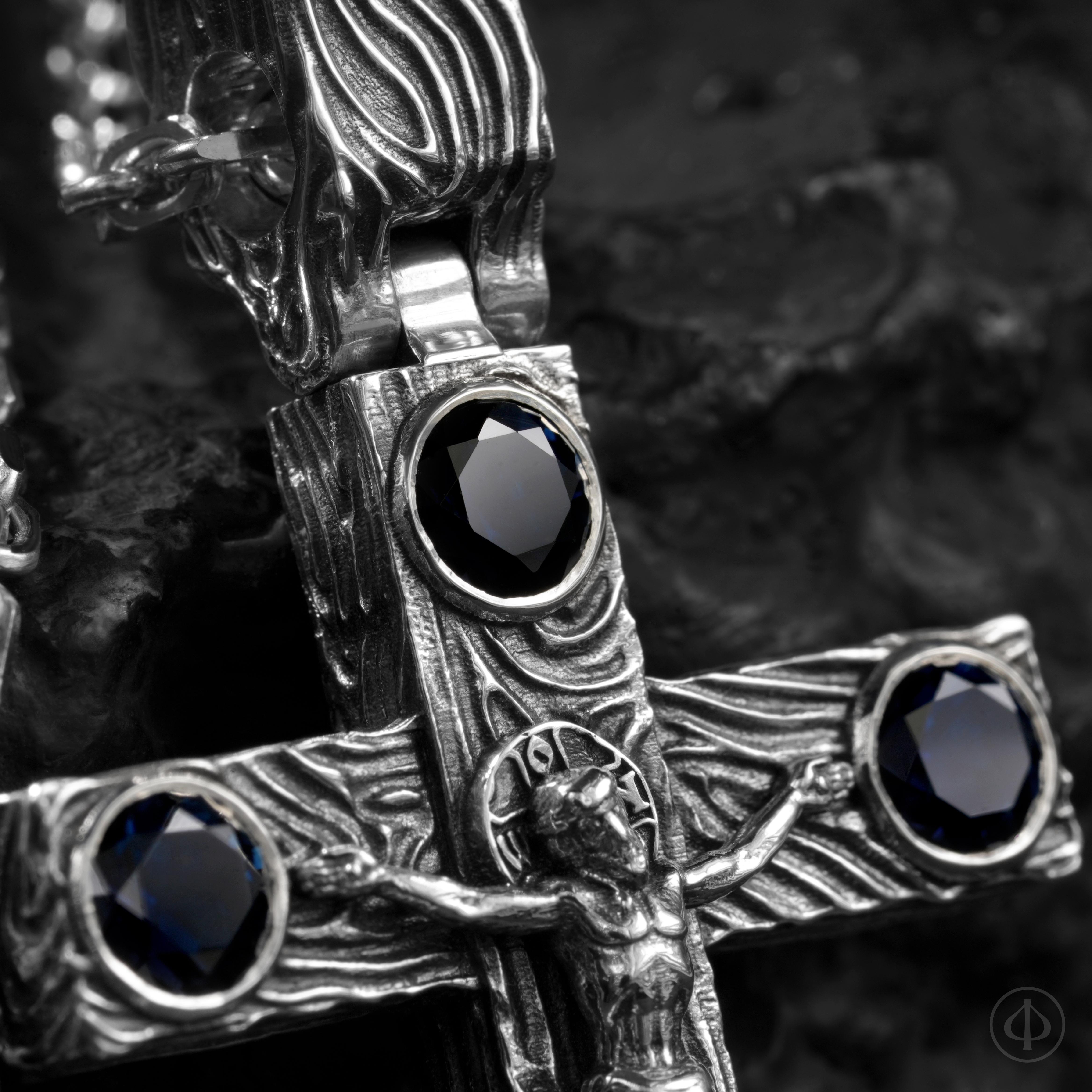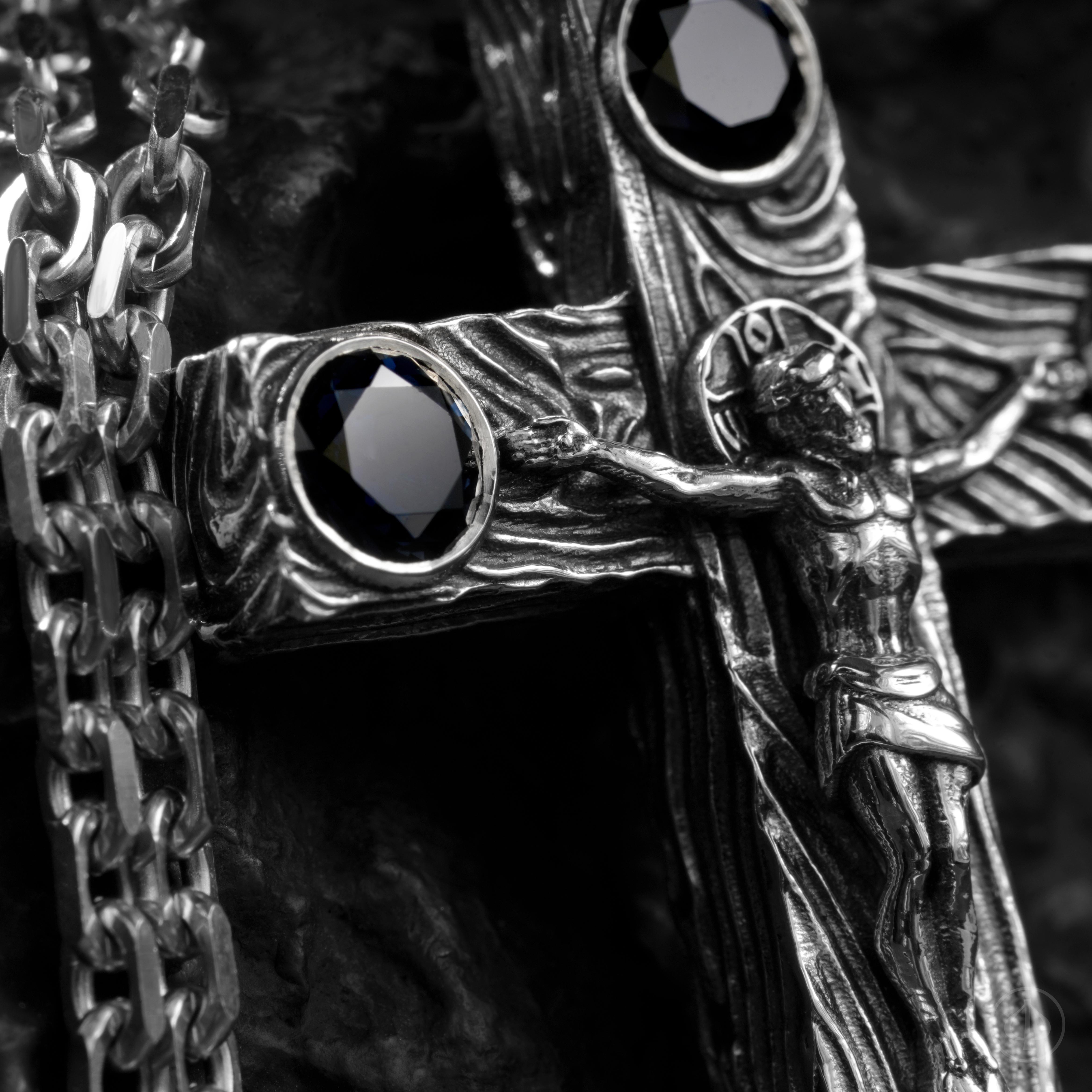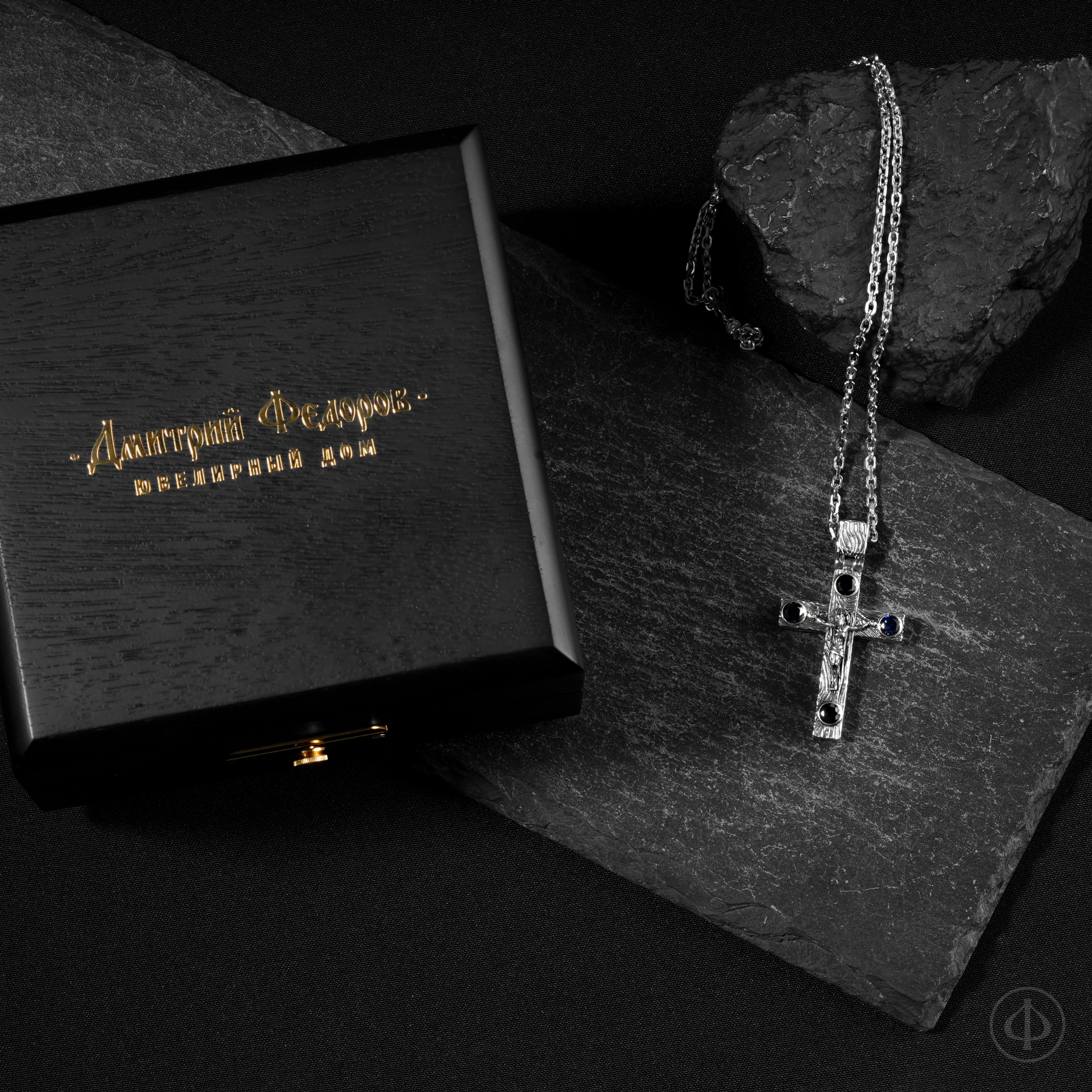 - по сторонам креста и в верхней части ушка сапфиры,