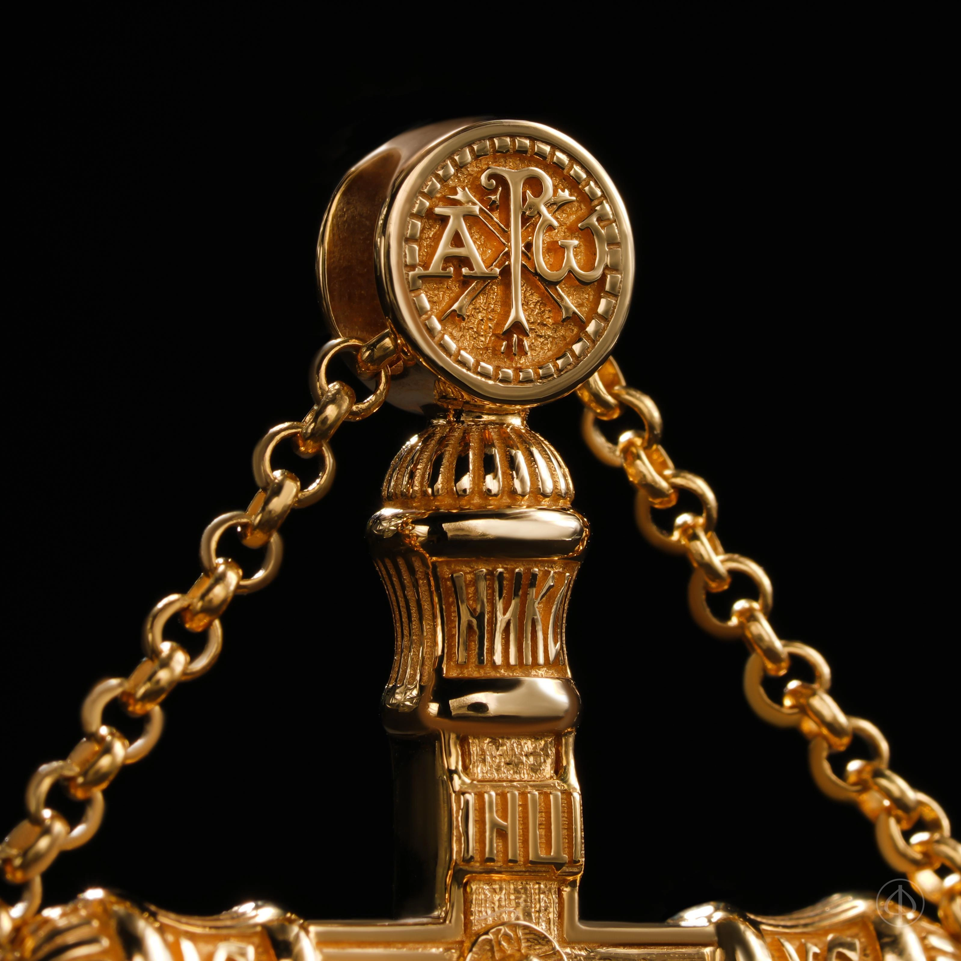 В центре расположен восьмиконечный крест с Распятием, вокруг которого размещены традиционные христианские надписи и символы, формирующие цельную духовную композицию. На ушке — Хризма, древняя монограмма имени Христа, подчёркивающая связь образа с ранней христианской традицией.