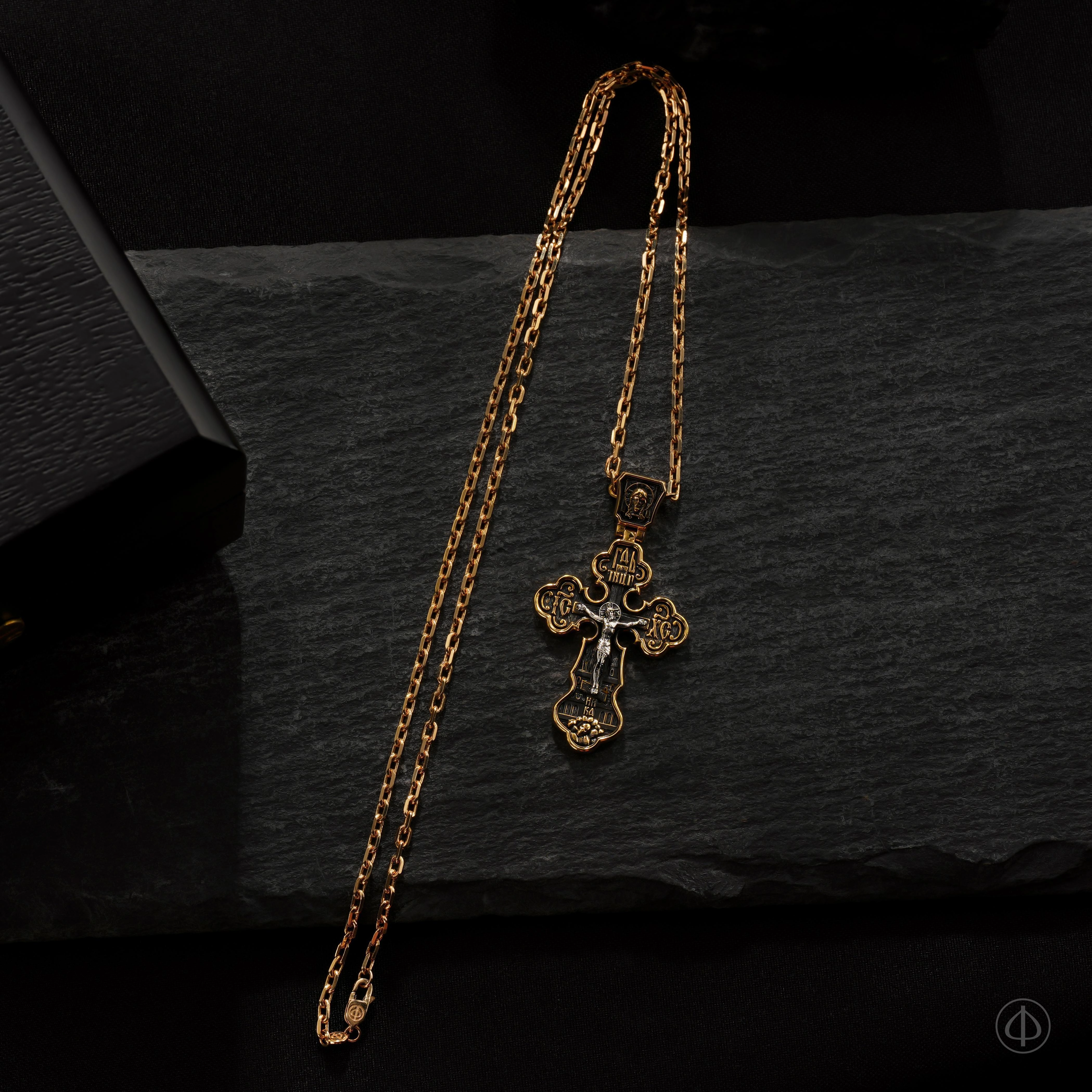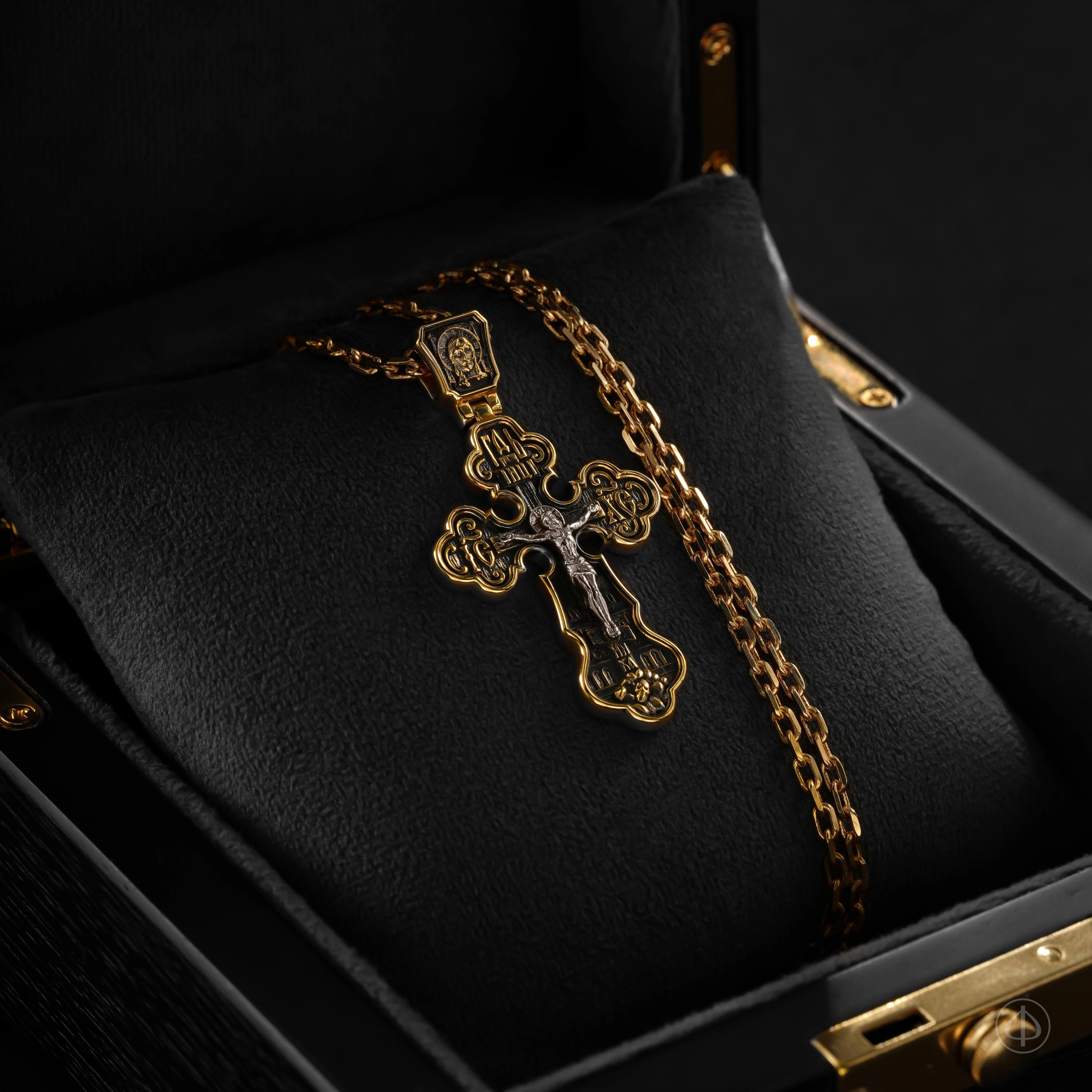 - В центре классический восьмиконечный крест с Распятием.