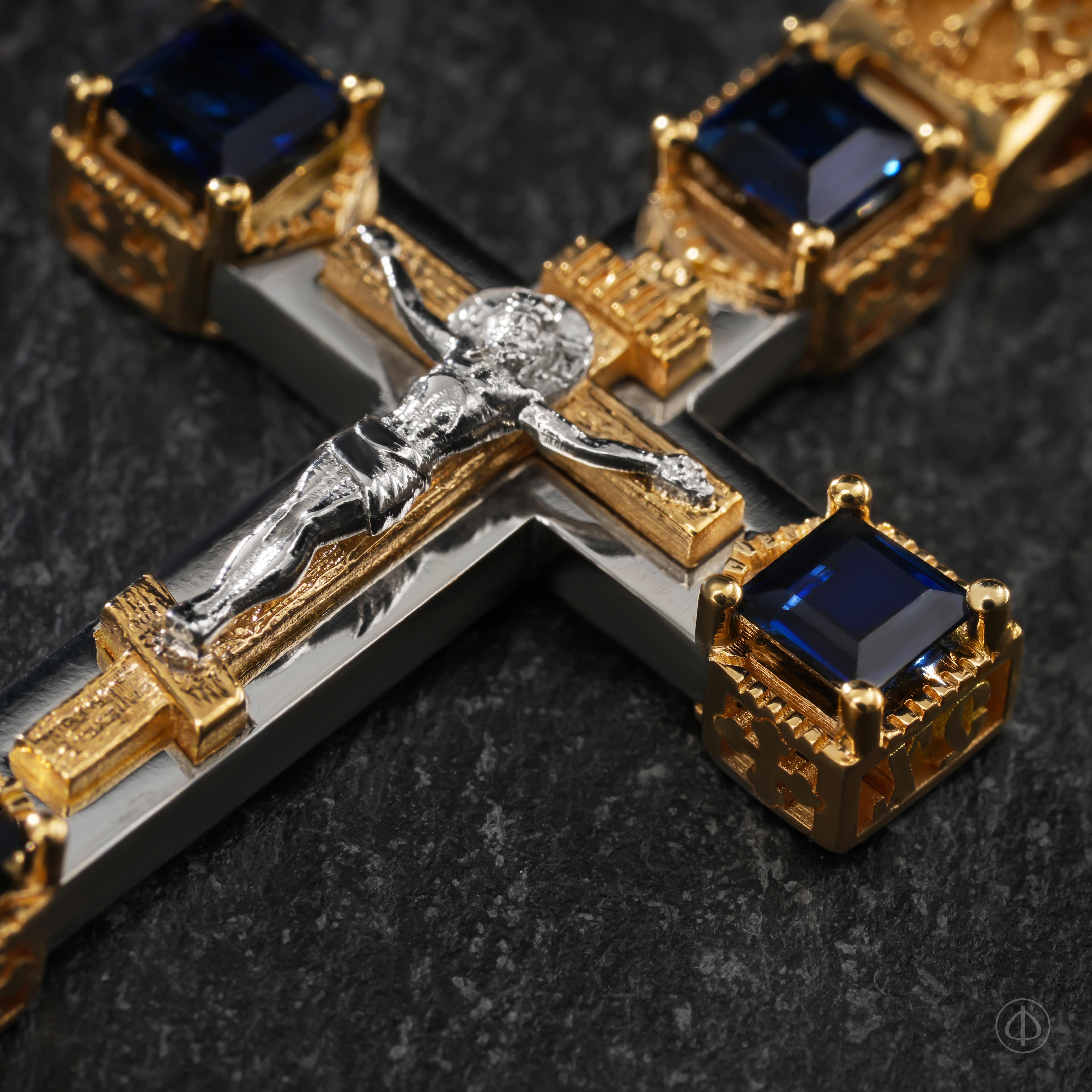 - в центре классический восьмиконечный крест с Распятием.