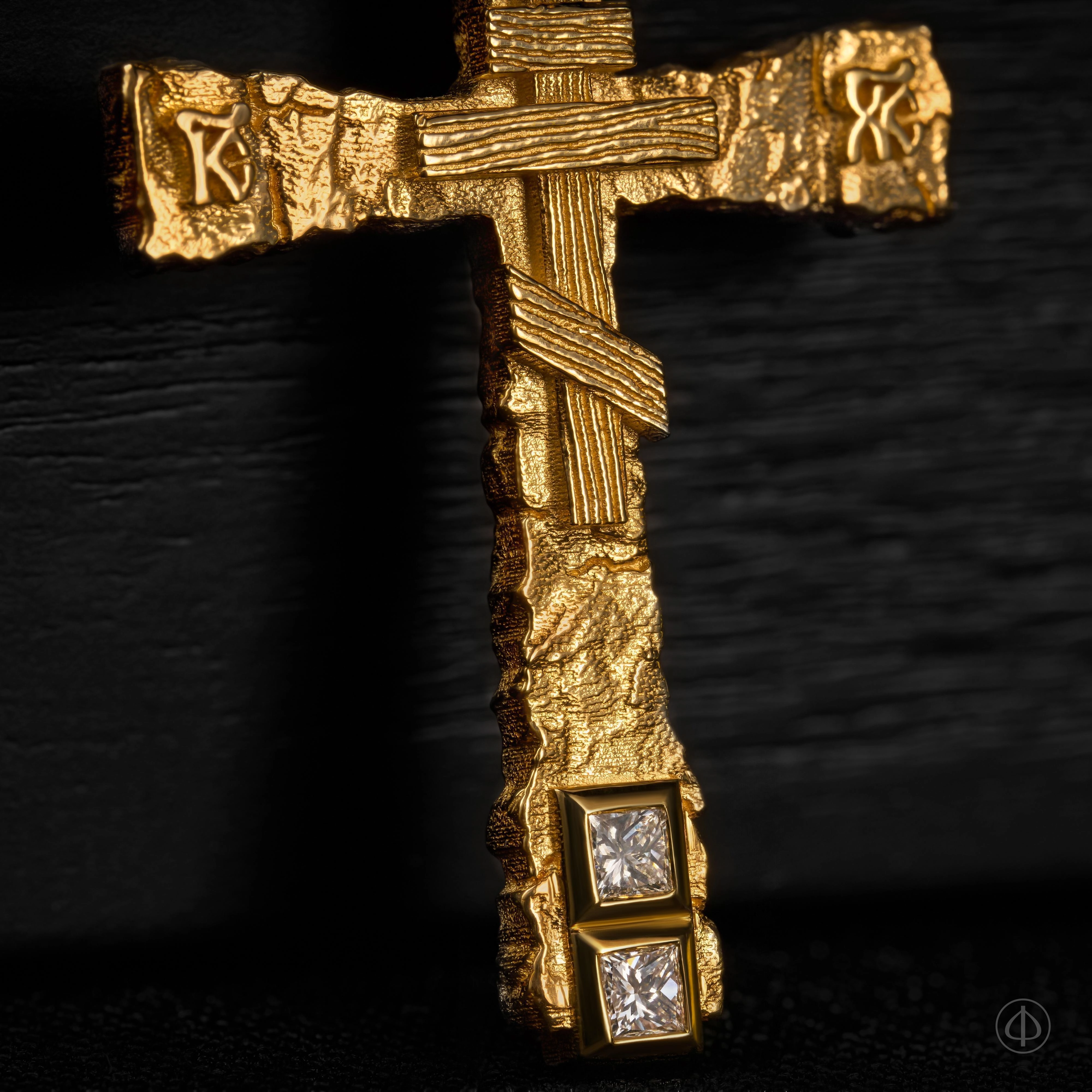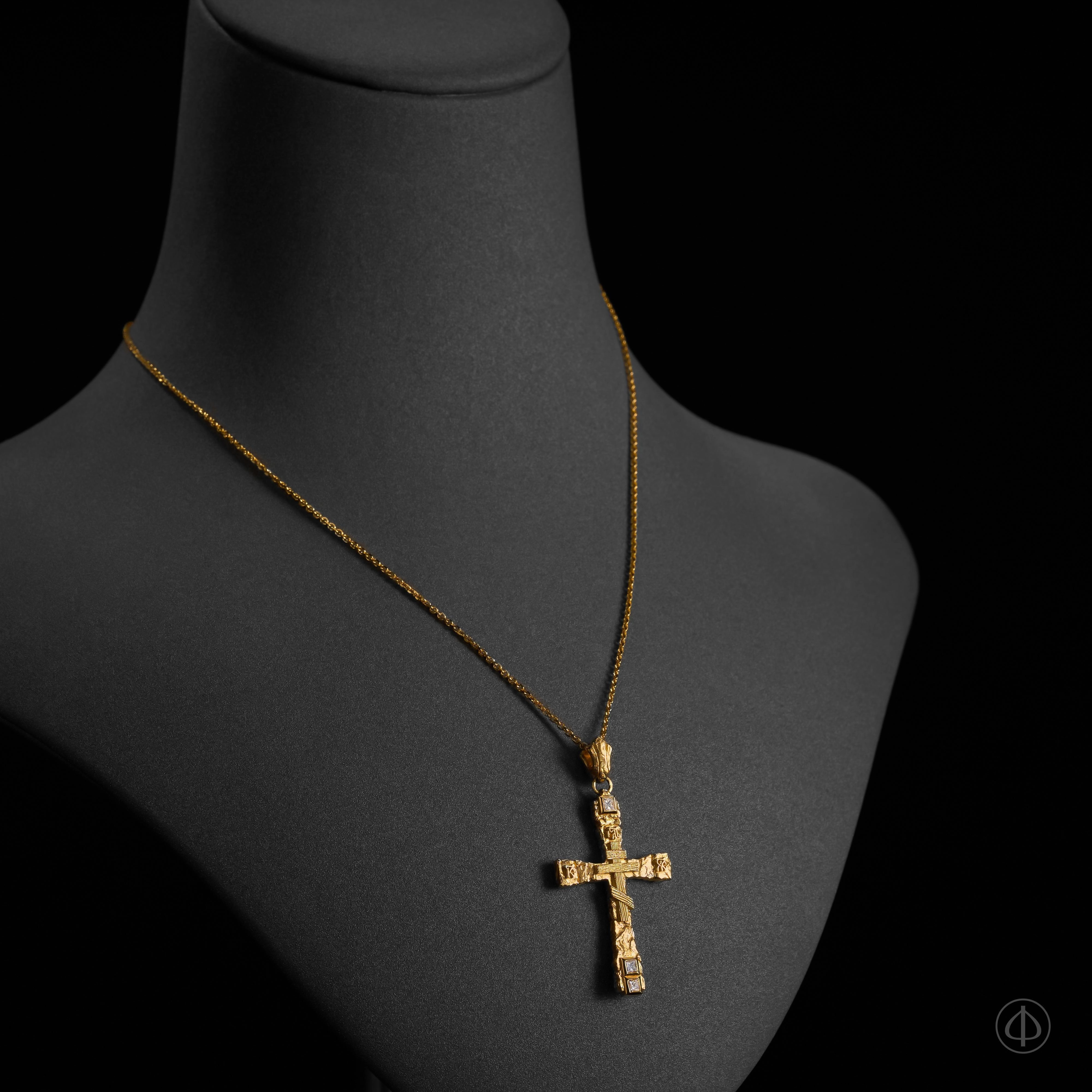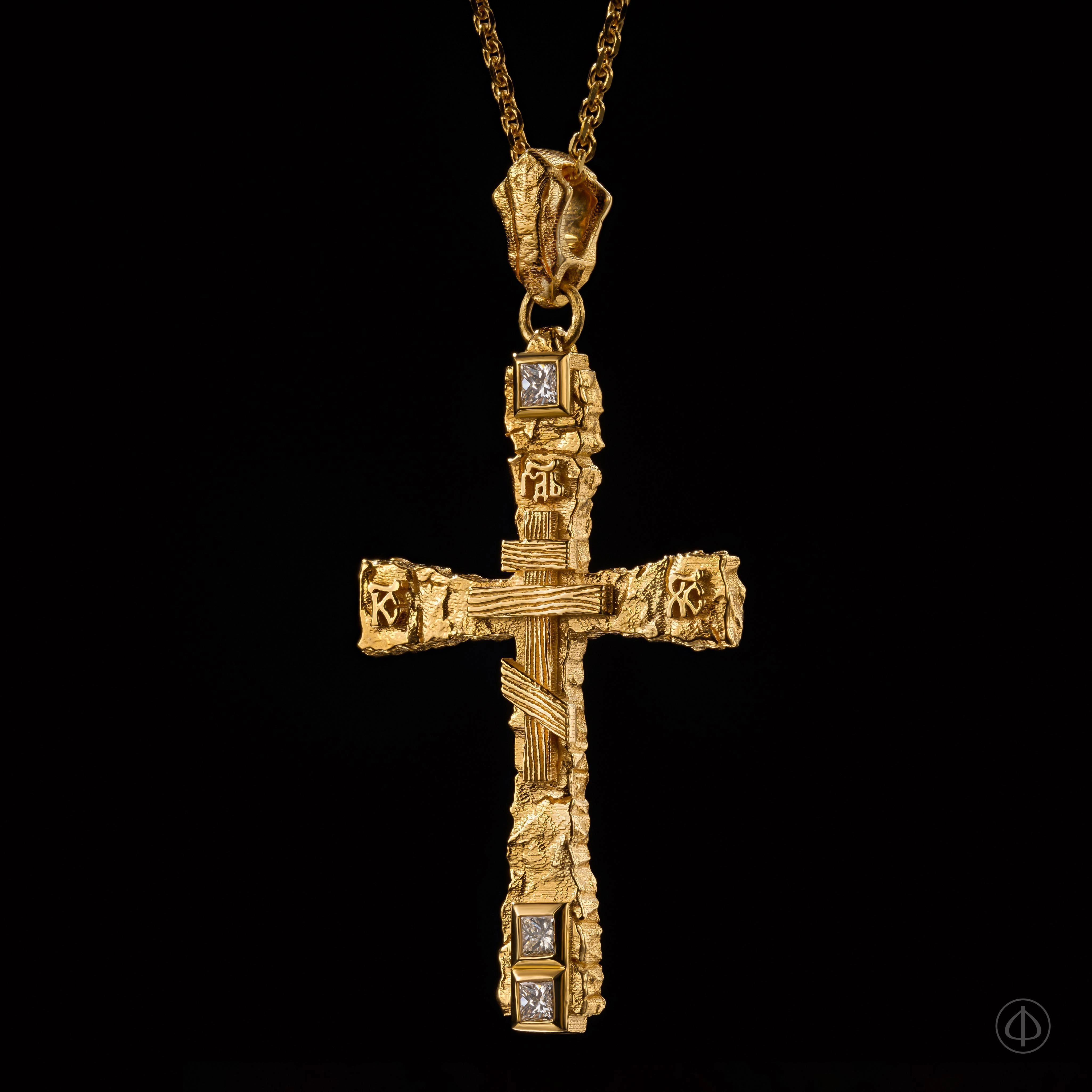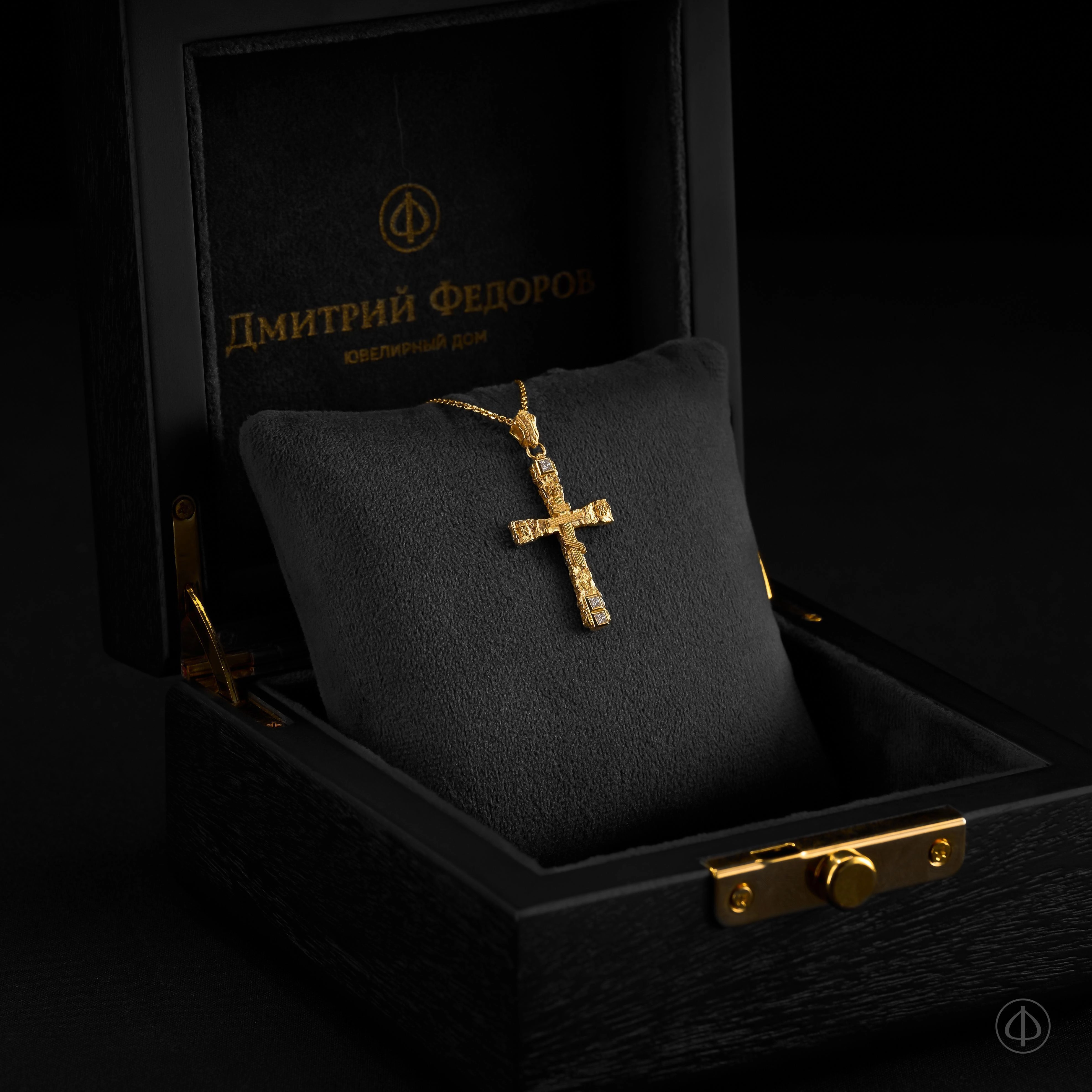 Крест из золота 750 пробы, украшенный бриллиантами — это цельный художественный образ, в котором драгоценный металл и сияние камня соединяются в благородной и глубокой композиции.
