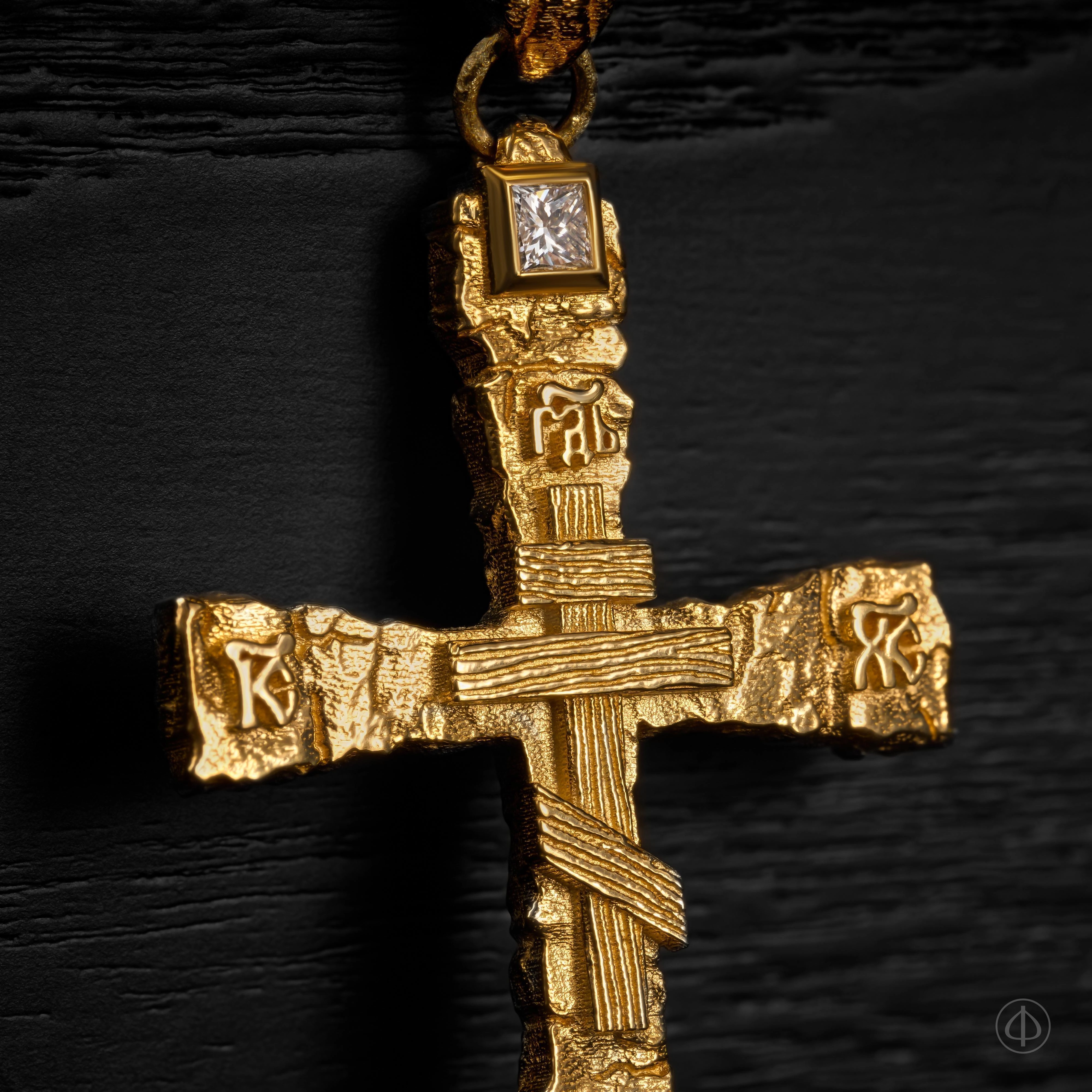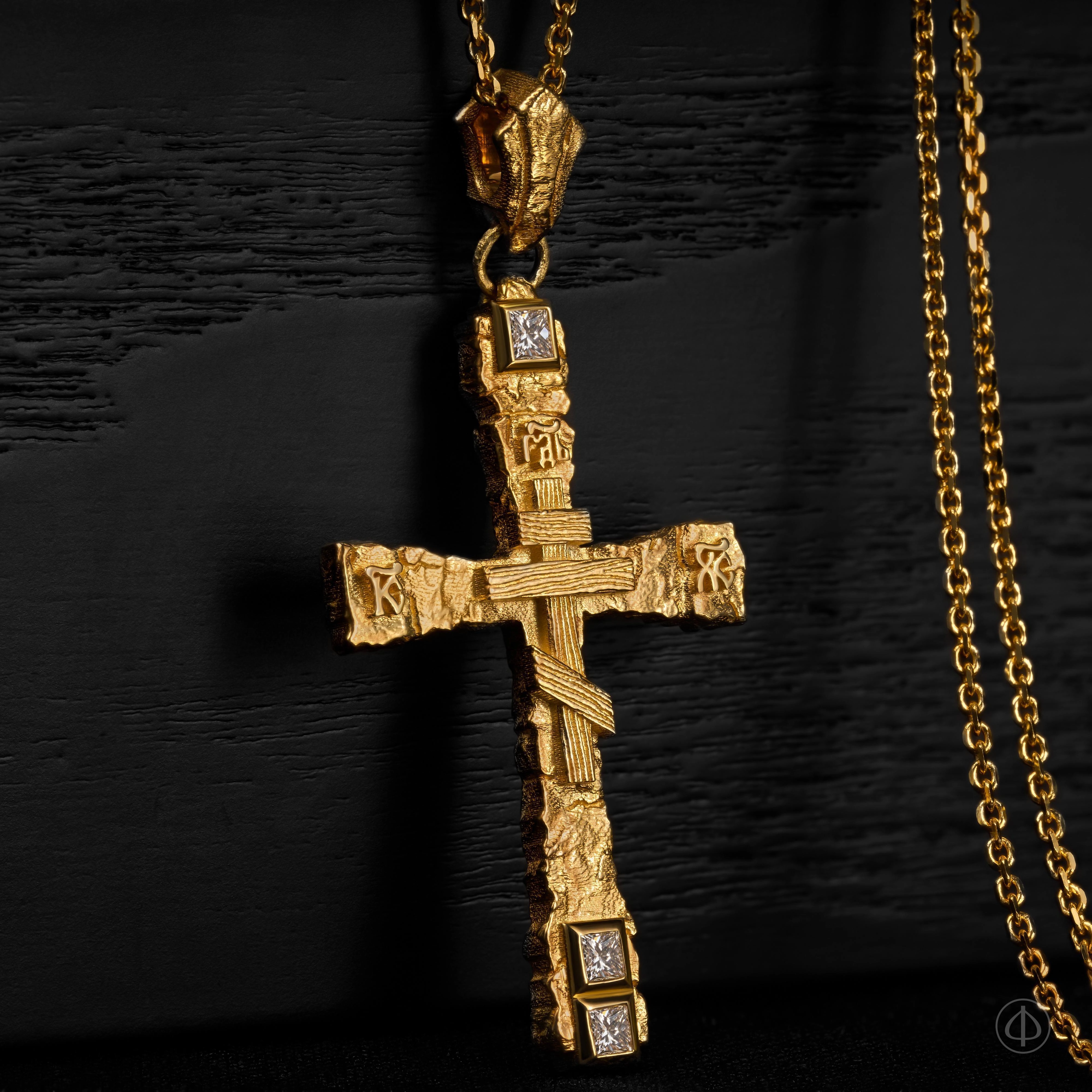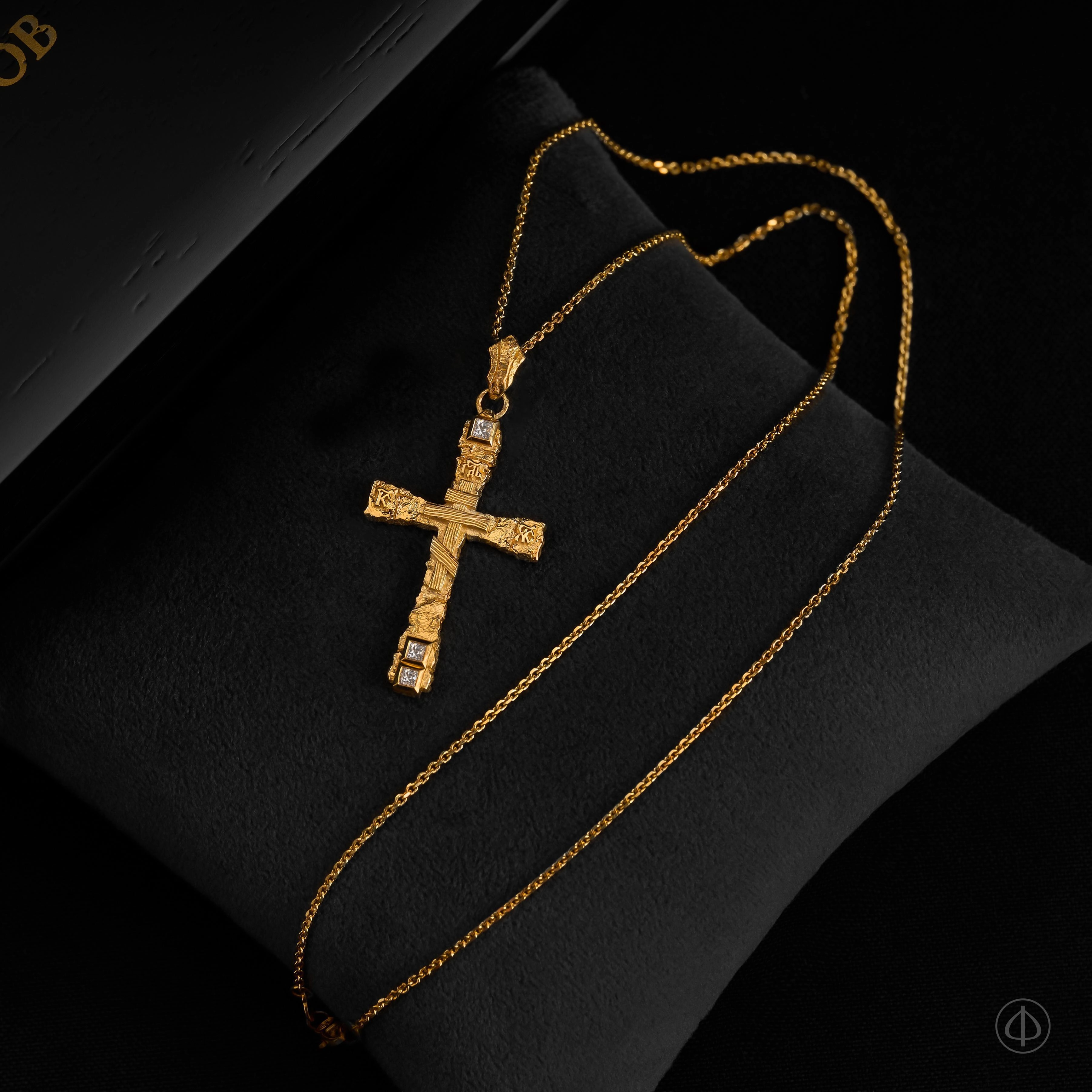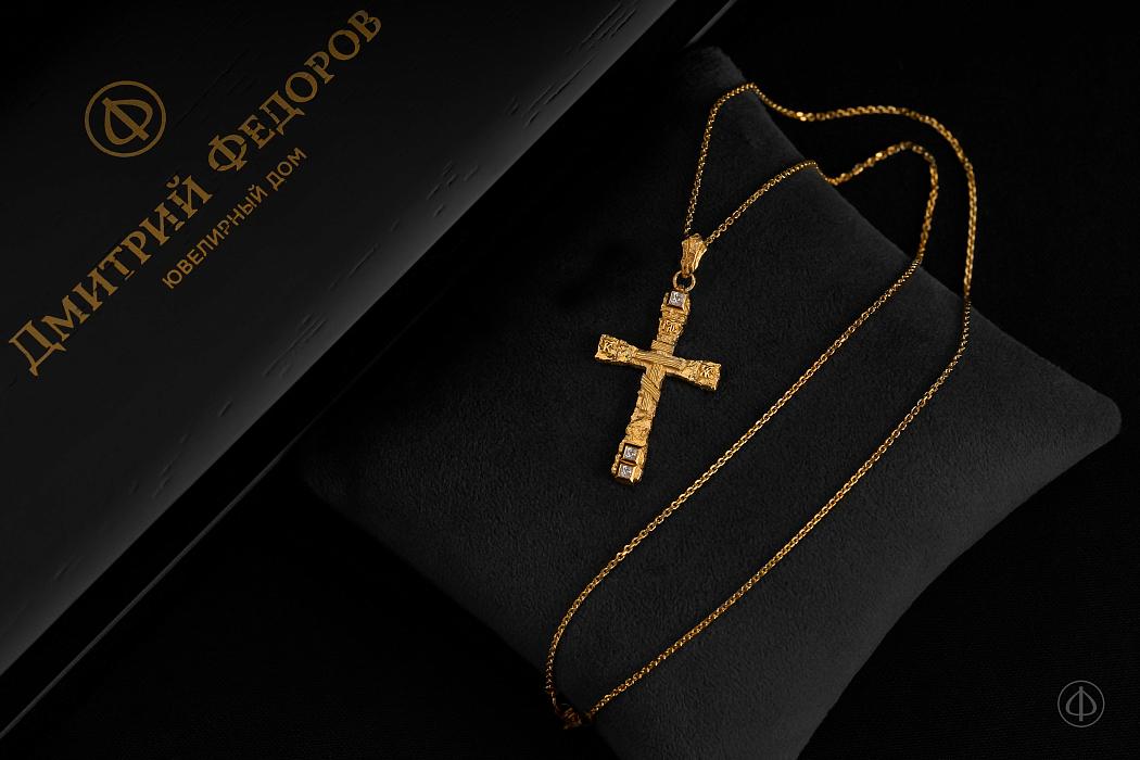 Крест из золота 750 пробы, украшенный бриллиантами — это цельный художественный образ, в котором драгоценный металл и сияние камня соединяются в благородной и глубокой композиции.