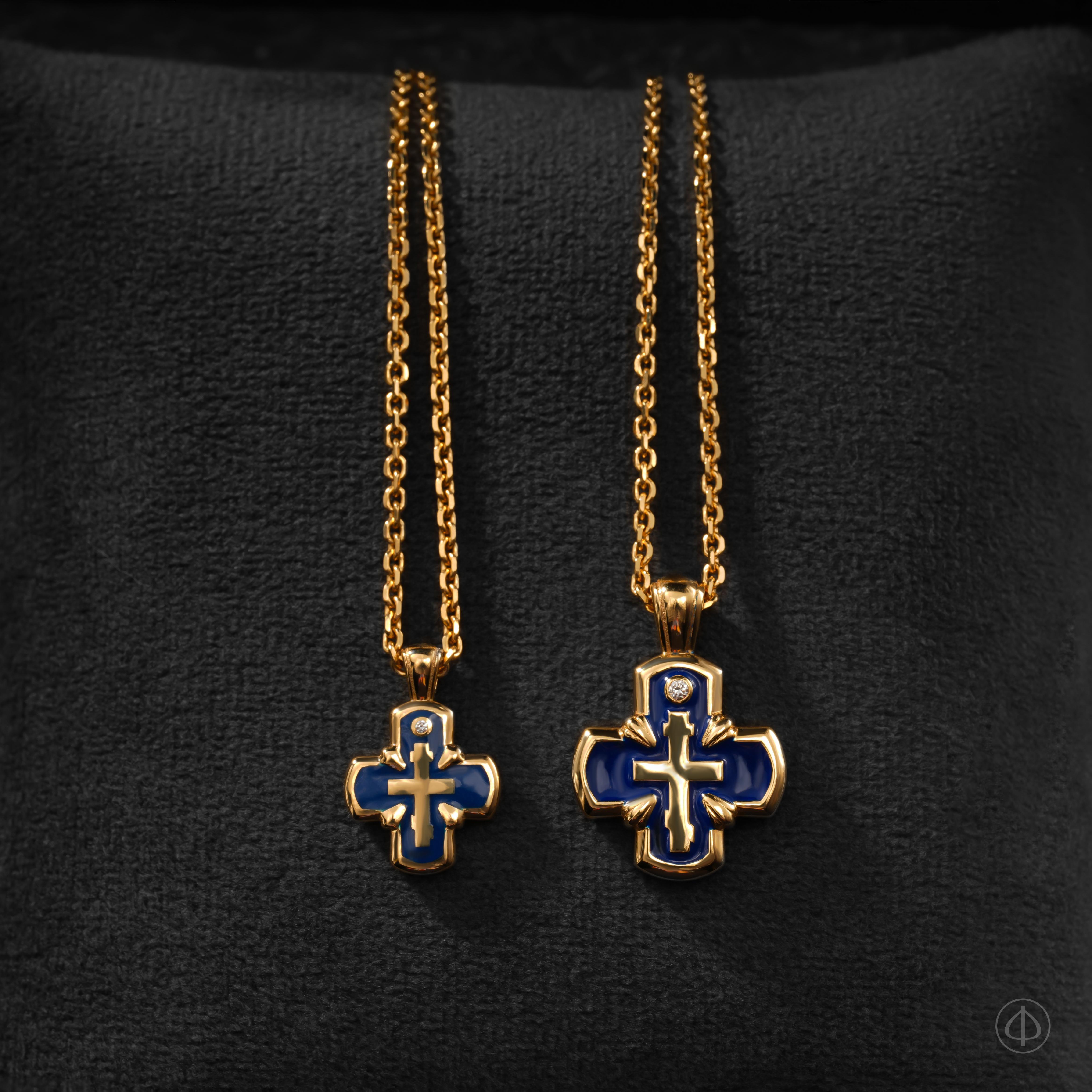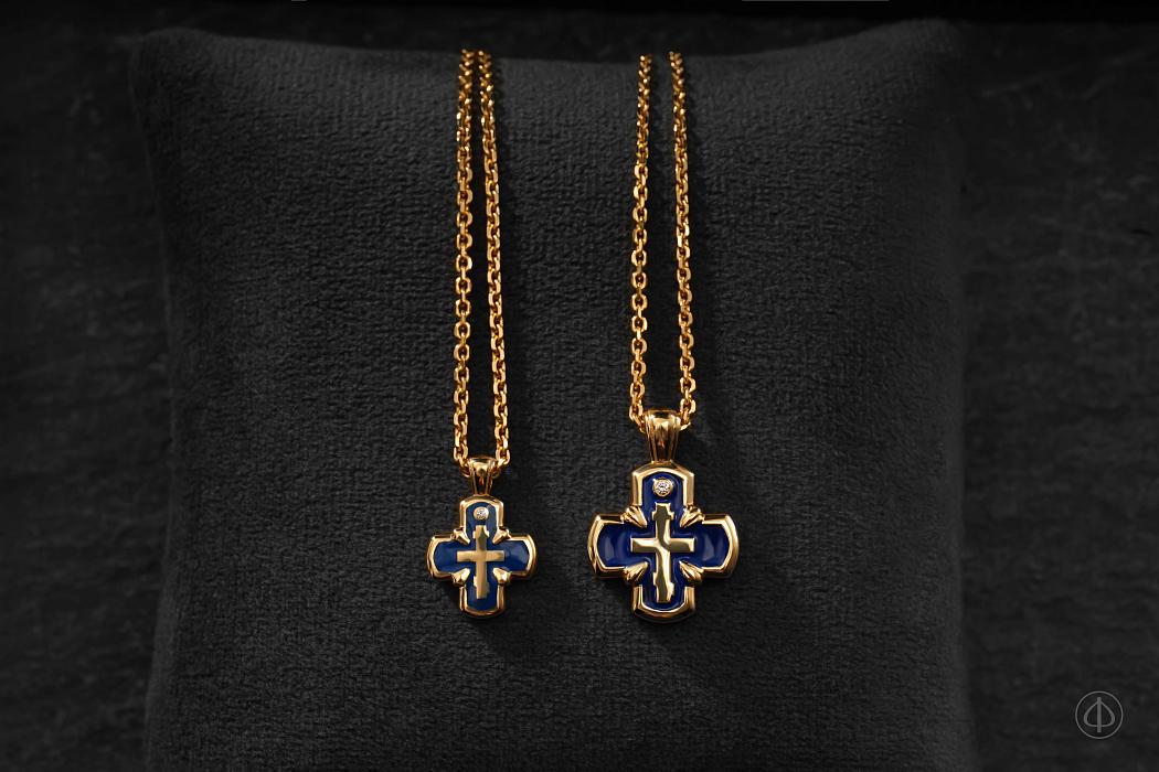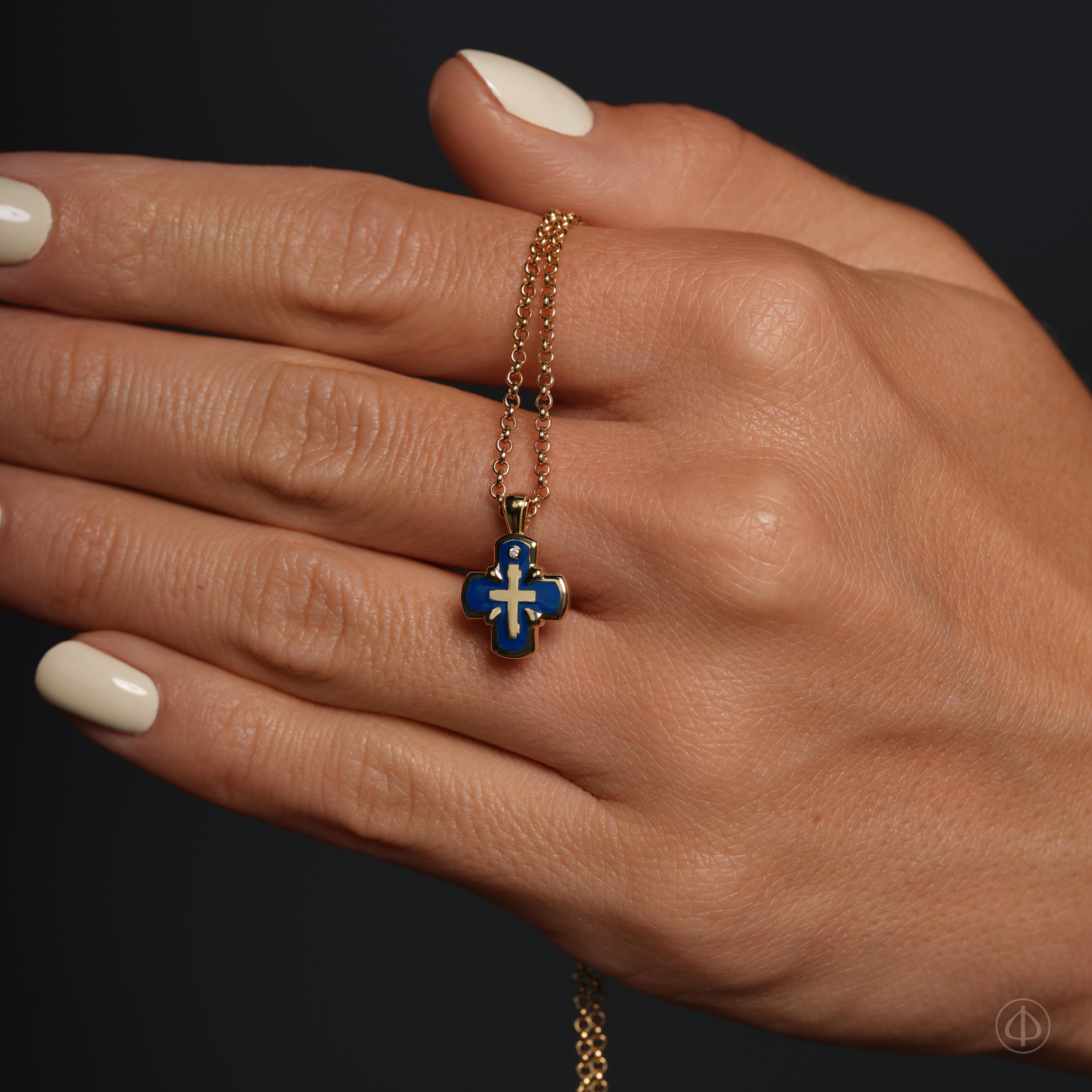 Крест с эмалью ручной работы – уникальное сочетание долговечности, эстетики и глубокой символики ювелирного изделия. Крестик представлен в желтом золоте и декорирован синей эмалью, олицетворяющей небесную чистоту Девы Марии и красоту неба.