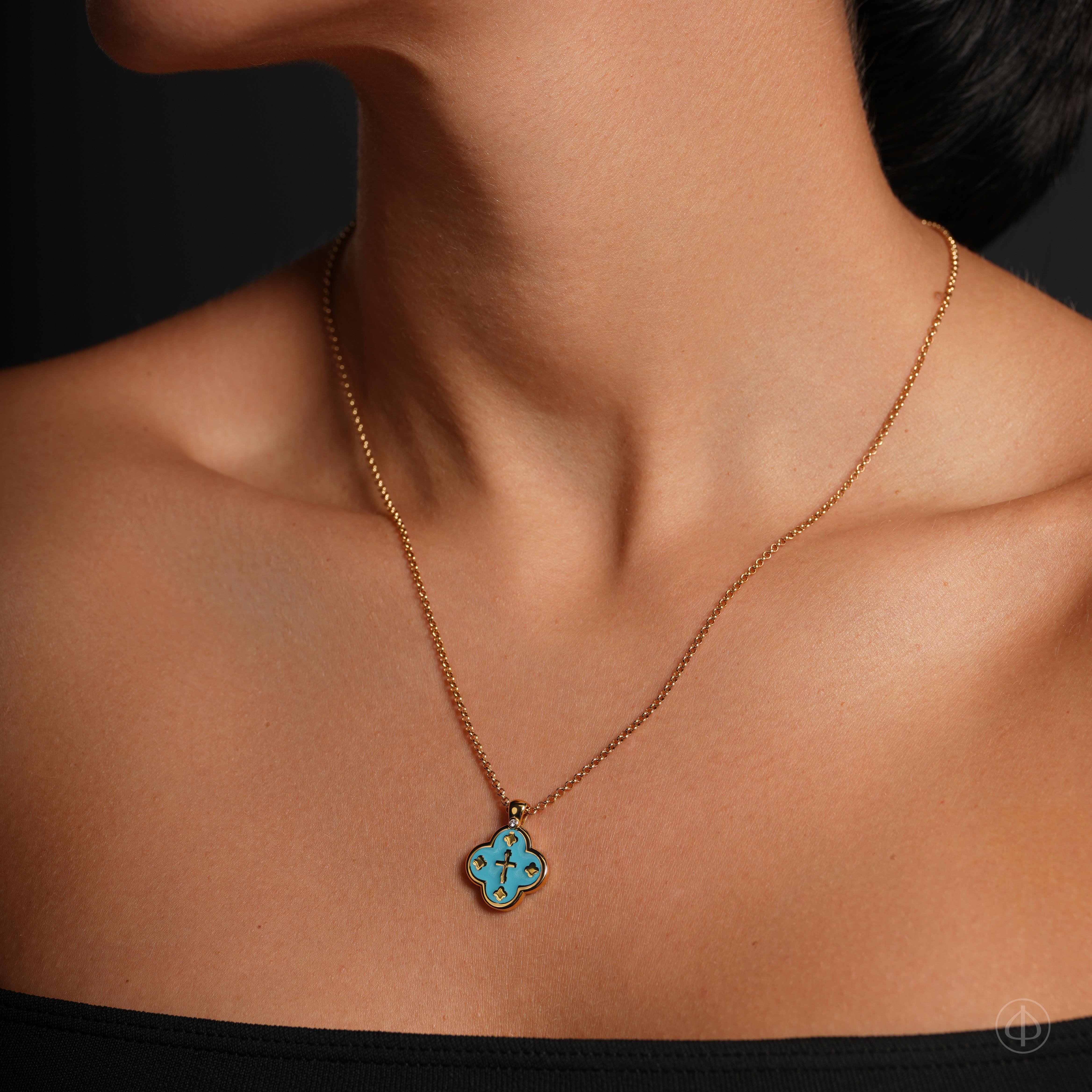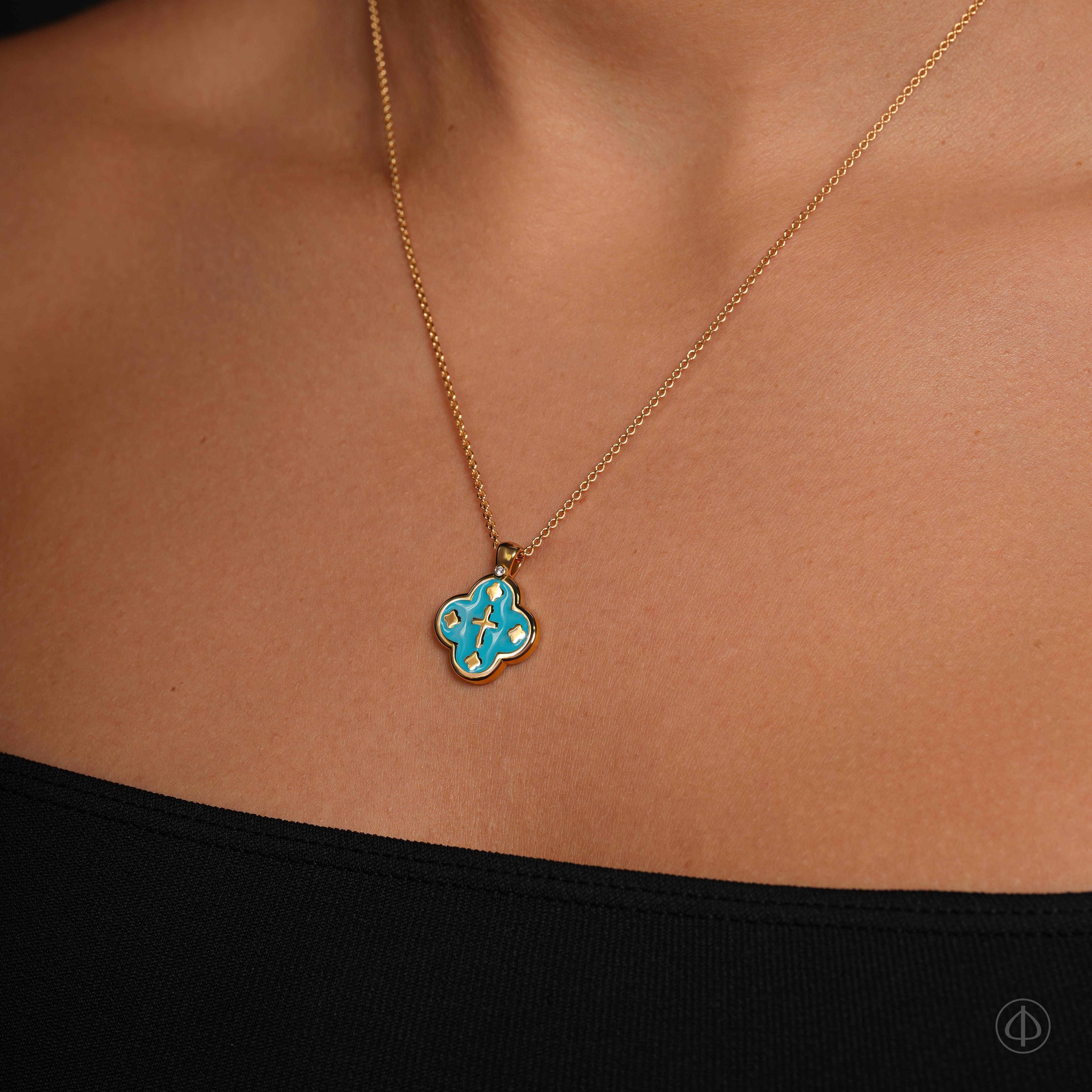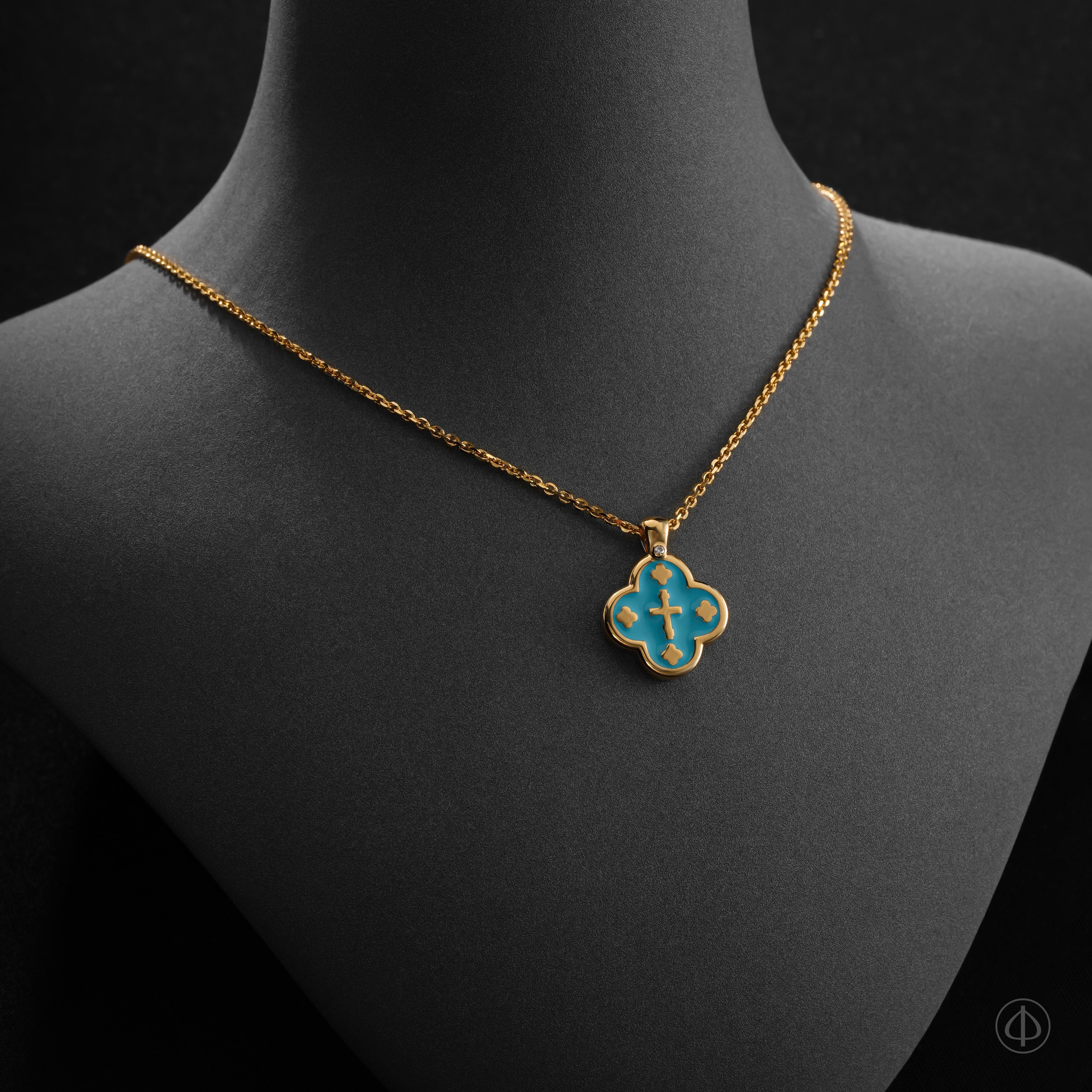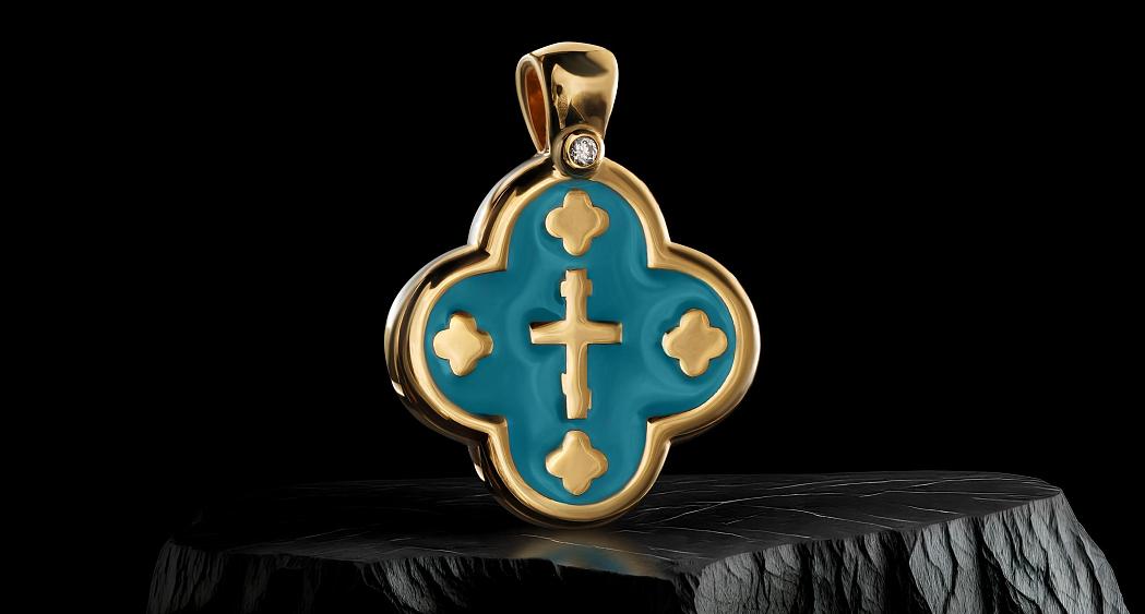 Крест с эмалью ручной работы – символ веры, надежды и духовной связи с Господом. Эмалевое покрытие представлено в оригинальном бирюзовом оттенке, олицетворяющем Святой Дух, кротость и смирение Девы Марии. Все детали ювелирного изделия имеют глубокое духовное значение: