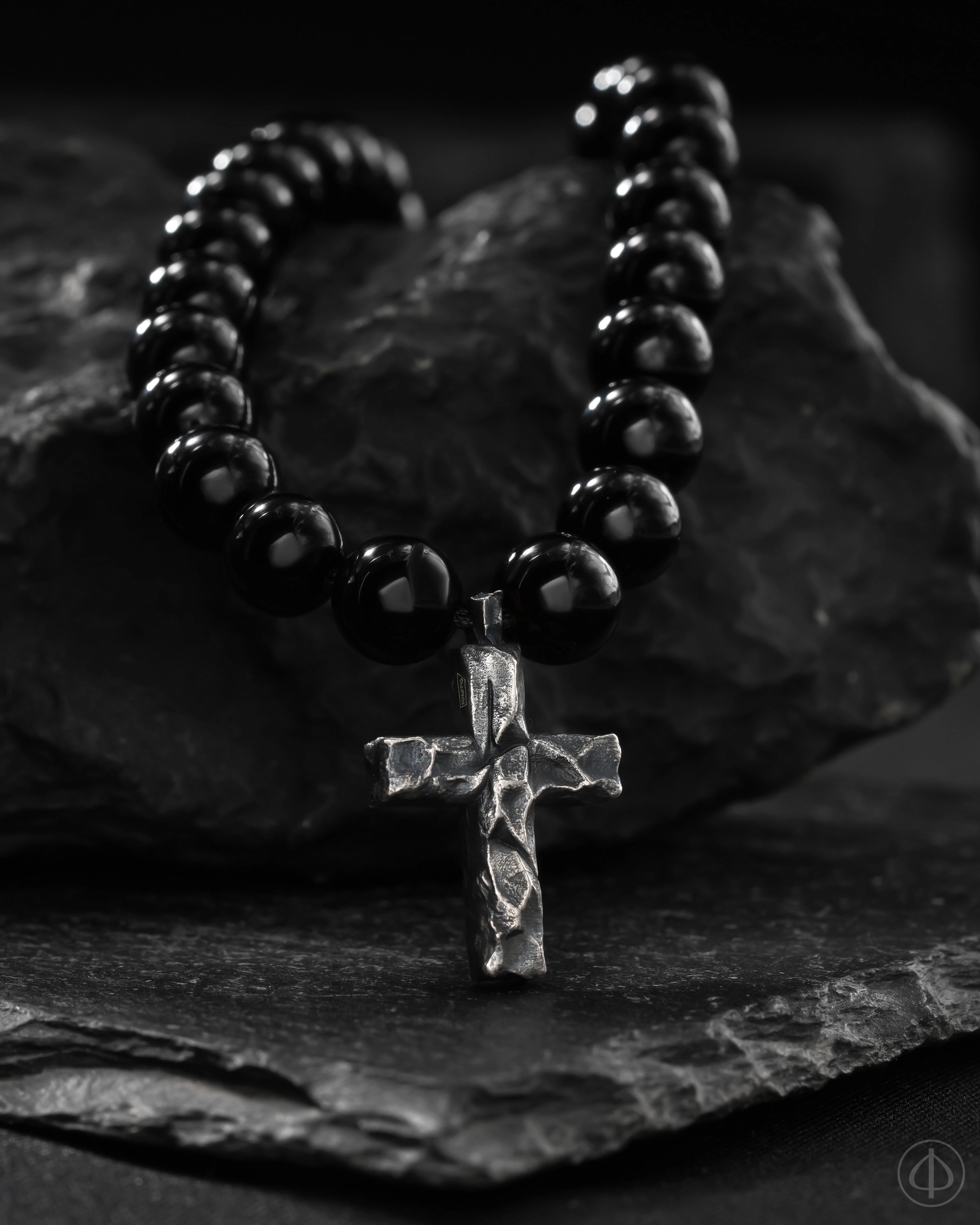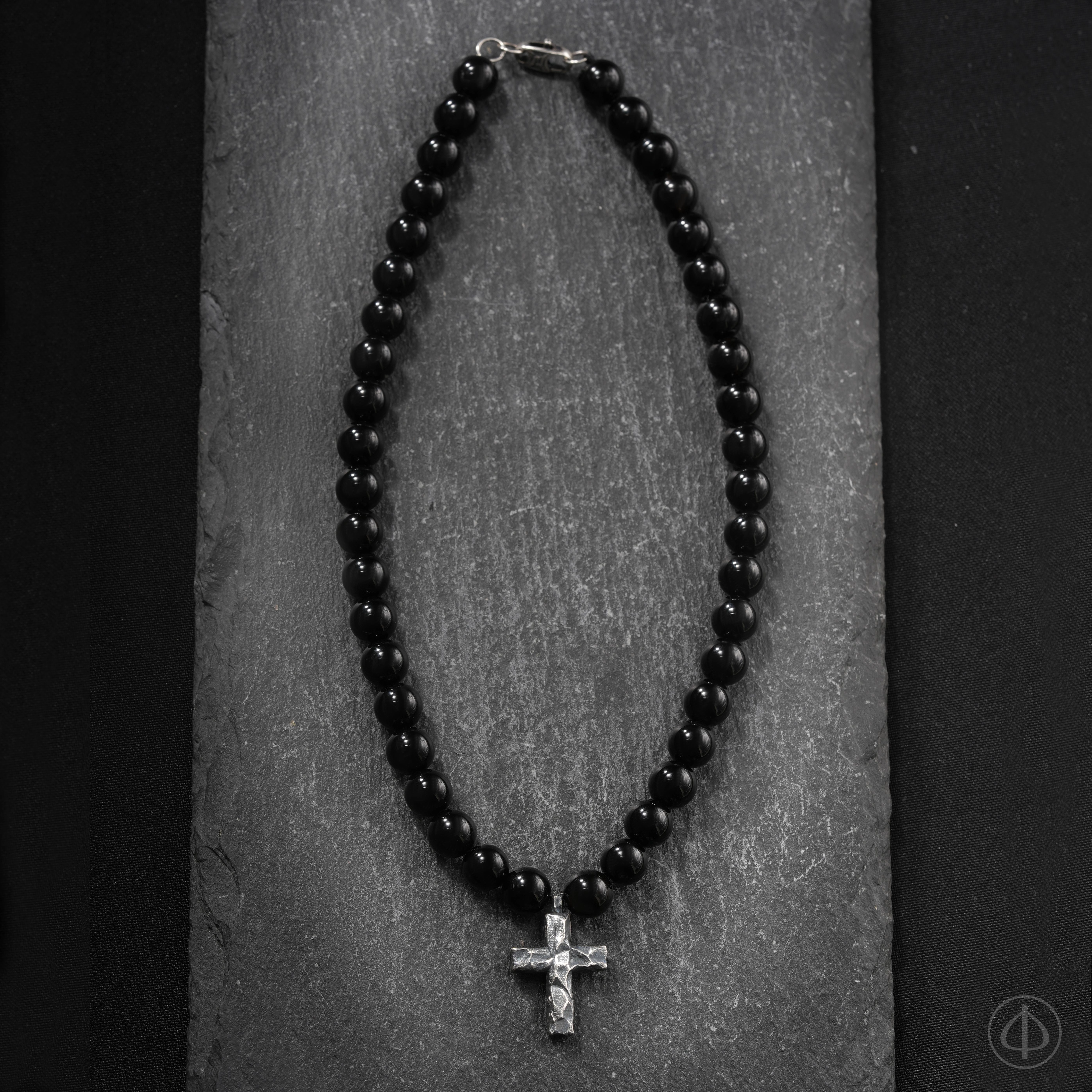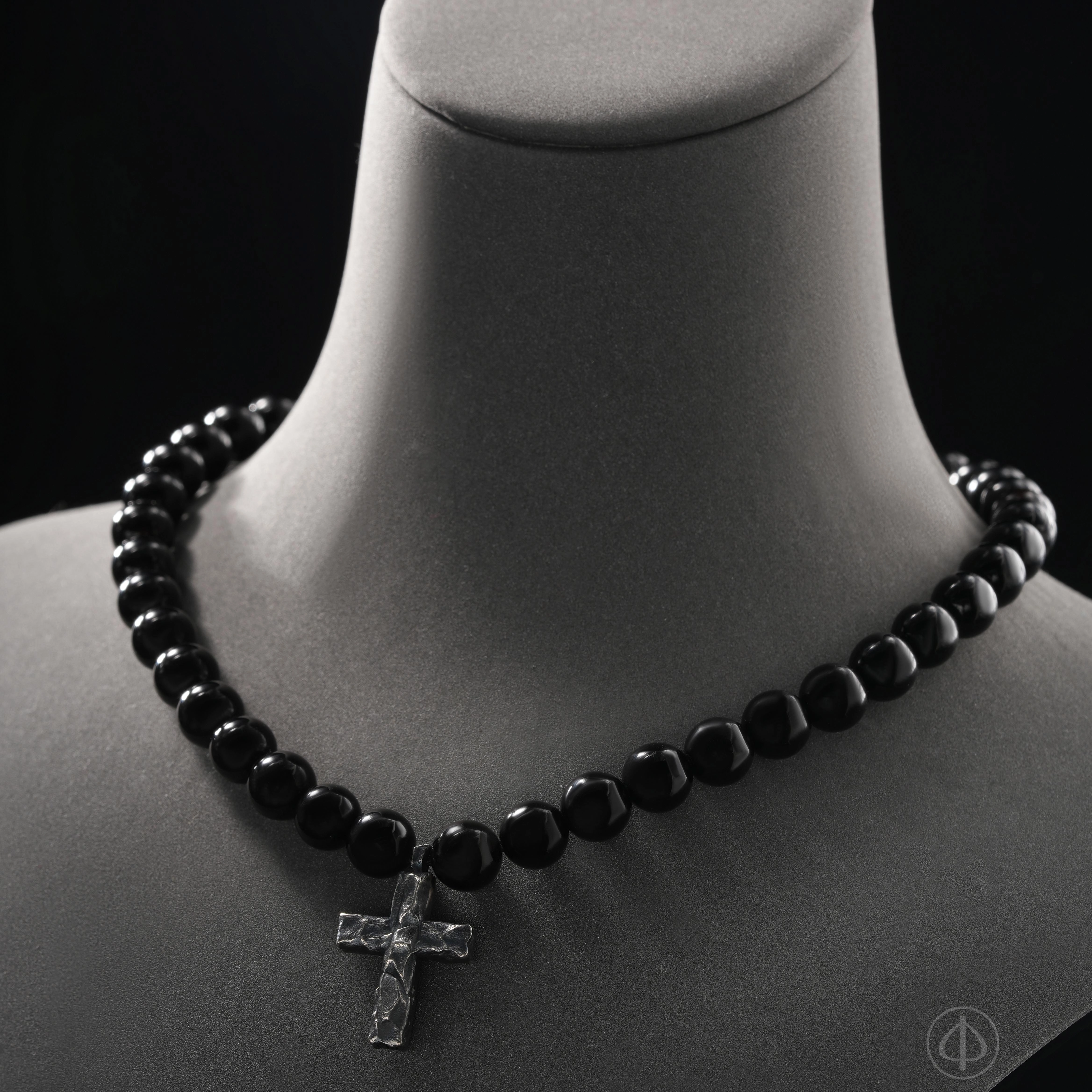 Колье из 42 черных бусин агата диаметром 8 мм с вставкой из серебра. Вставка исполнена в виде классического четырехконечного креста. По текстуре крест изображен в ломанной форме, имитирующей расплавленный металл.