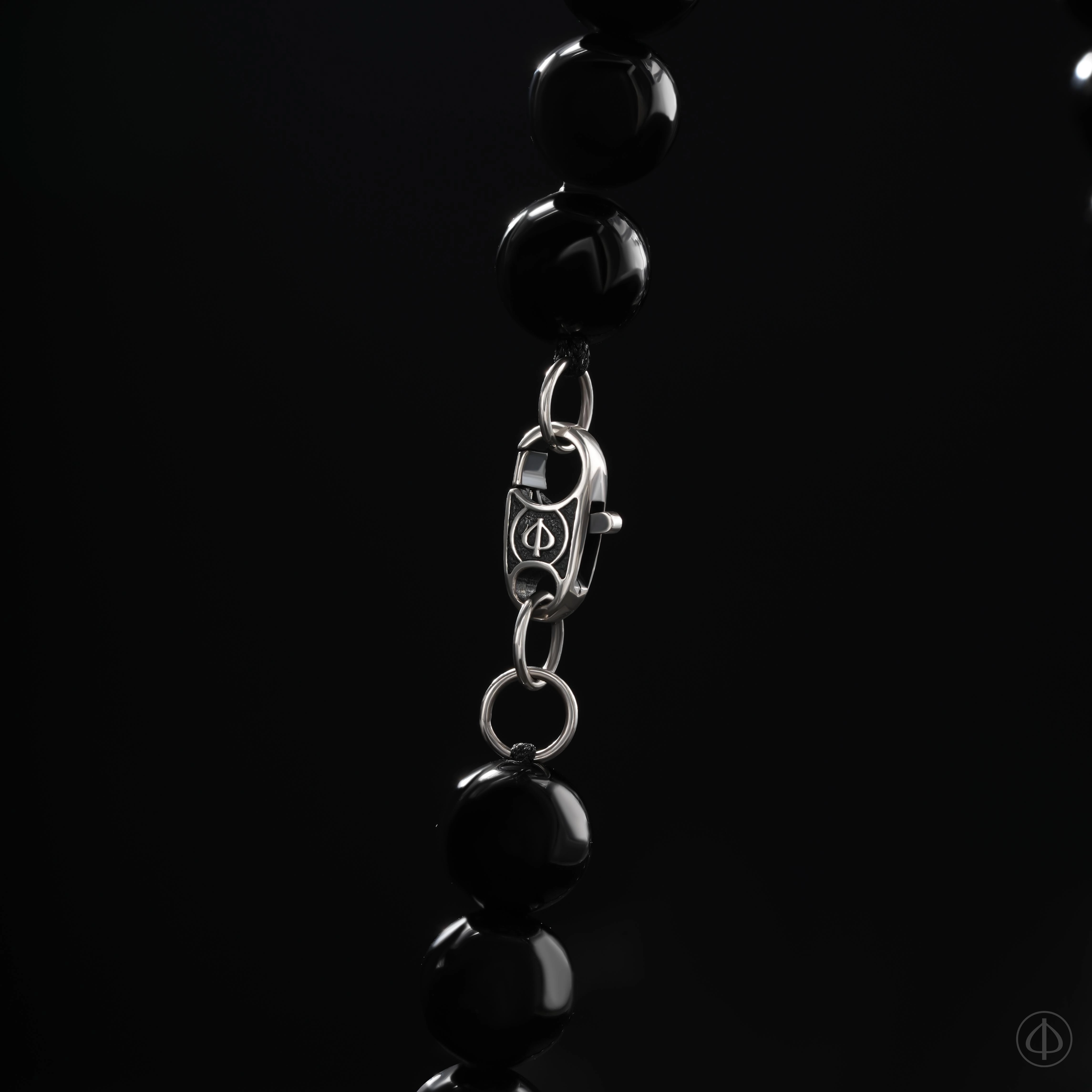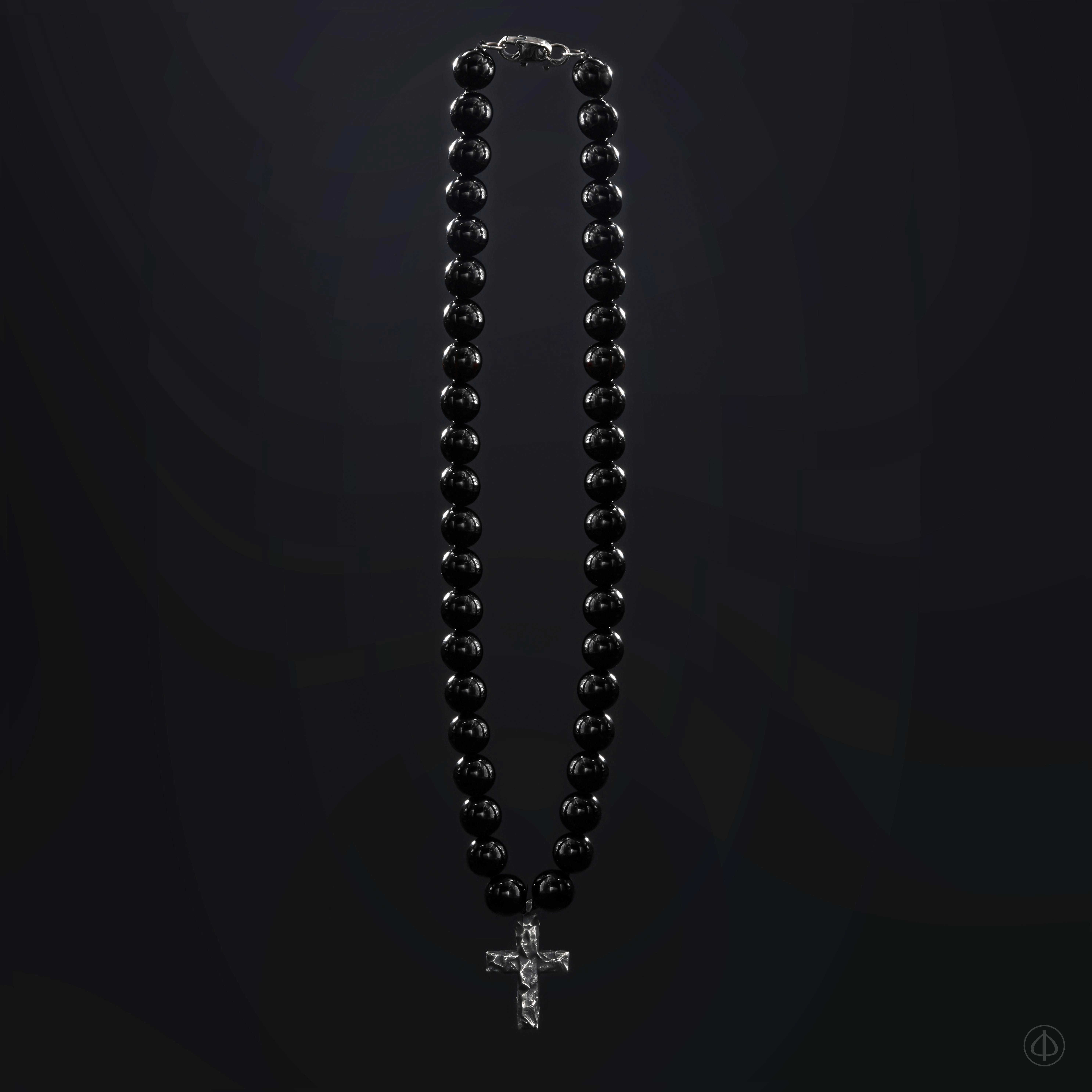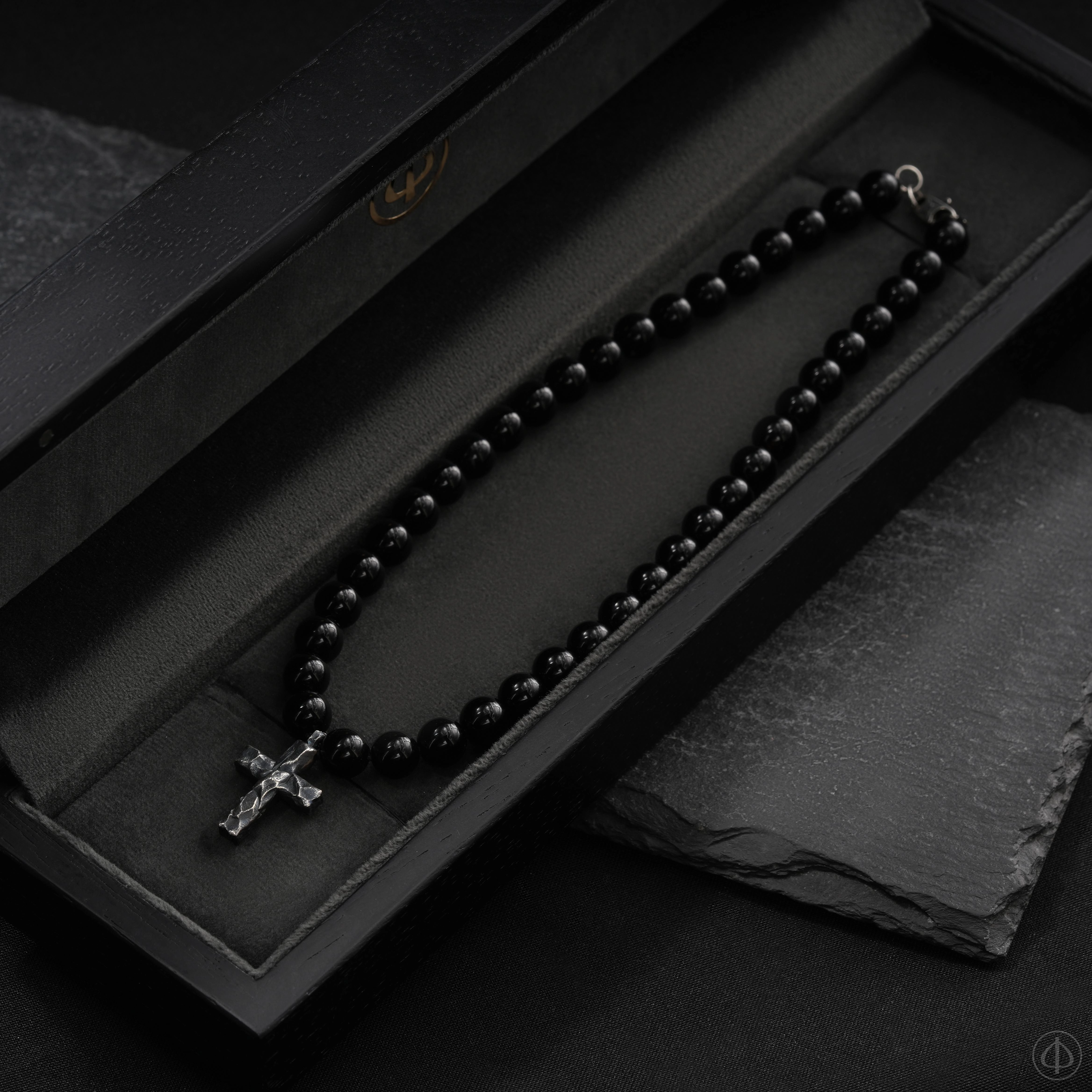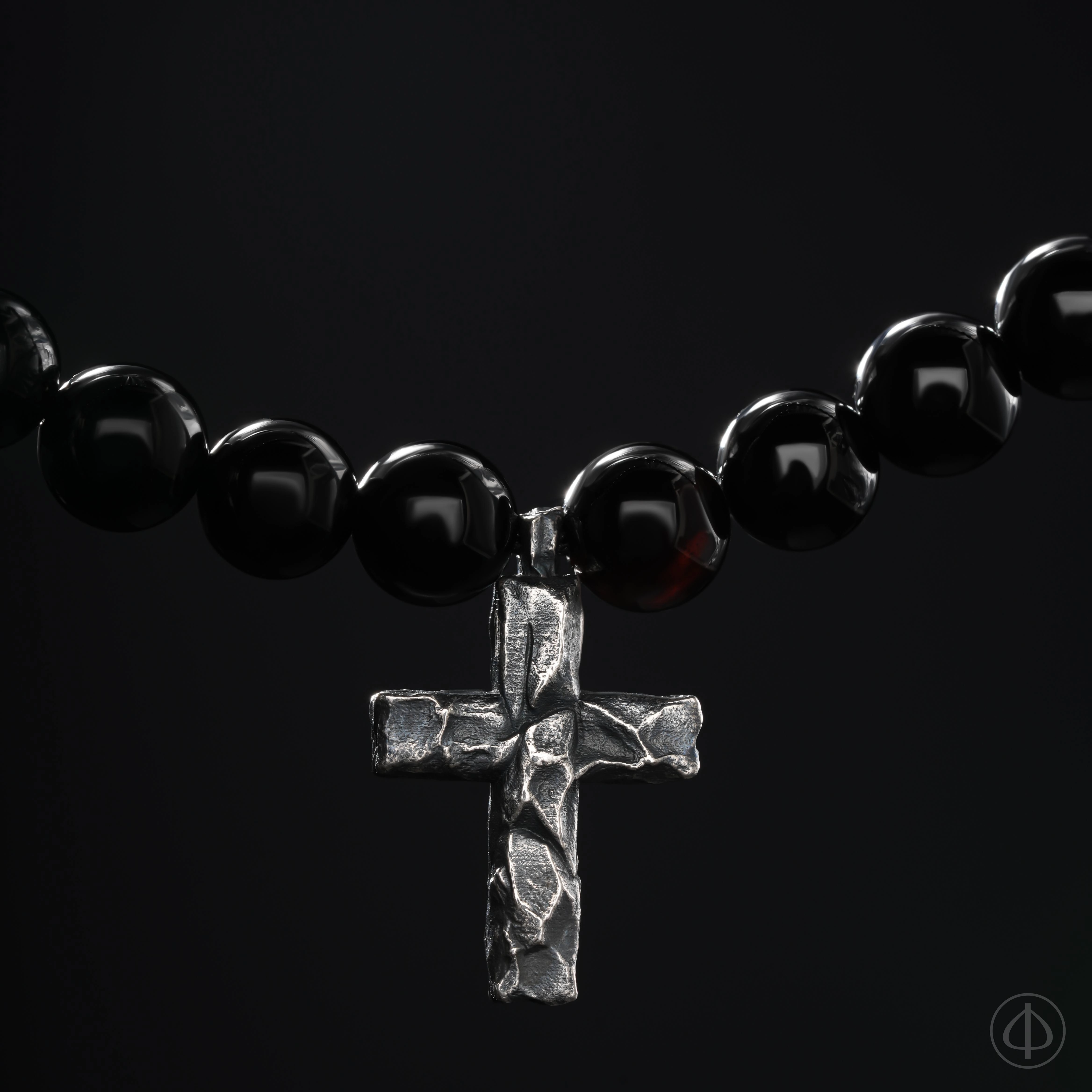 Колье из 42 черных бусин агата диаметром 8 мм с вставкой из серебра. Вставка исполнена в виде классического четырехконечного креста. По текстуре крест изображен в ломанной форме, имитирующей расплавленный металл.