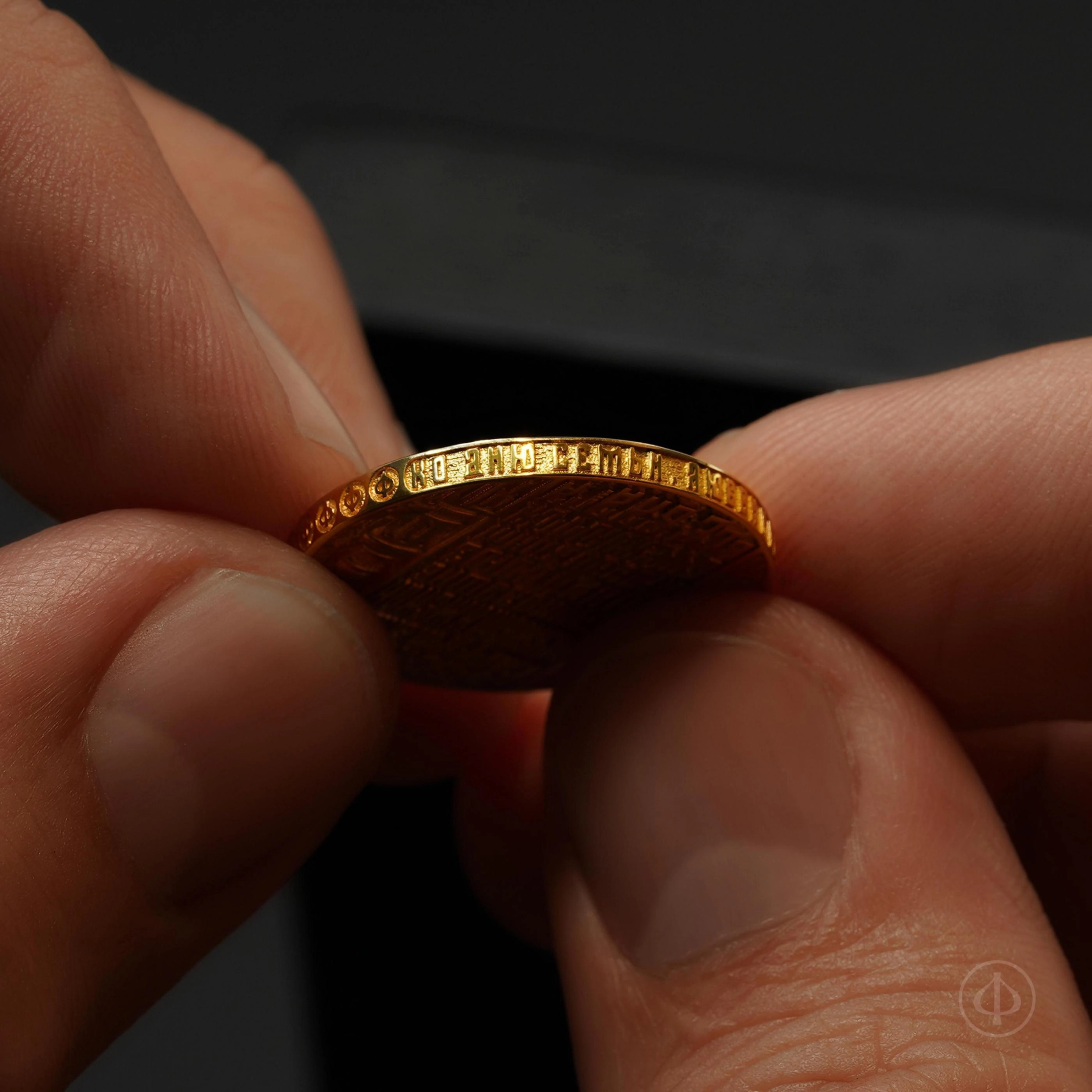 - По торцу монеты нанесена надпись “Ко дню семьи, любви и верности”, дата и год выпуска, а также логотип Ювелирного Дома “Дмитрий Федоров”