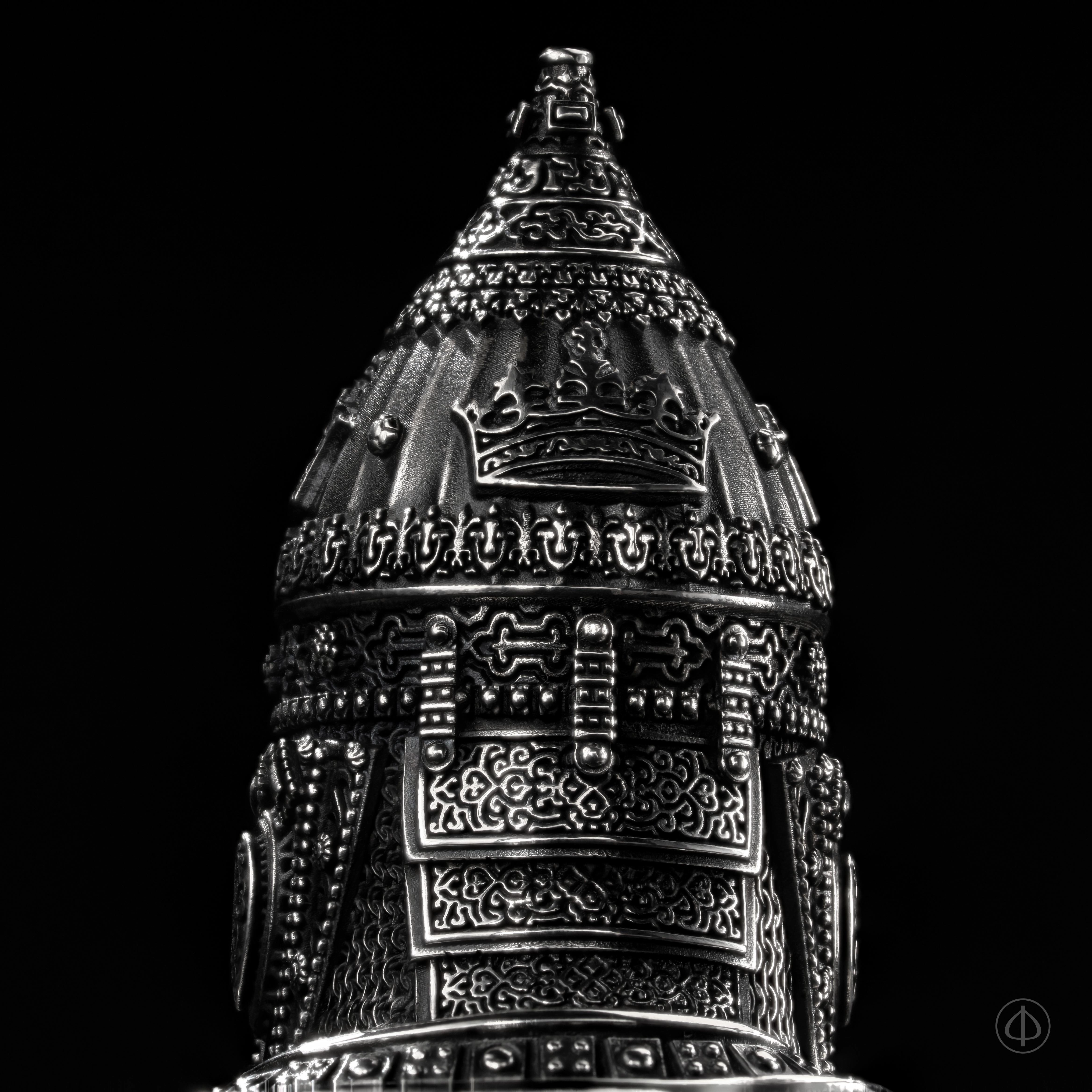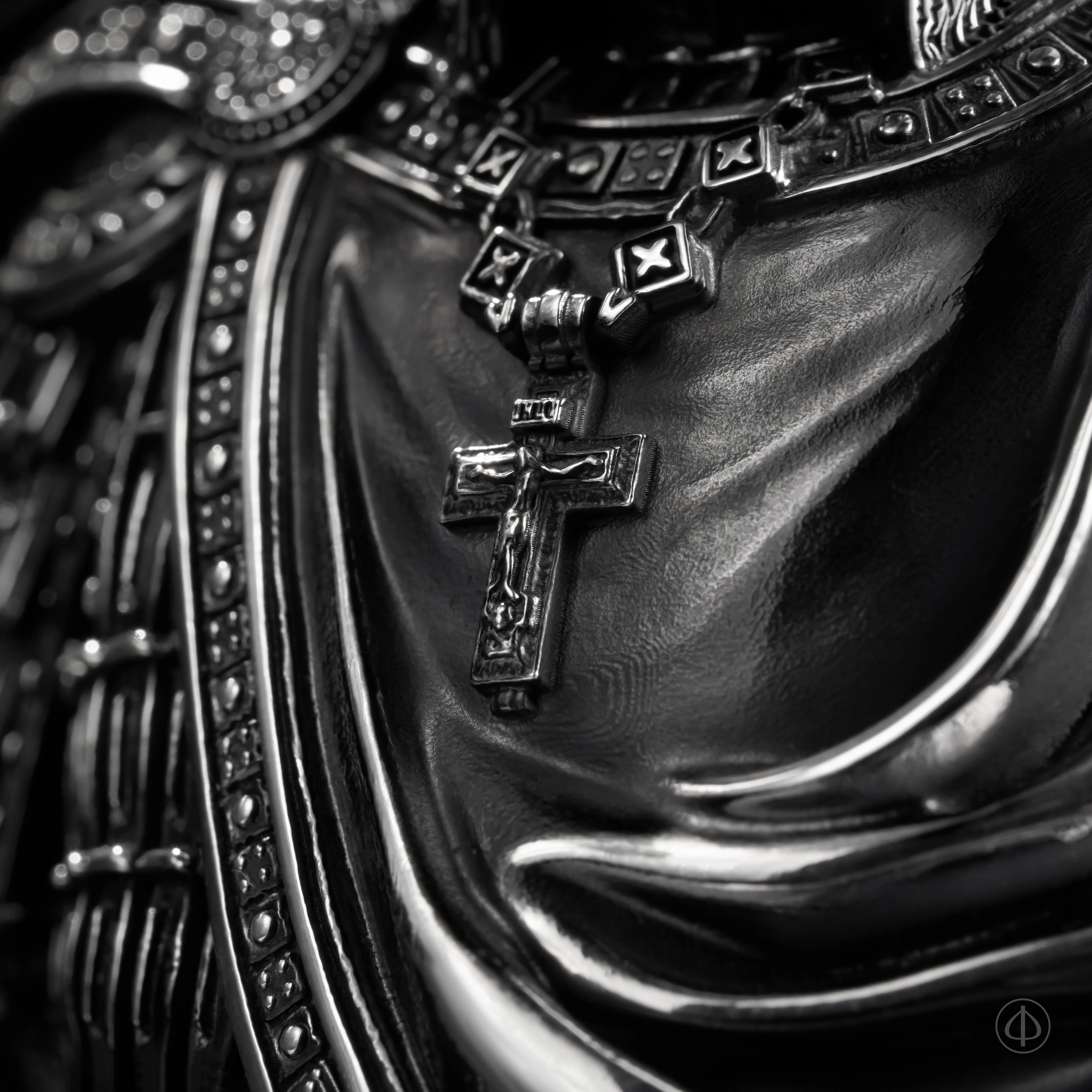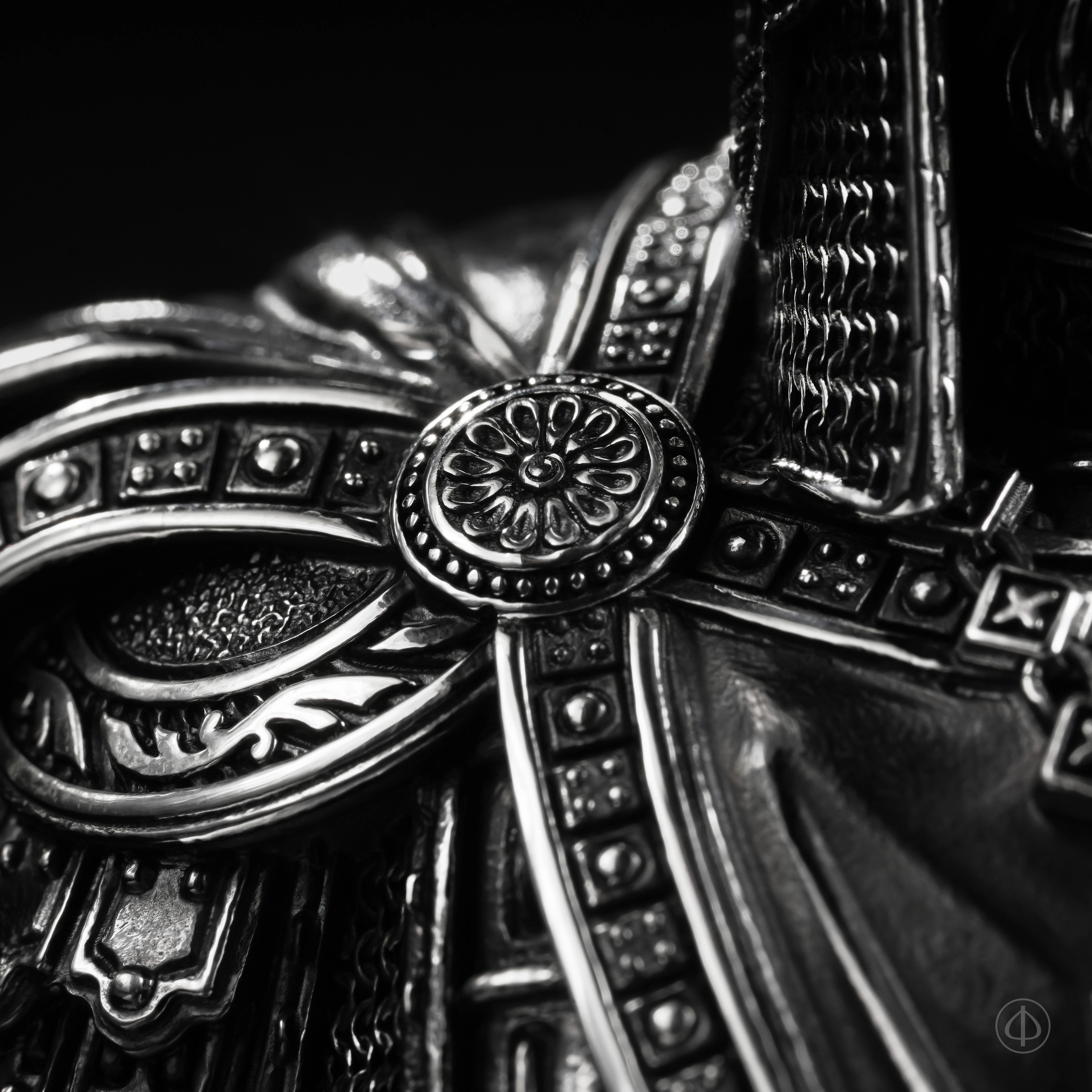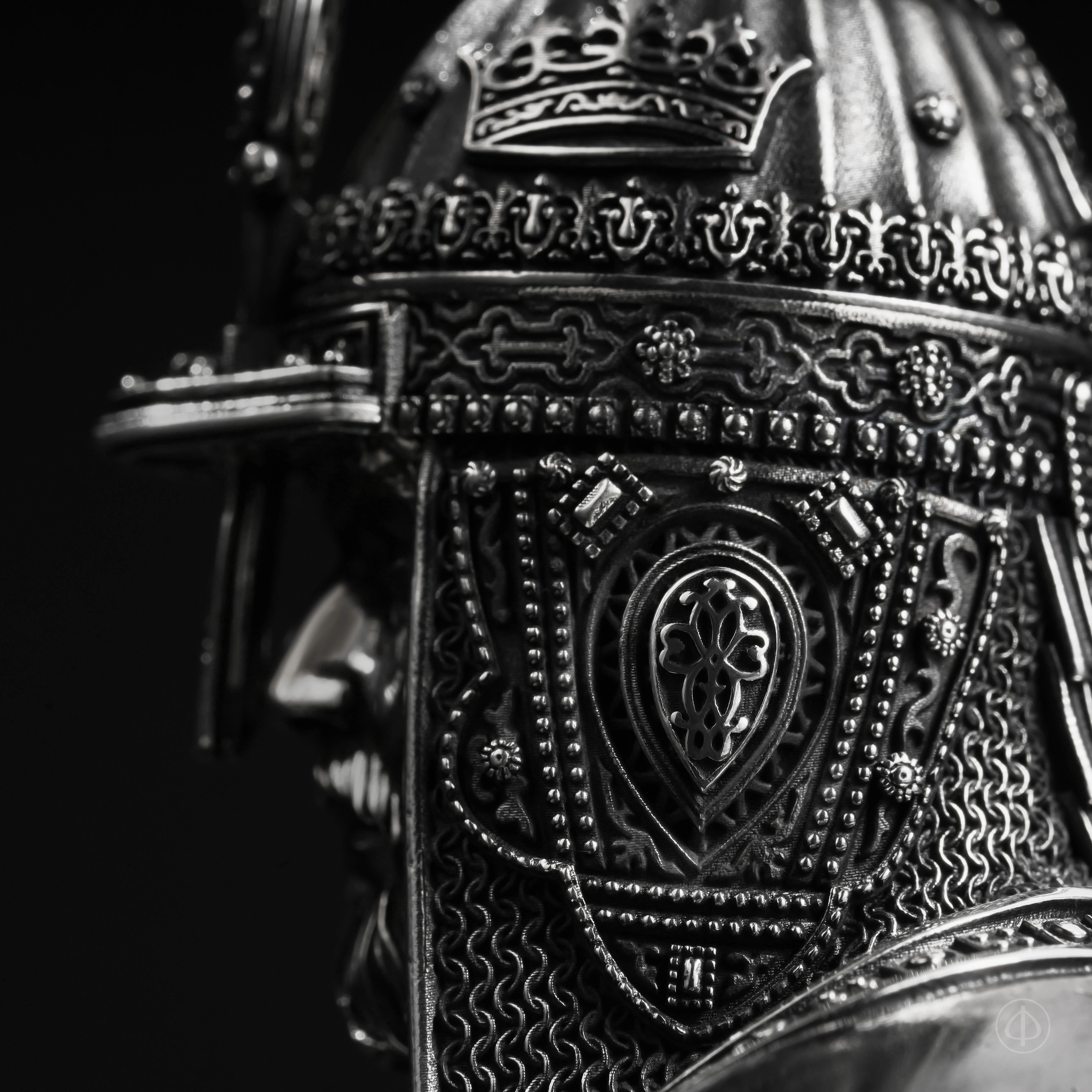 Орнаментированные доспехи, шлем с рельефным крестом и иконным образом, тяжёлые складки плаща формируют цельный и выразительный силуэт. Крест на груди становится смысловым центром, а взгляд и поза передают собранность и готовность к служению.