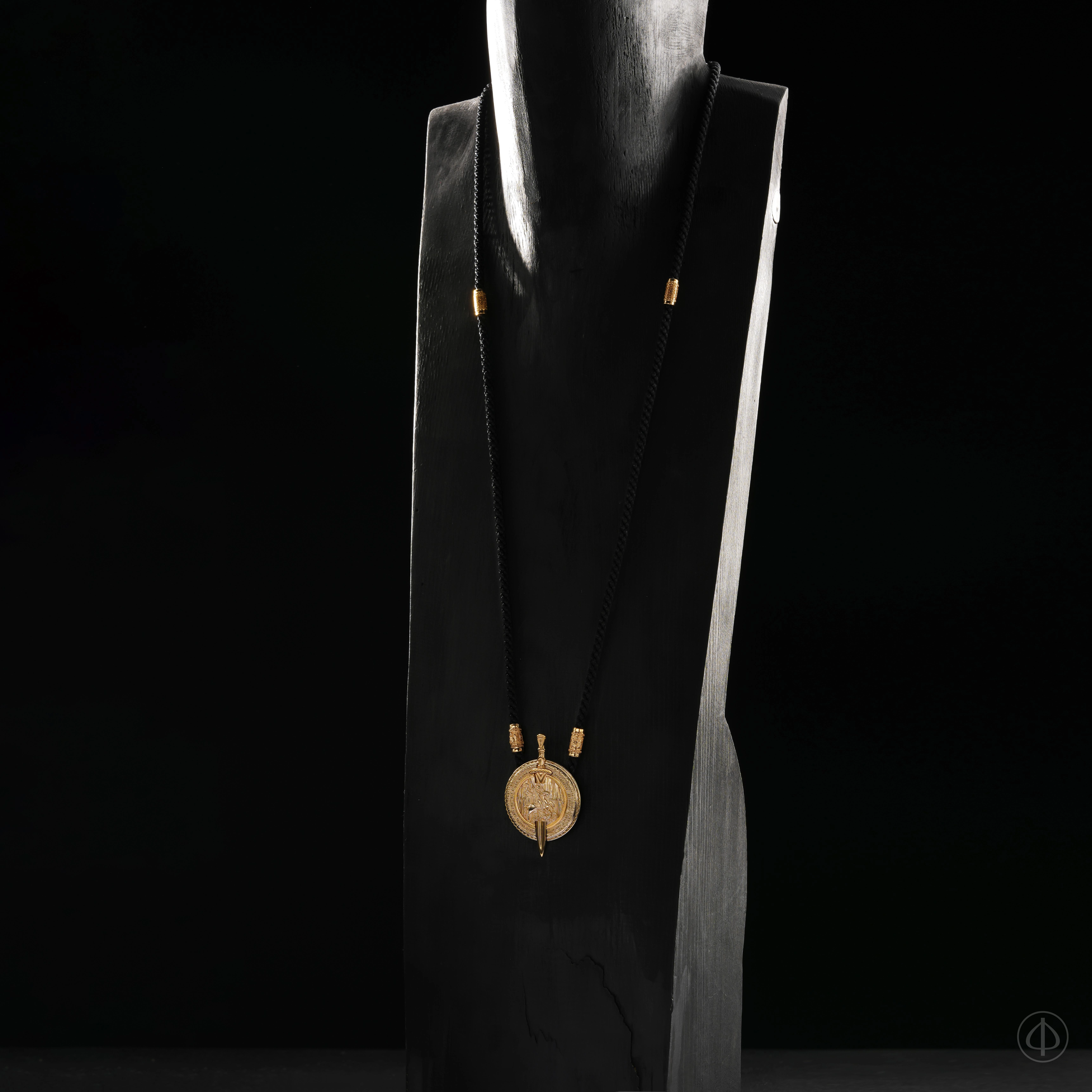 Подвес выполнен в форме щита и меча — древних символов защиты и ответственности. Щит — знак охраны и стойкости. Меч — символ решимости и готовности встать на защиту правды. В этом сочетании раскрывается смысл мужского служения: быть опорой, хранителем, защитником.