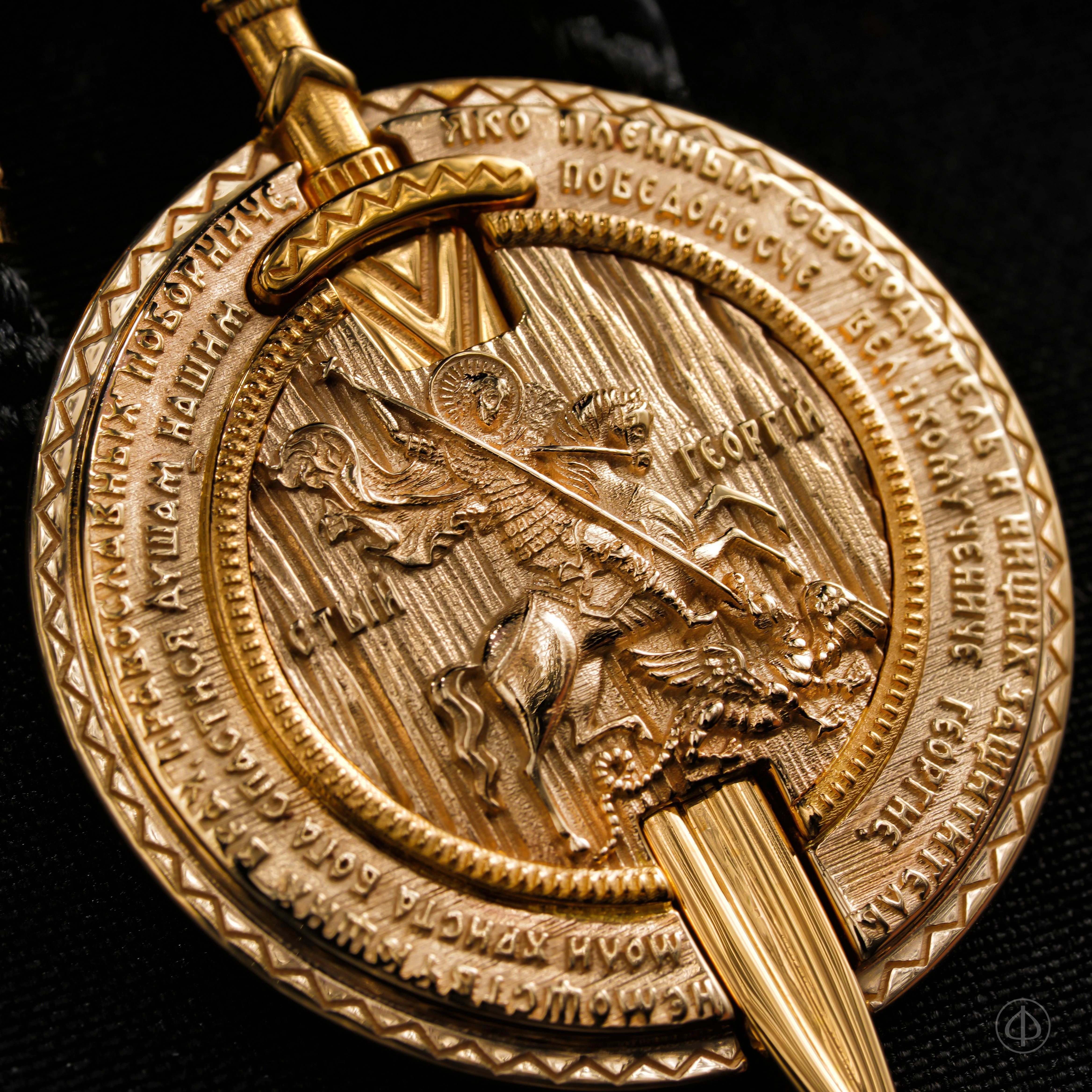 На лицевой стороне — Святой Георгий, поражающий змея. По окружности размещён текст тропаря великомученику Георгию — молитвенное обращение о заступничестве и спасении души. На рукоятке — восьмиконечный крест как знак принадлежности к православной вере.