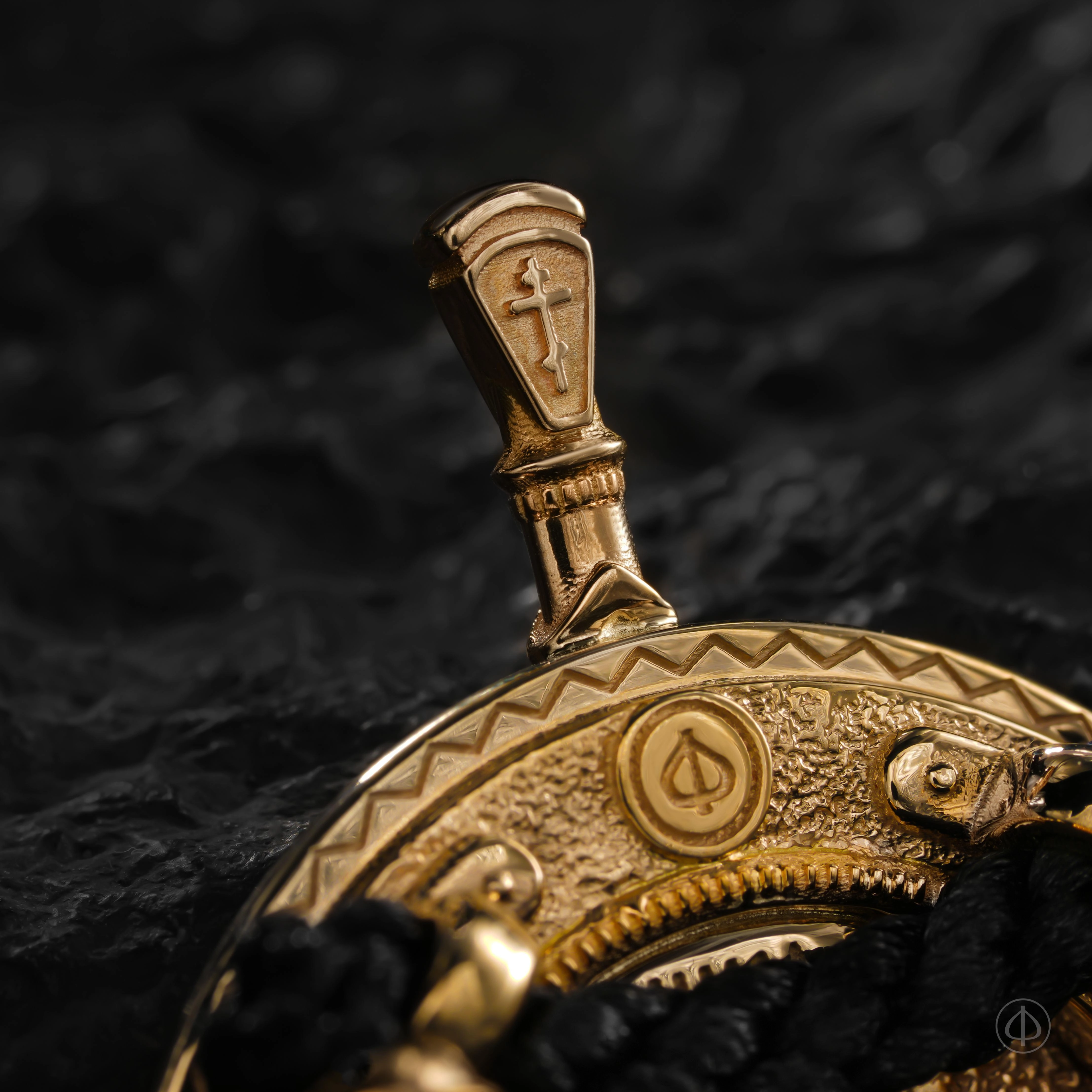 На оборотной стороне — восьмиконечный крест с монограммой IC XC, исповедание имени Иисуса Христа. В верхней части — фирменный знак ювелирного дома «Ф».