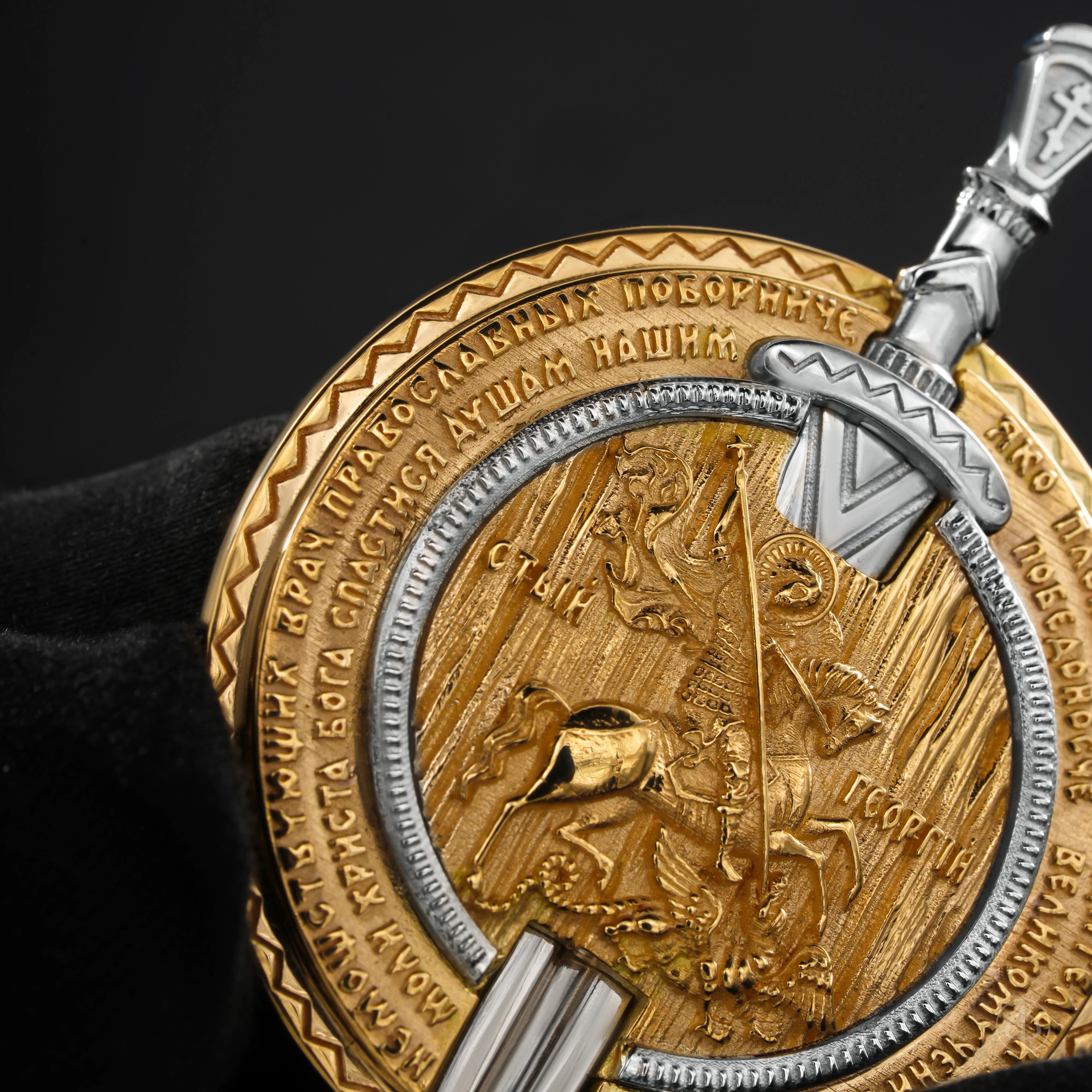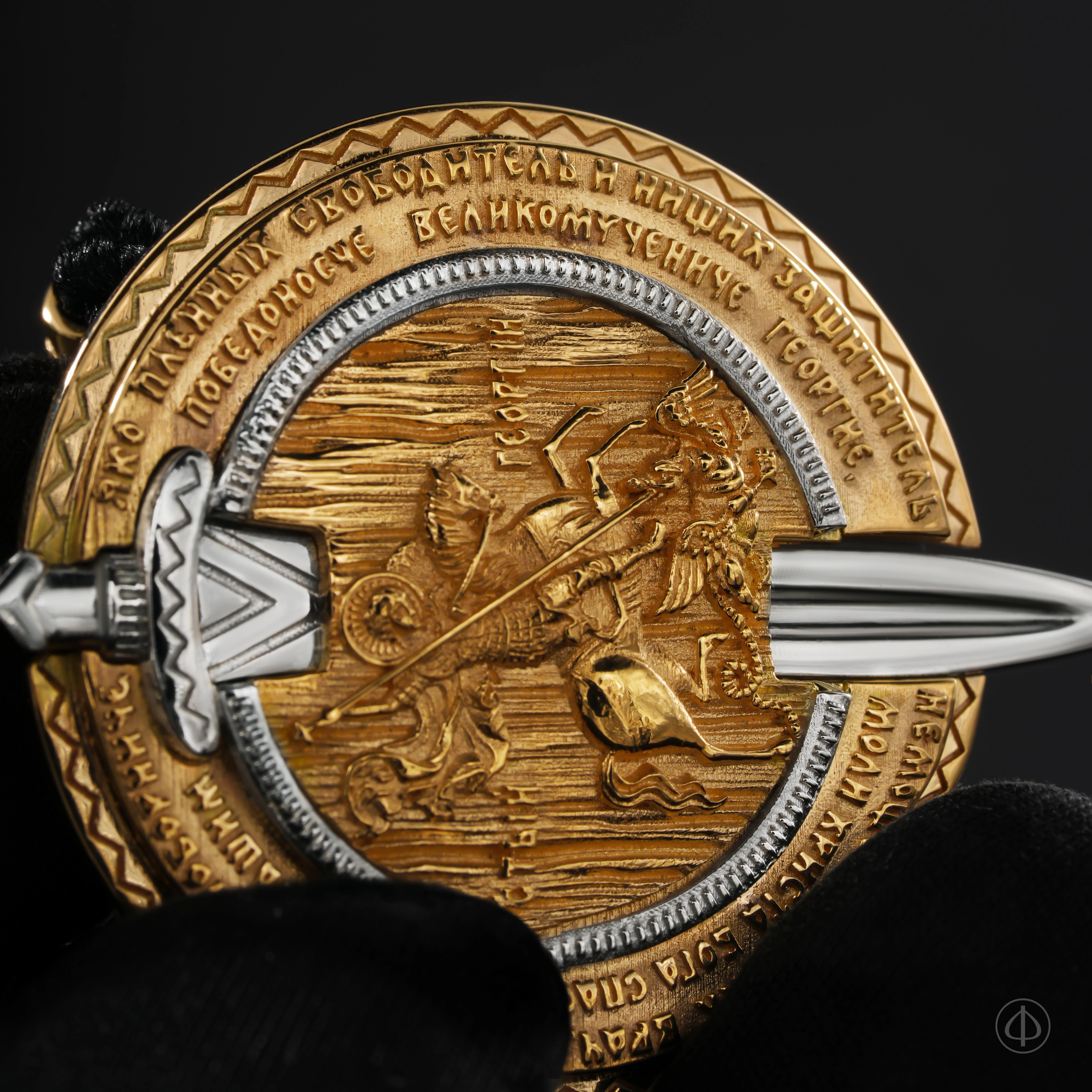 На лицевой стороне — Святой Георгий, поражающий змея. По окружности размещён текст тропаря великомученику Георгию — молитвенное обращение о заступничестве и спасении души. На рукоятке — восьмиконечный крест как знак принадлежности к православной вере.