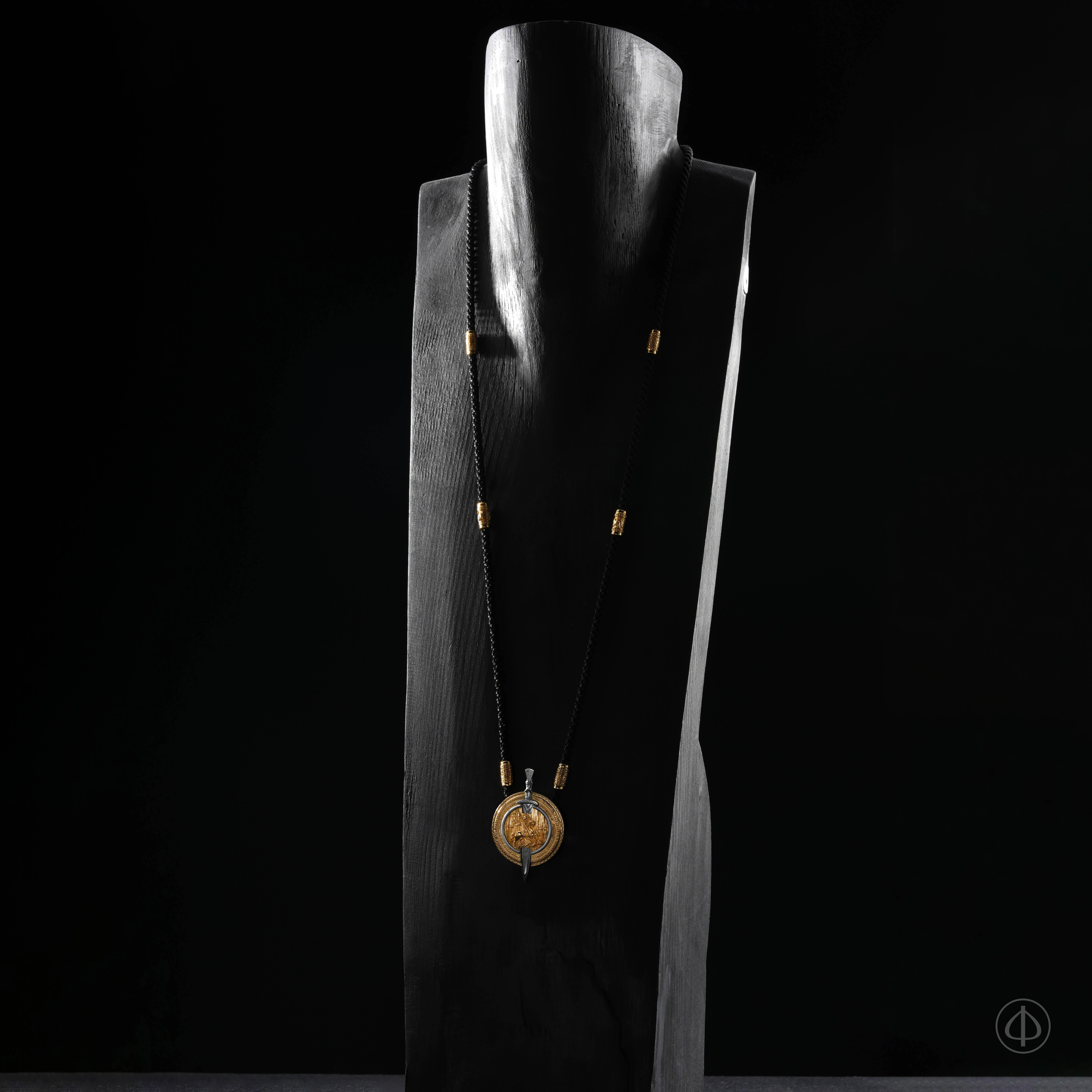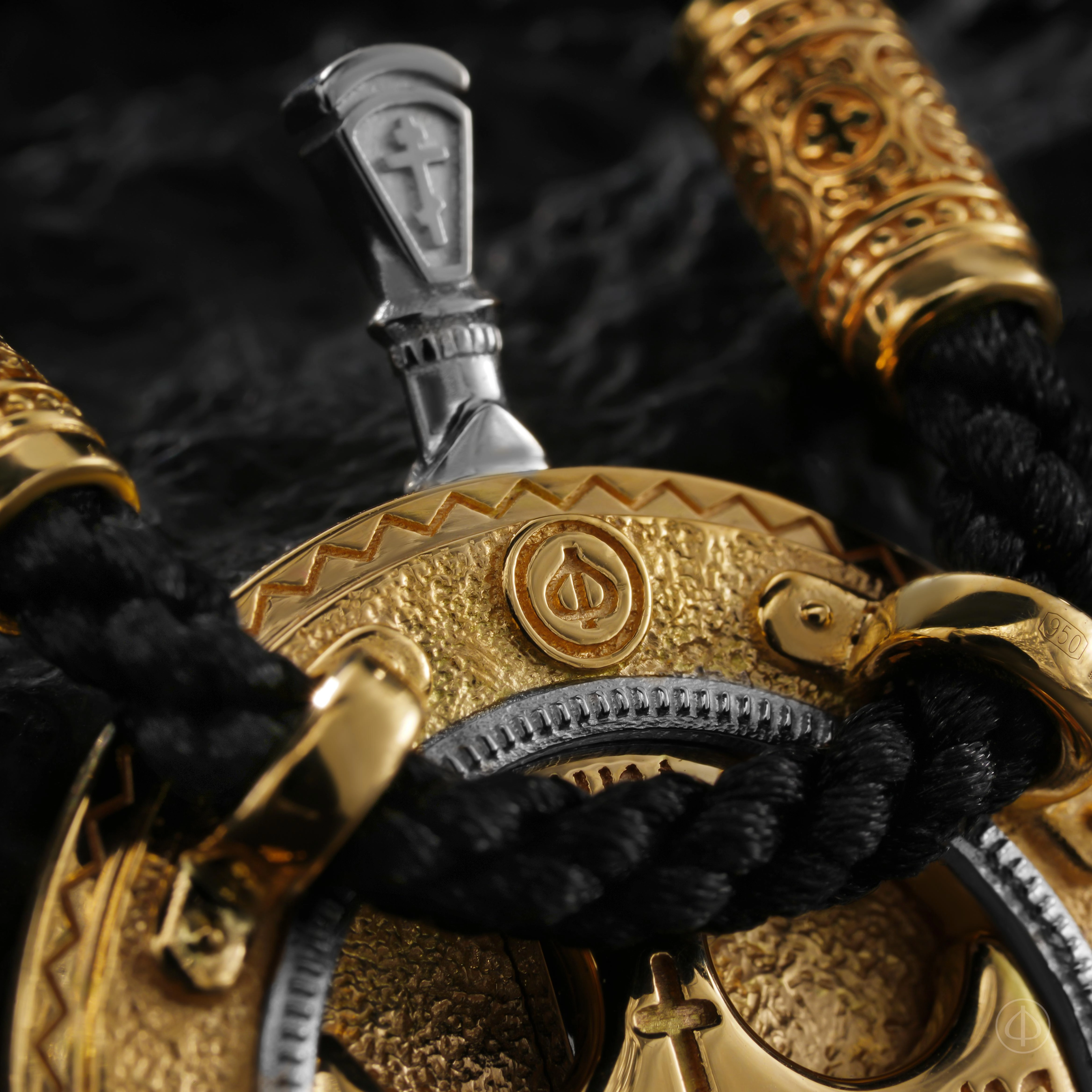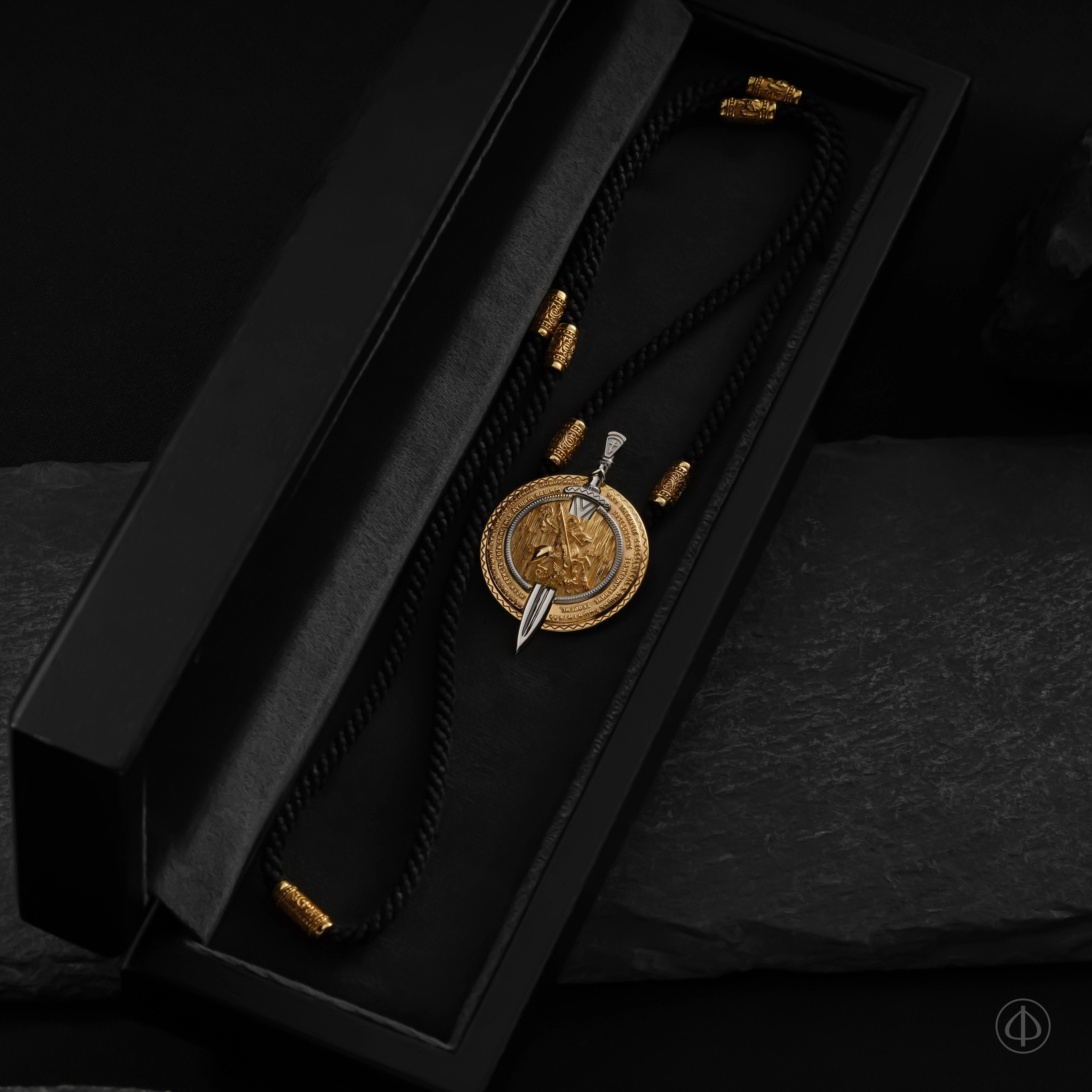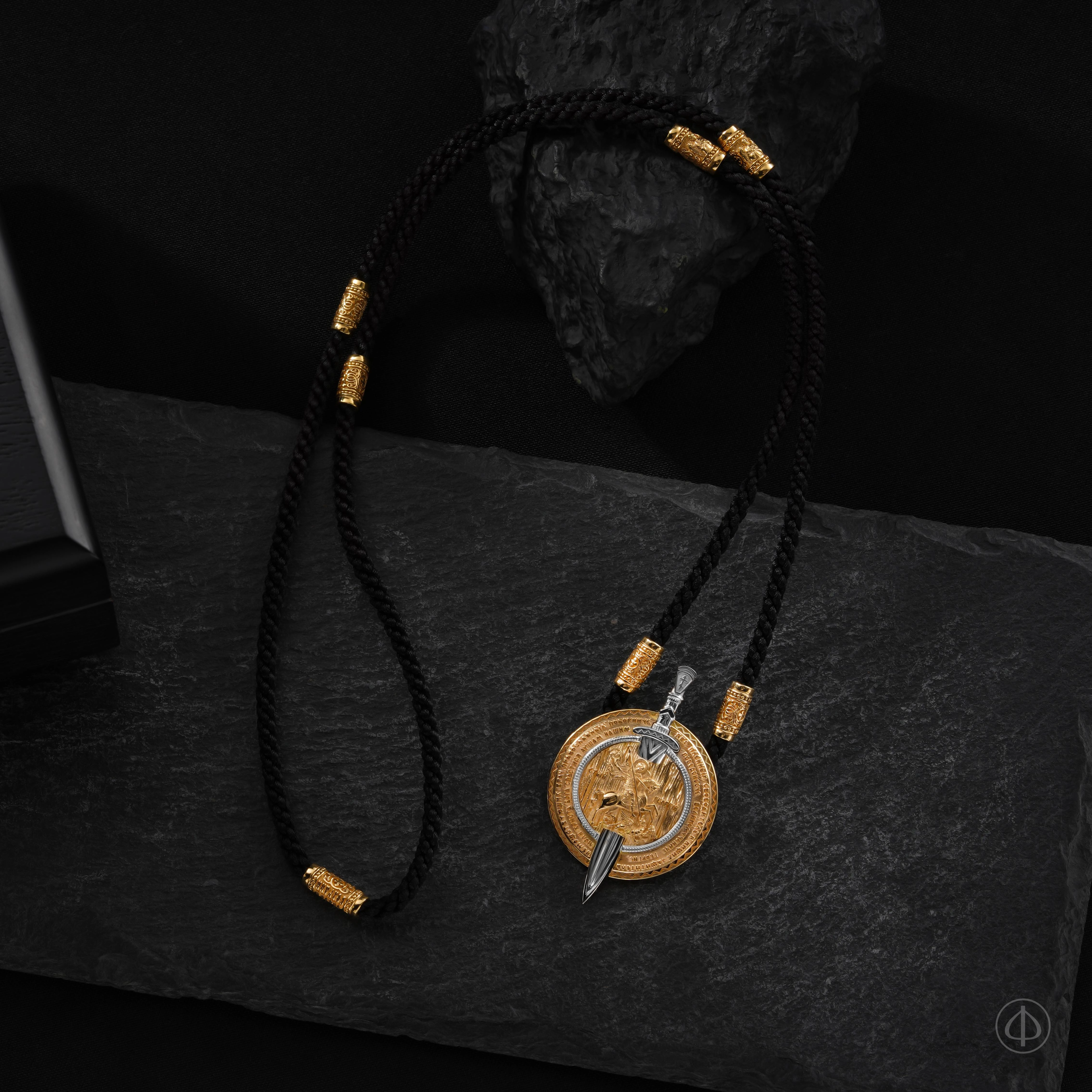 Подвес выполнен в форме щита и меча — древних символов защиты и ответственности. Щит — знак охраны и стойкости. Меч — символ решимости и готовности встать на защиту правды. В этом сочетании раскрывается смысл мужского служения: быть опорой, хранителем, защитником.