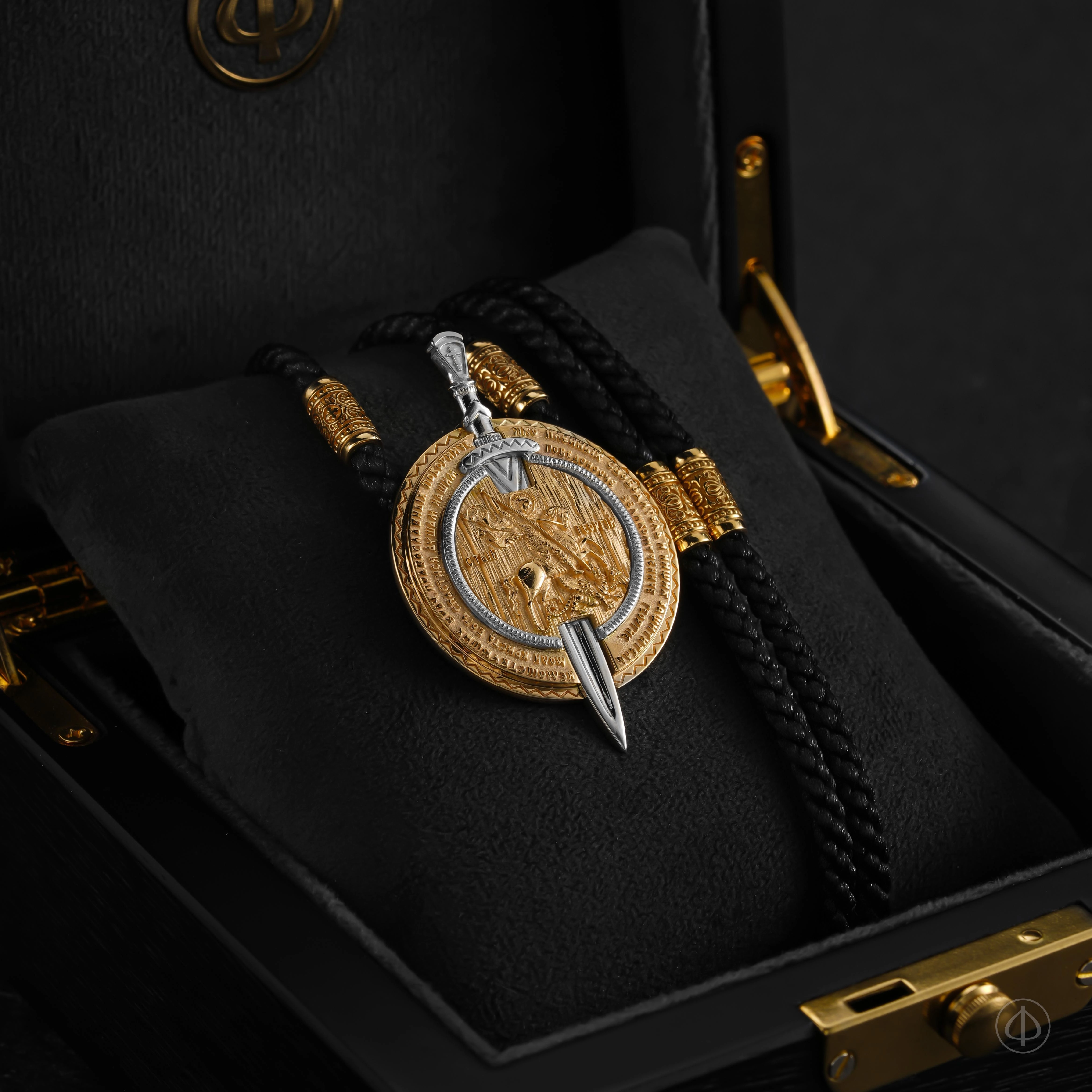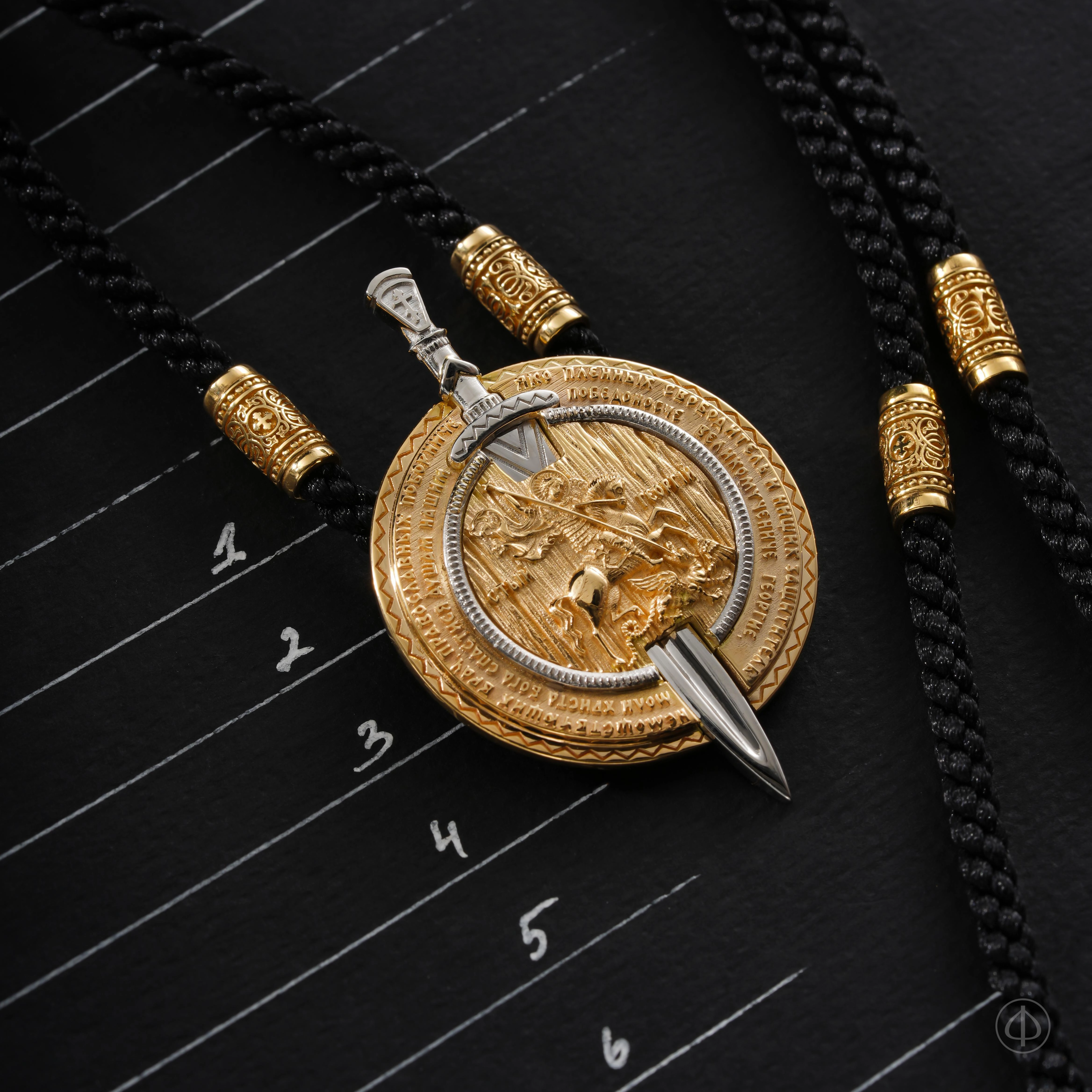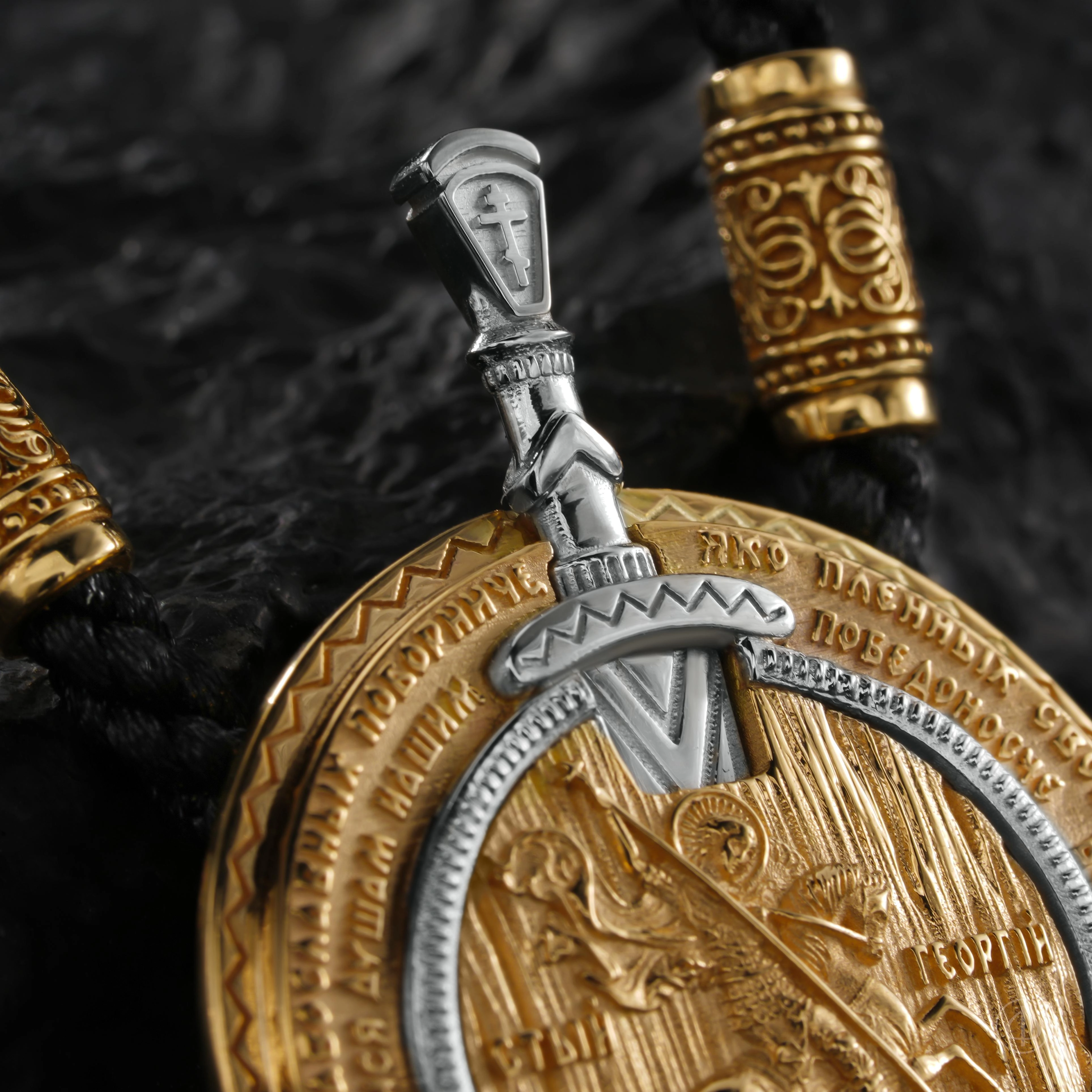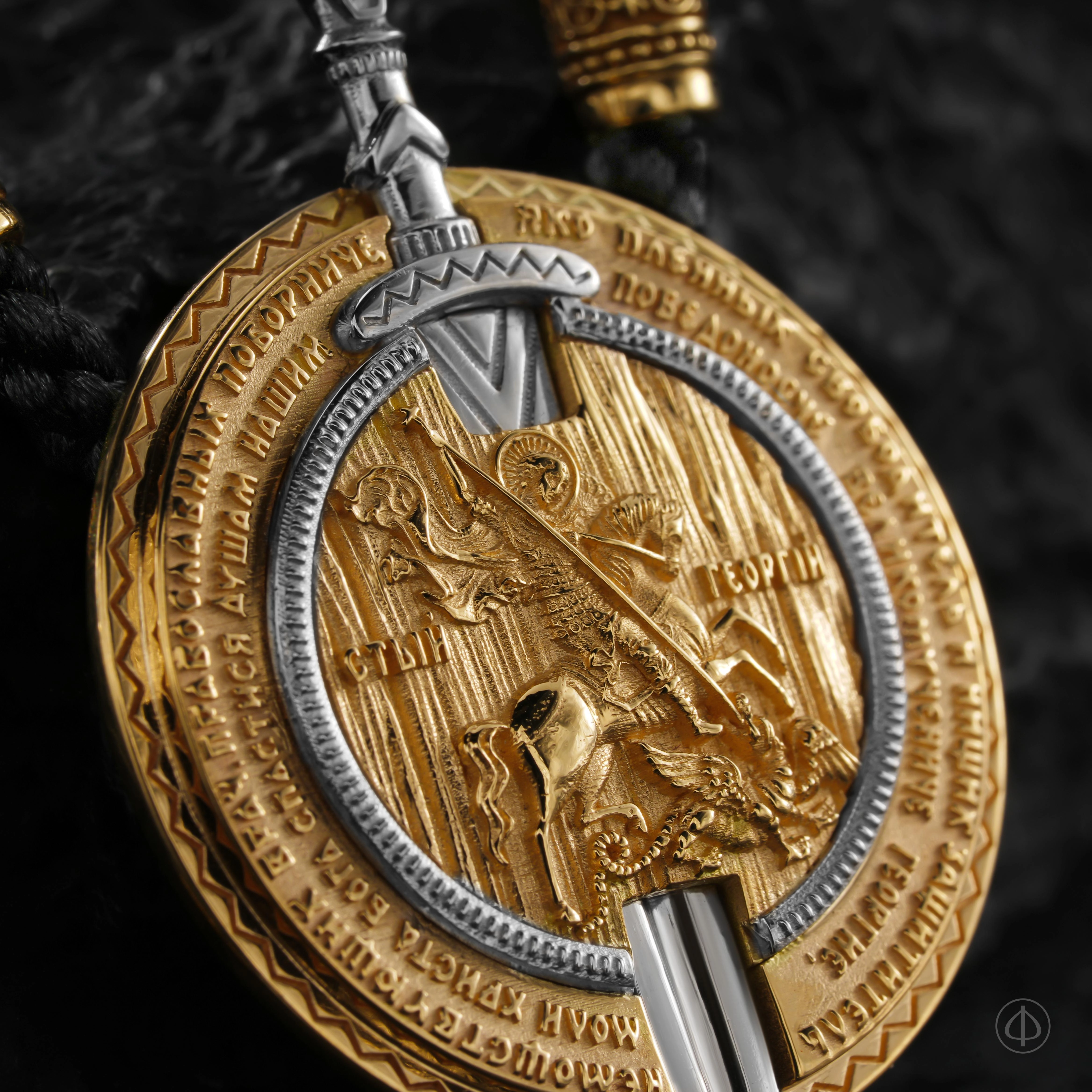 Нательный подвес с центральным образом Георгия Победоносца, одерживающего победу над змеем. Образ Святого Георгия Победоносца — один из самых узнаваемых в православной традиции. В нём соединены мужество, верность и духовная твёрдость. Это образ воина, который побеждает зло не только силой оружия, но силой веры.