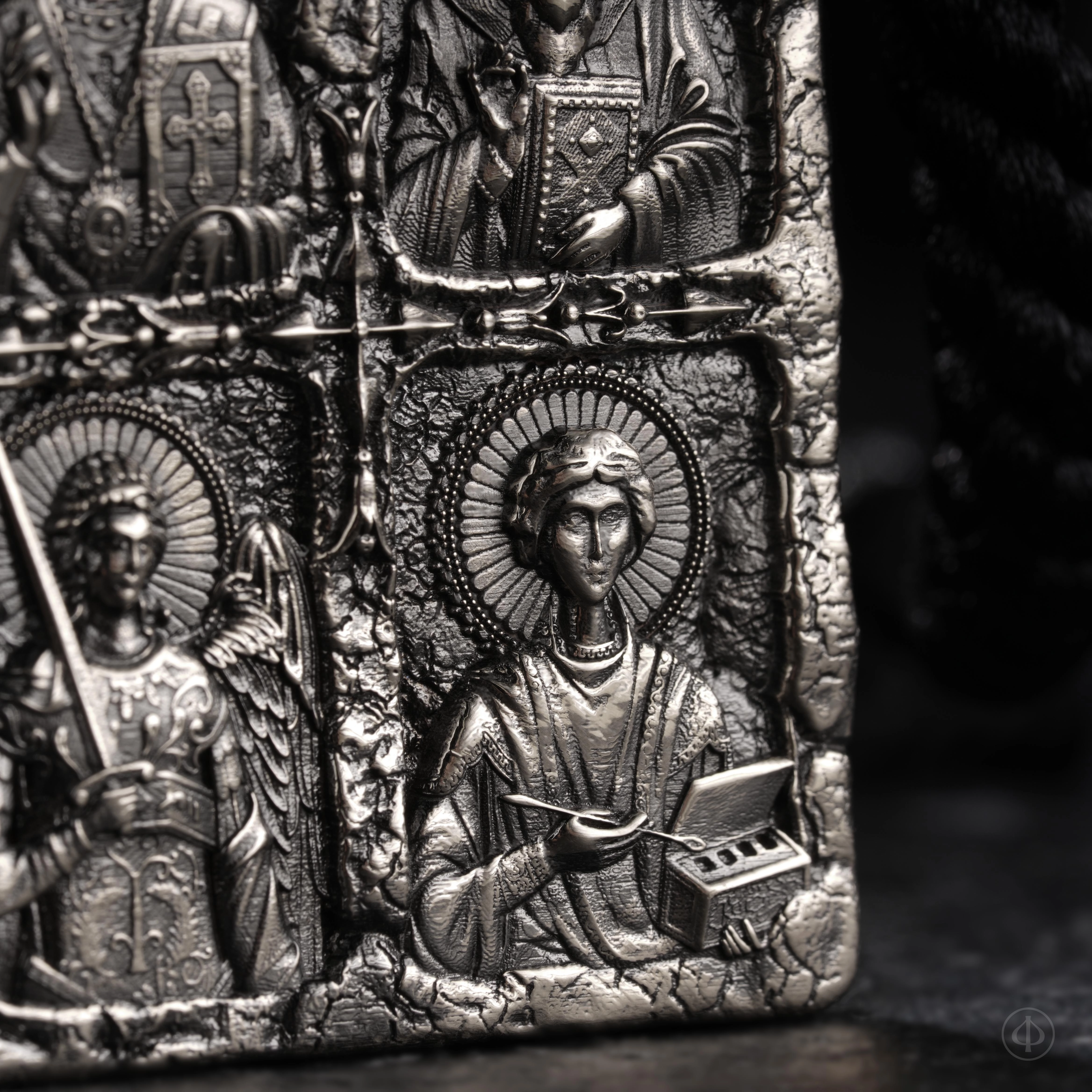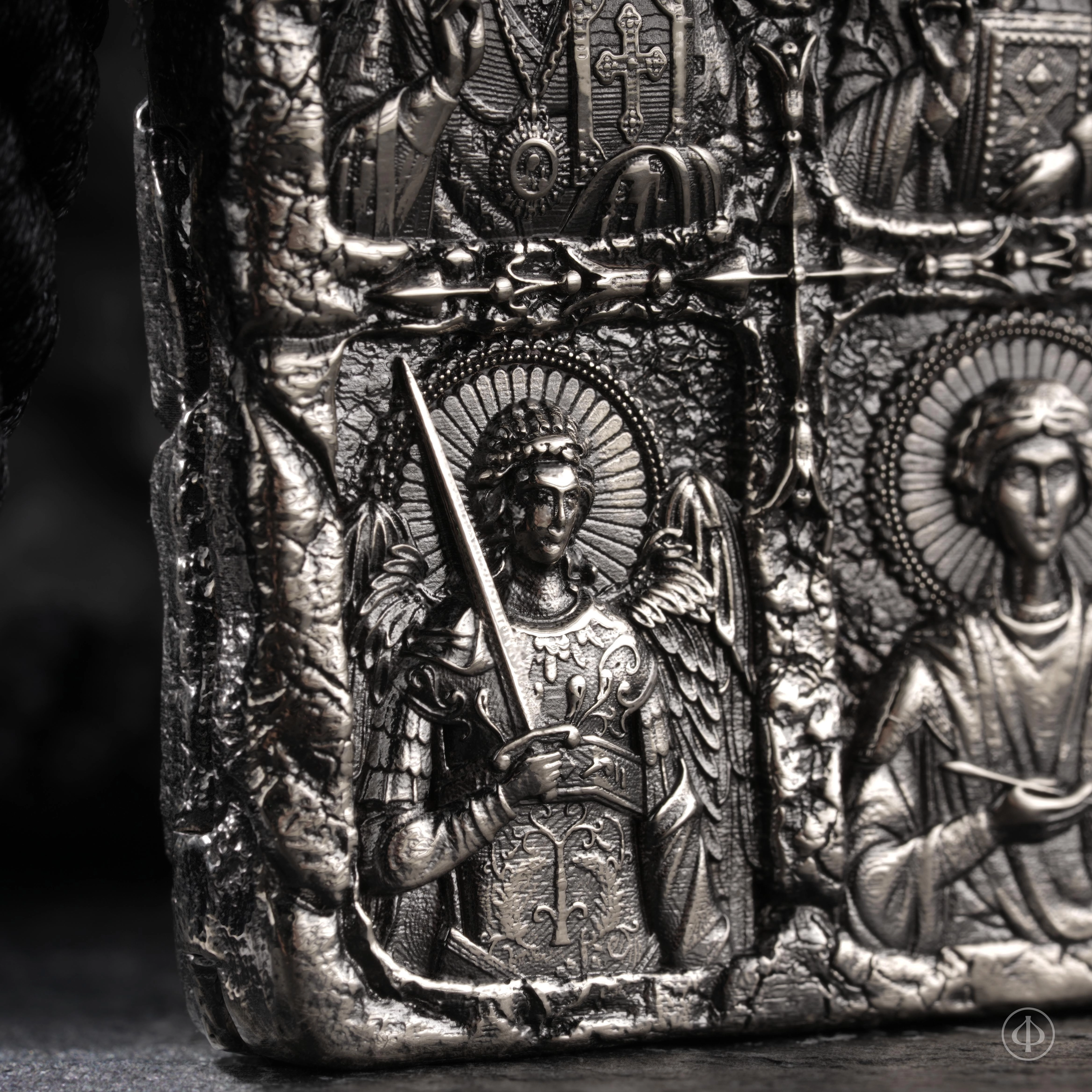 - внешняя сторона – архангел Михаил, шестикрылый Херувим, Спиридон Тримифунтский, Пантелеймон, Николай Чудотворец;