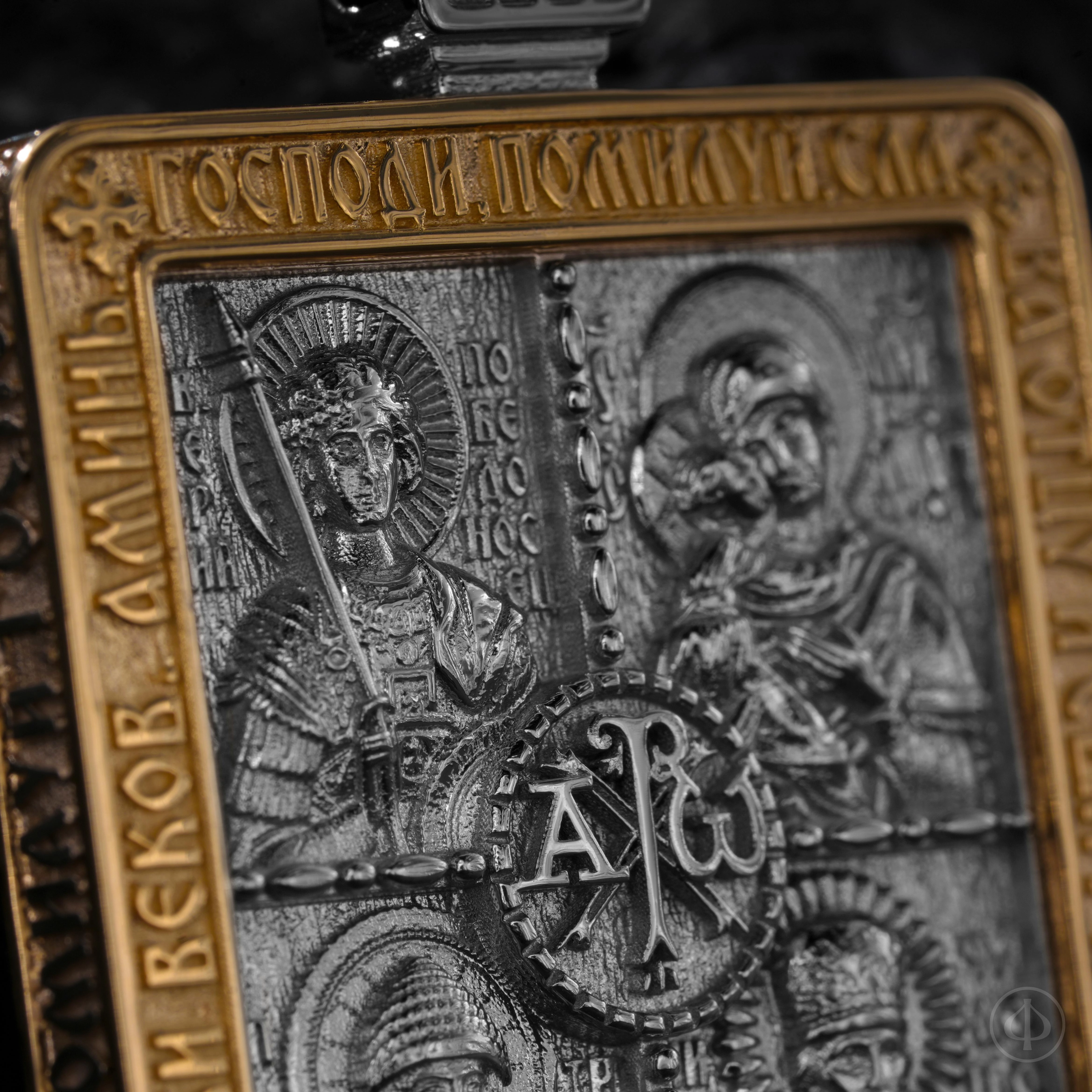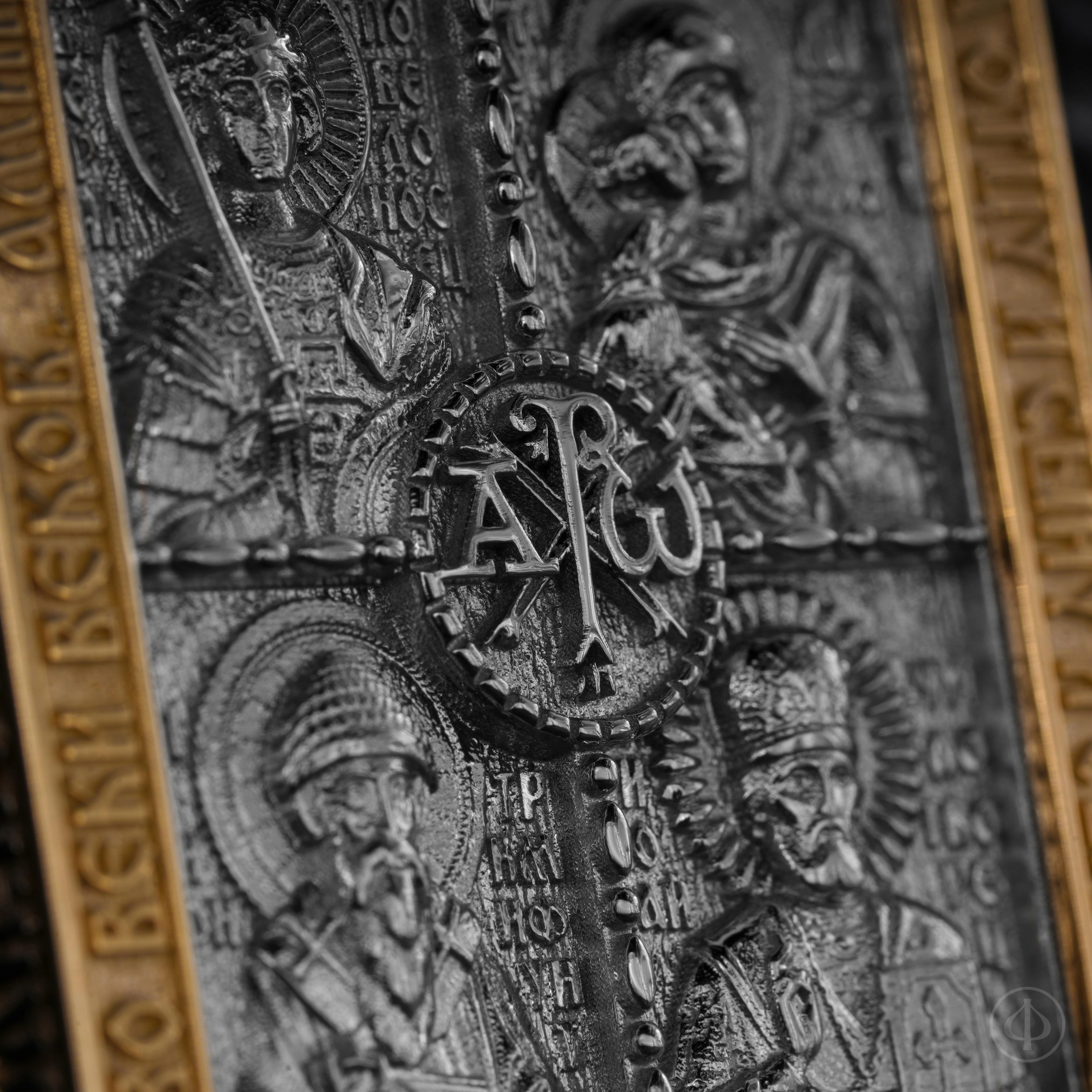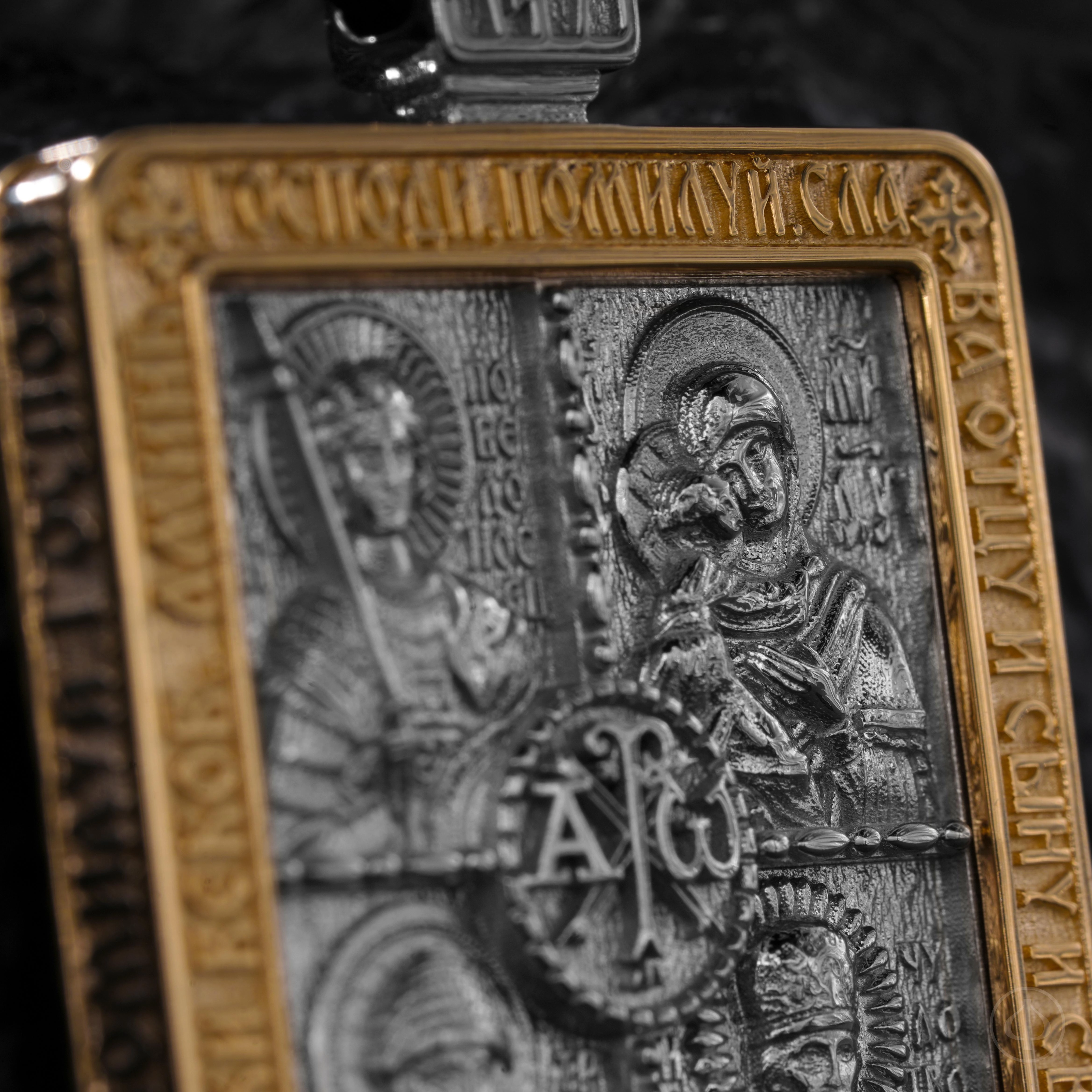 Сочетание жёлтого и белого золота подчёркивает глубину рельефа и выделяет центральные элементы. Оборотная сторона дополняет замысел образами почитаемых святых, раскрывая тему заступничества и духовной защиты.